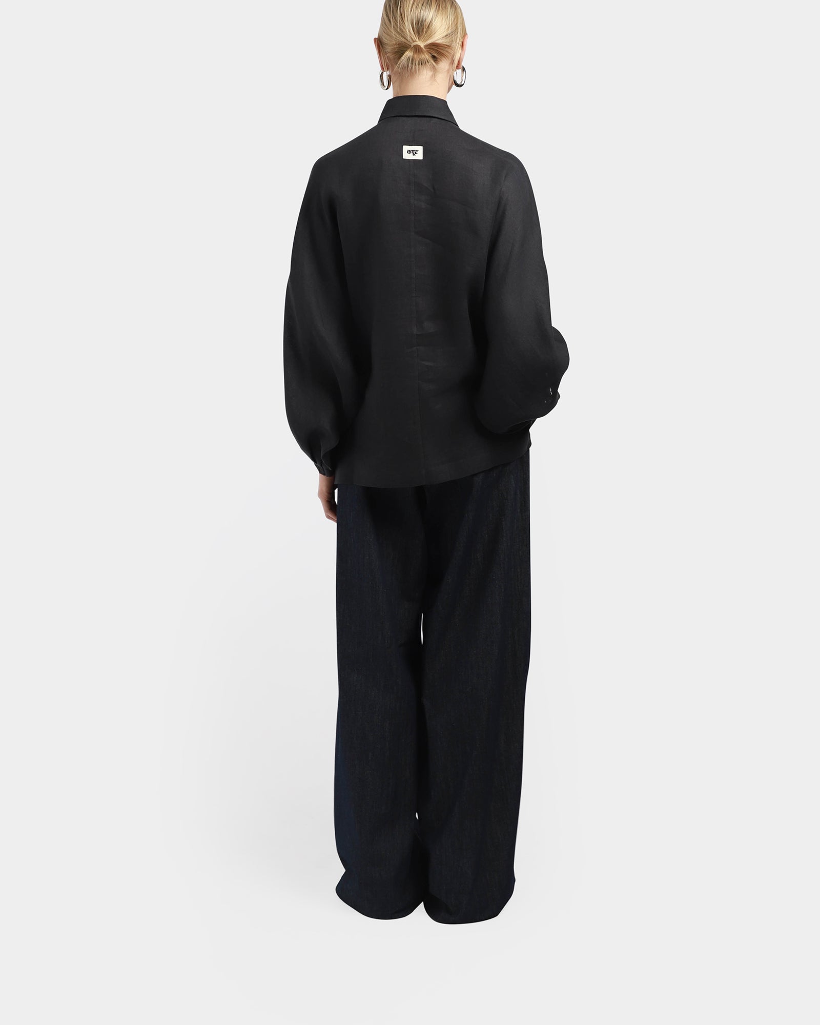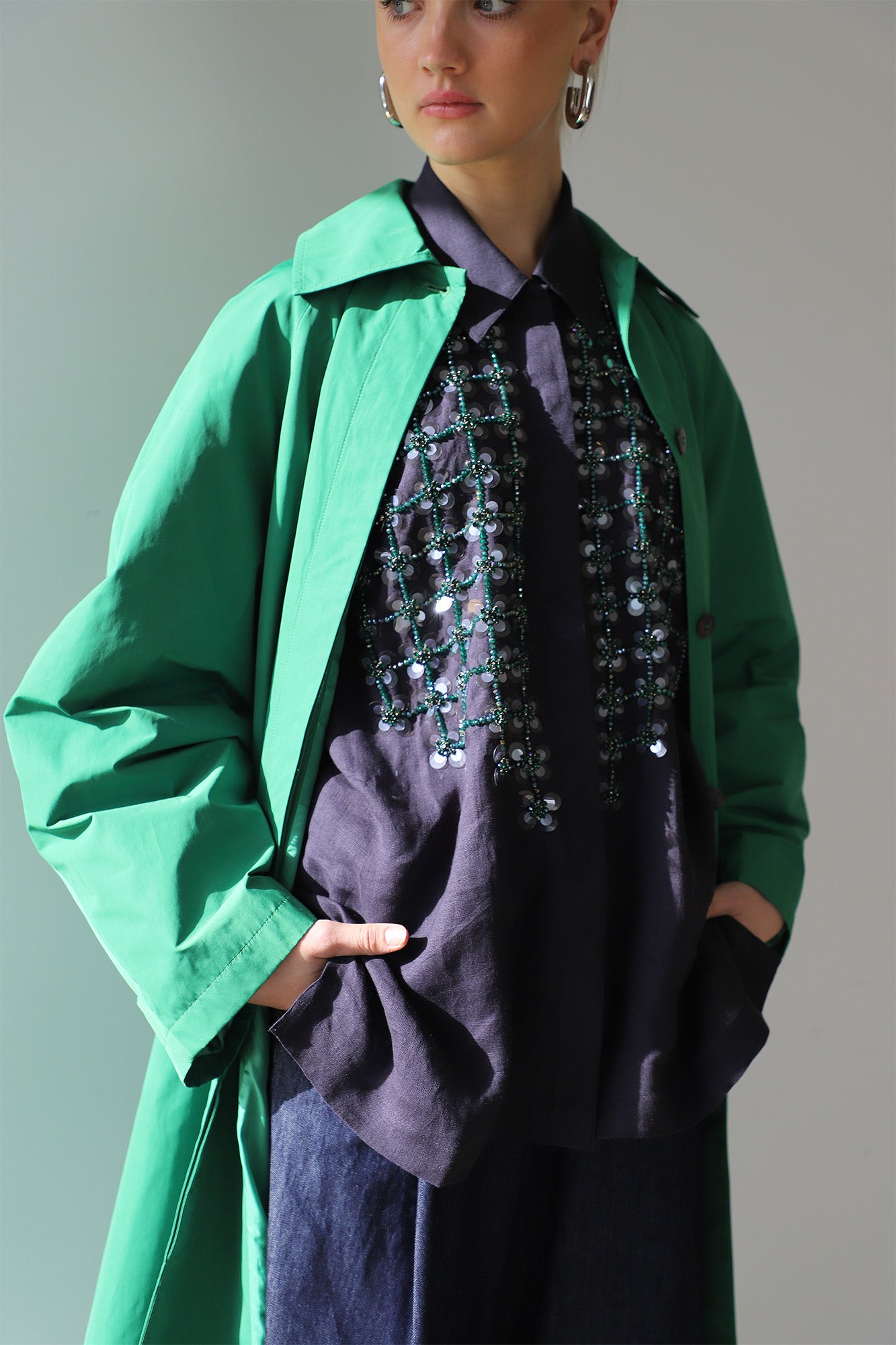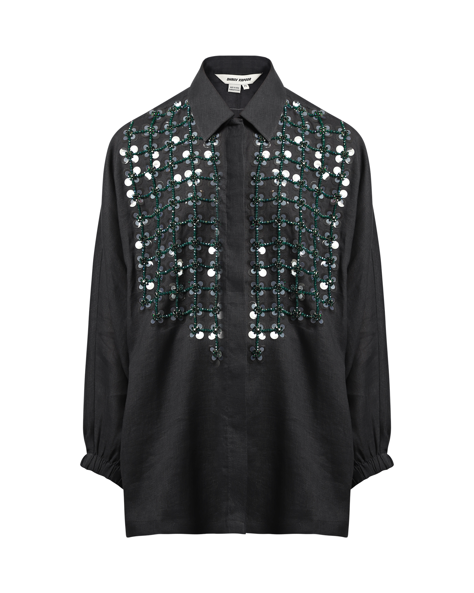 This batwing shirt made from linen and cotton, features 3/4 sleeve length with elasticated cuffs, hidden buttons at front, a classic collar, embroidered crystal beads detail at front.