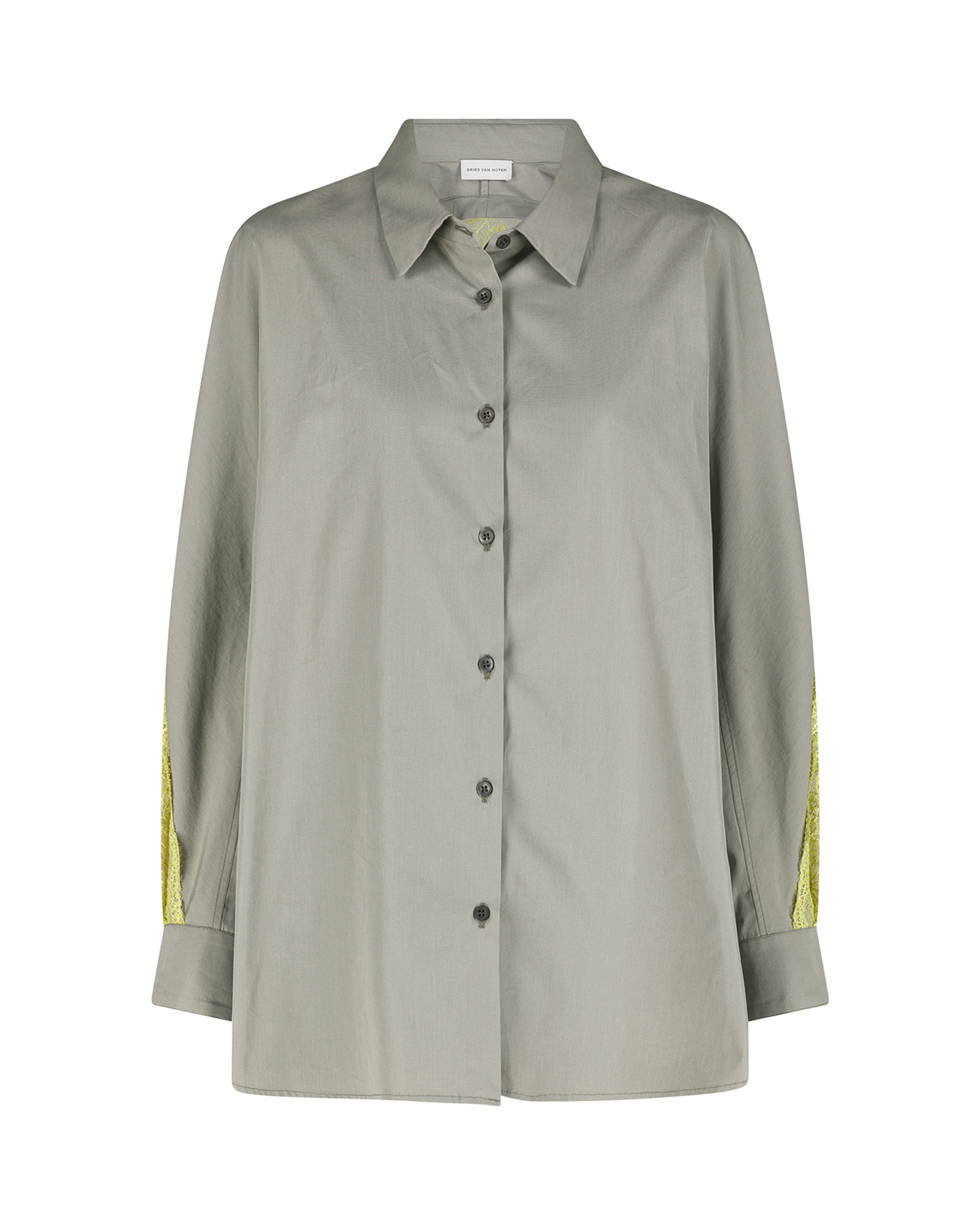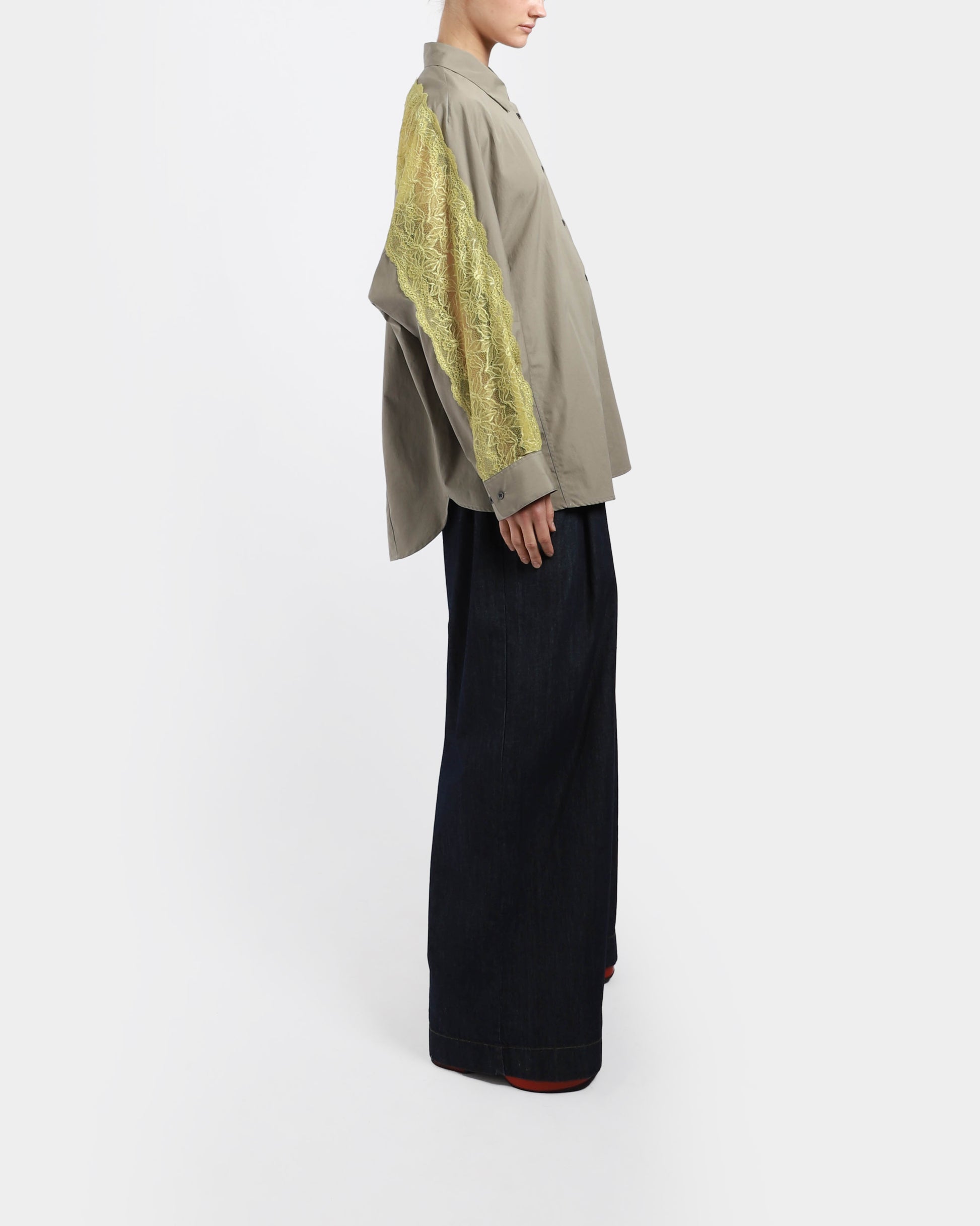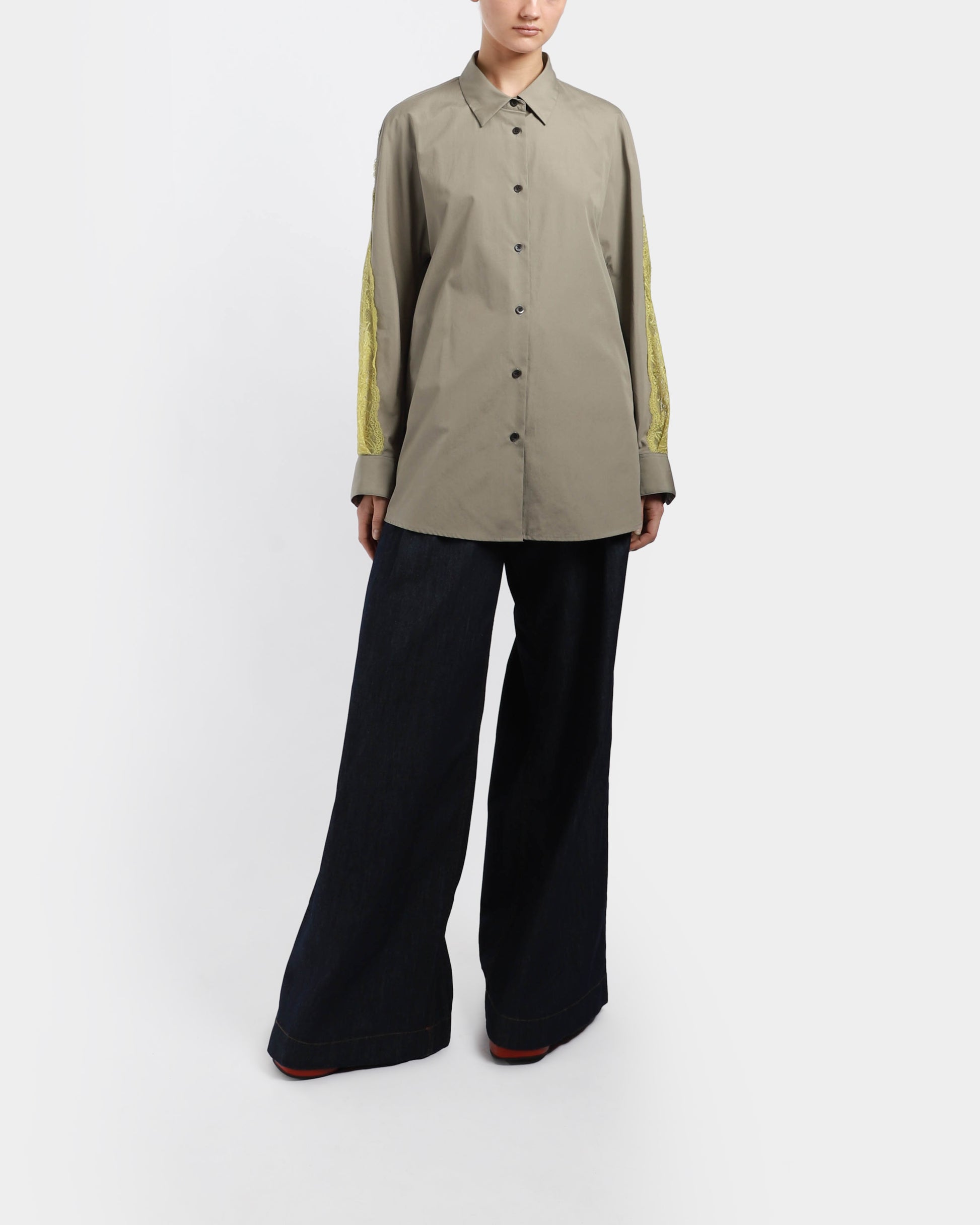 A classic shirt, featuring yellow lace detail from the upper back and along the sleeves offering elegance and texture to the garment. The Camia shirt has oversized long sleeves with button at cuffs, contrast buttons at front to close and is slightly longer at the back.
