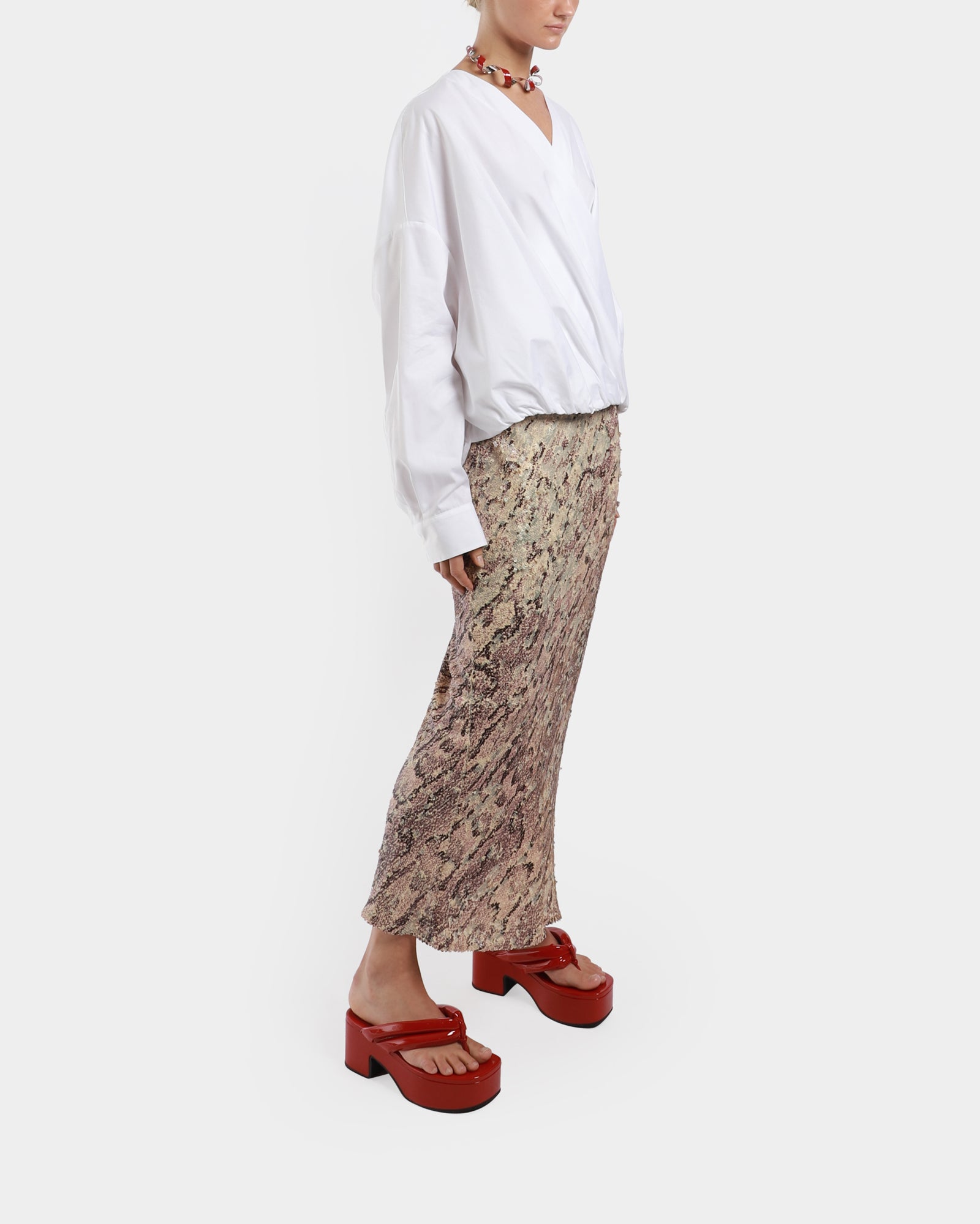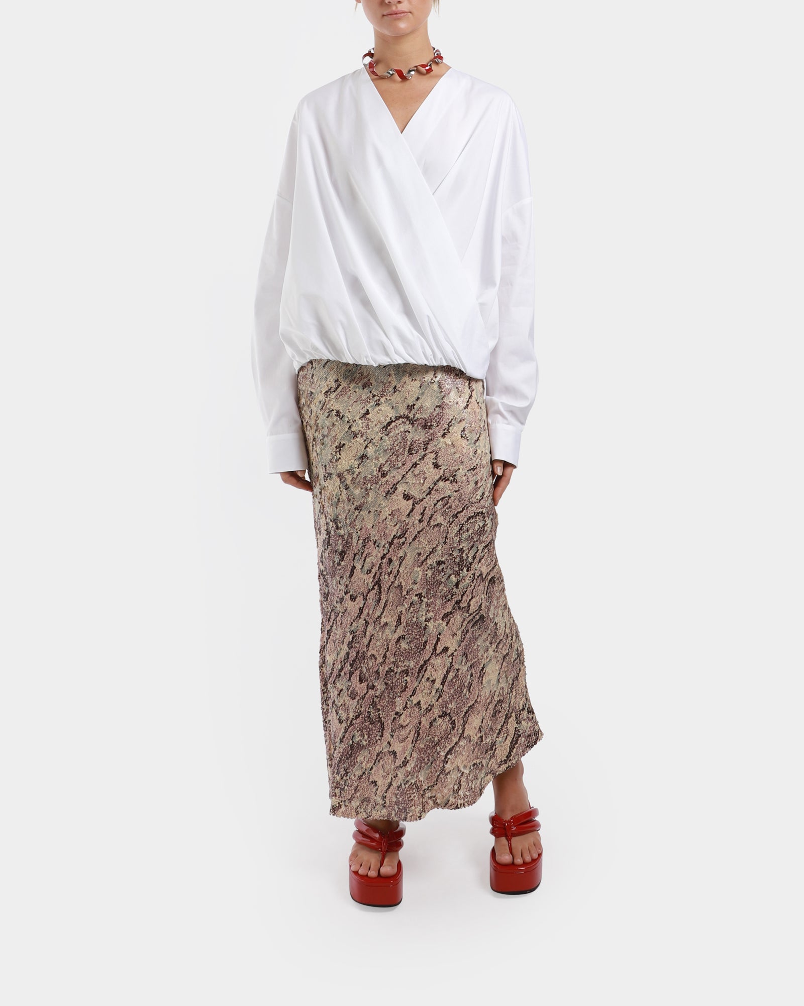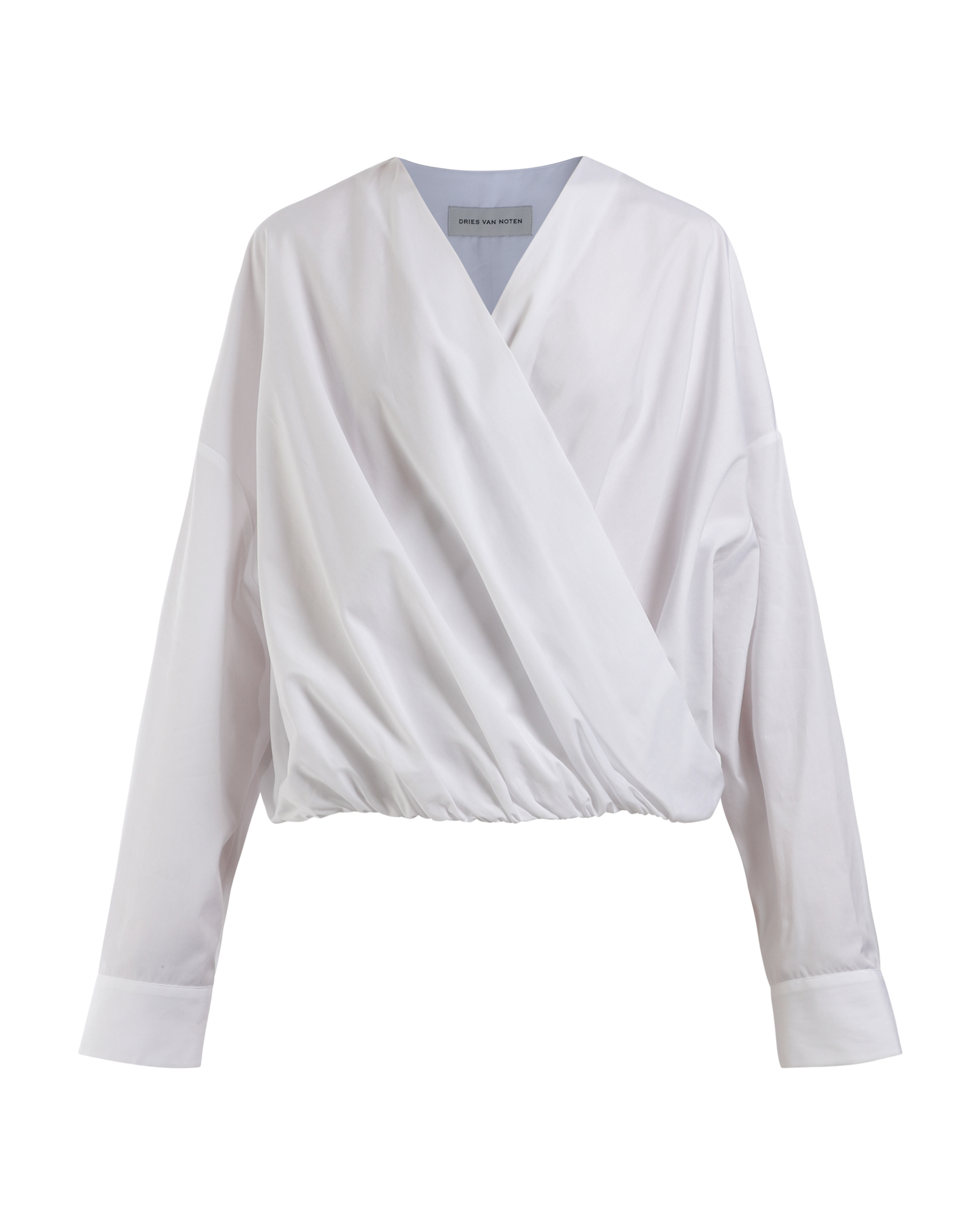 A beautiful blouse made from cotton with a draped crossover front panel. It has a loose fitting silhouette with an oversized cut, long sleeves and buttons at cuff.