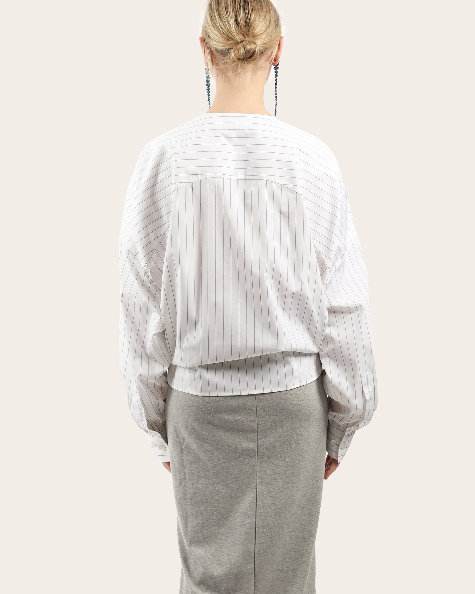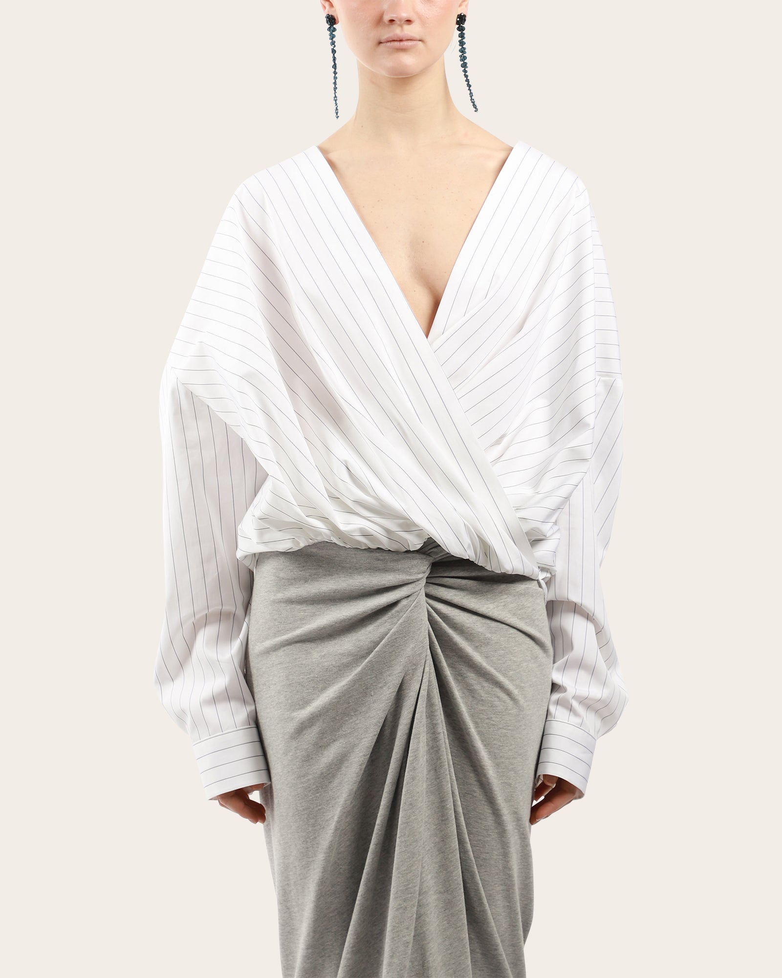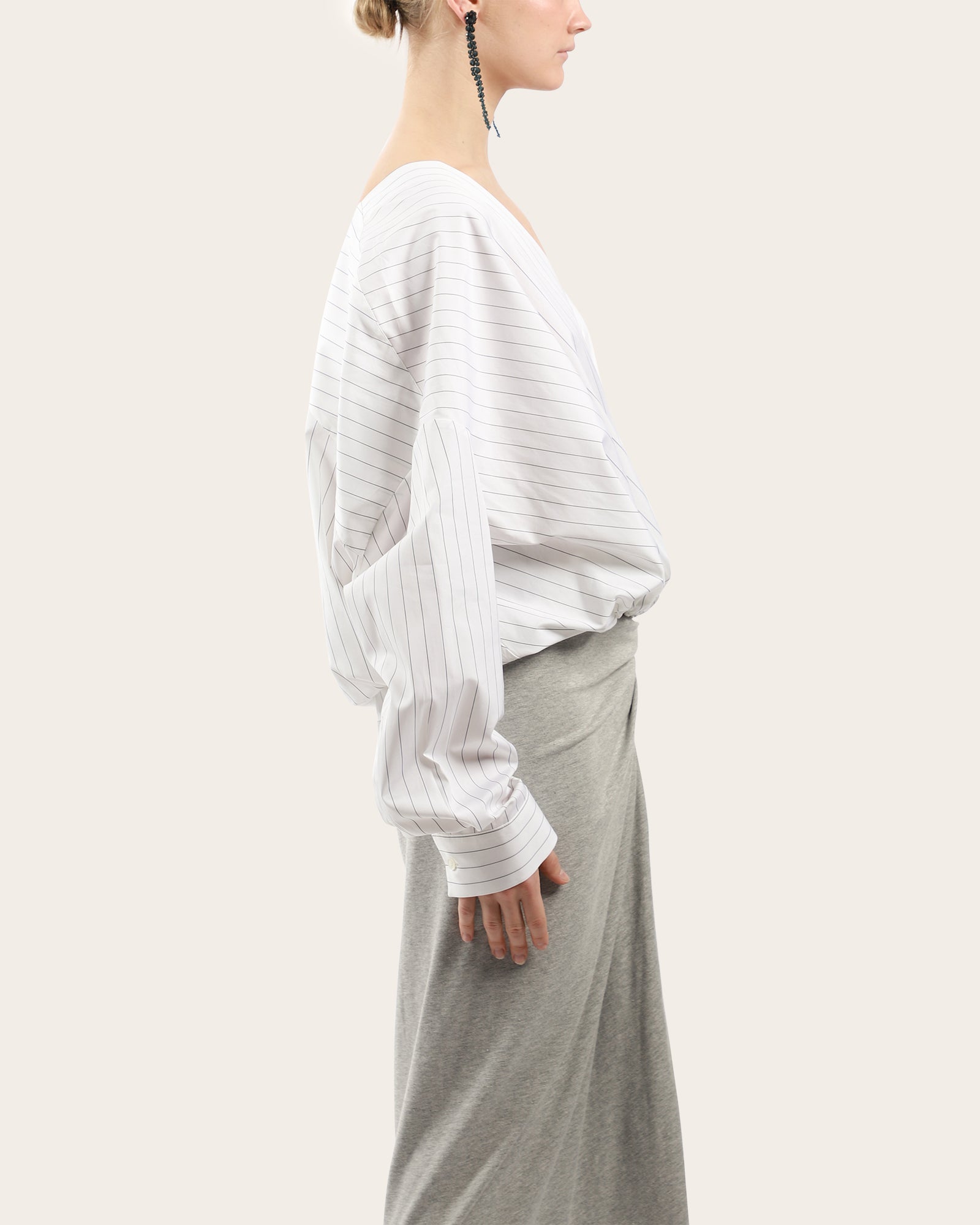 The Camiel Wrap Top, features light navy stripes on white, a relaxed wrap front, ruched waist, and button cuffs. Wear on or off the shoulders for versatile styling. Made in Portugal.