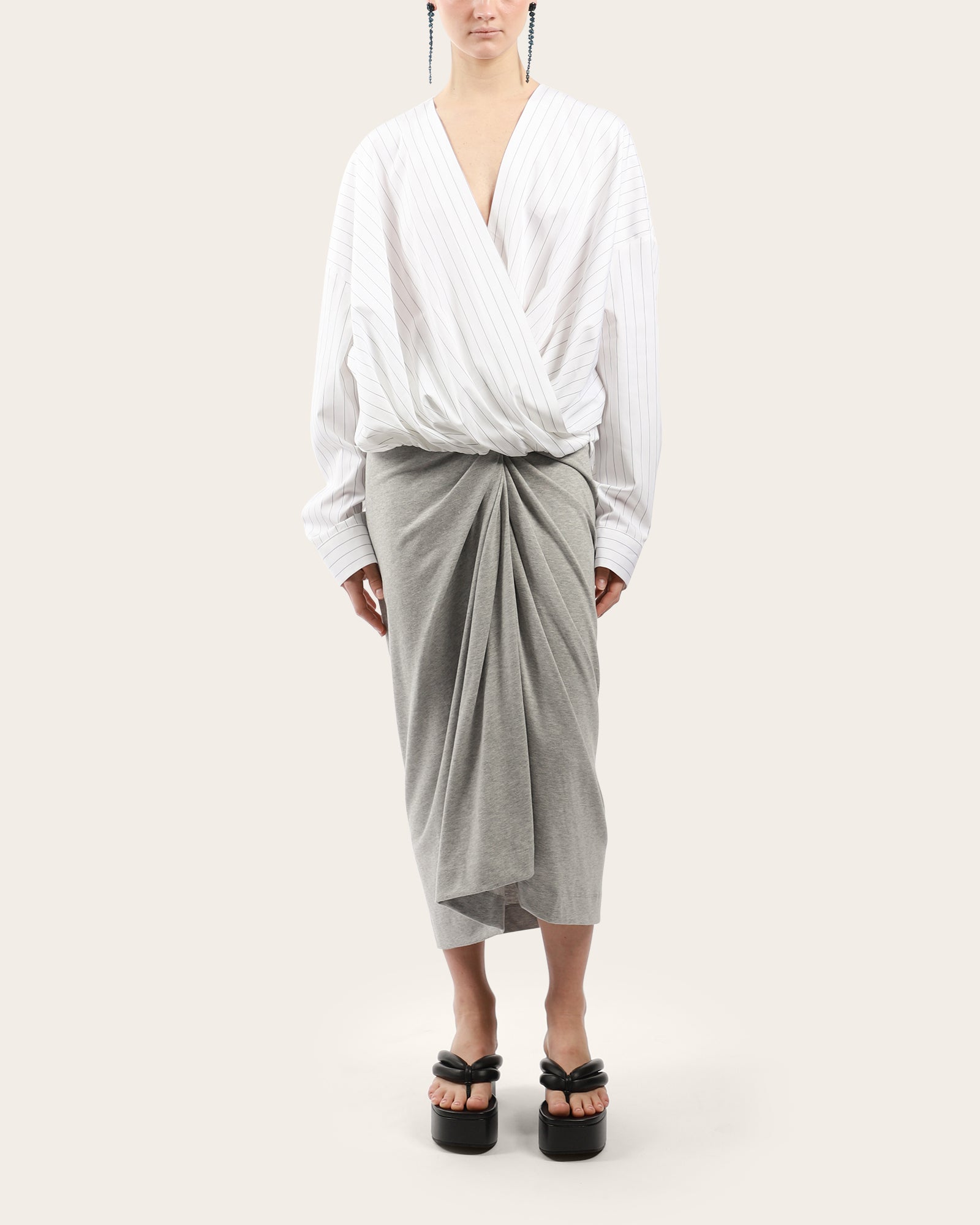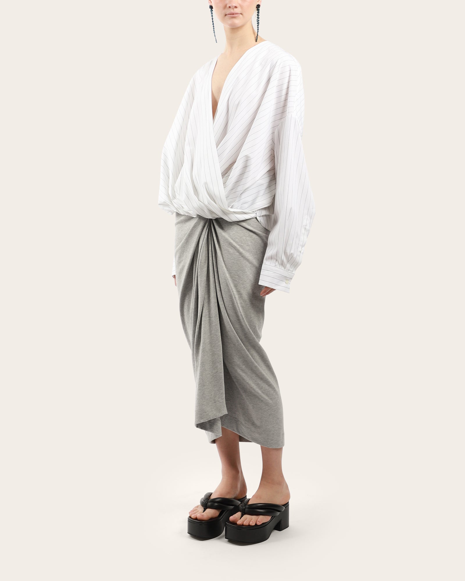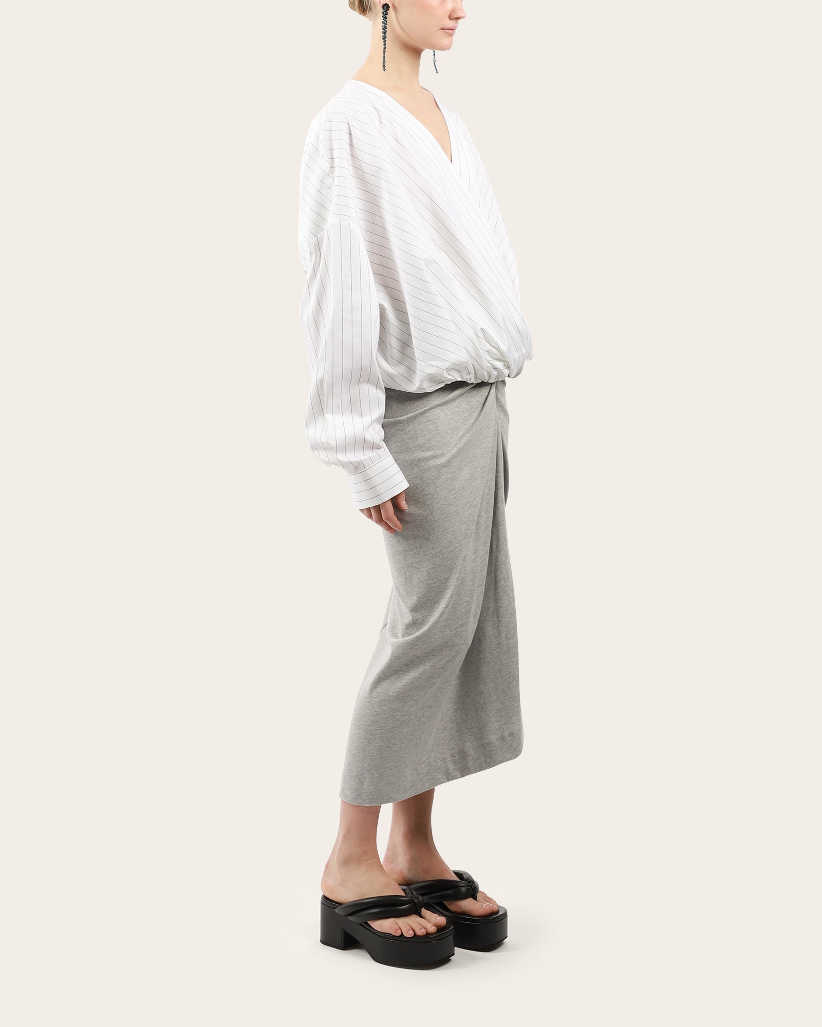The Camiel Wrap Top, features light navy stripes on white, a relaxed wrap front, ruched waist, and button cuffs. Wear on or off the shoulders for versatile styling. Made in Portugal.