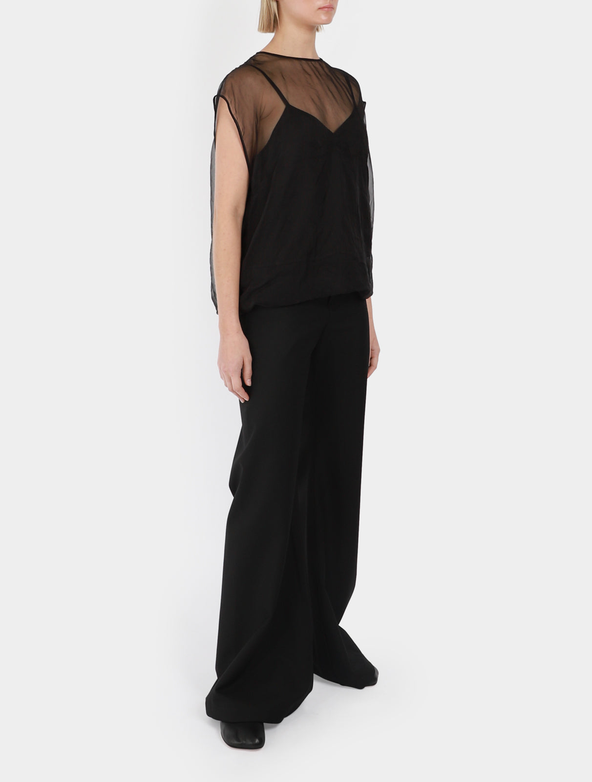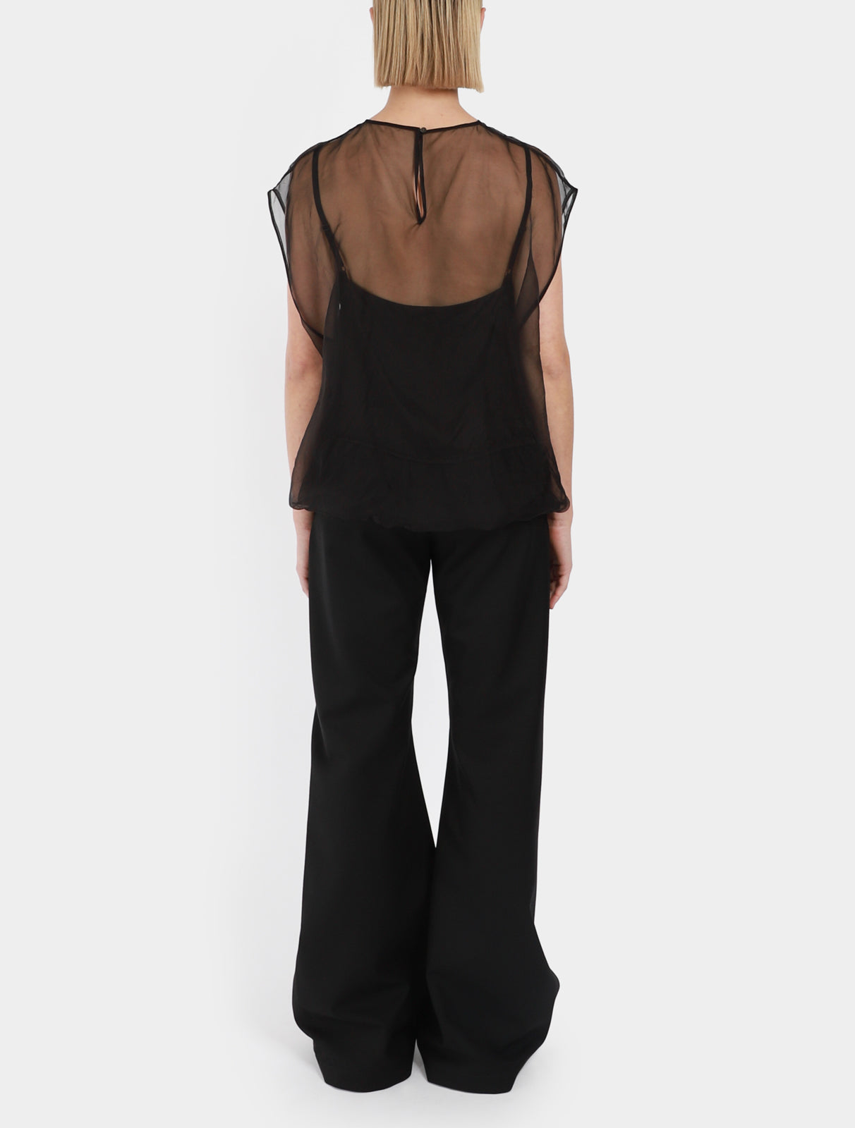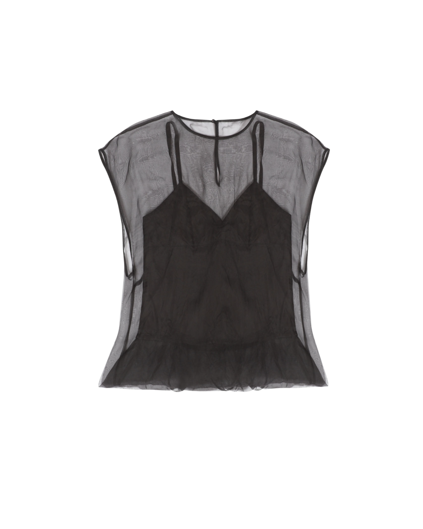 Dries Van Noten Capo Layered Sheer Top, featuring a sheer overlay top attached from hem to singlet look with V cut, adjustable straps and button at back on sheer overlay to close.