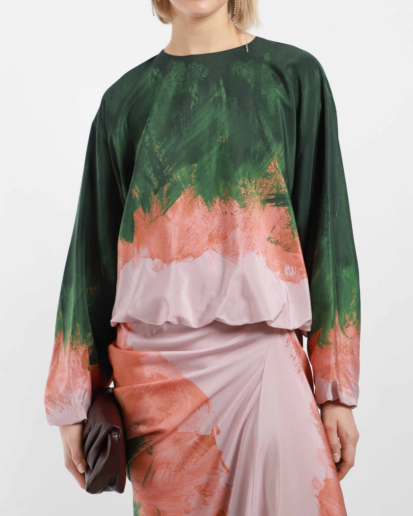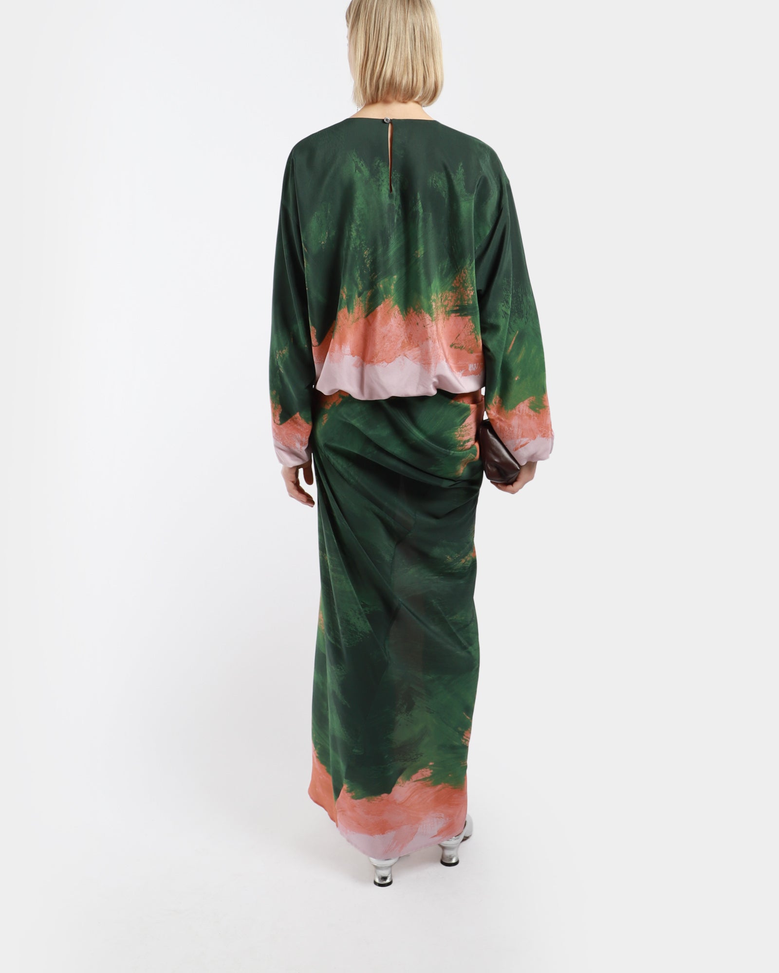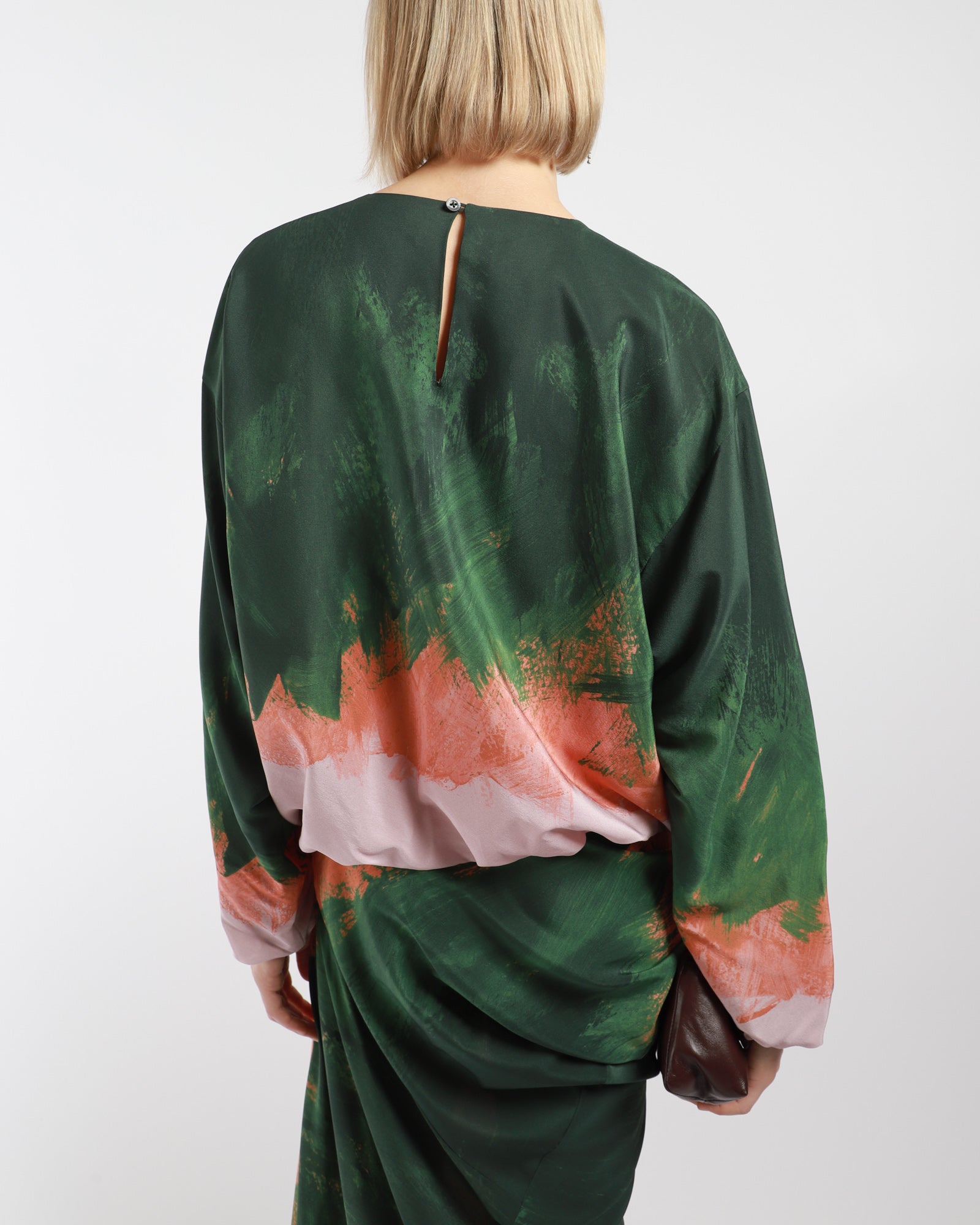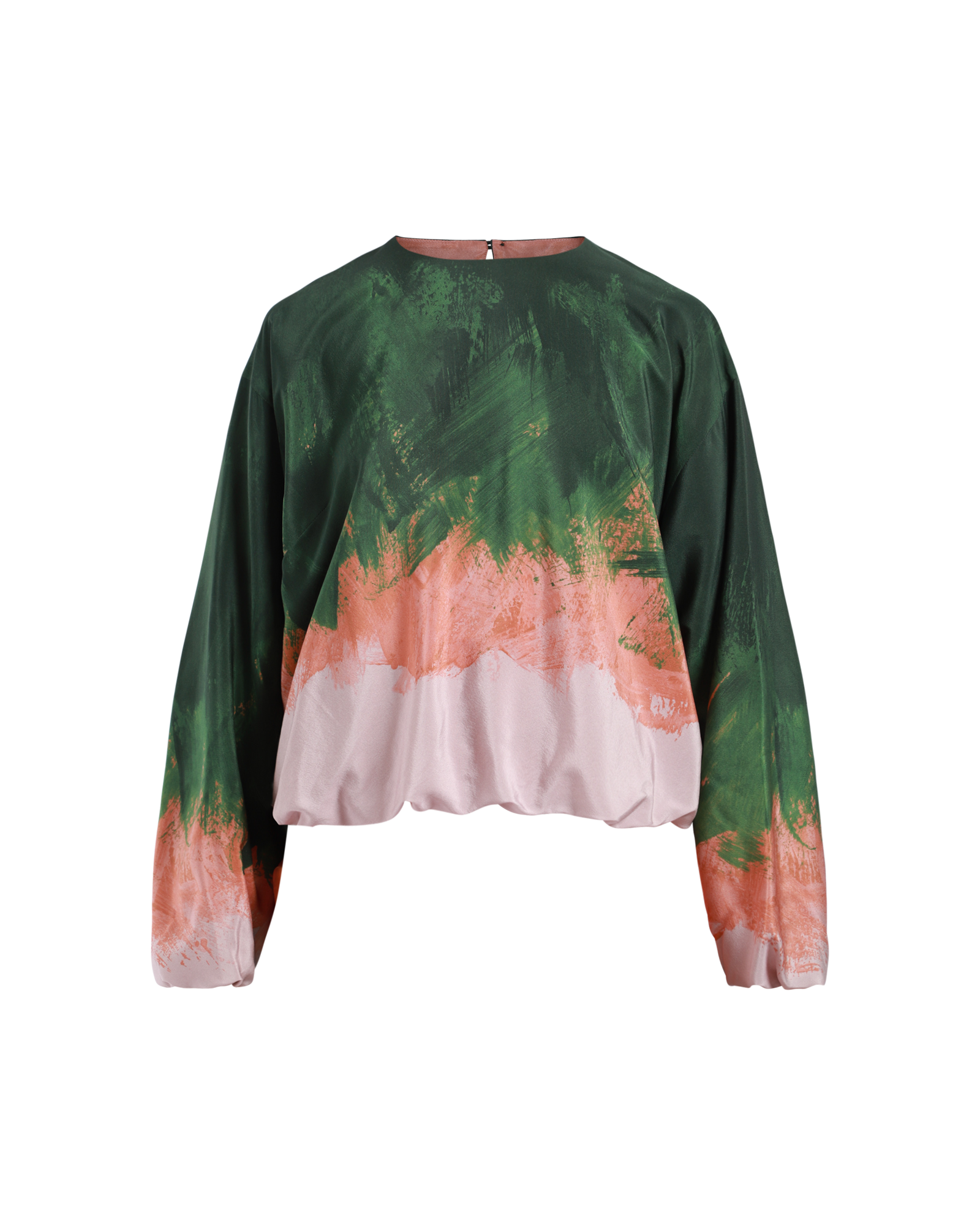 The Dries Van Noten Capo Shirt features a loose fit with a striking brushstrokes print. It has long, elasticated sleeves and hem, a round neckline, and a single button closure at the back.