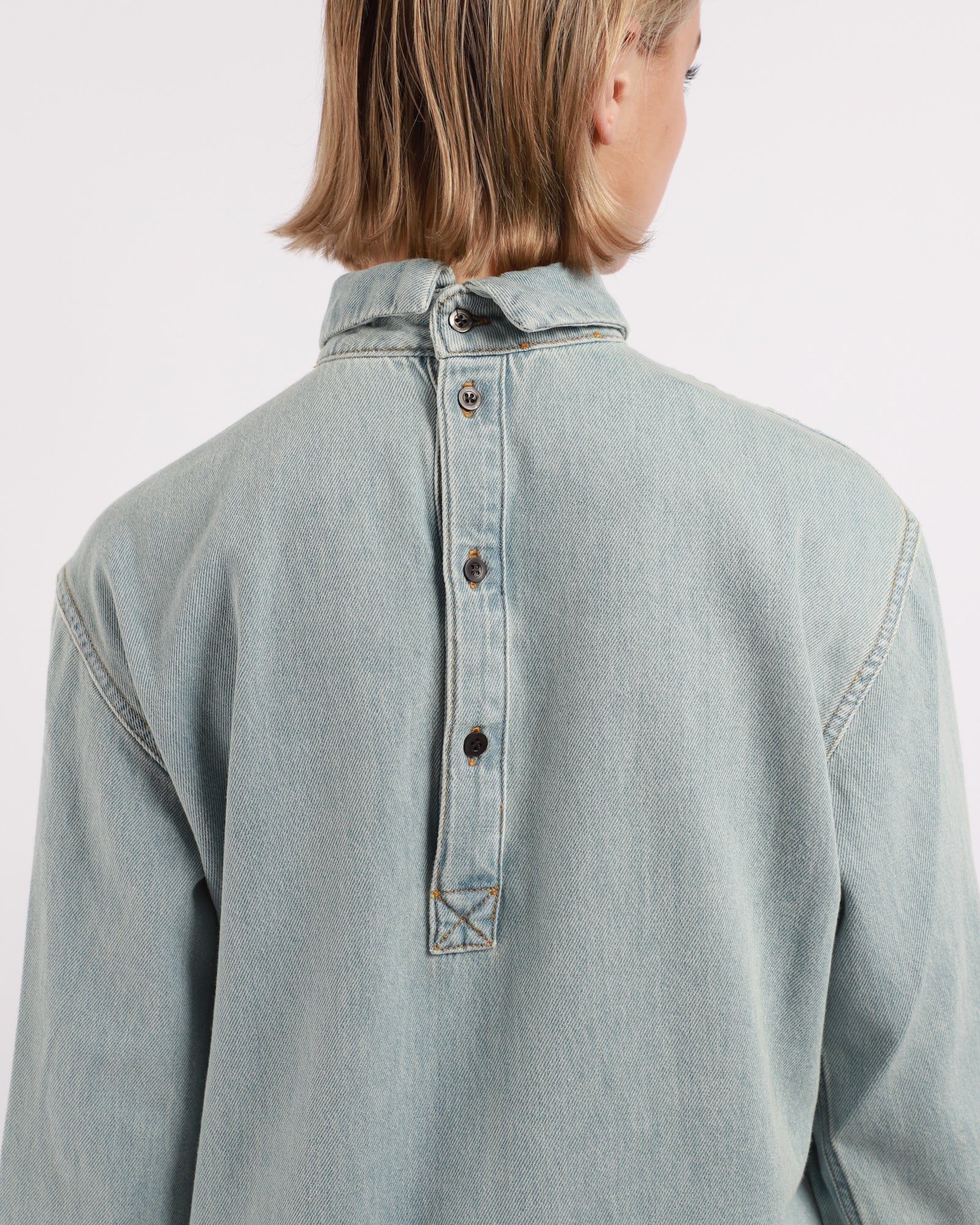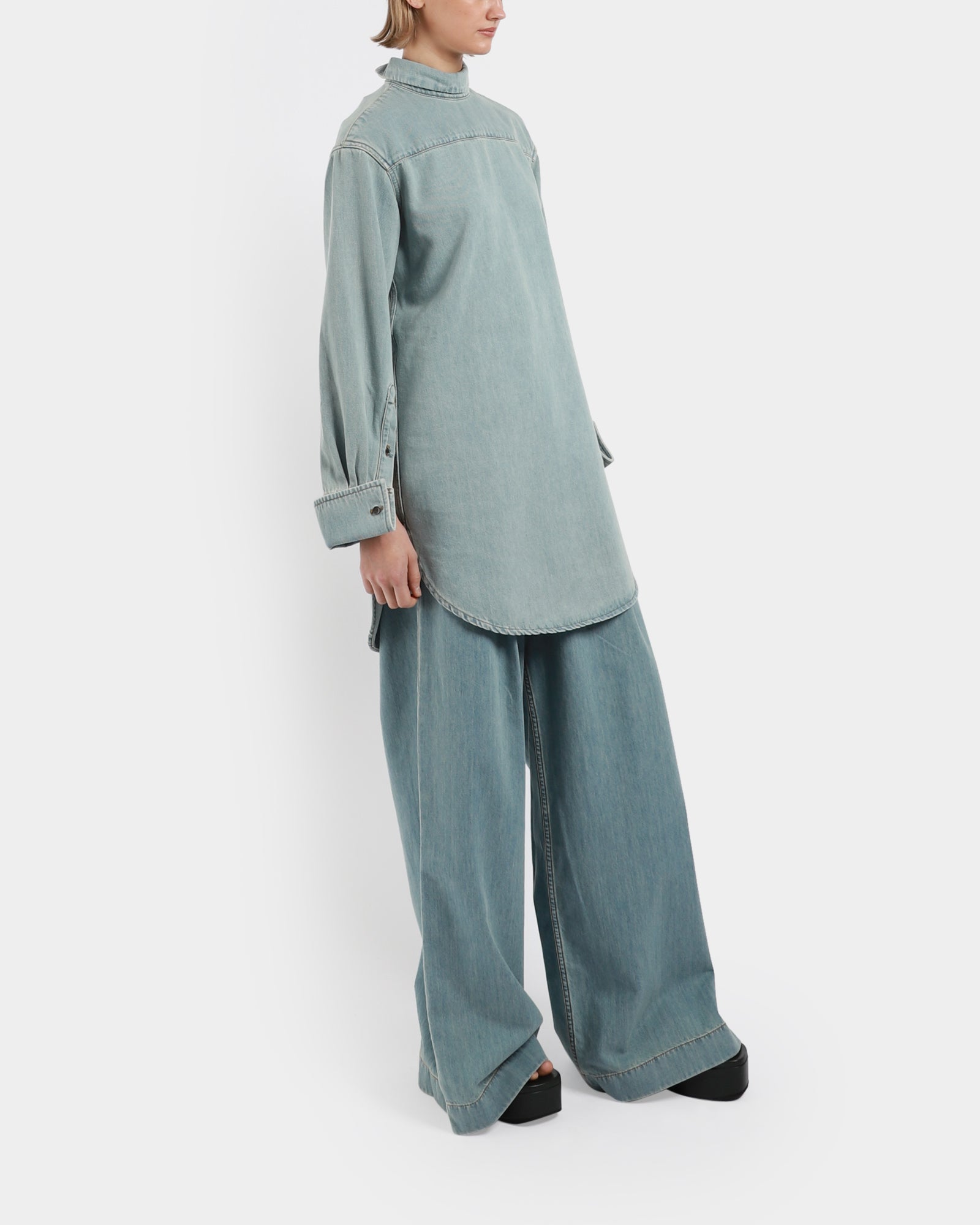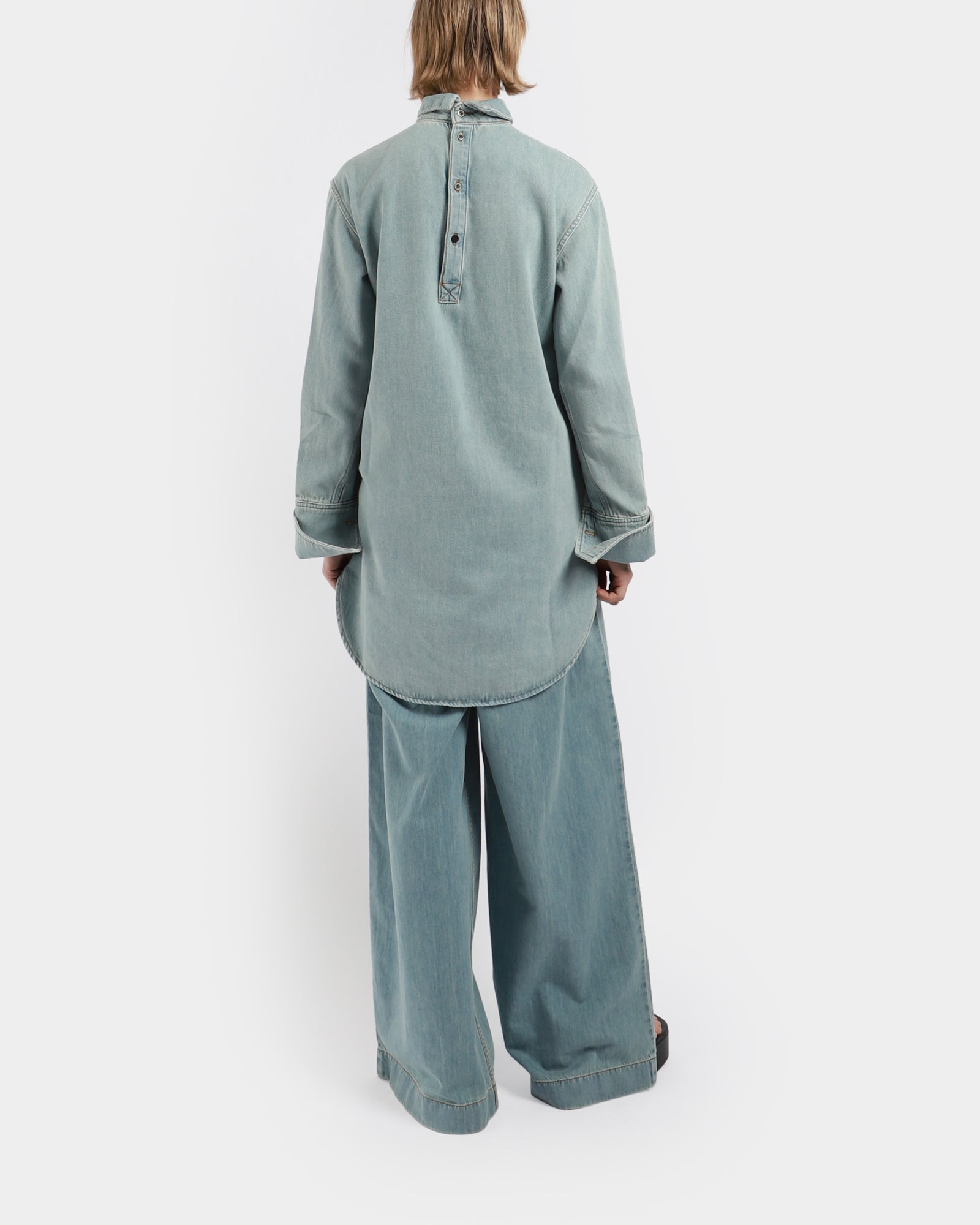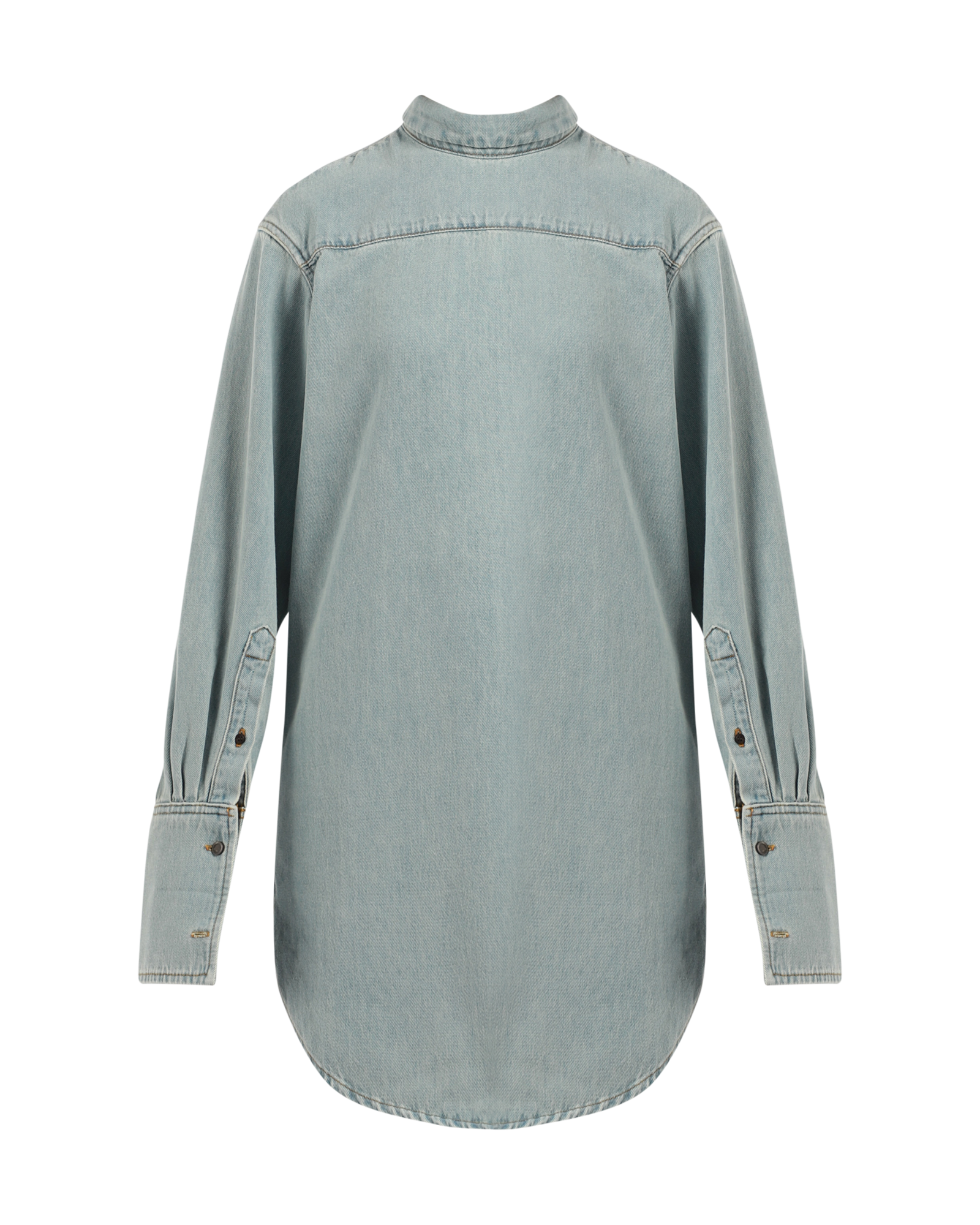 Dries Van Noten reverses the conventional button-up shirt, with the collar and buttons at the back. It is cut in a longline silhouette with a curved hem, and convertible fold-over cuffs.