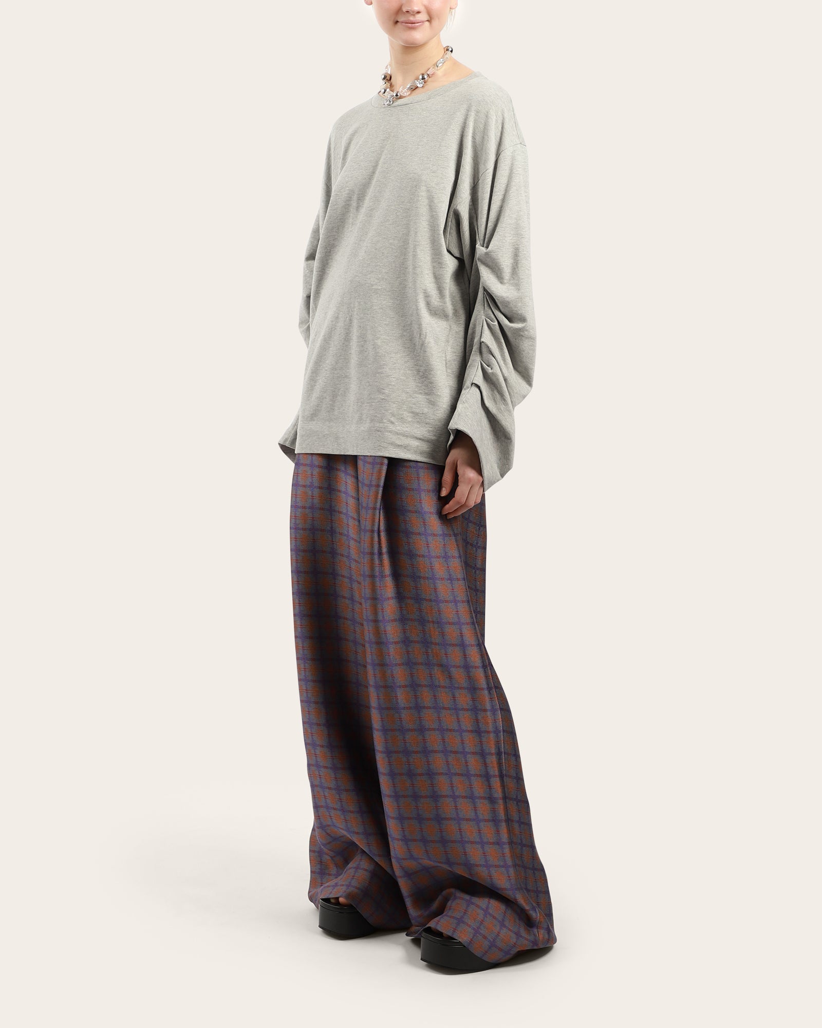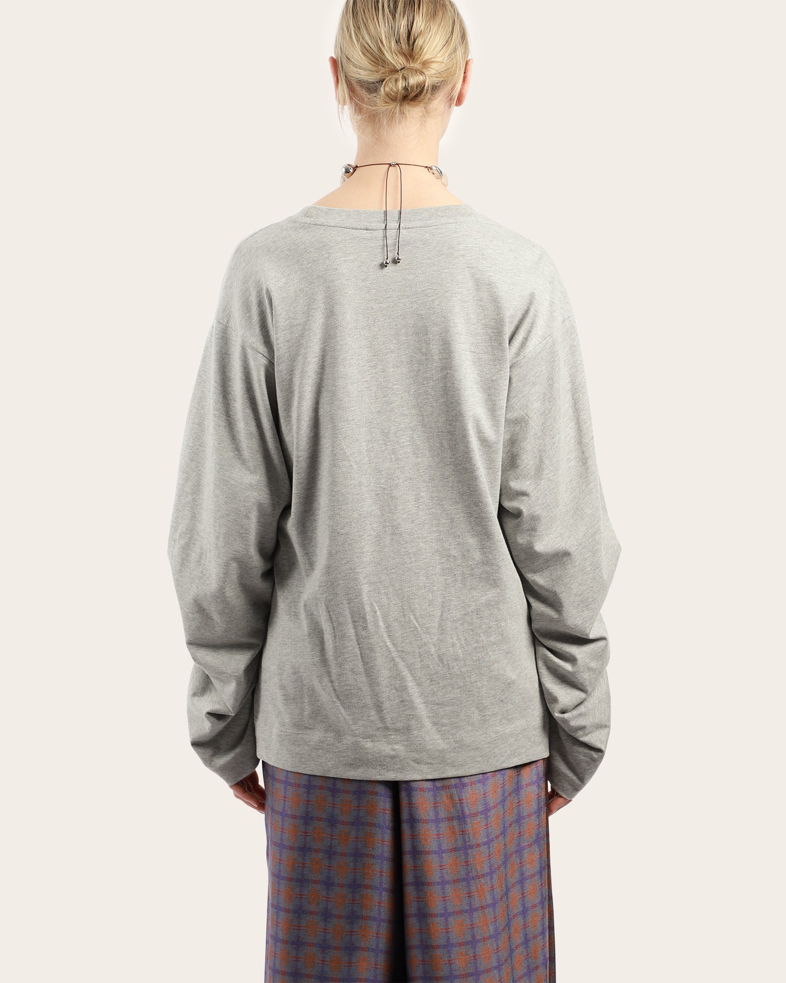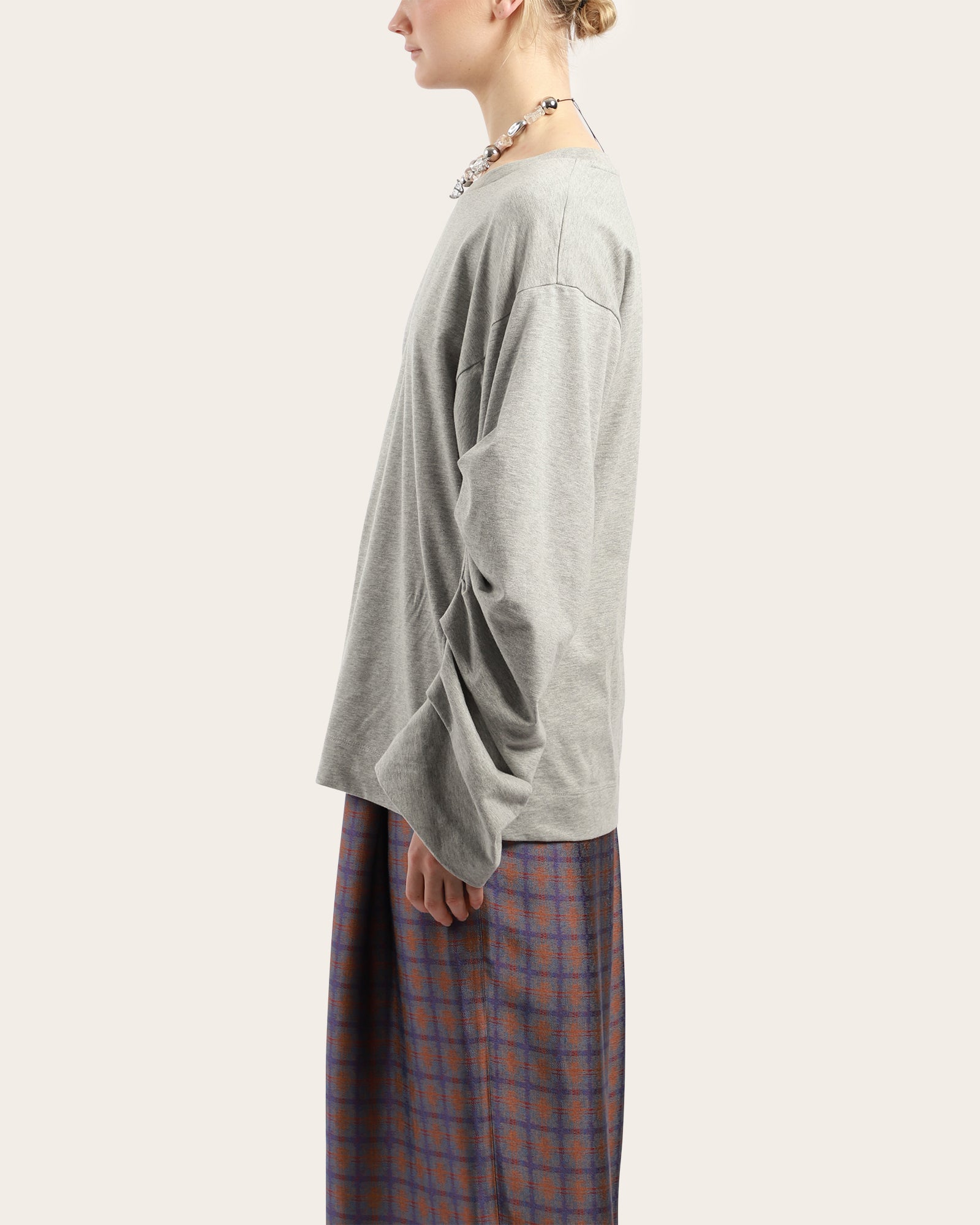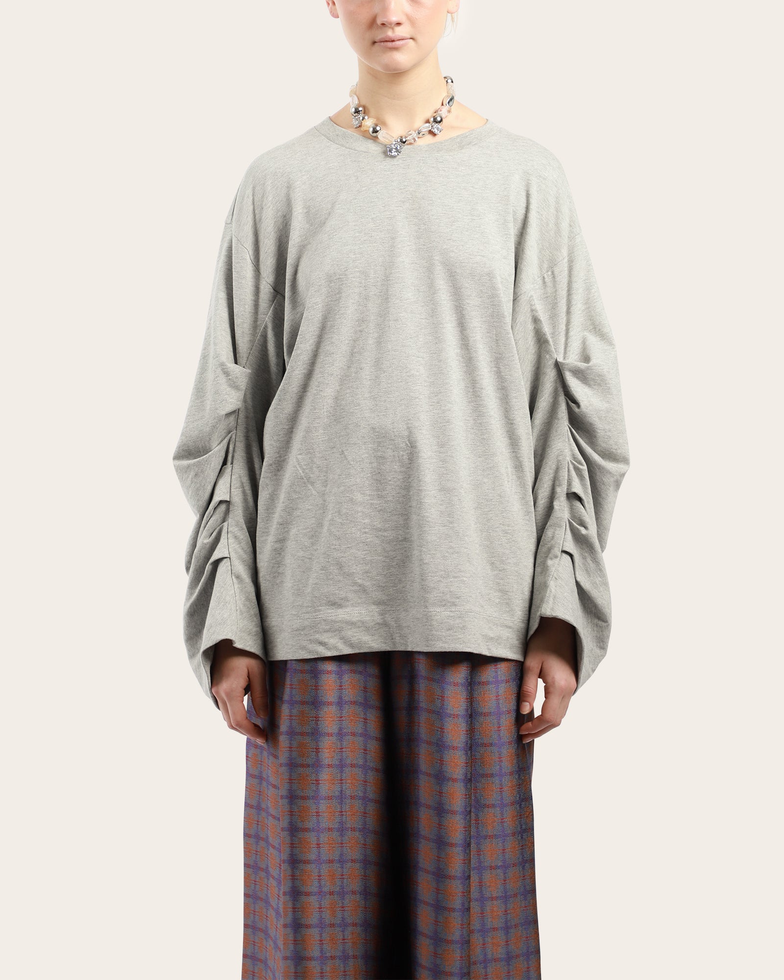 A jersey cotton top, featuring a round neckline, long sleeves with ruched details bringing volume to the garment. Made in Turkey.