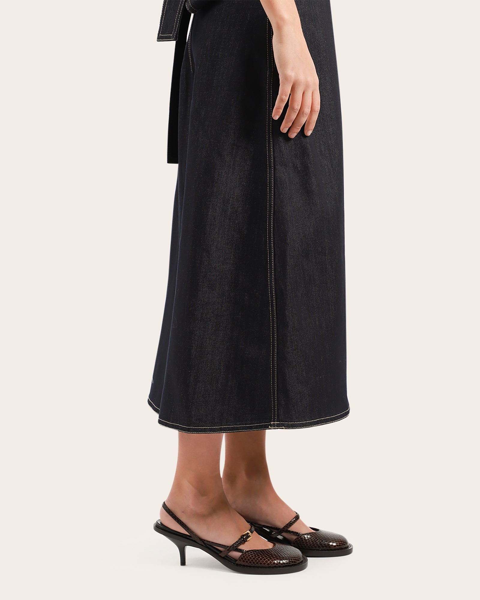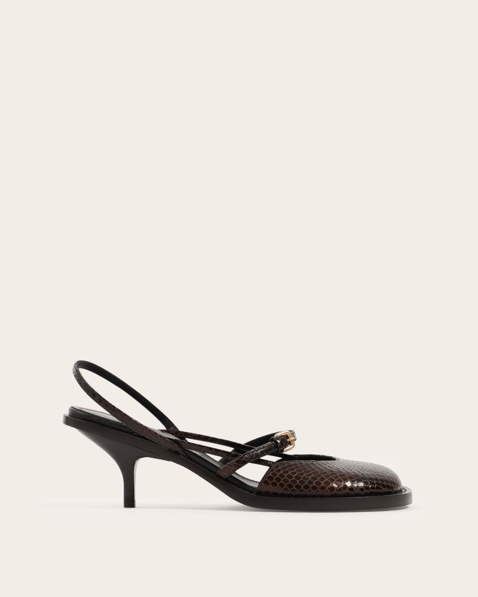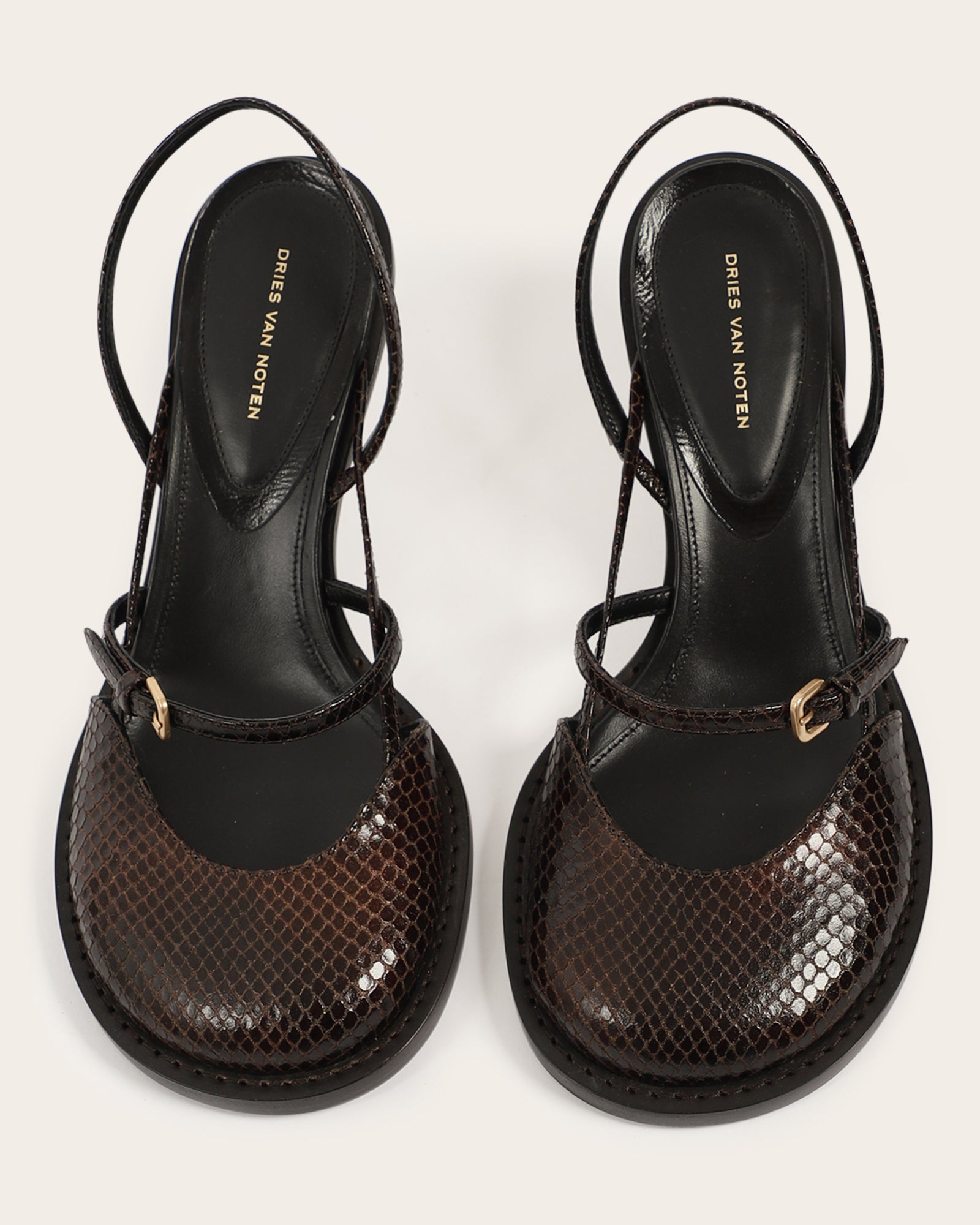 These round toe heels from Dries van Noten, featuring a small kitten heel, wide sole with apparent brown stitches, round wide toe, print snakes skin leather detail, adjustable strap at front foot with gold toned buckle and a back strap.