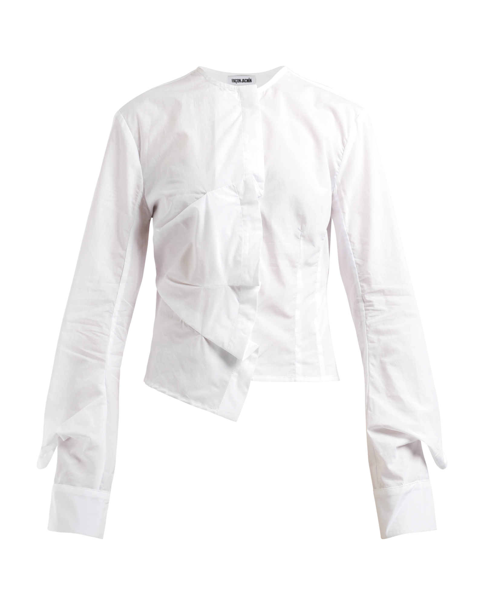 The Chrystal Weaving Shirt is a round neck cropped fitting blouse made with a light Italian popeline. Features an asymmetrical wavy pleated design, complete with bumpy slits at the sleeves. Made in Bulgaria.