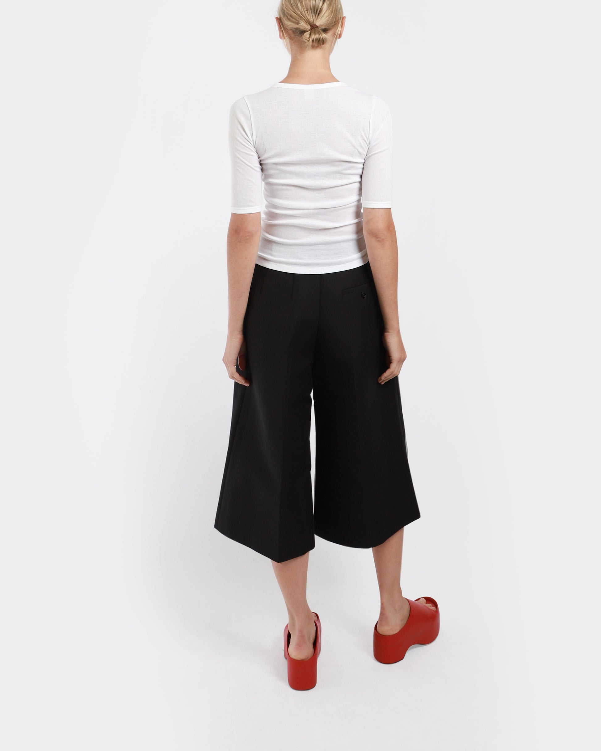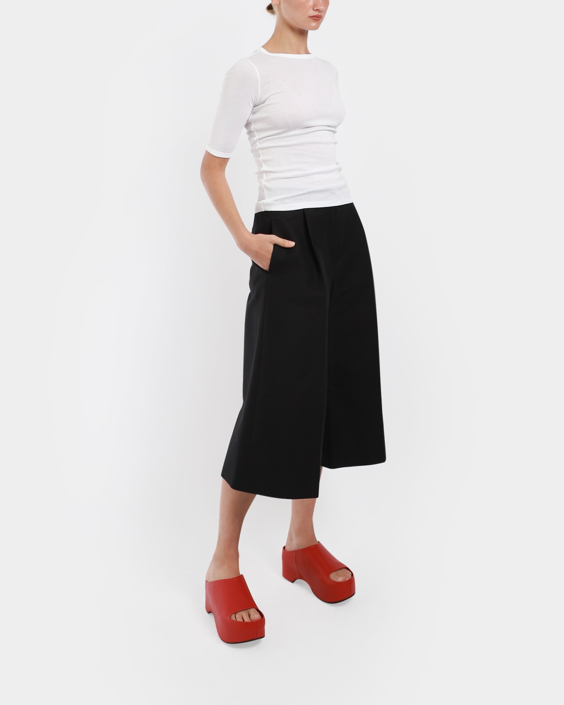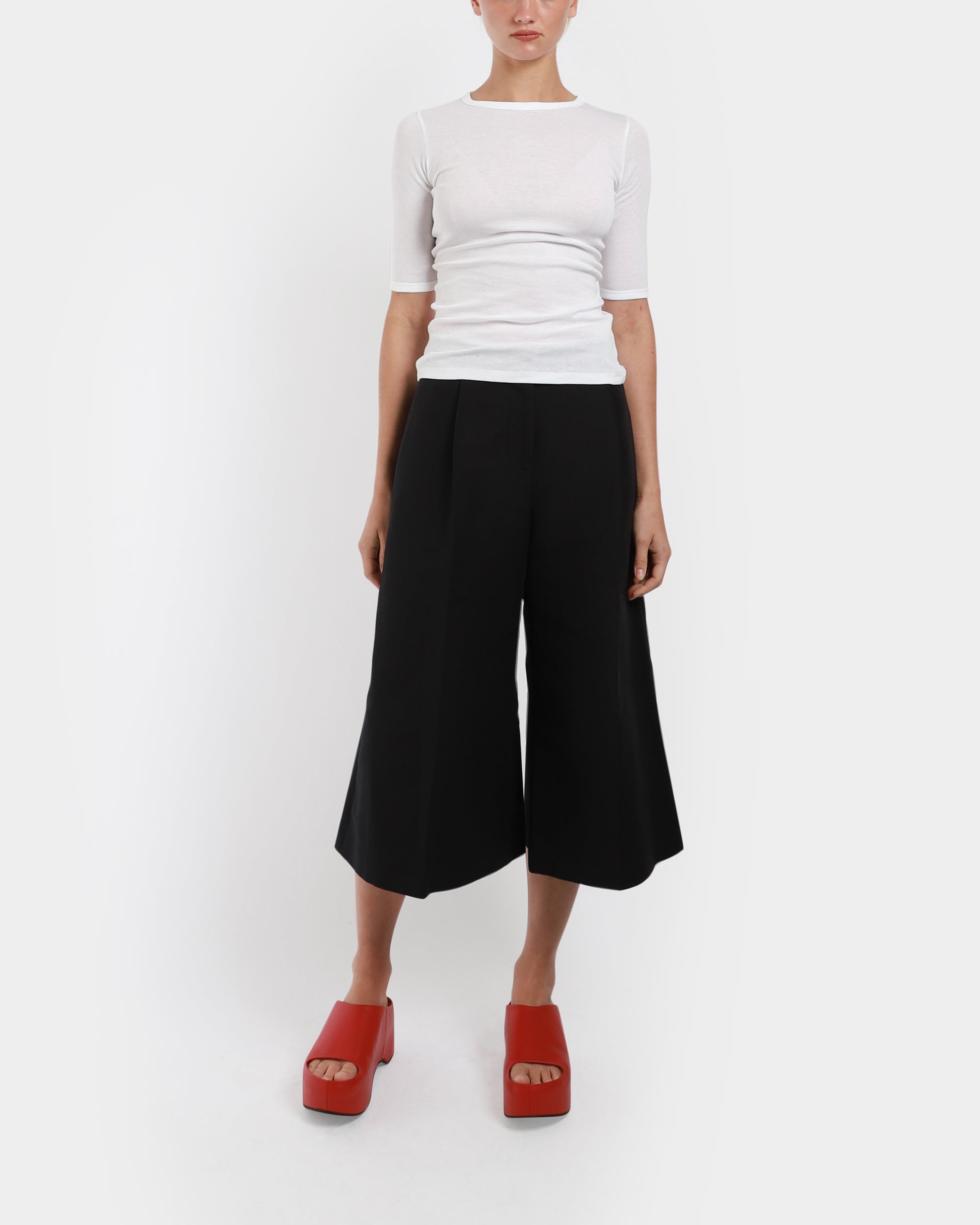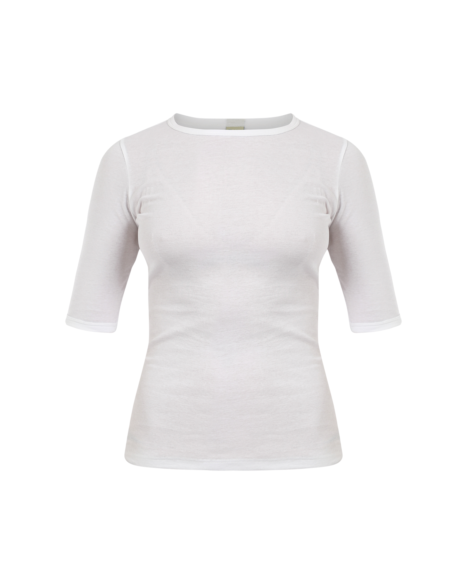 The Anna Tee by Flore Flore is a fitted tee made from a light weight organic cotton jersey. It has a flattering fit with elongated short sleeves and a high round neckline. Made in Portugal.