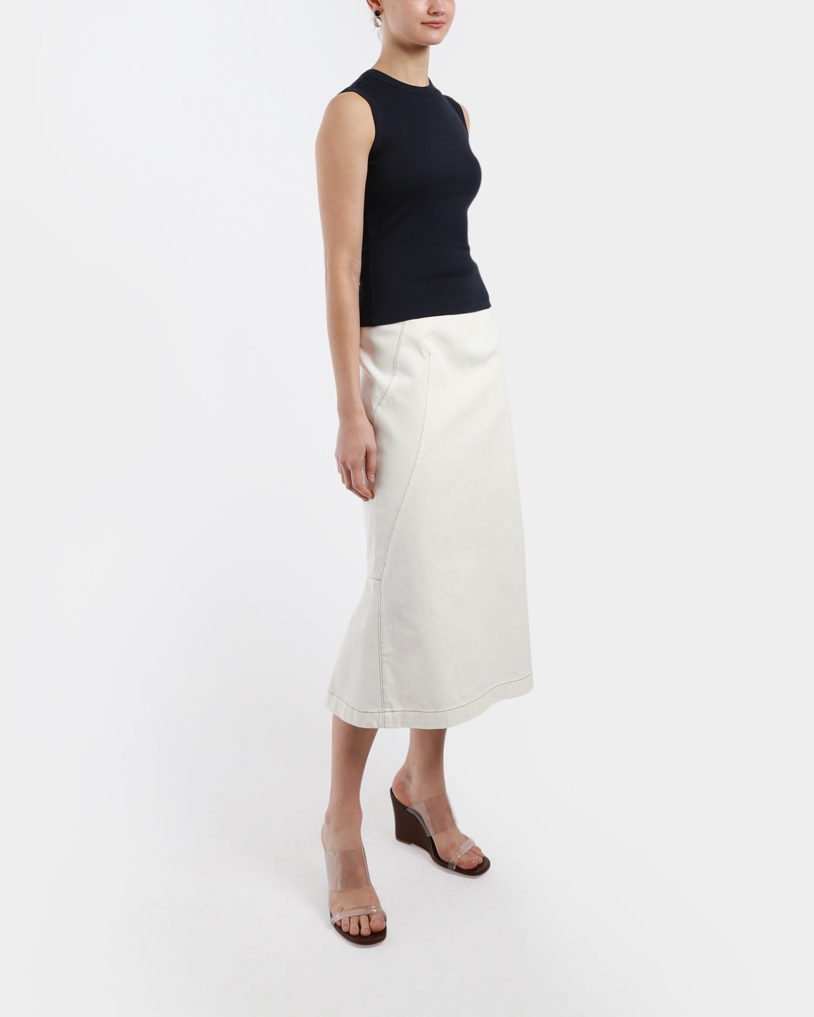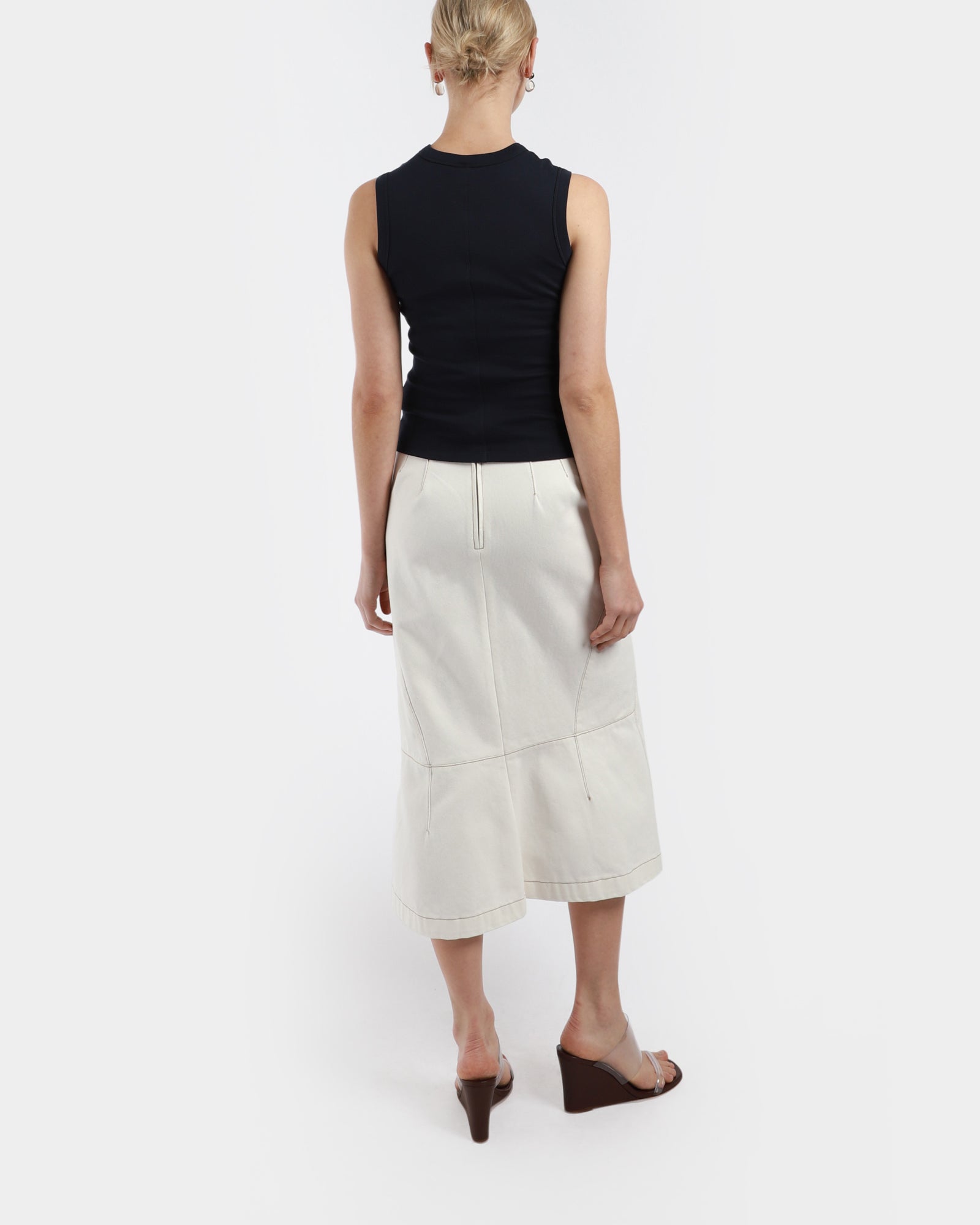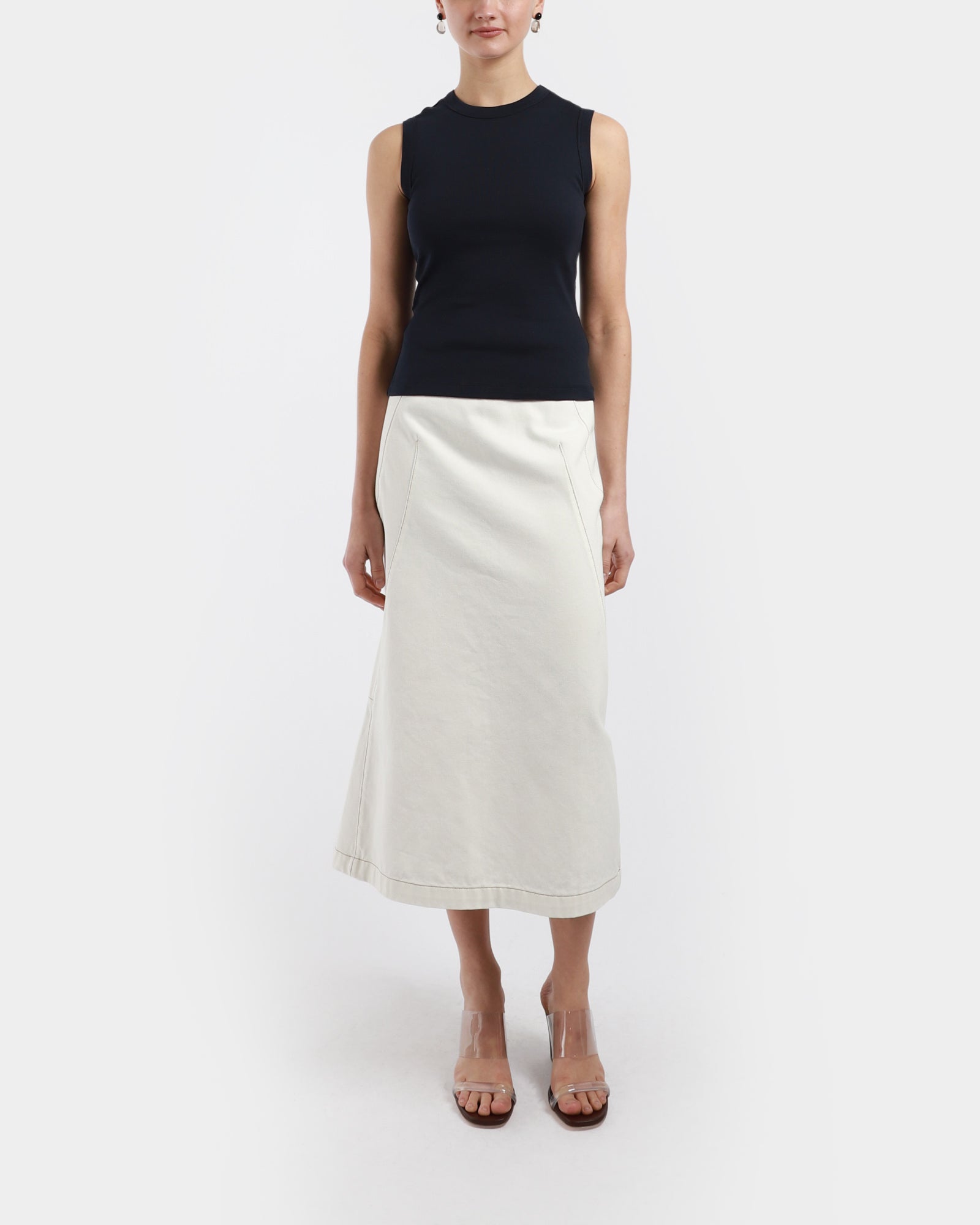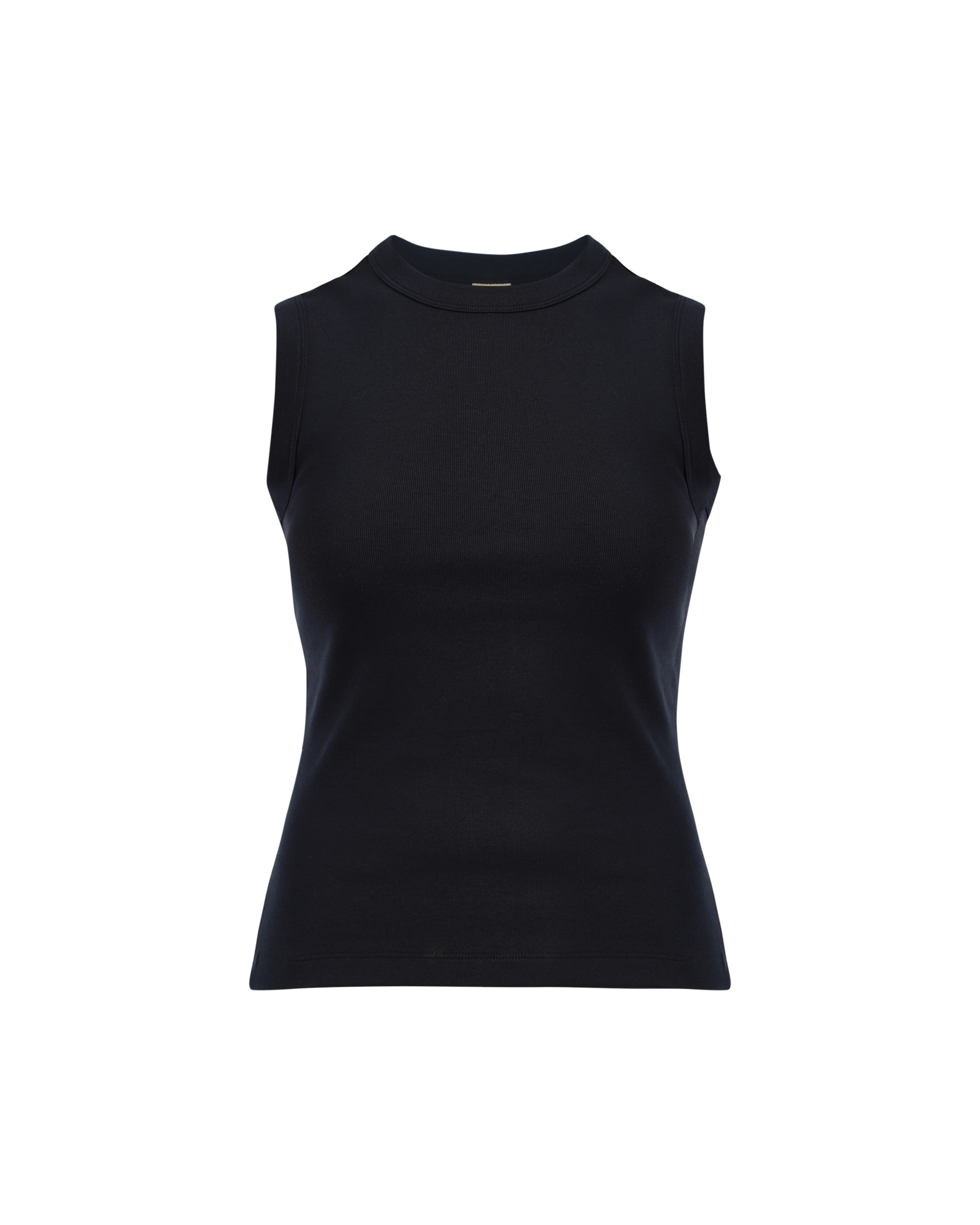 The Esme Tank is a fitted, crew neck tank with a double-stitched, cut-off seam at the back. Crafted from medium-weight organic cotton, it has a fine ribbed texture and a banded neck and scooped out armholes. Made in Portugal.