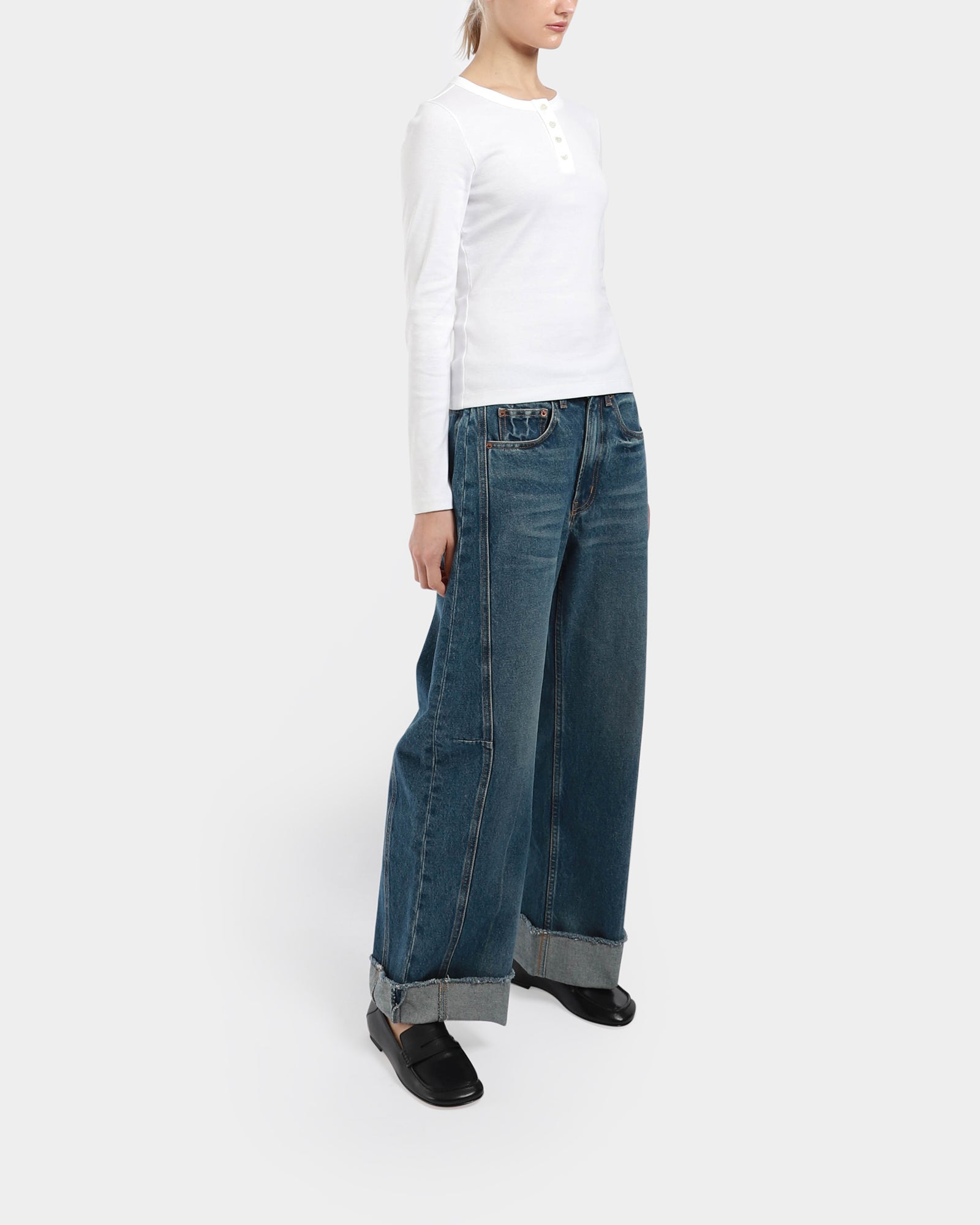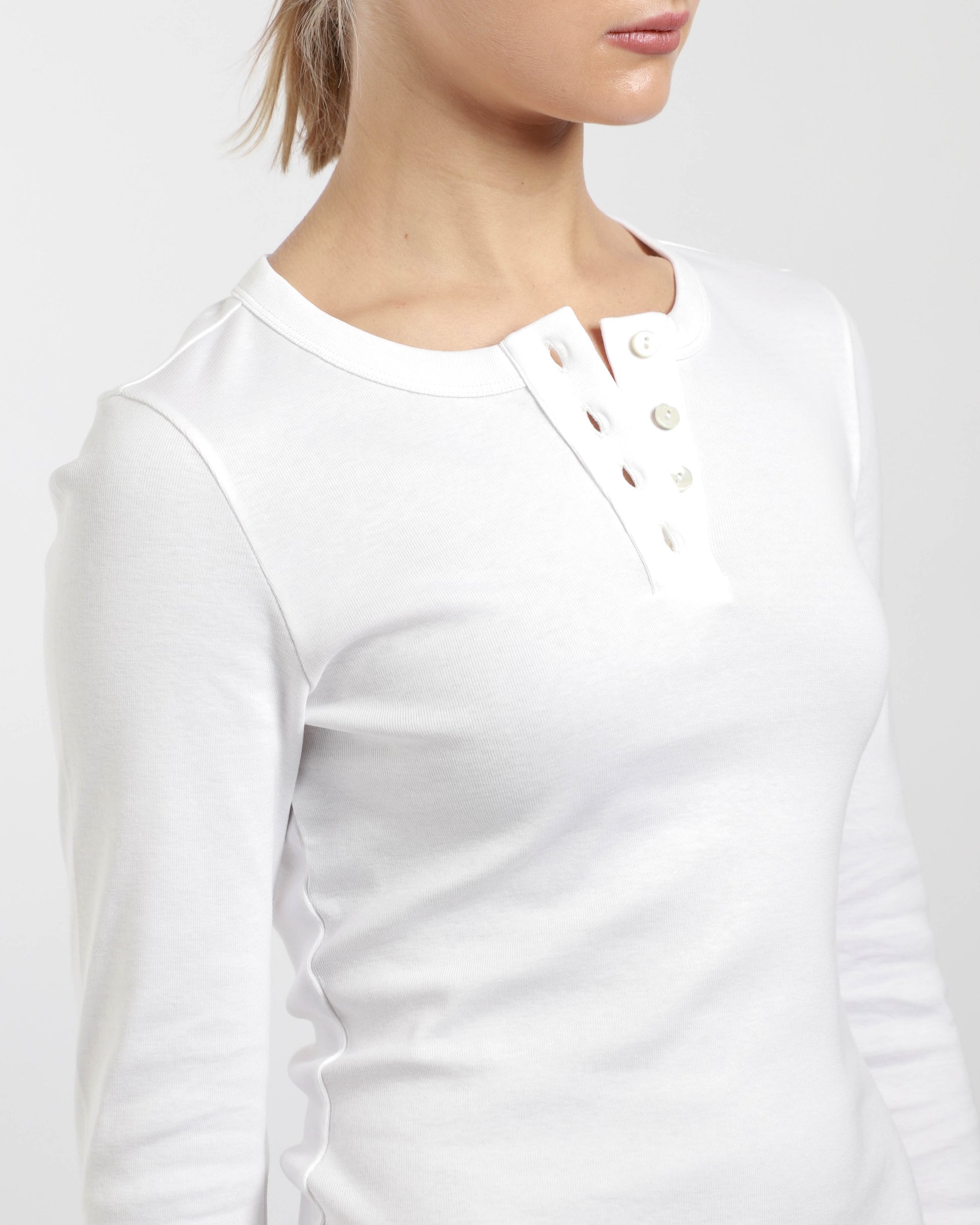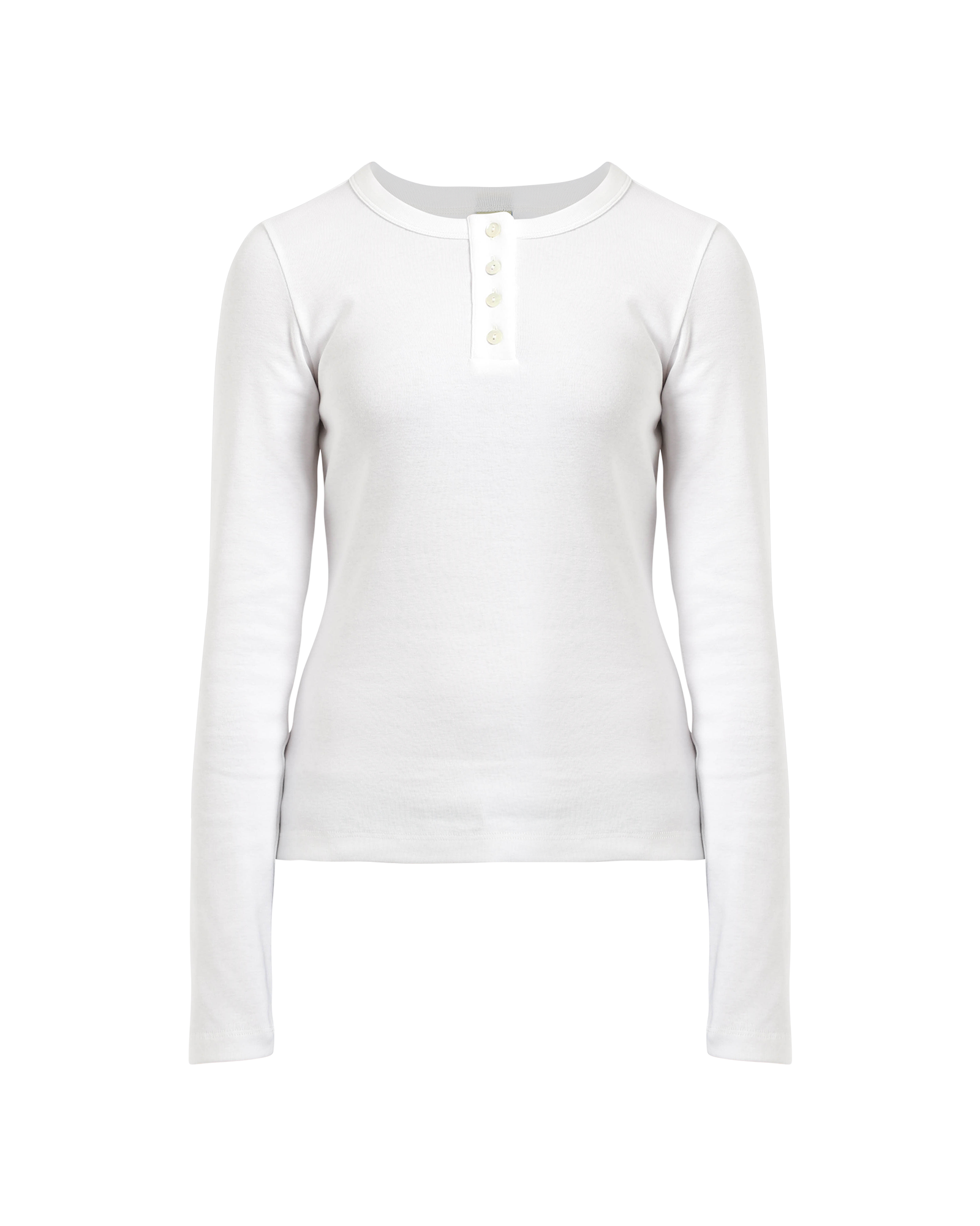 The Jess Longsleeve tee, made from 100% organic cotton, features a classic henley tee button-down long sleeve, mother of pearls buttons, a double-stitched cut-off seam on the back. Made from Portugal.
