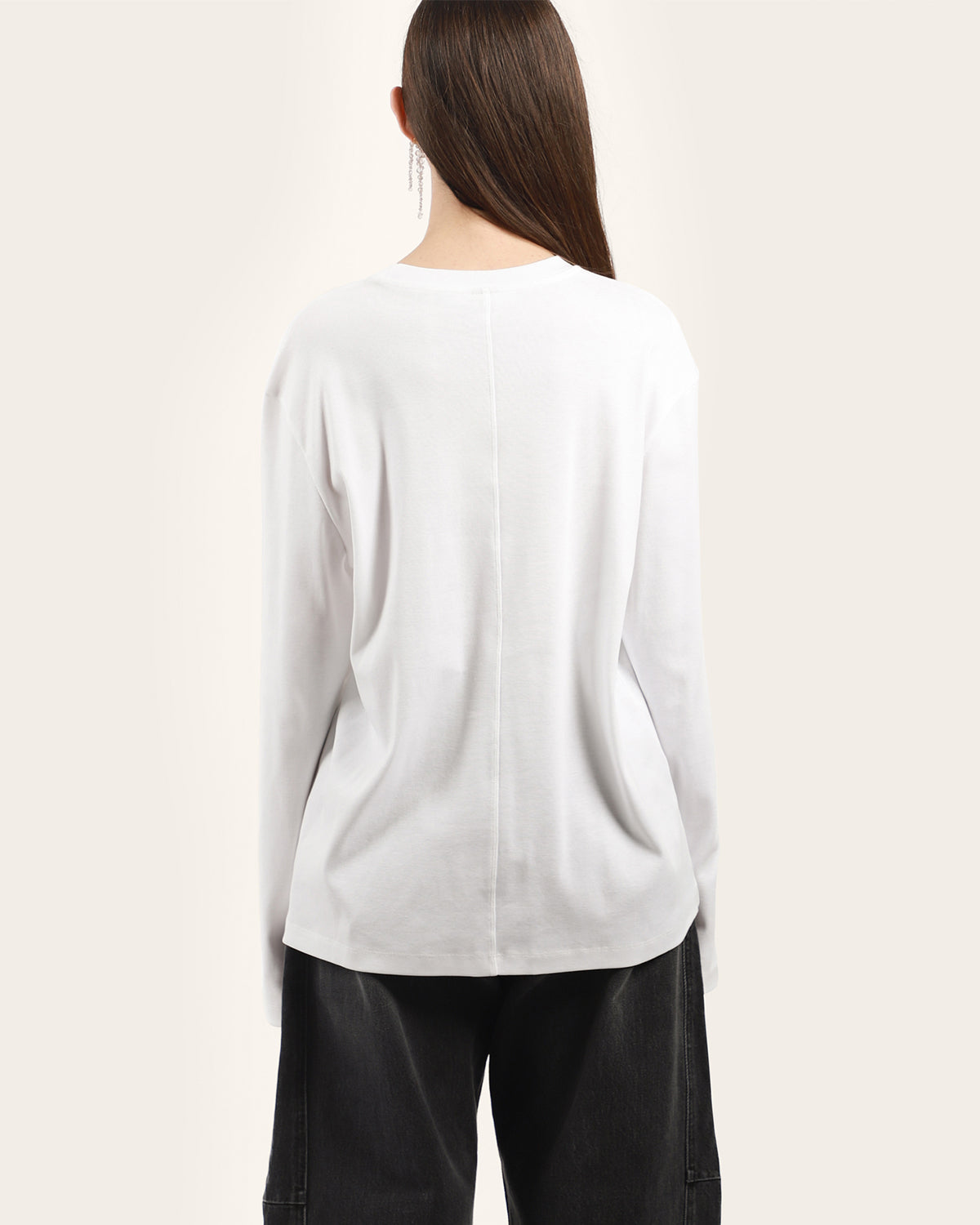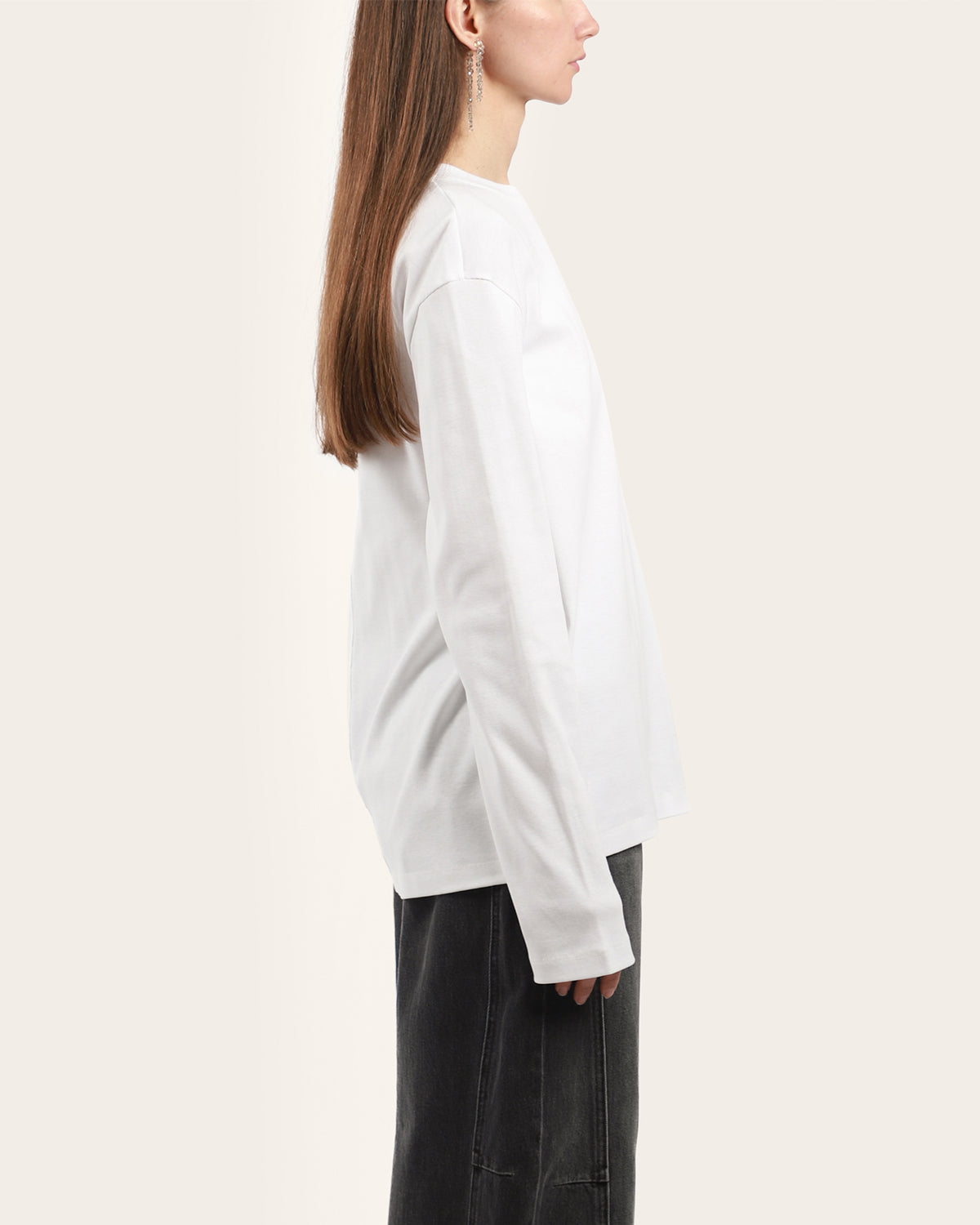 A relaxed long-sleeve tee with a back seam detail, made from 100% organic cotton rib. Ideal for mid season layering. Made in Portugal.