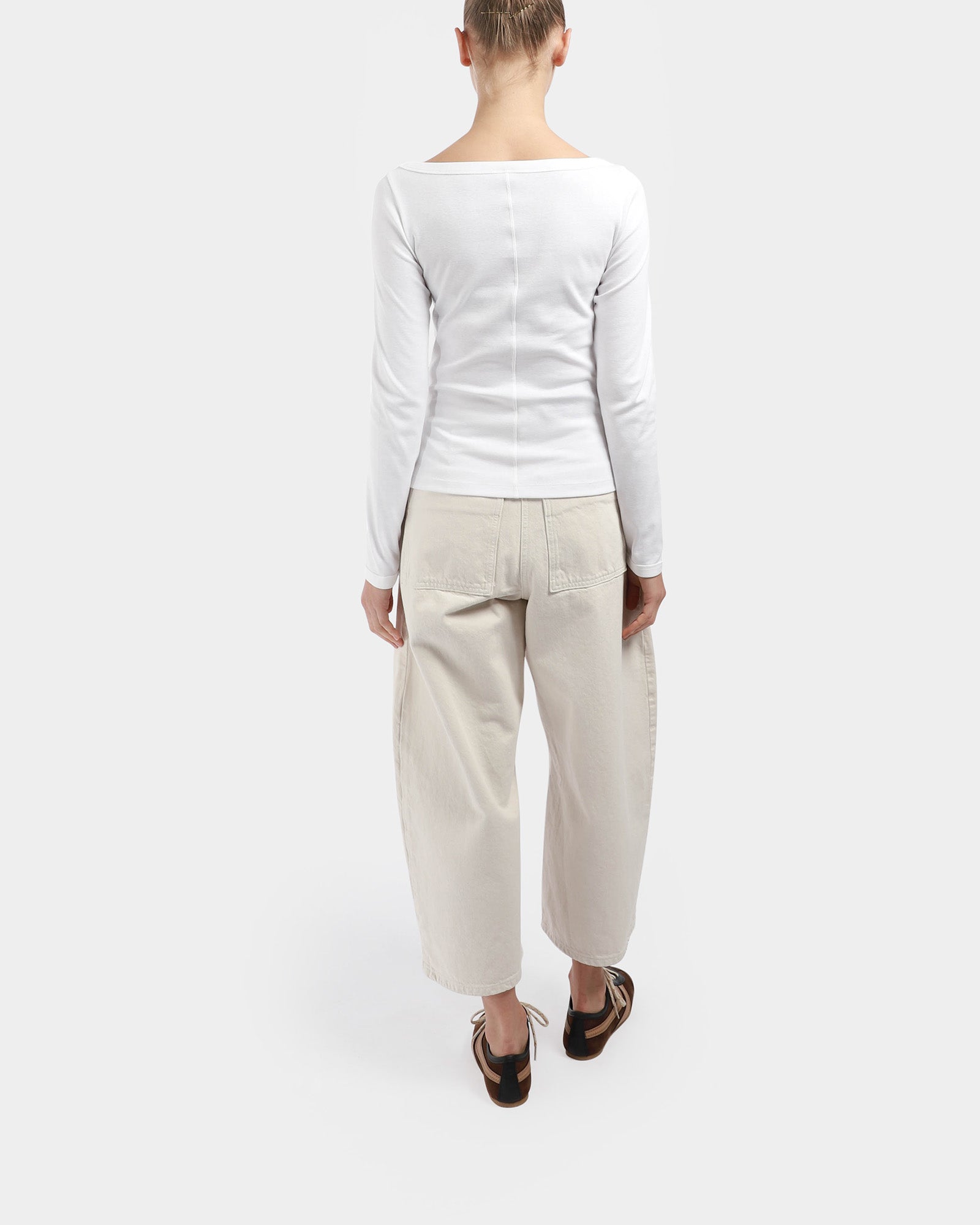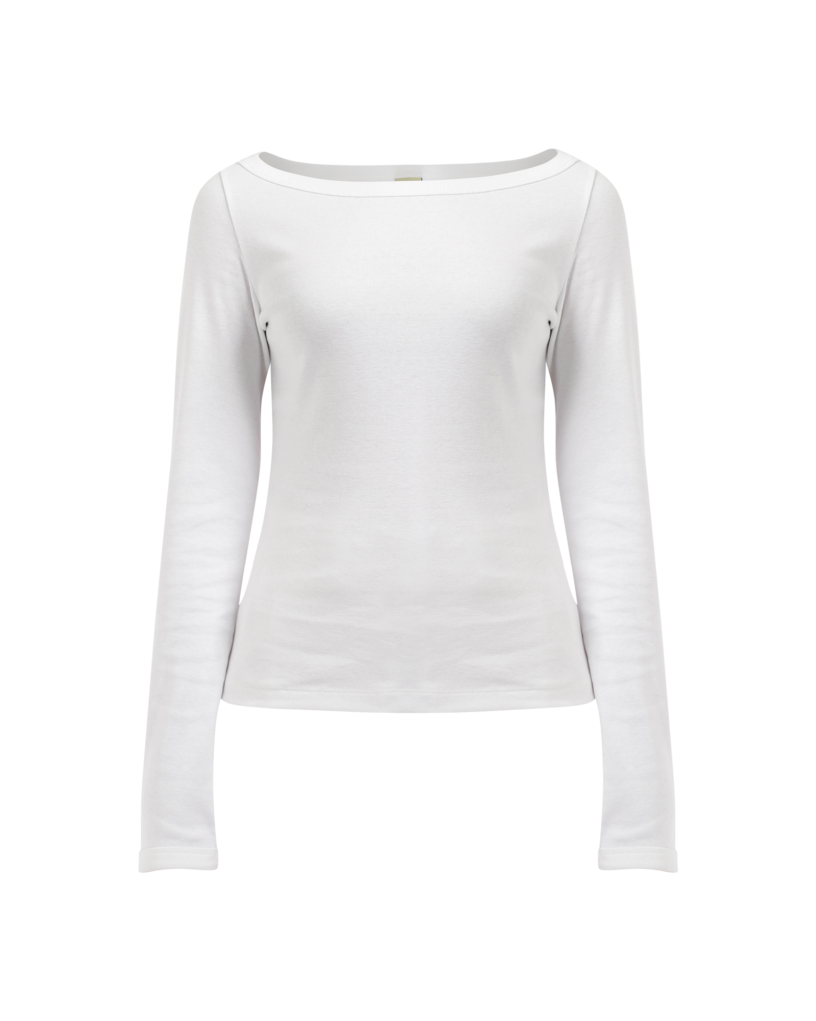 The Steffi Longsleeve tee, made from 100% organic cotton, features a boat neckline, a double stitched cut-off seam on the back and long sleeves with a fitted silhouette. Made in Portugal.