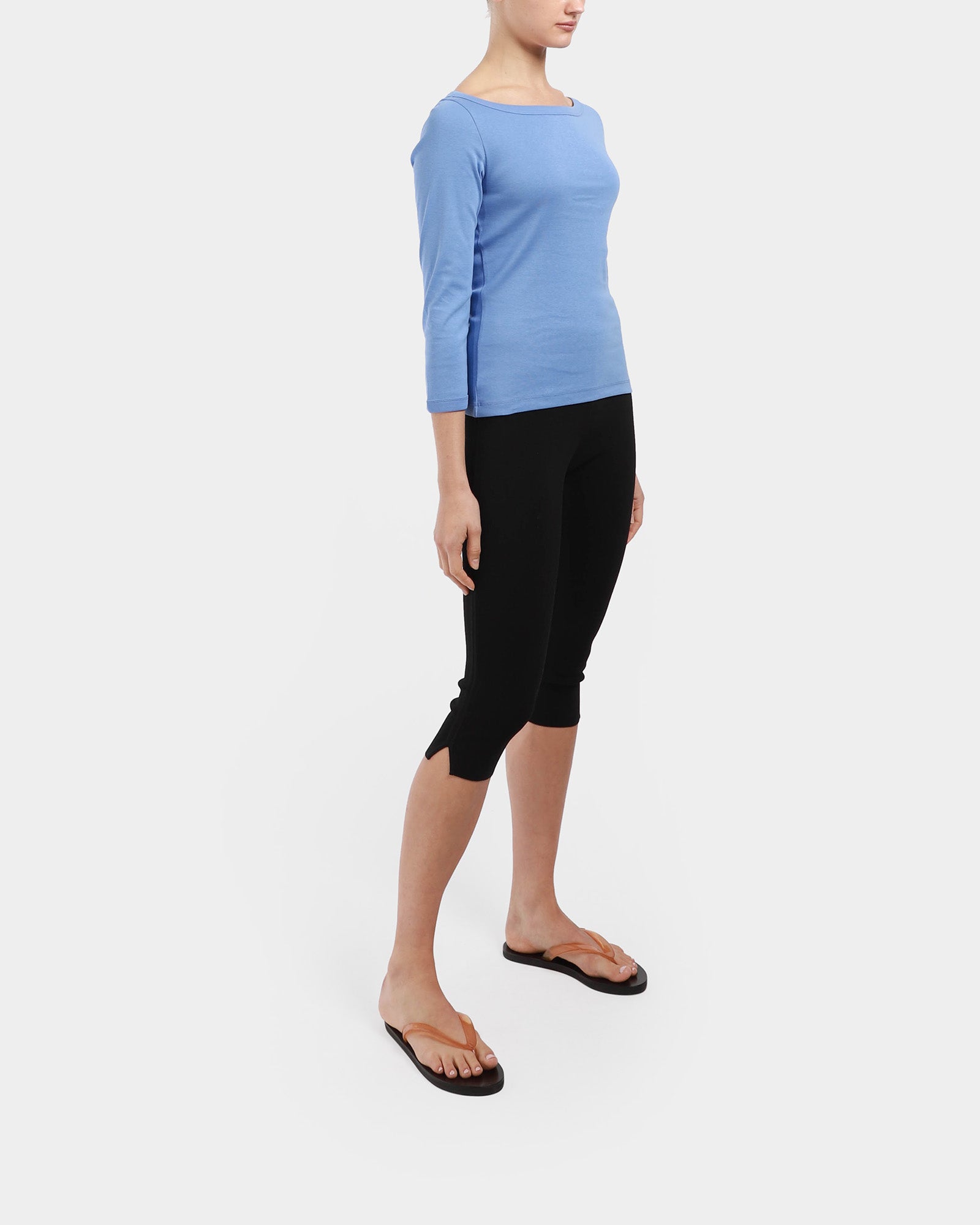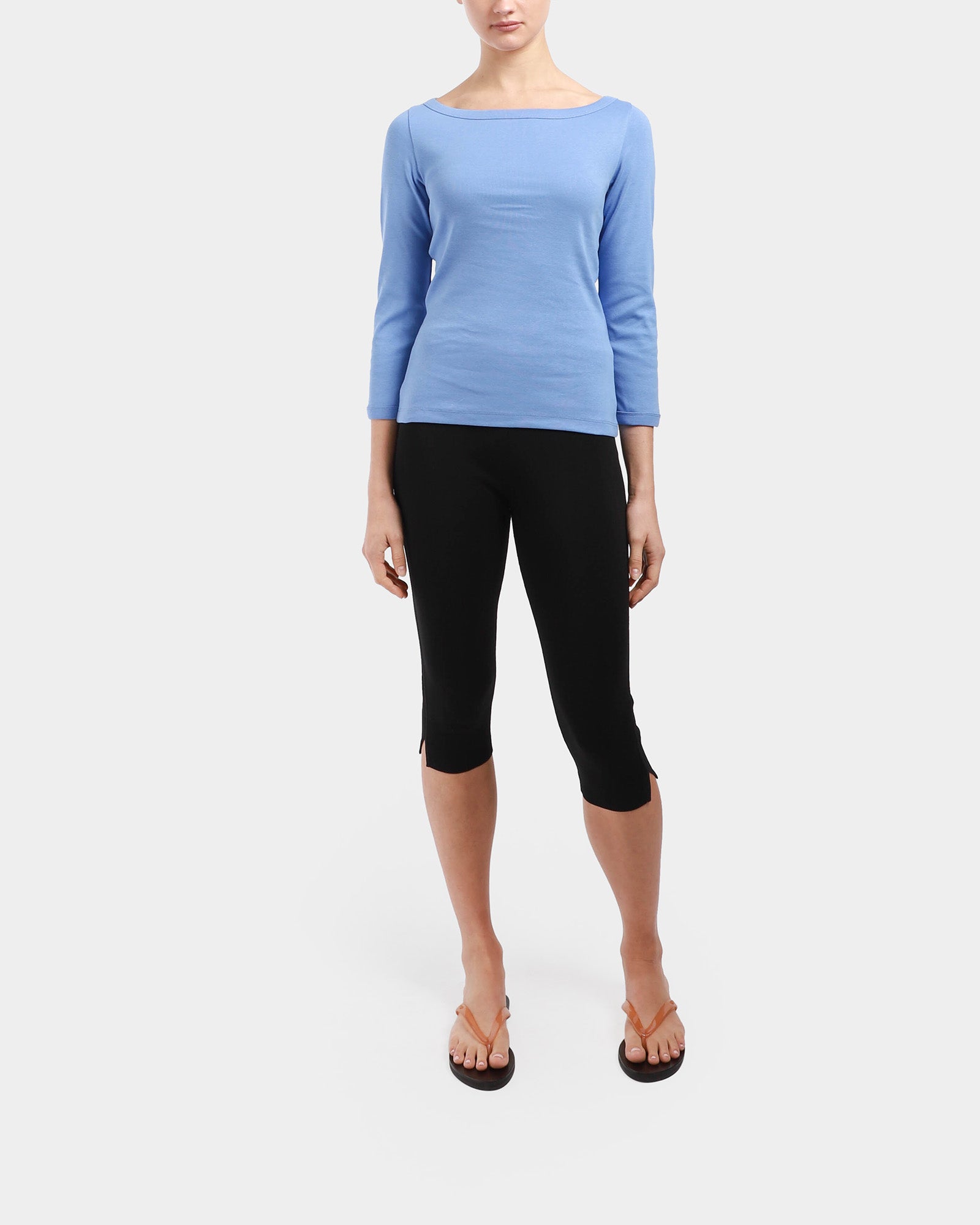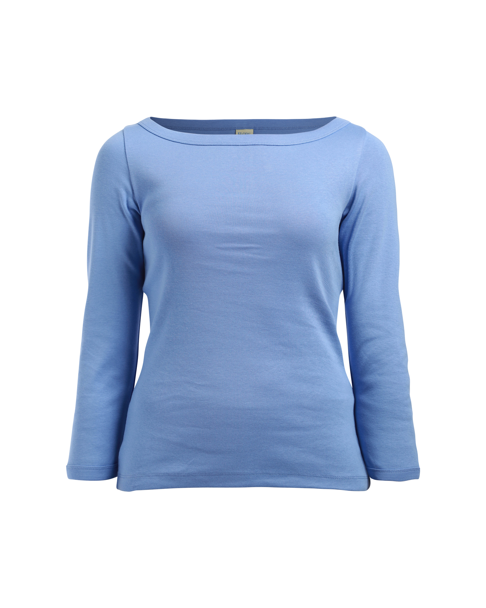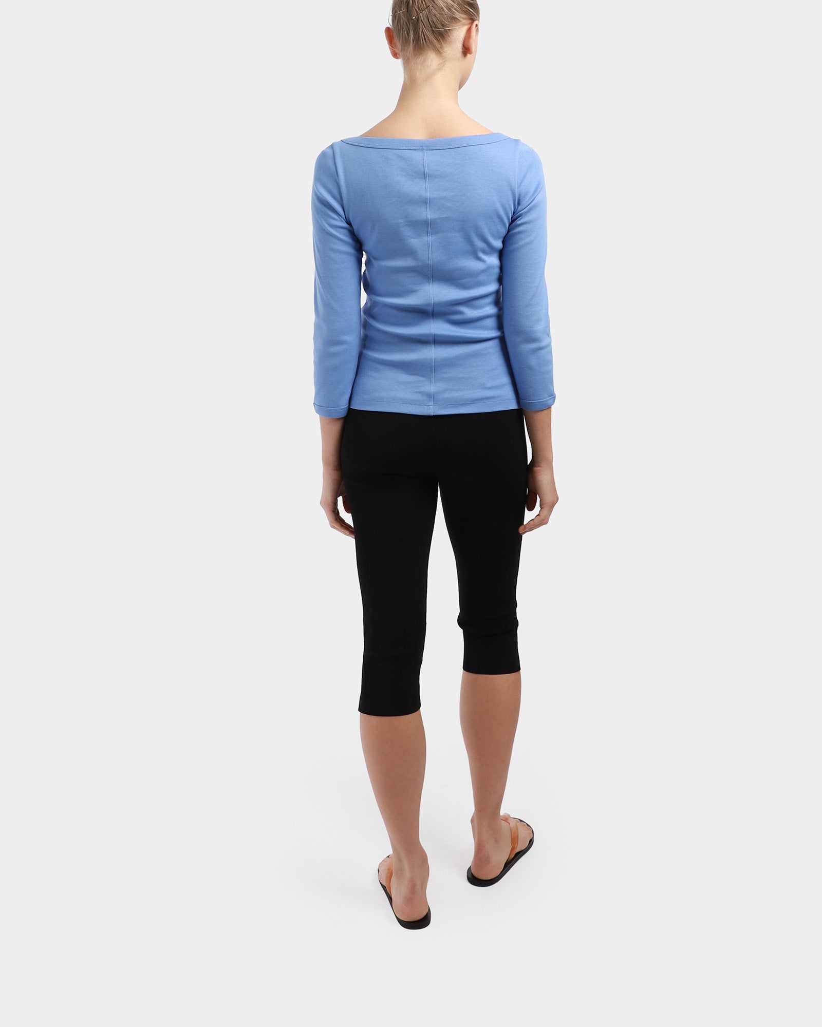 The Steffi Tee from Flore Flore features a boat neckline, 3/4 length sleeve, double stitched cut-off seam on back and a fitted silhouette. Made in Portugal.