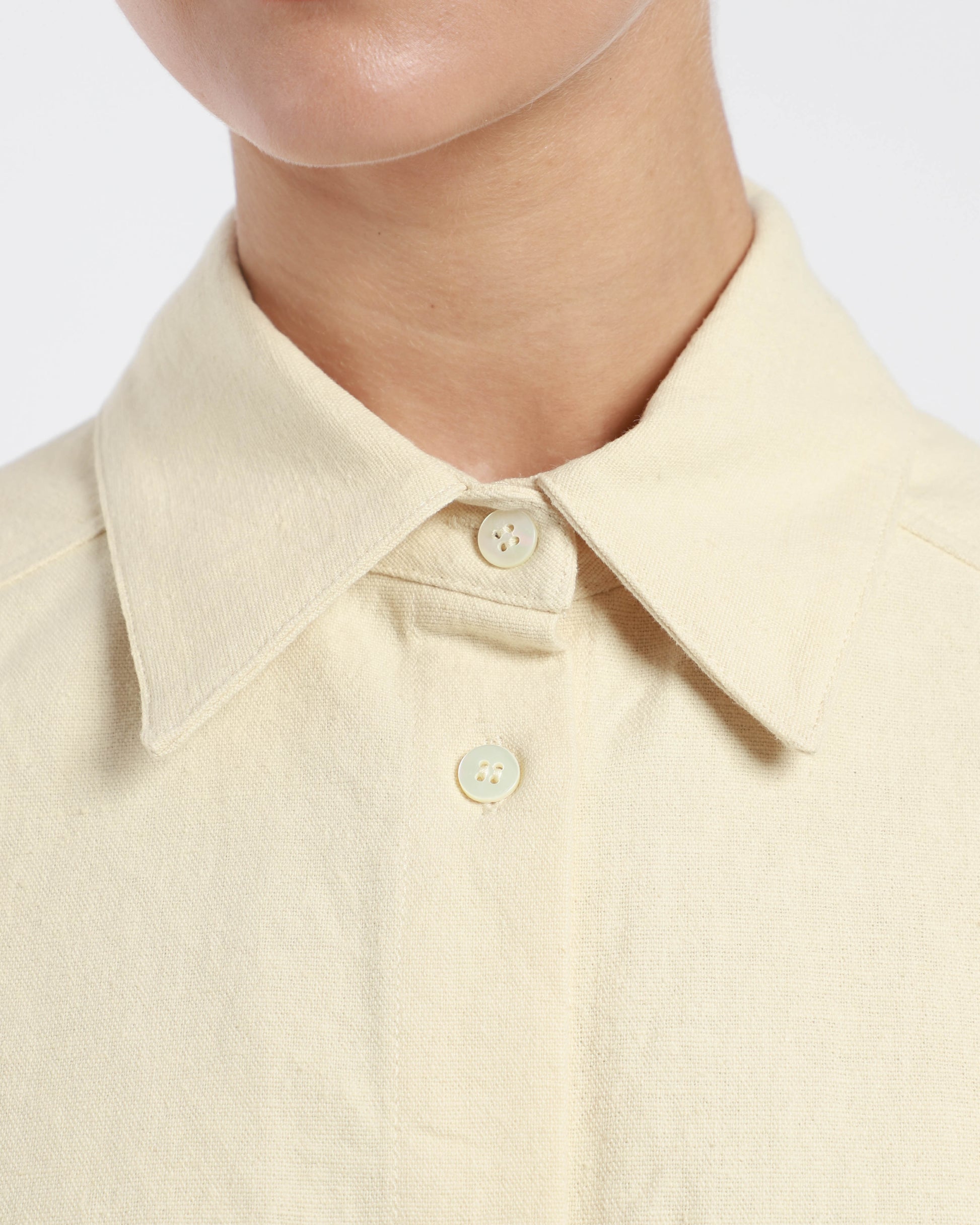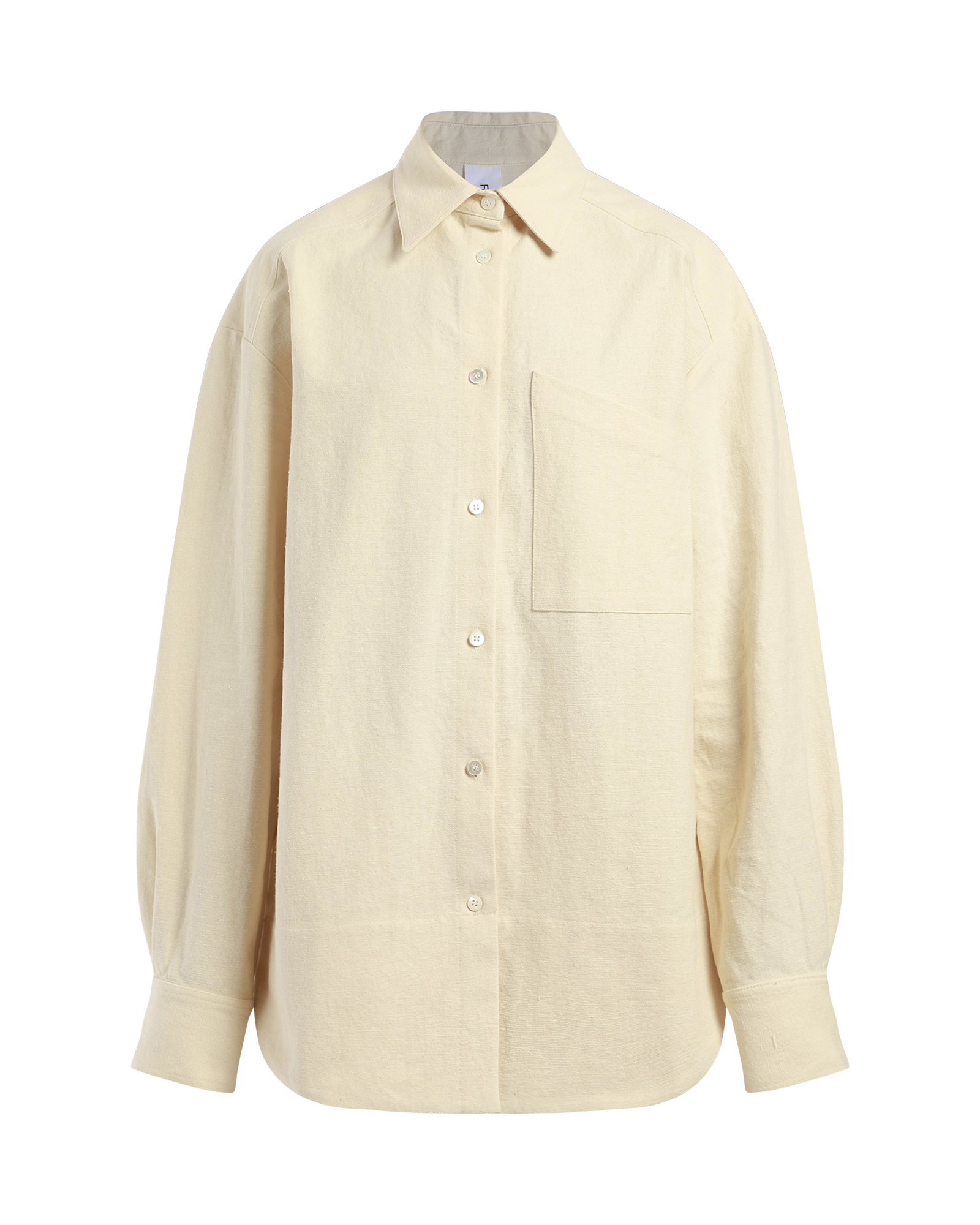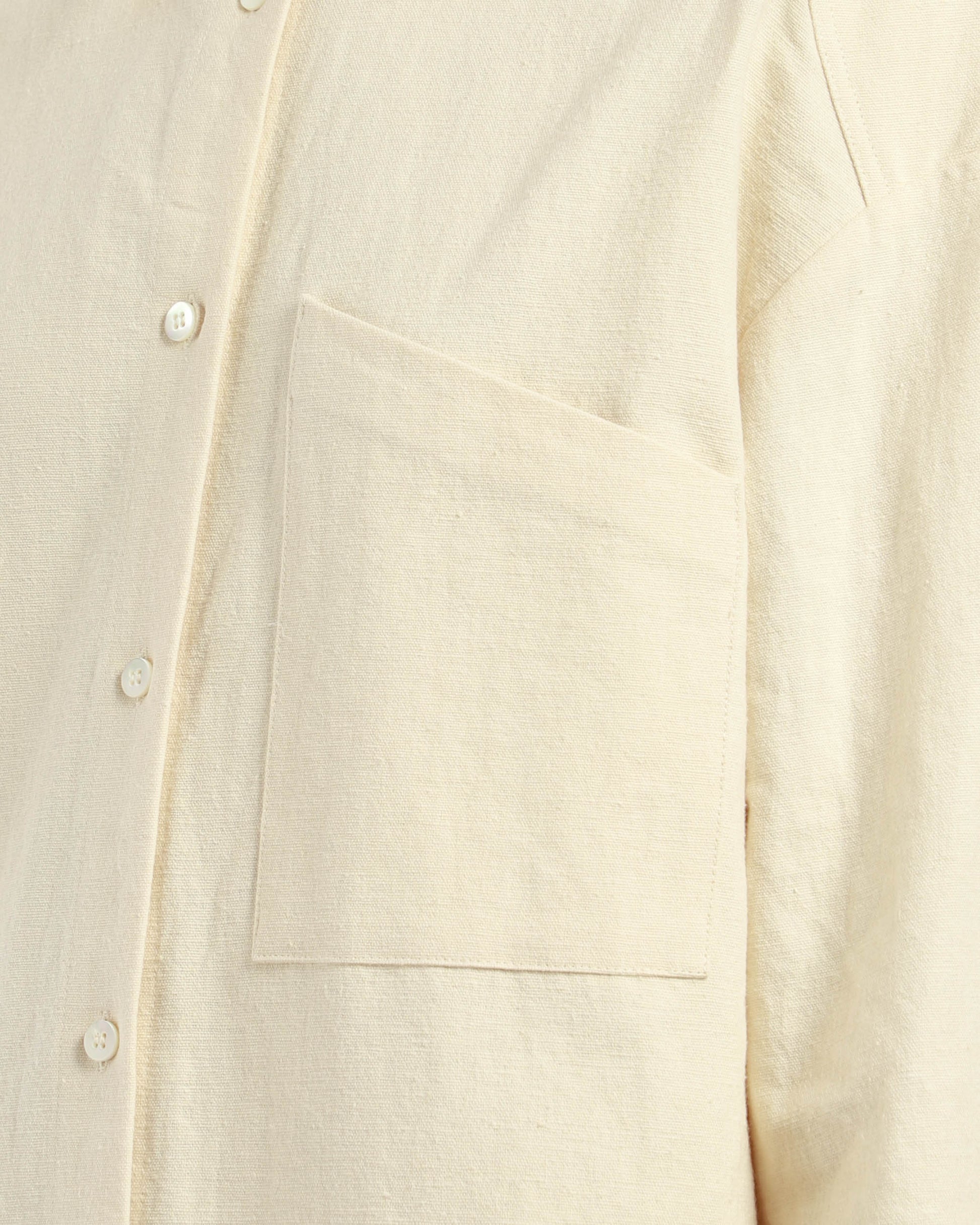 An oversized shirt blends relaxed comfort with design details like side splits, turned cuffs, an angled front pocket, and a deep hem. It has a classic collar and buttons at front to close. Seam detail adding texture and creating a standout piece with a refined, laid-back style.