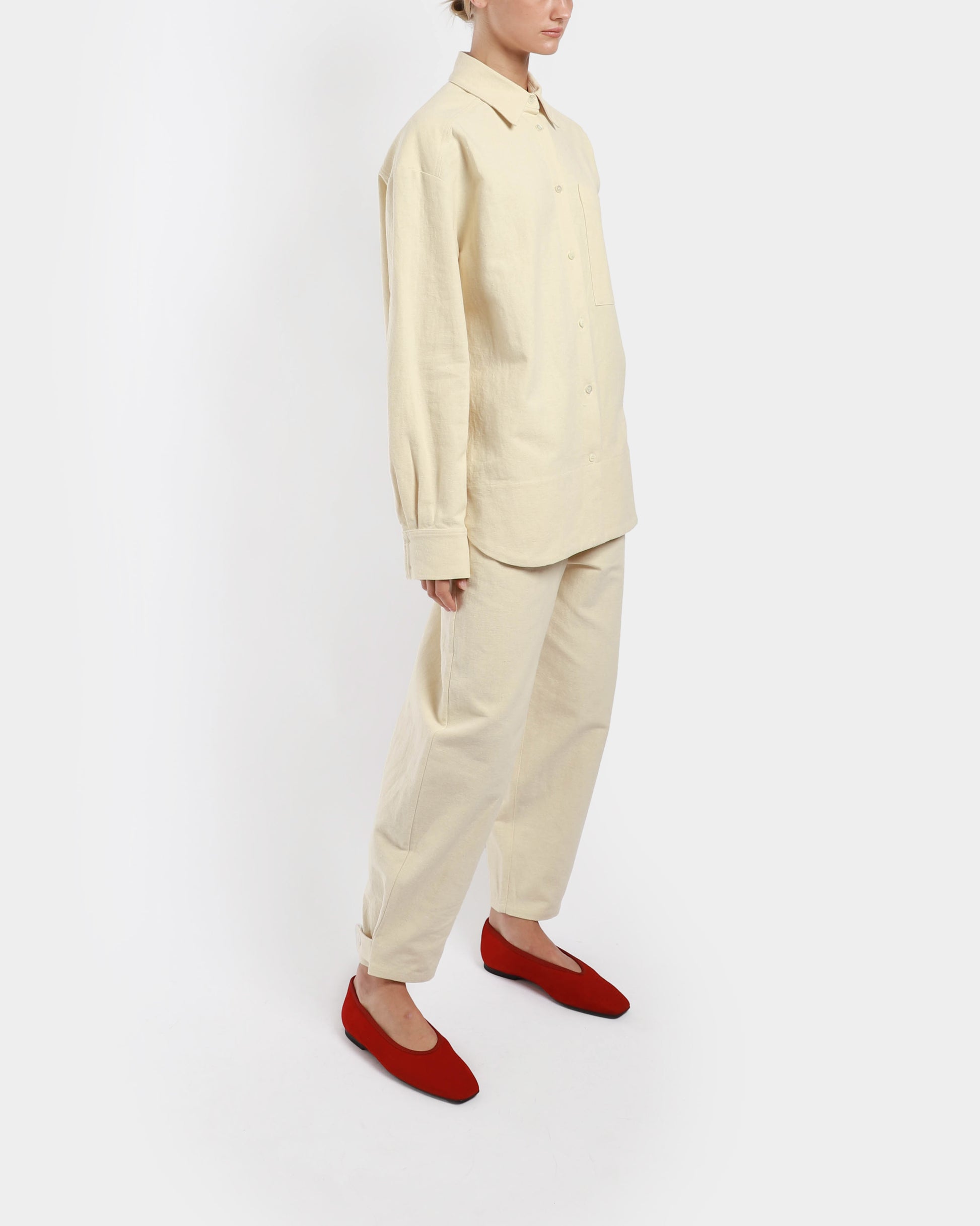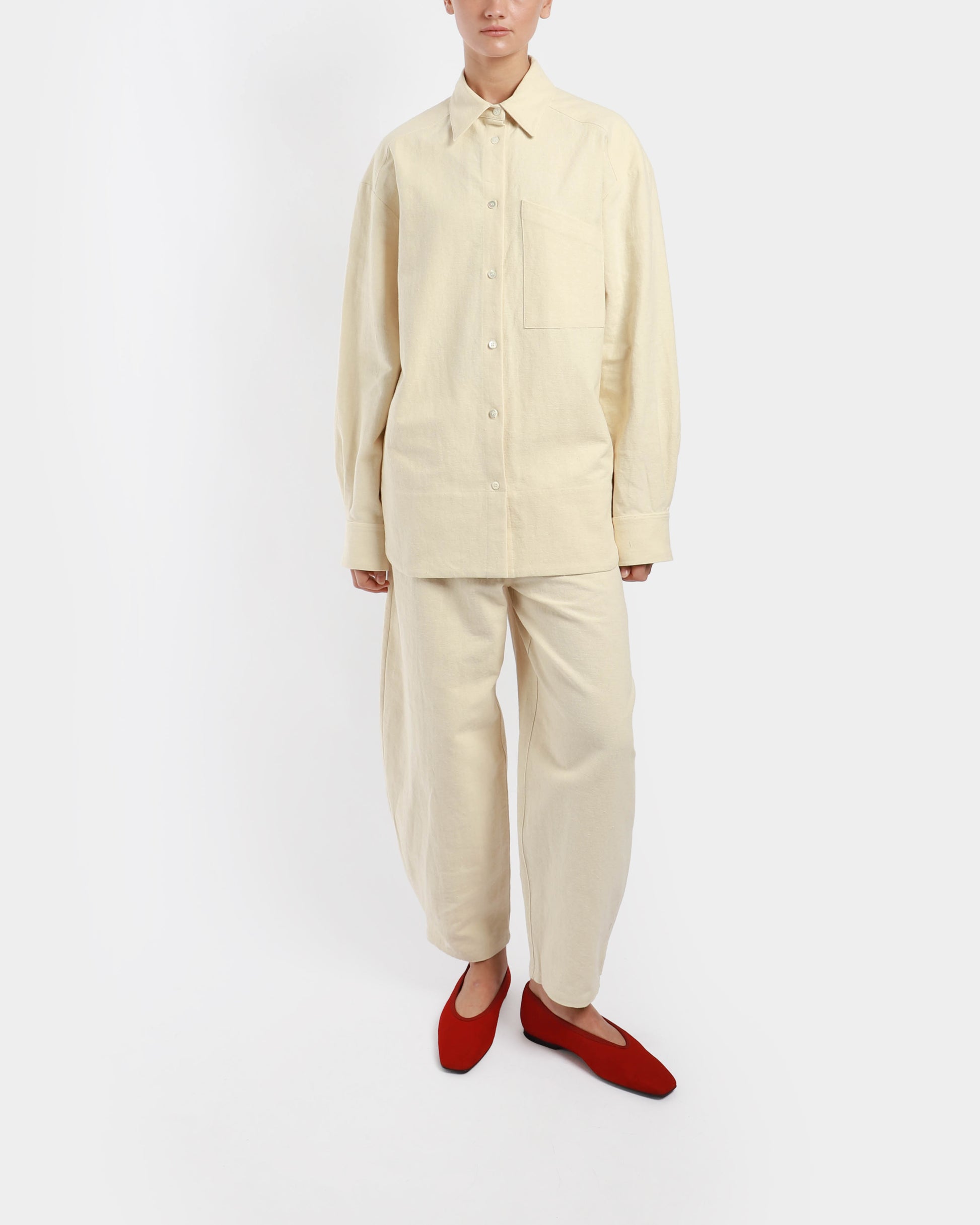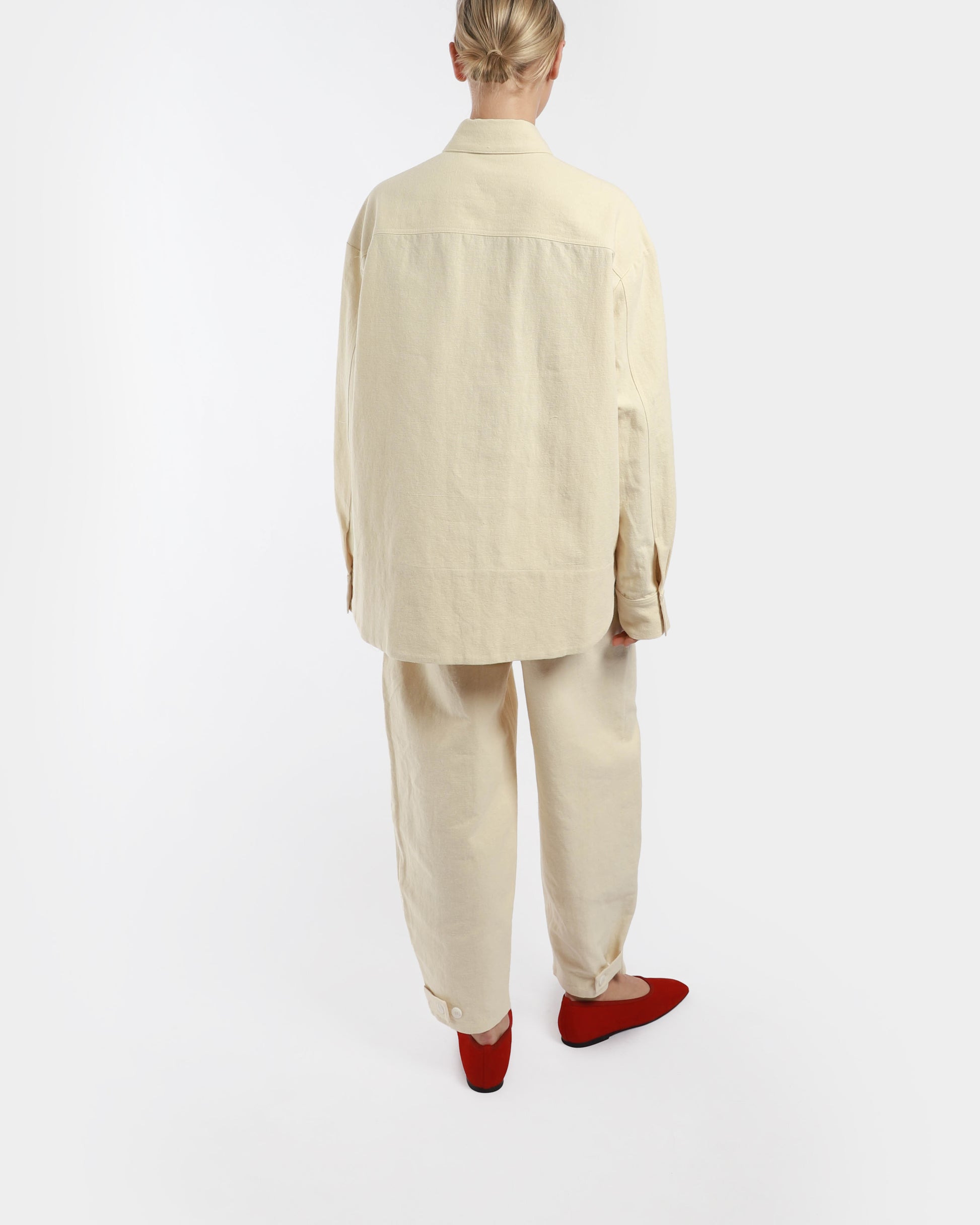 An oversized shirt blends relaxed comfort with design details like side splits, turned cuffs, an angled front pocket, and a deep hem. It has a classic collar and buttons at front to close. Seam detail adding texture and creating a standout piece with a refined, laid-back style.