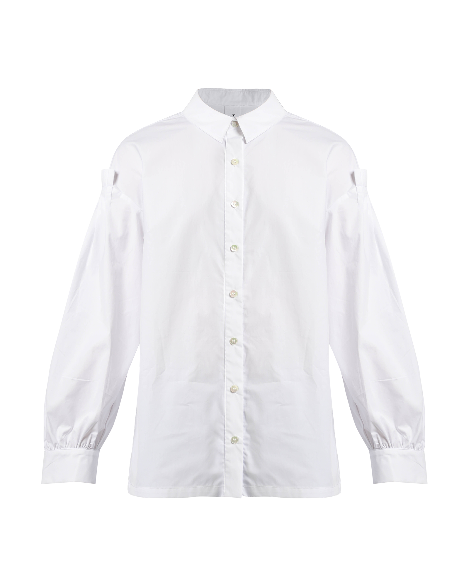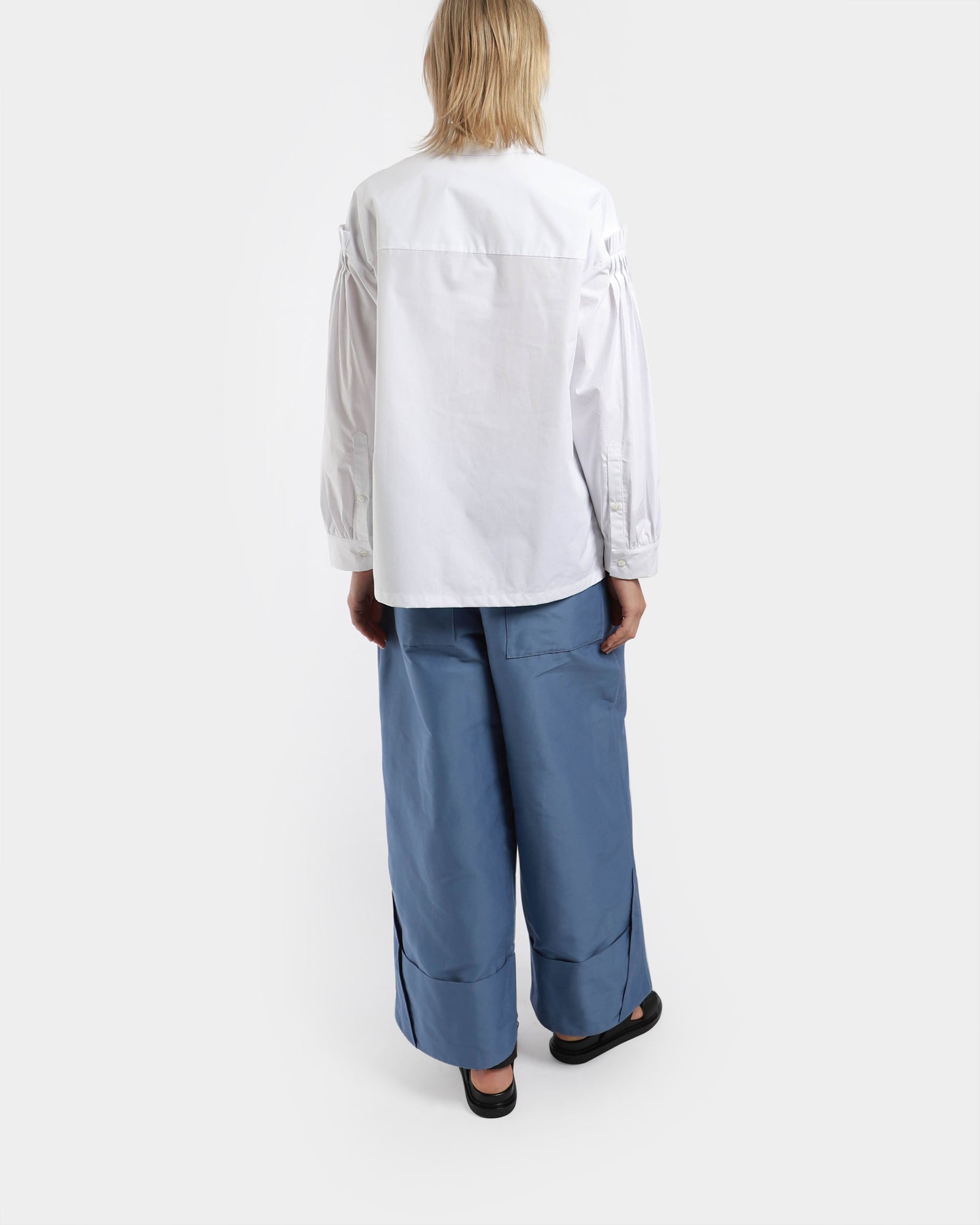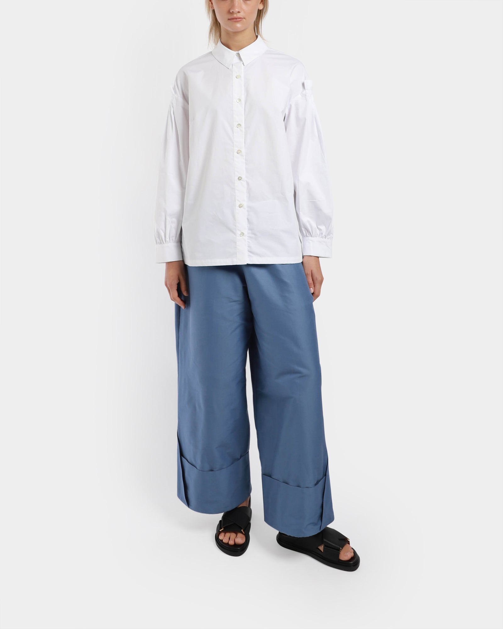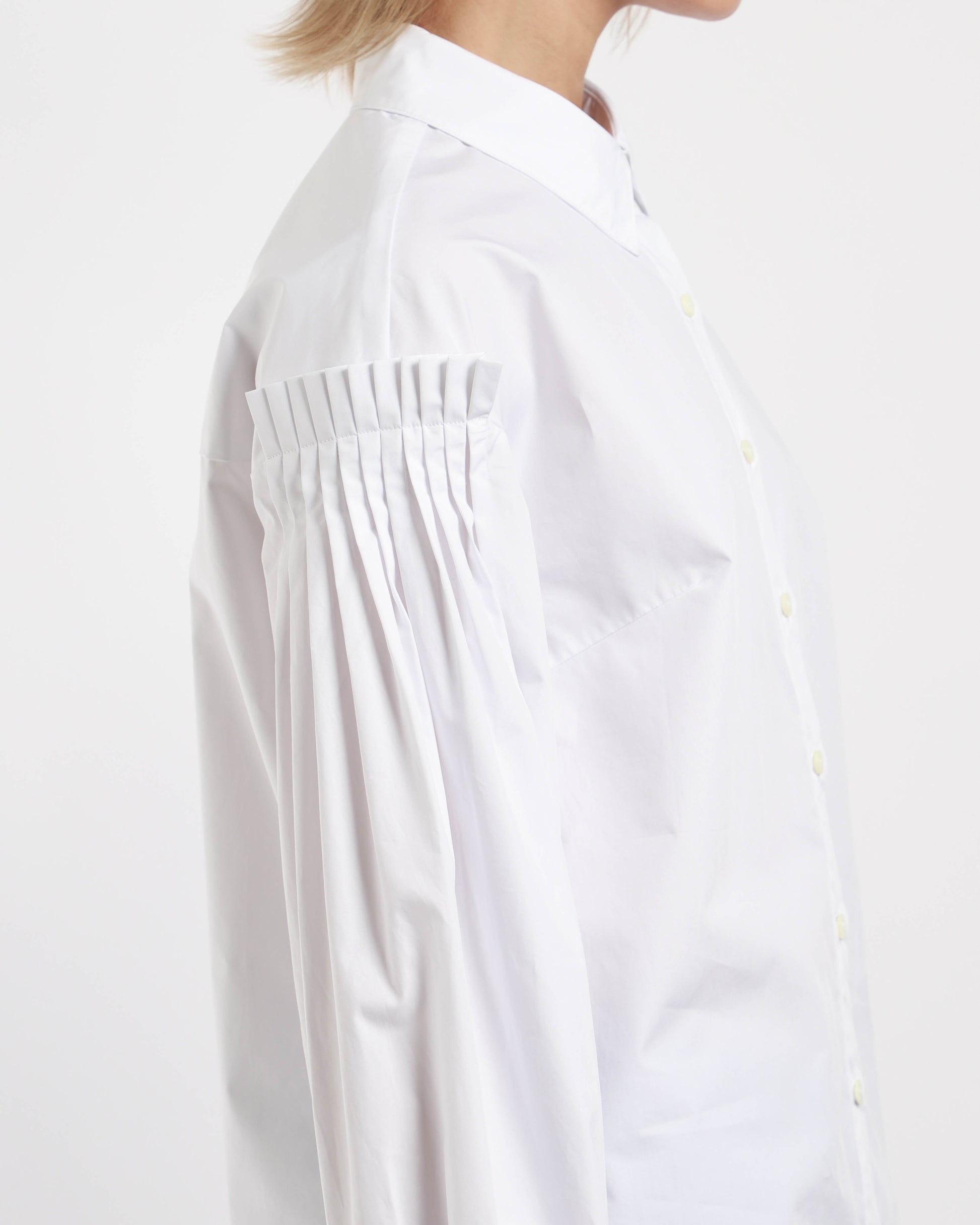 A button-up shirt in crisp cotton poplin featuring a simple collar, dropped shoulder pintuck details, an exposed placket, buttons at front to close, long sleeves with button at cuff. The Eddie shirt has side splits for a relaxed, modern fit with added texture and ease.