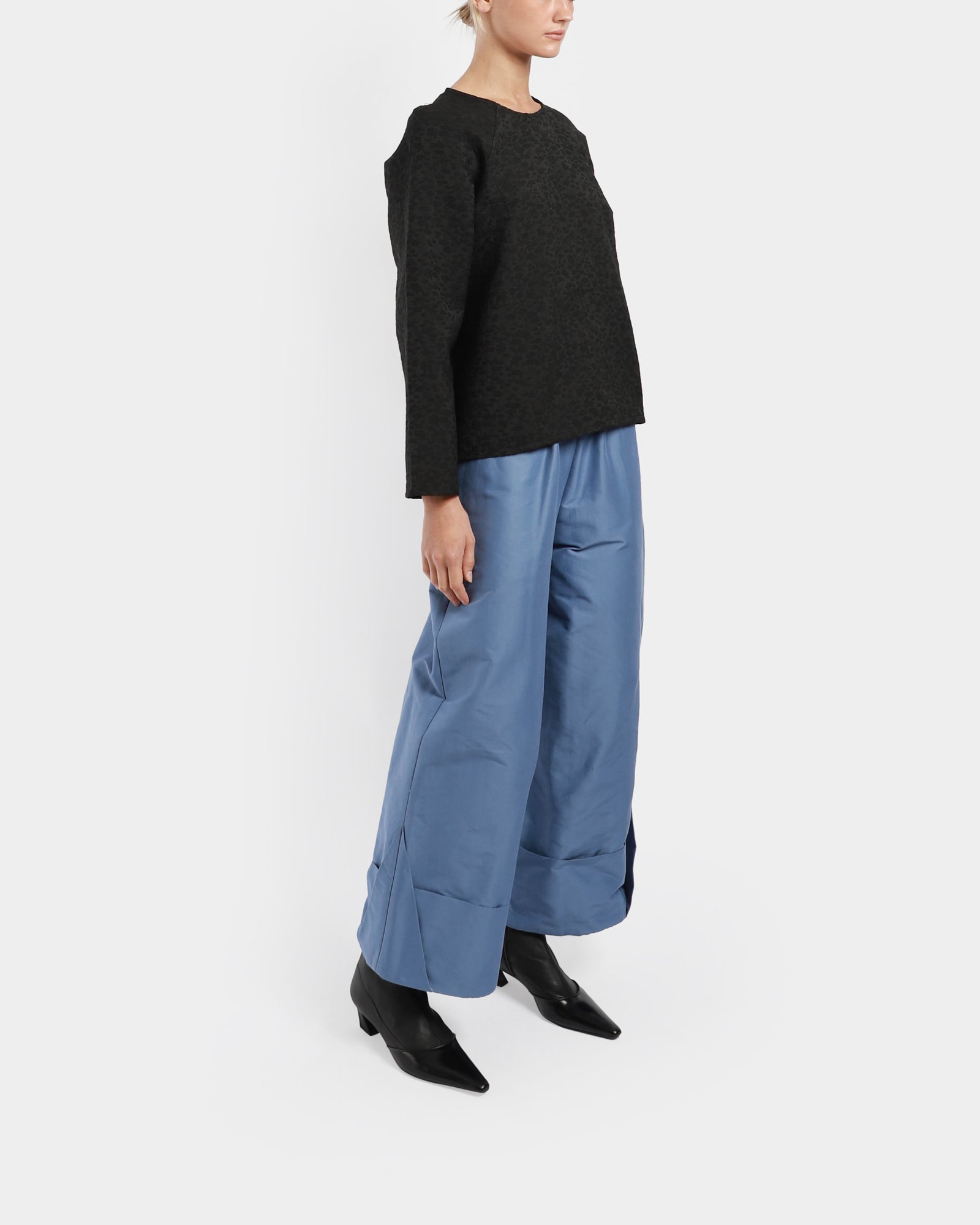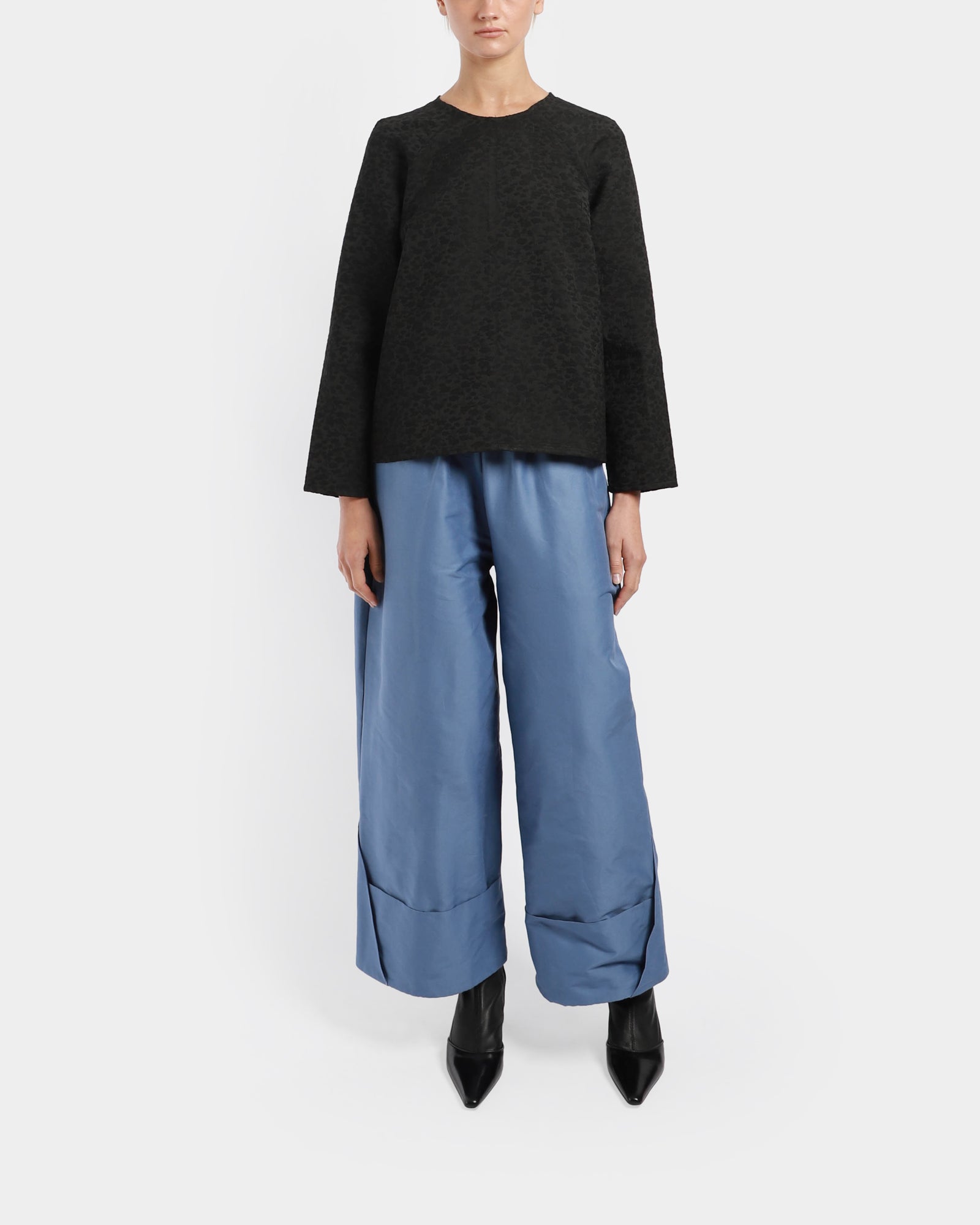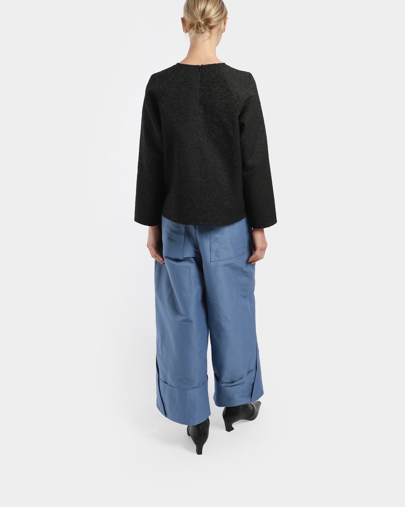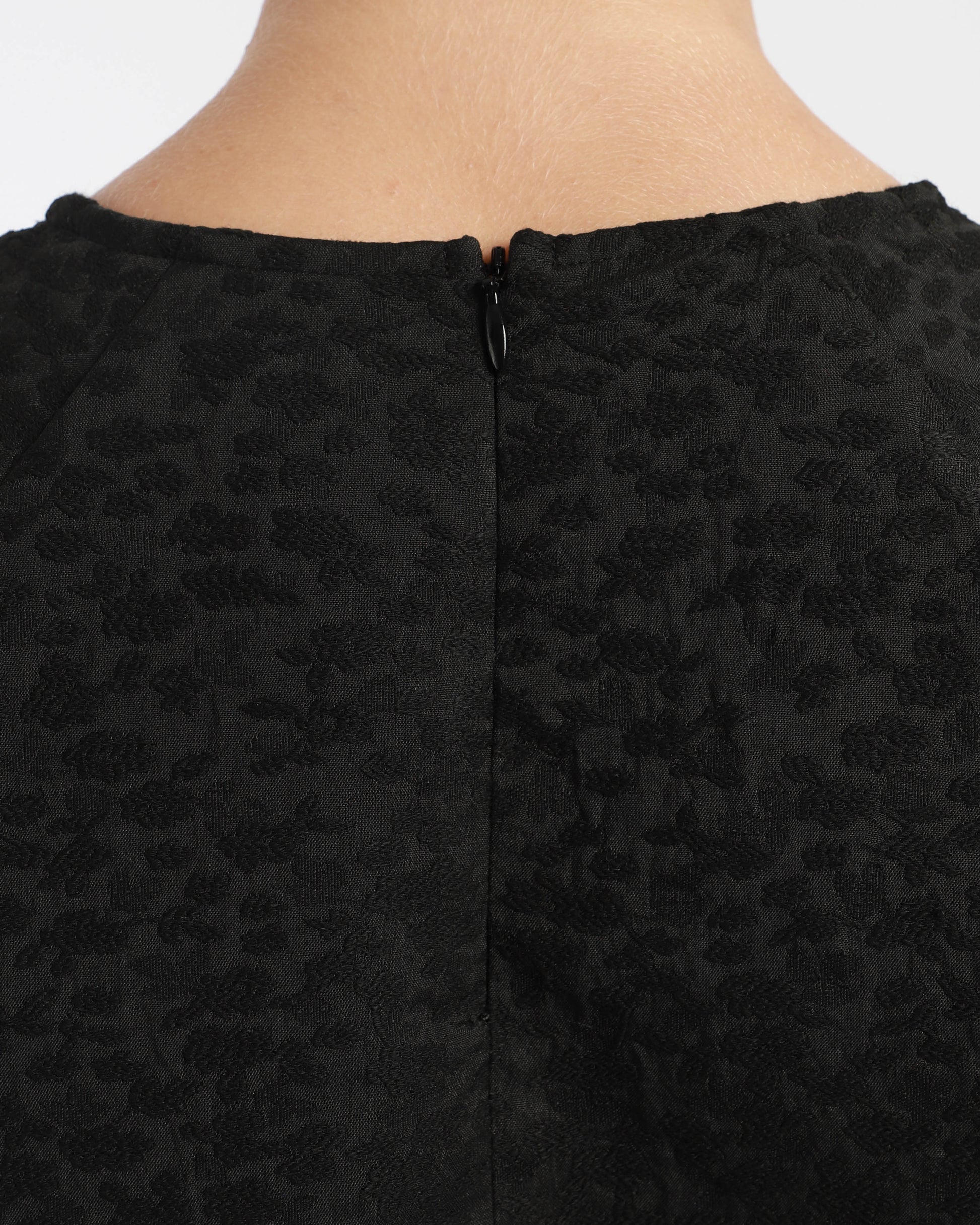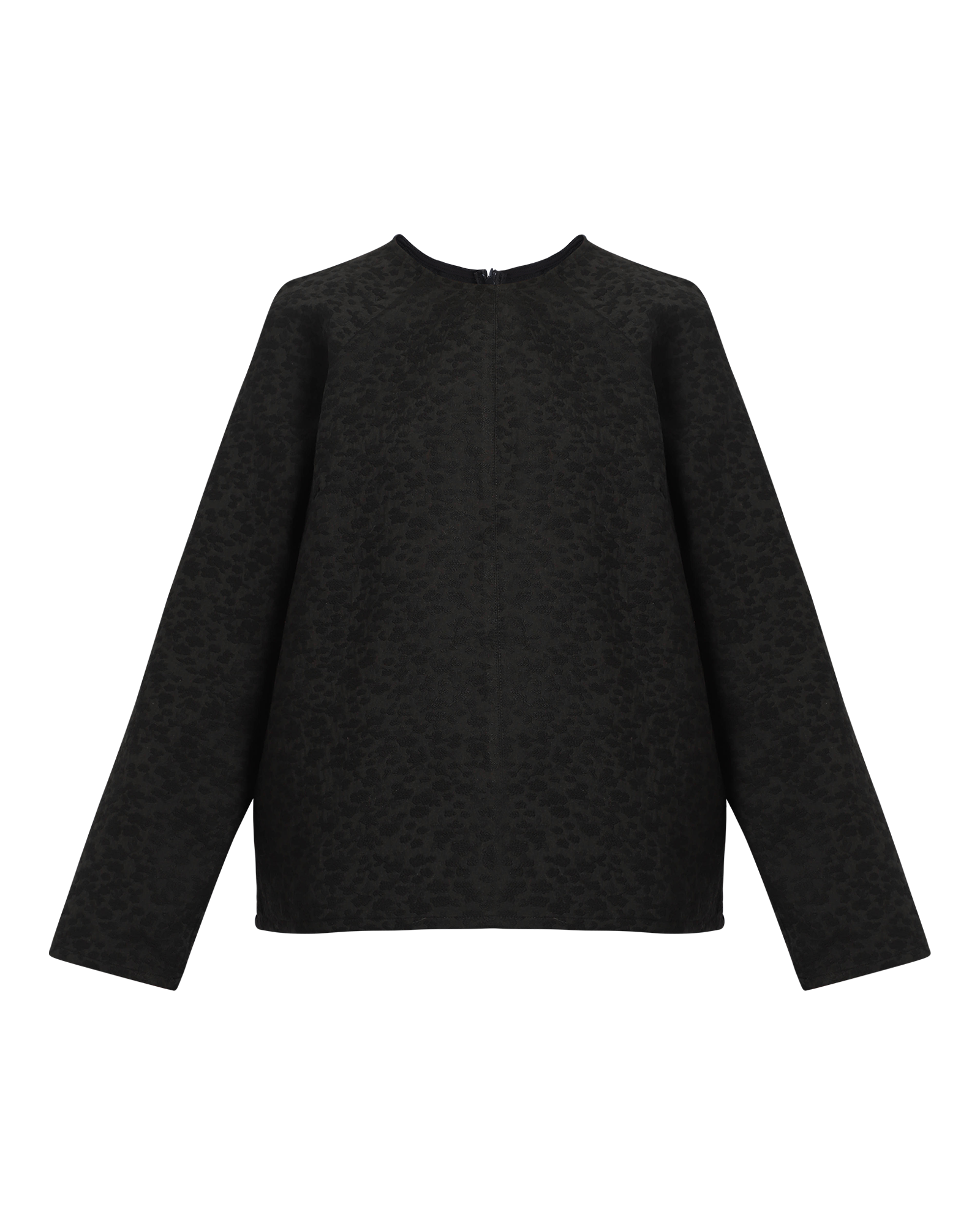 This round-neck, raglan-sleeved top in spot jacquard fabric features a subtle pattern, back neck zip for easy fit, and detailed seams for added structure and visual appeal.