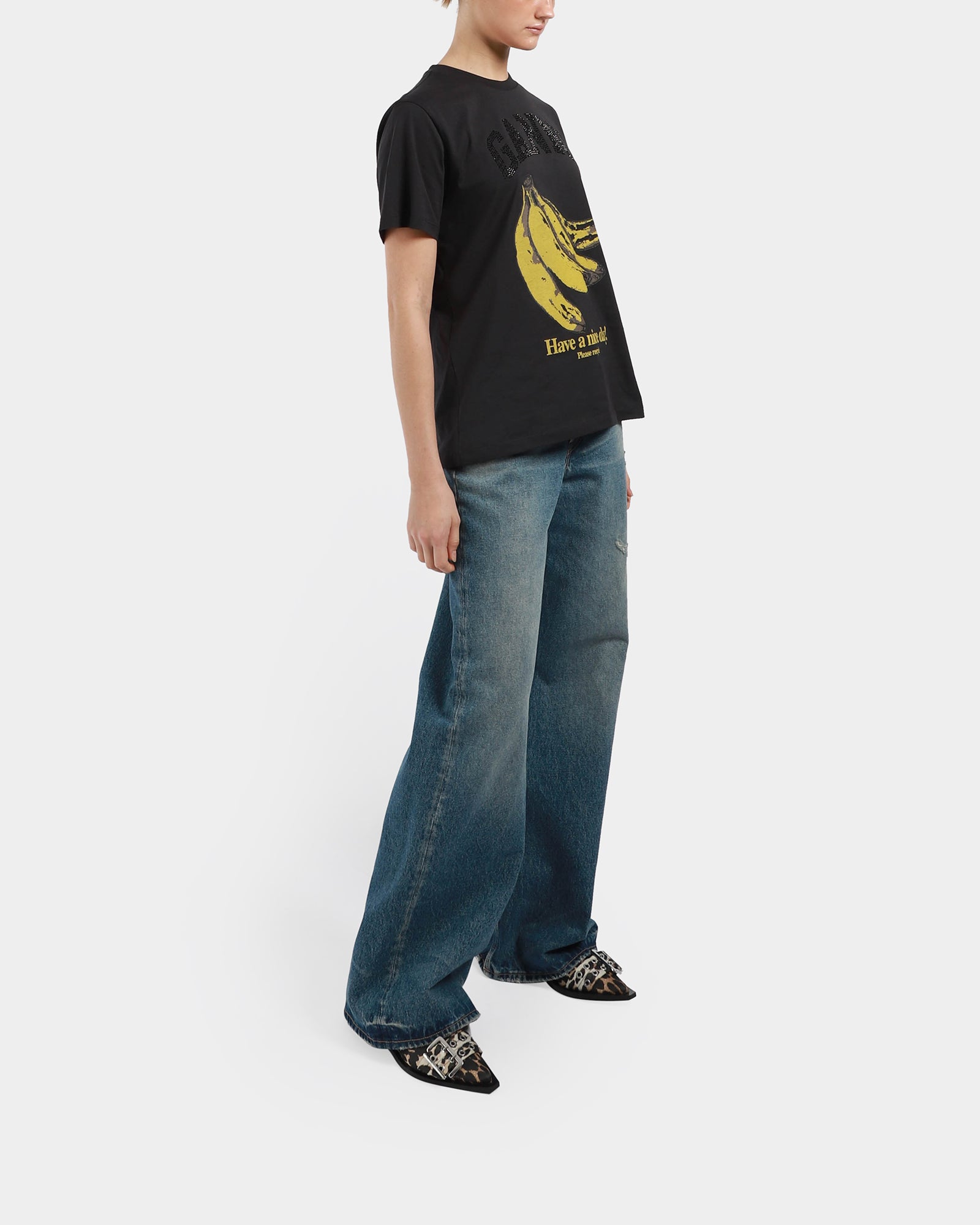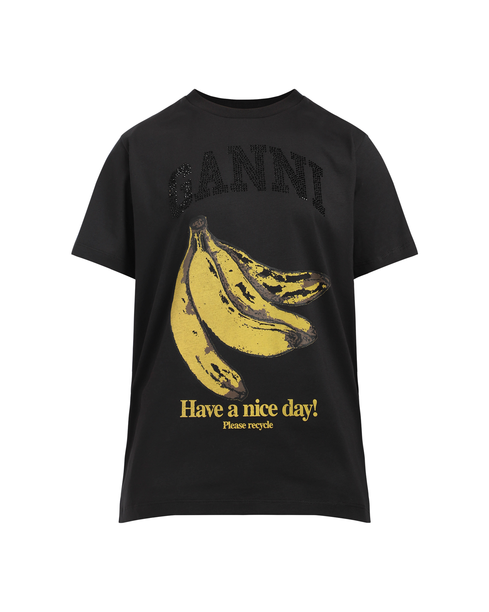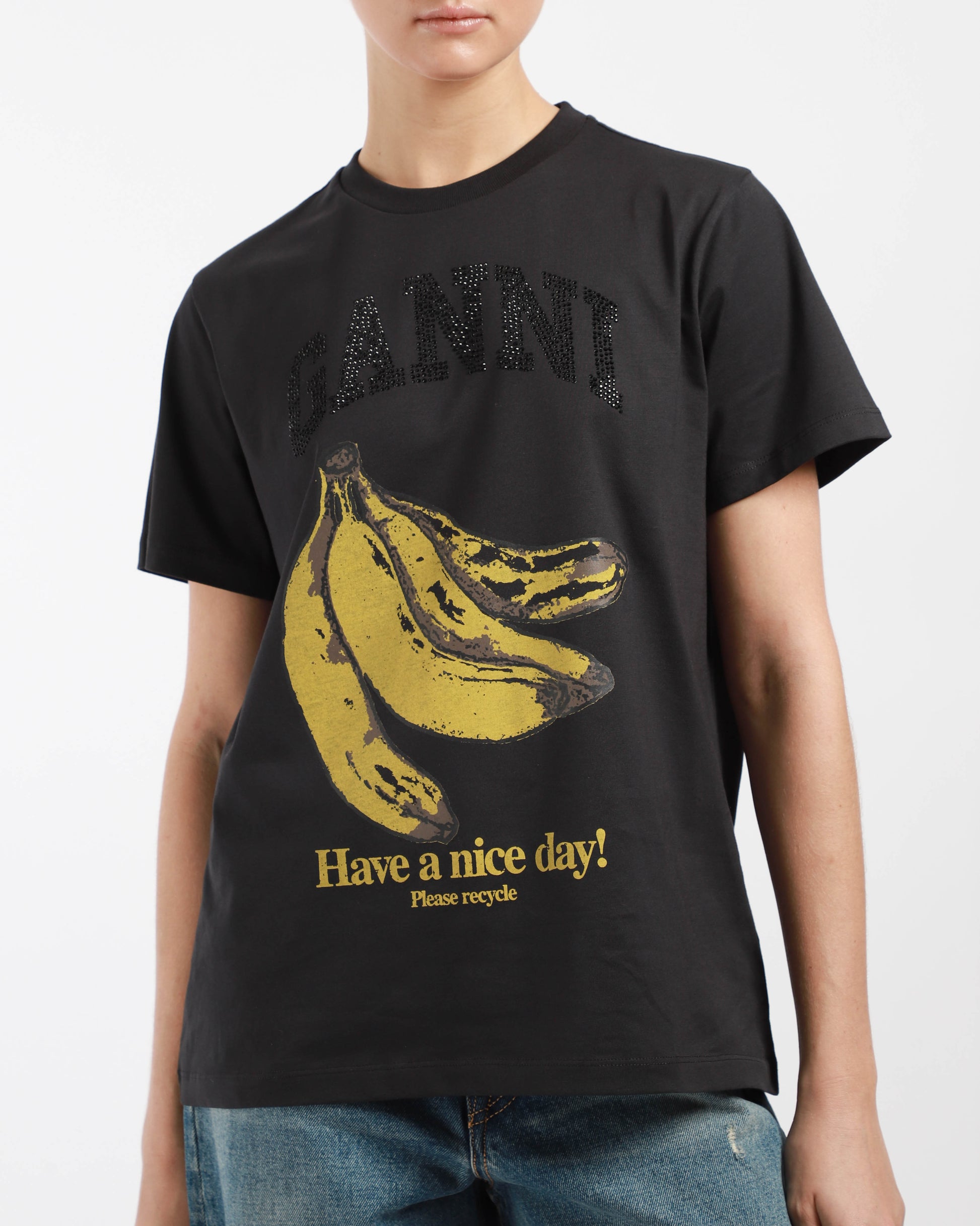 This T-shirt has a round neck, short sleeves, a banana graphic with message, and a black rhinestone GANNI logo. - Round neckline