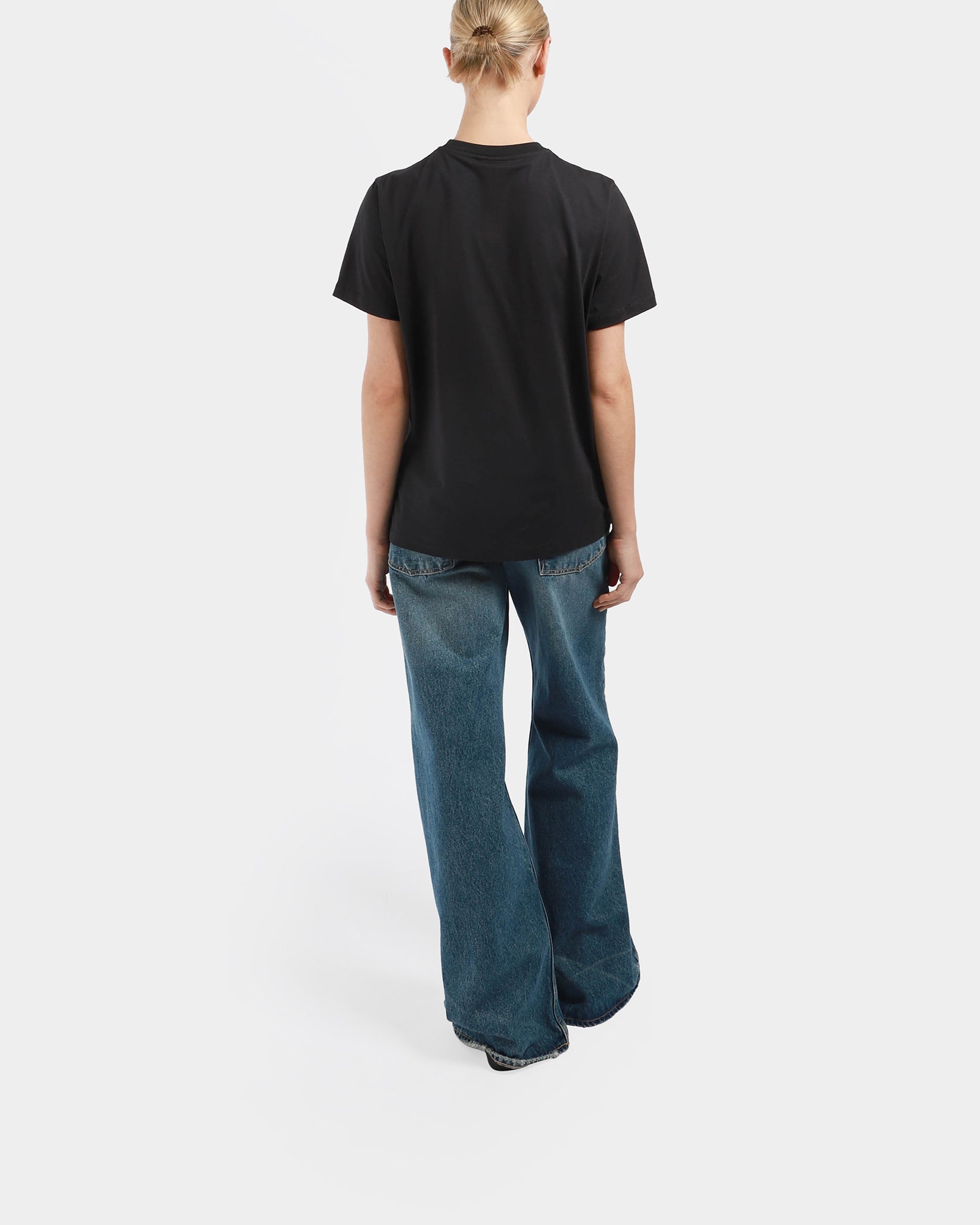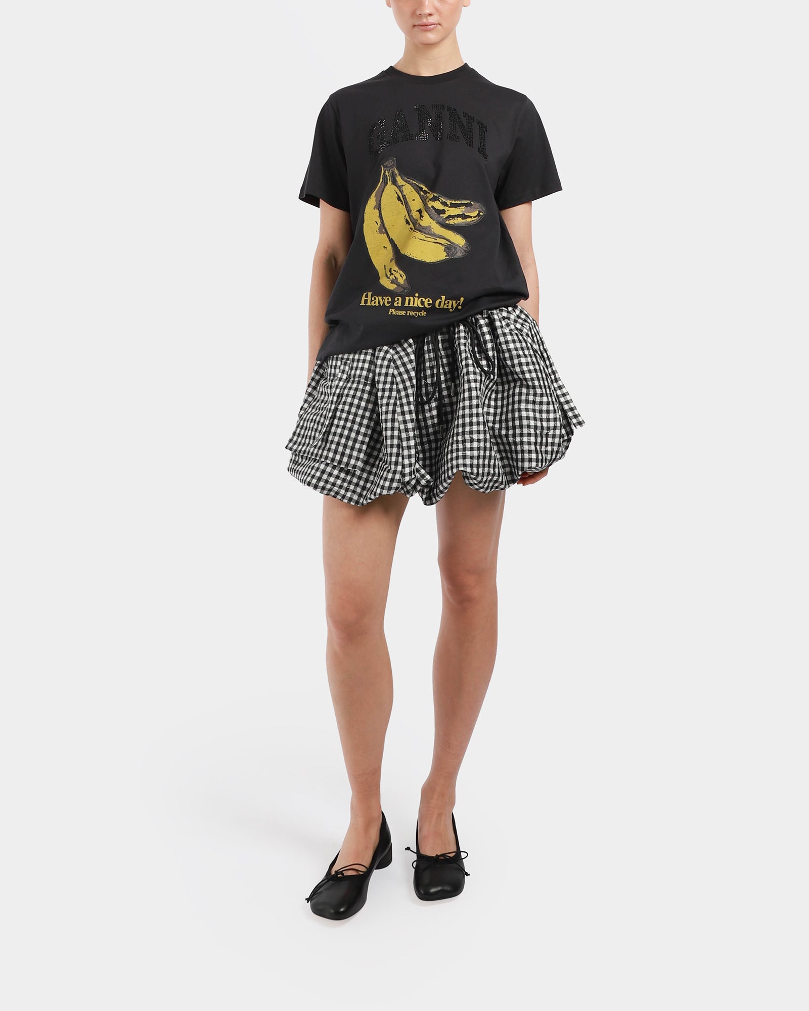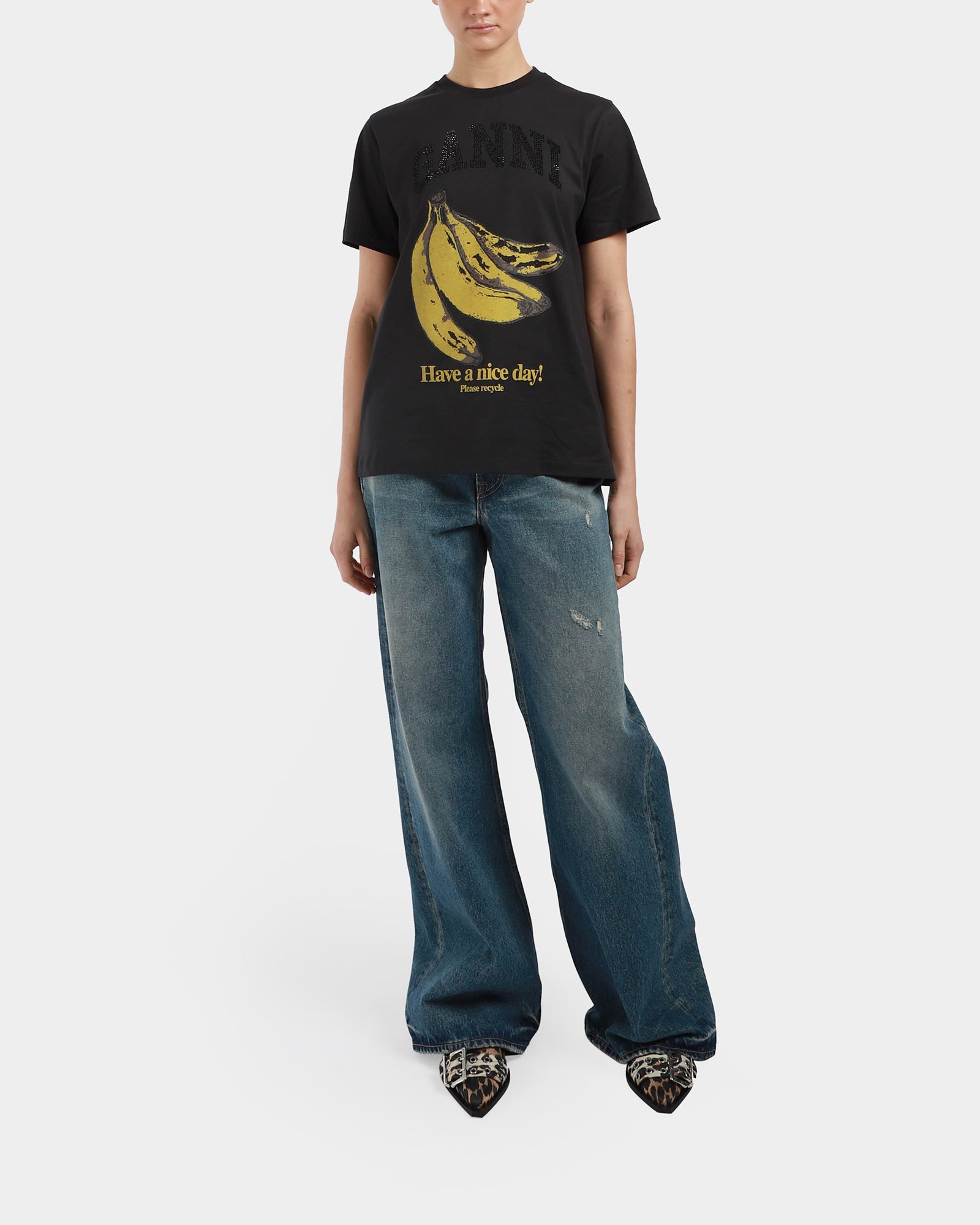 This T-shirt has a round neck, short sleeves, a banana graphic with message, and a black rhinestone GANNI logo. - Round neckline