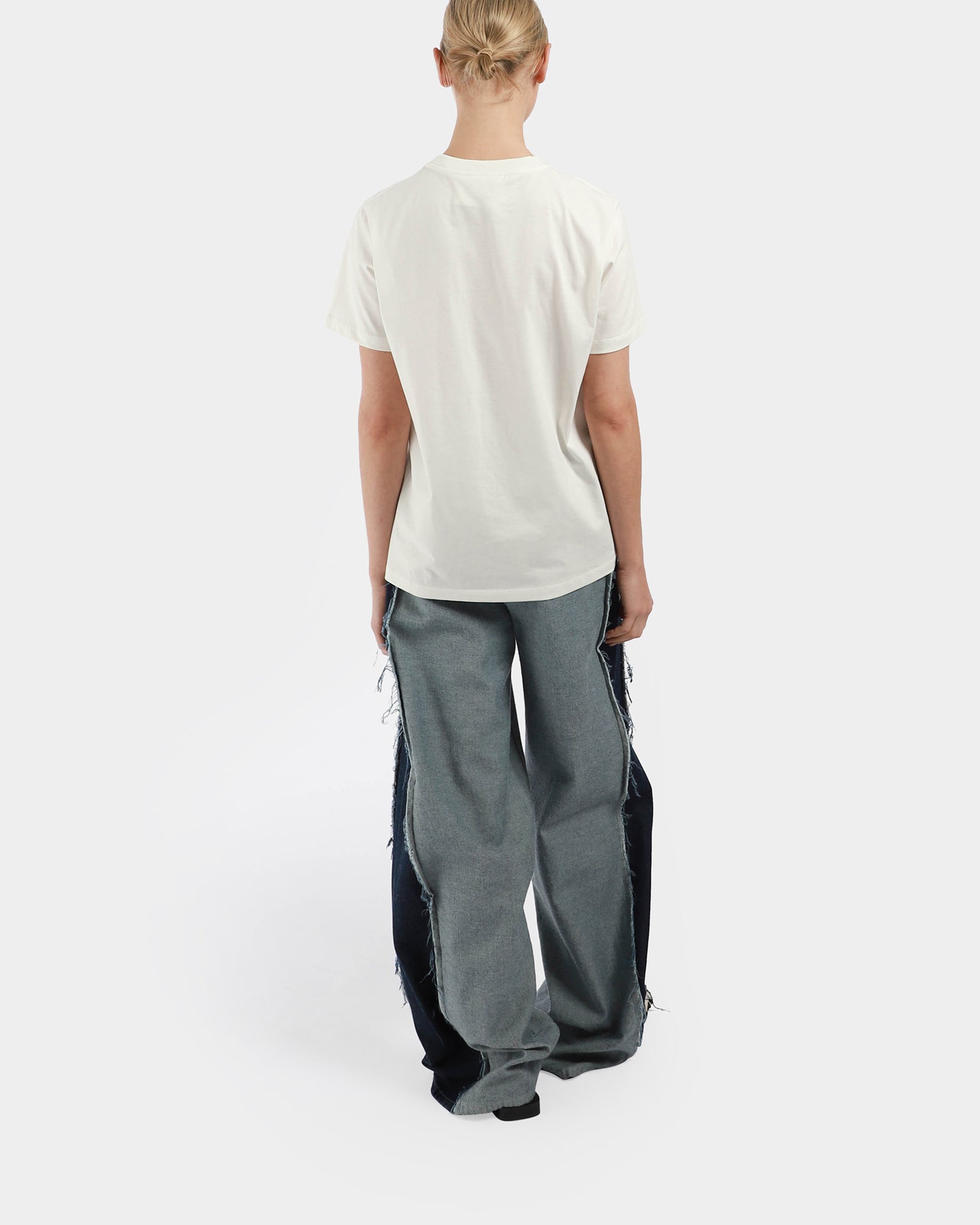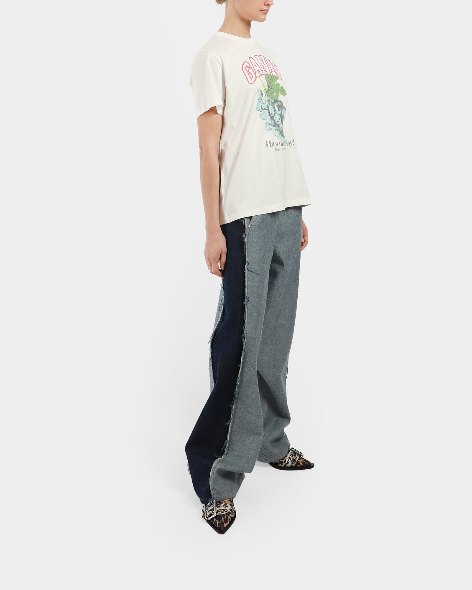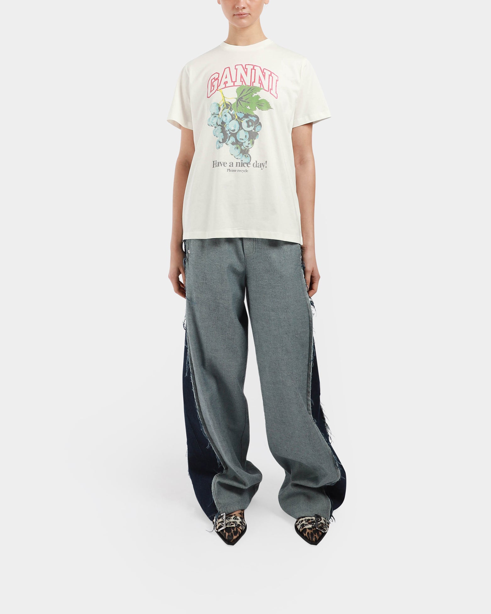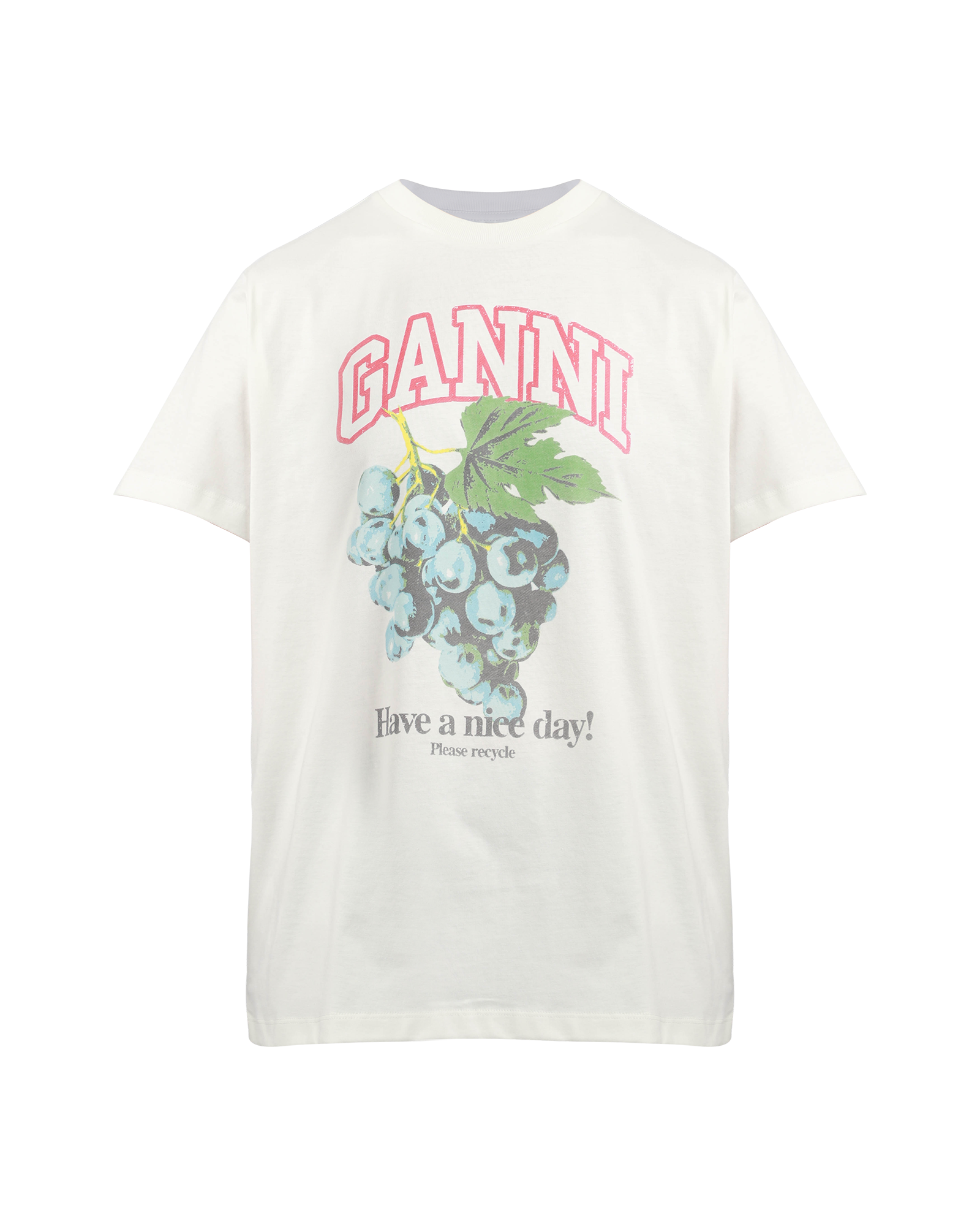 This white basic t-shirt, features a crew neckline, short sleeves and a graphic Ganni logo and front with grapes and 'Have a nice day! Please recycle' message. - Relaxed silhouette