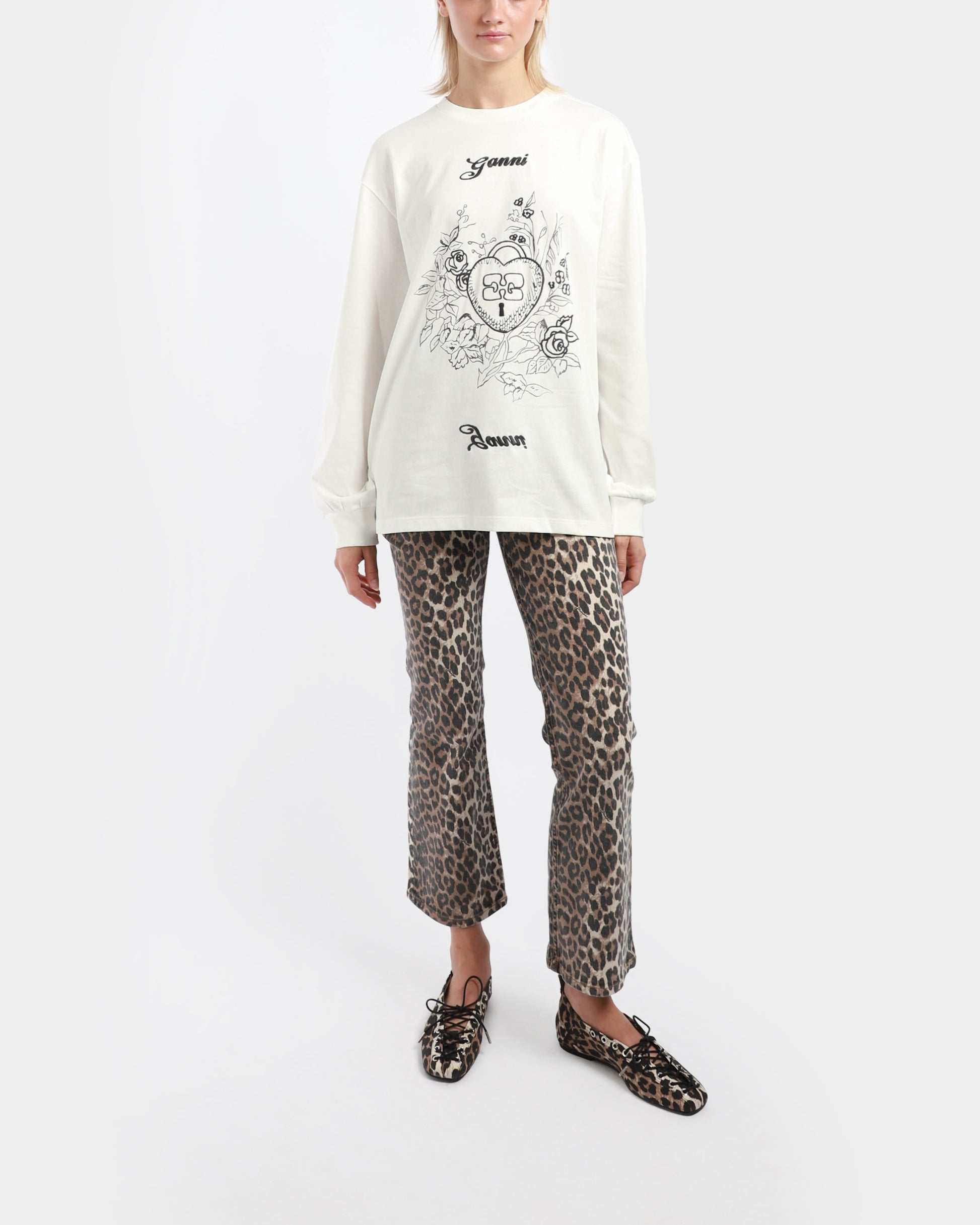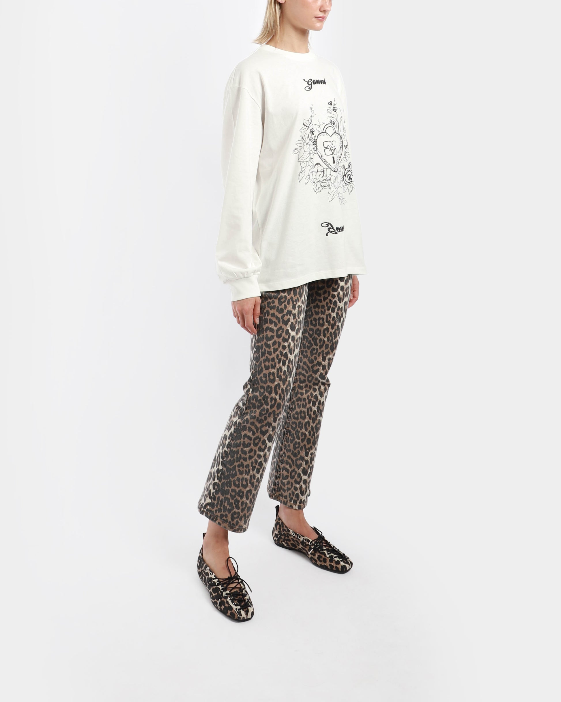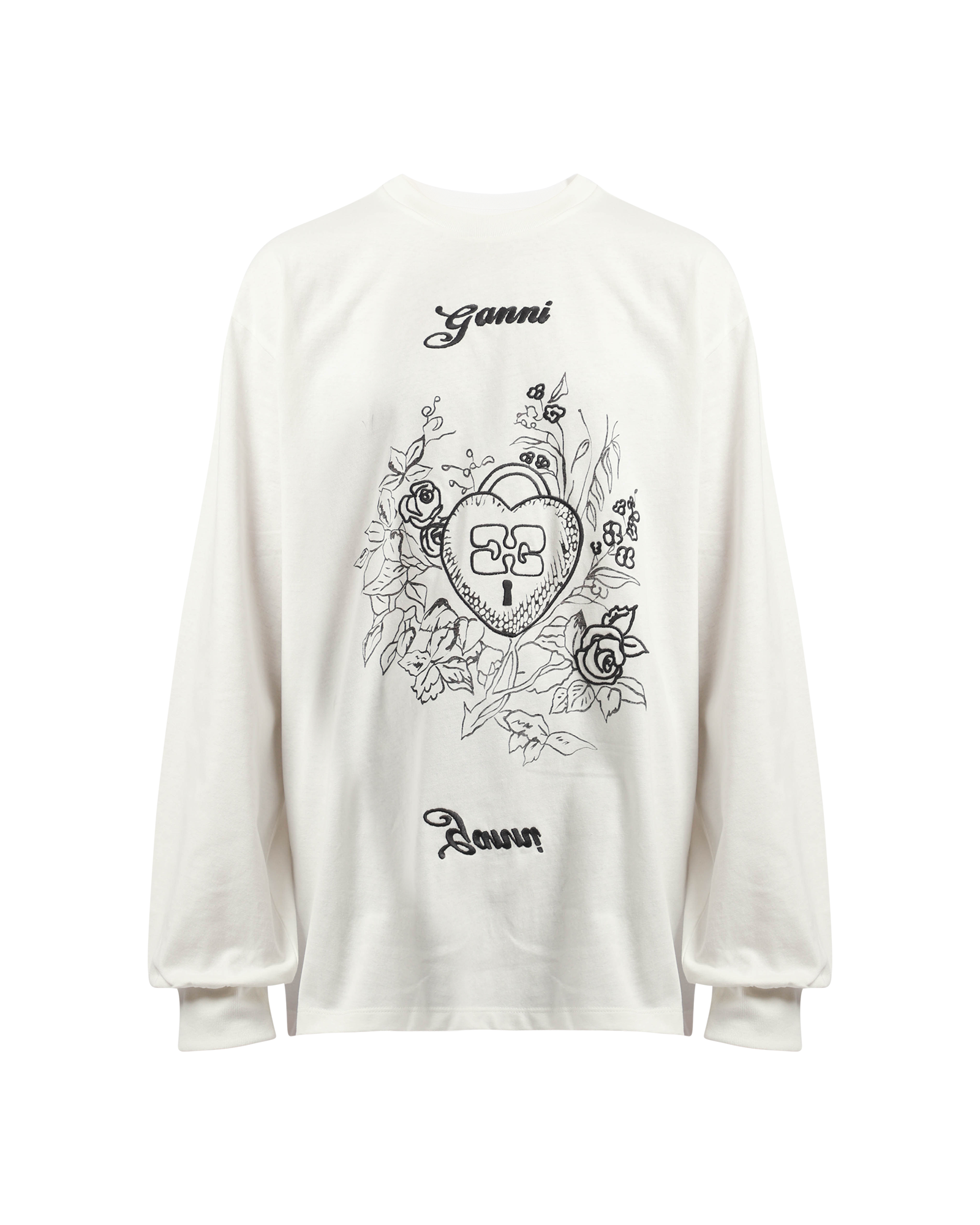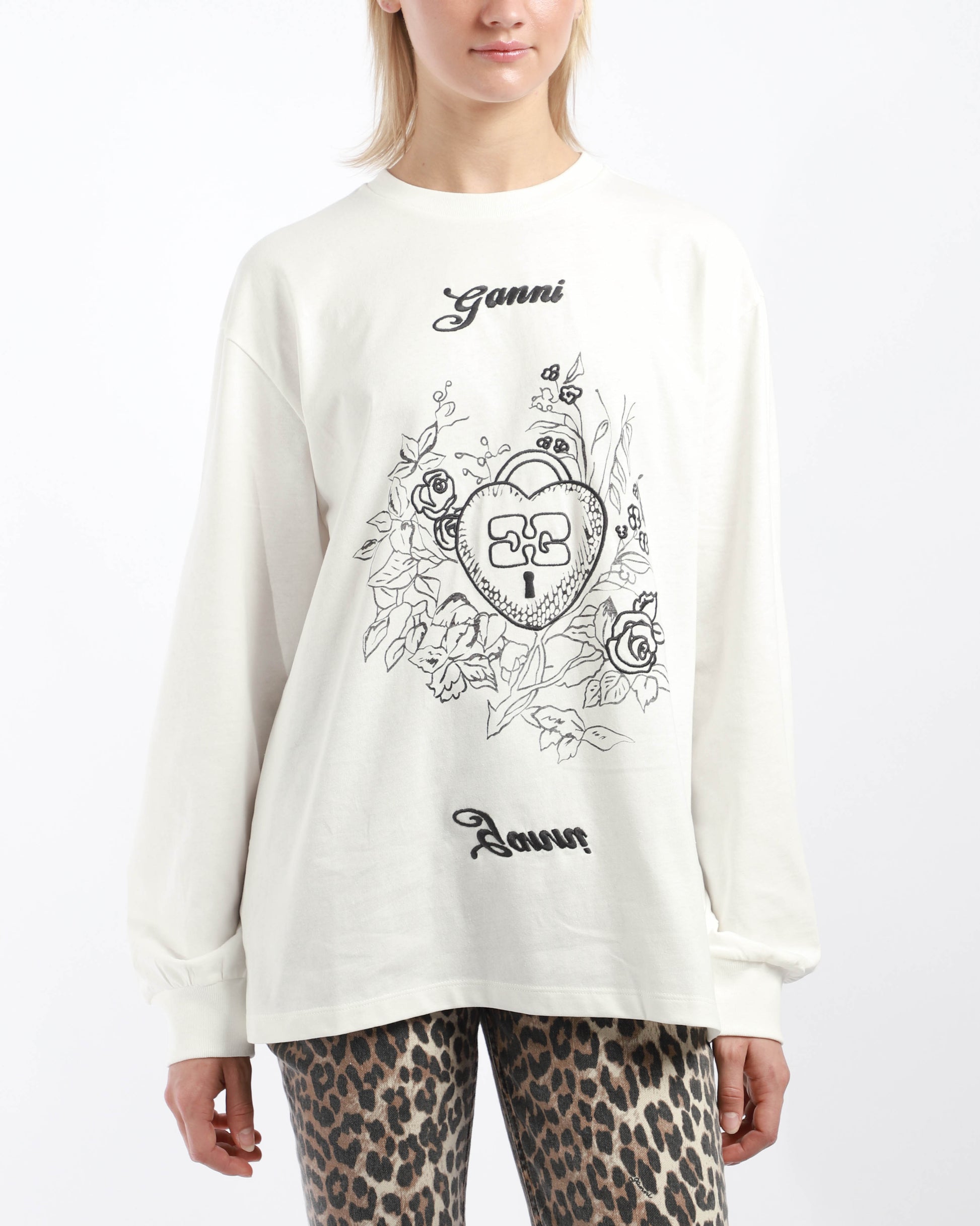 A long sleeve t-shirt with graphic Ganni print at front. It features a crew neckline with tapered hem at sleeves.