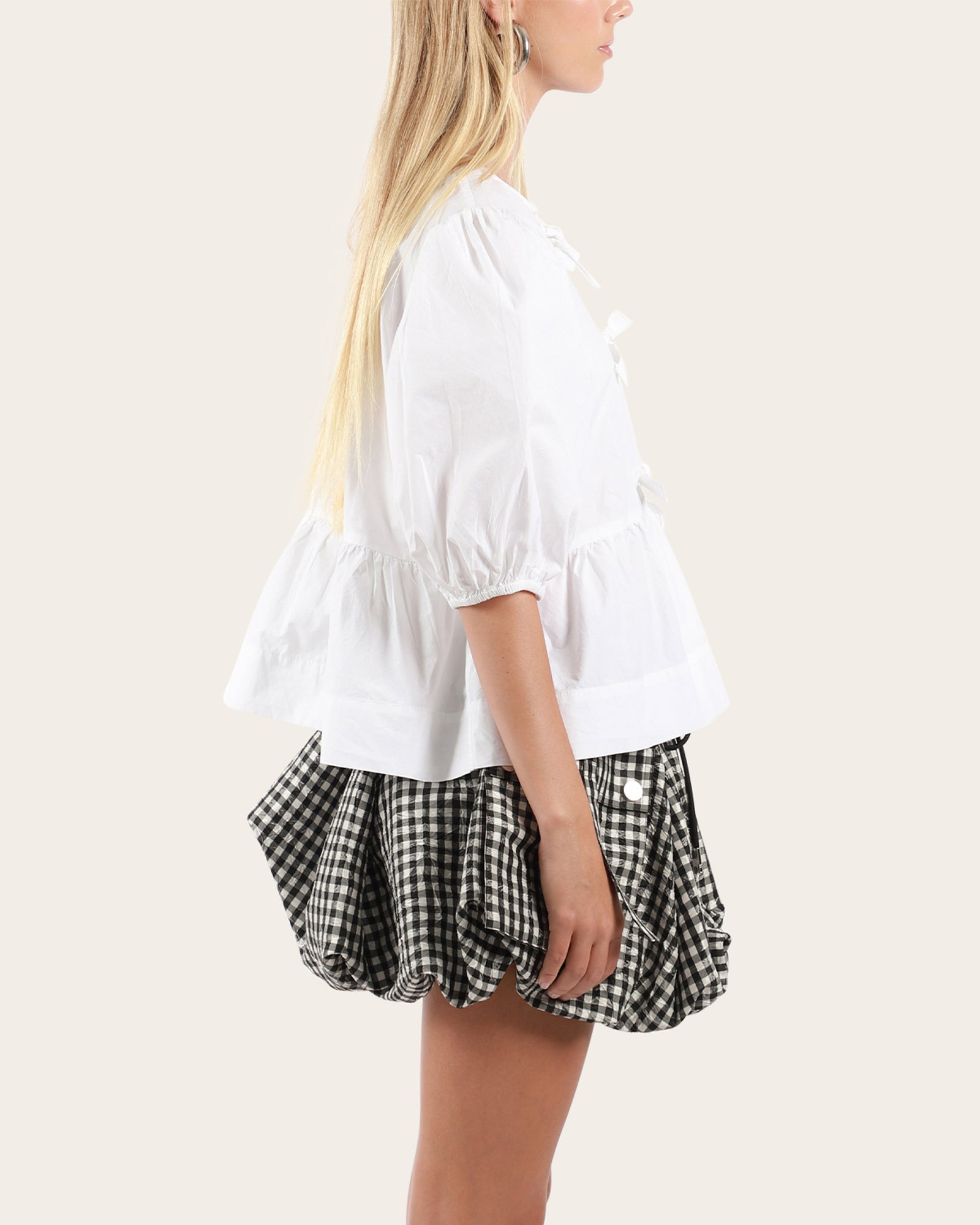 Feminine and effortlessly chic, this blouse features an open round neckline with adjustable tie bands, voluminous puff sleeves with elasticated cuffs, and a flattering peplum hem that adds soft structure and shape.