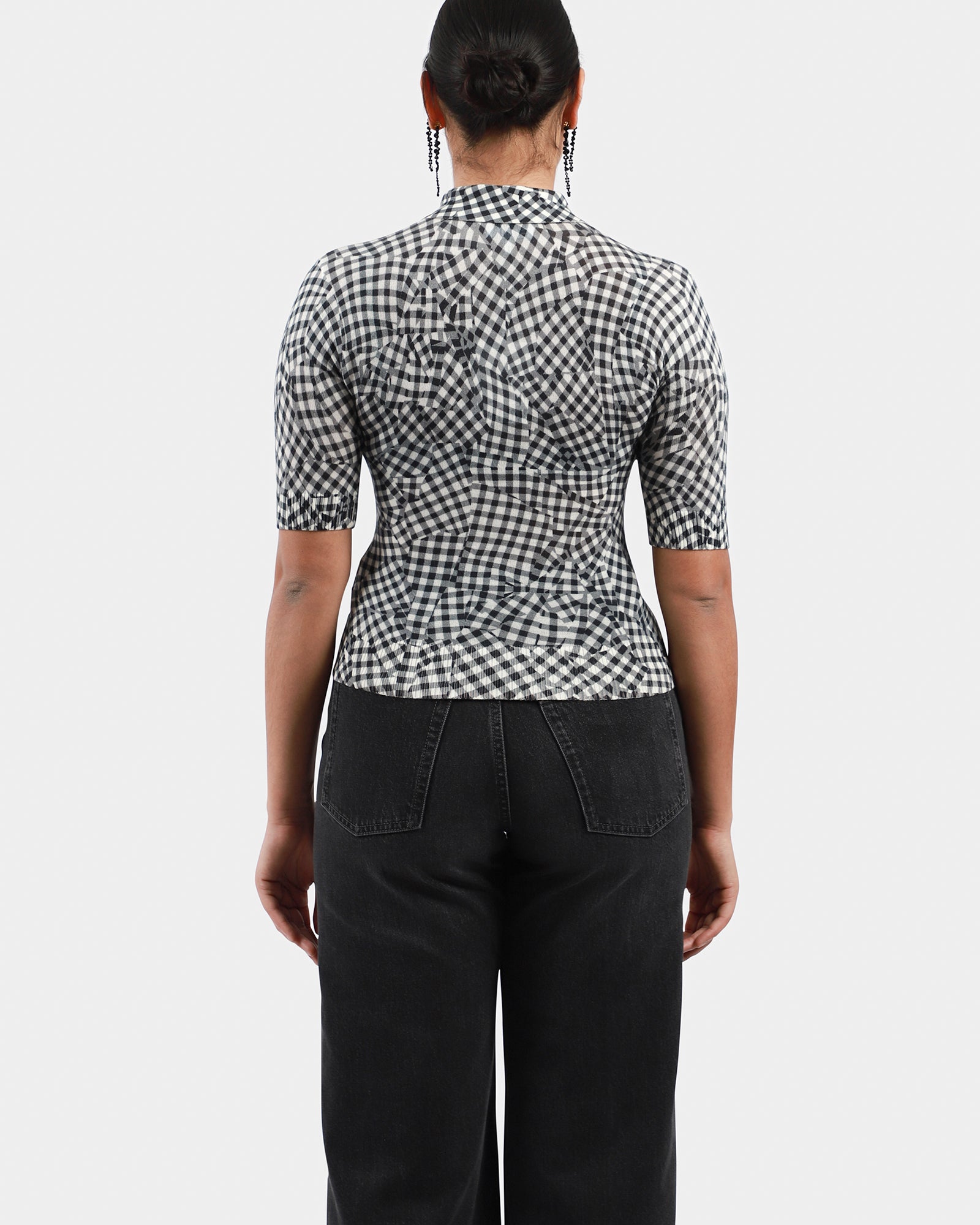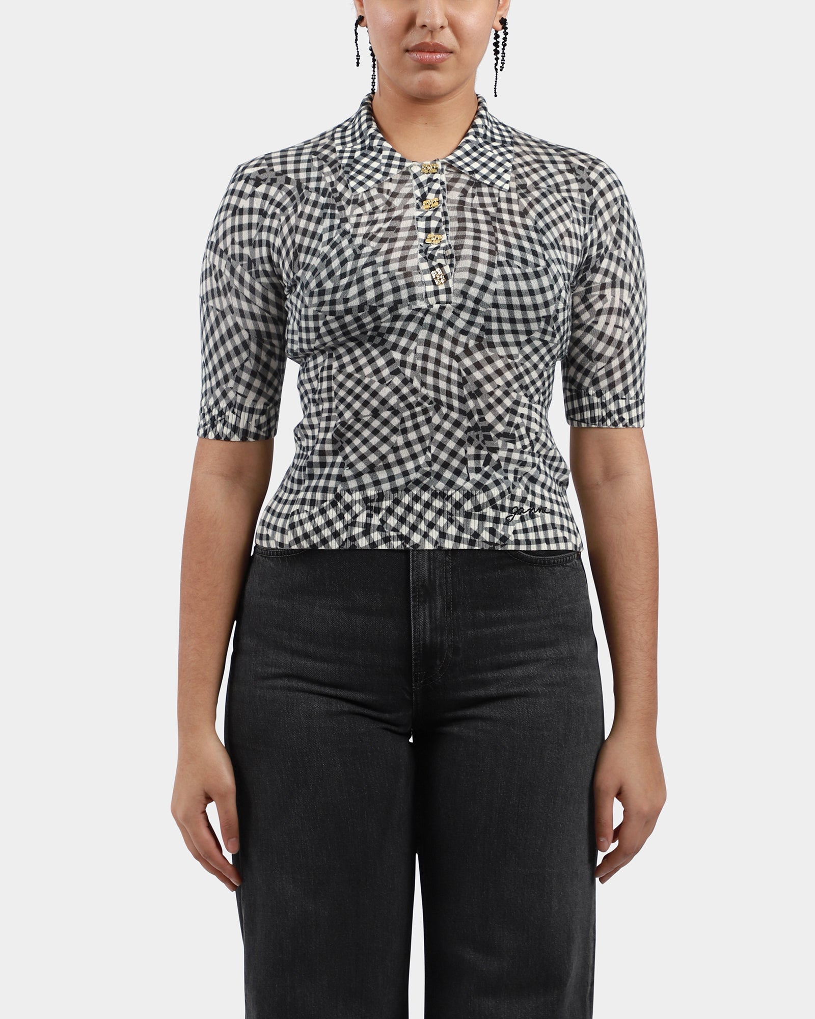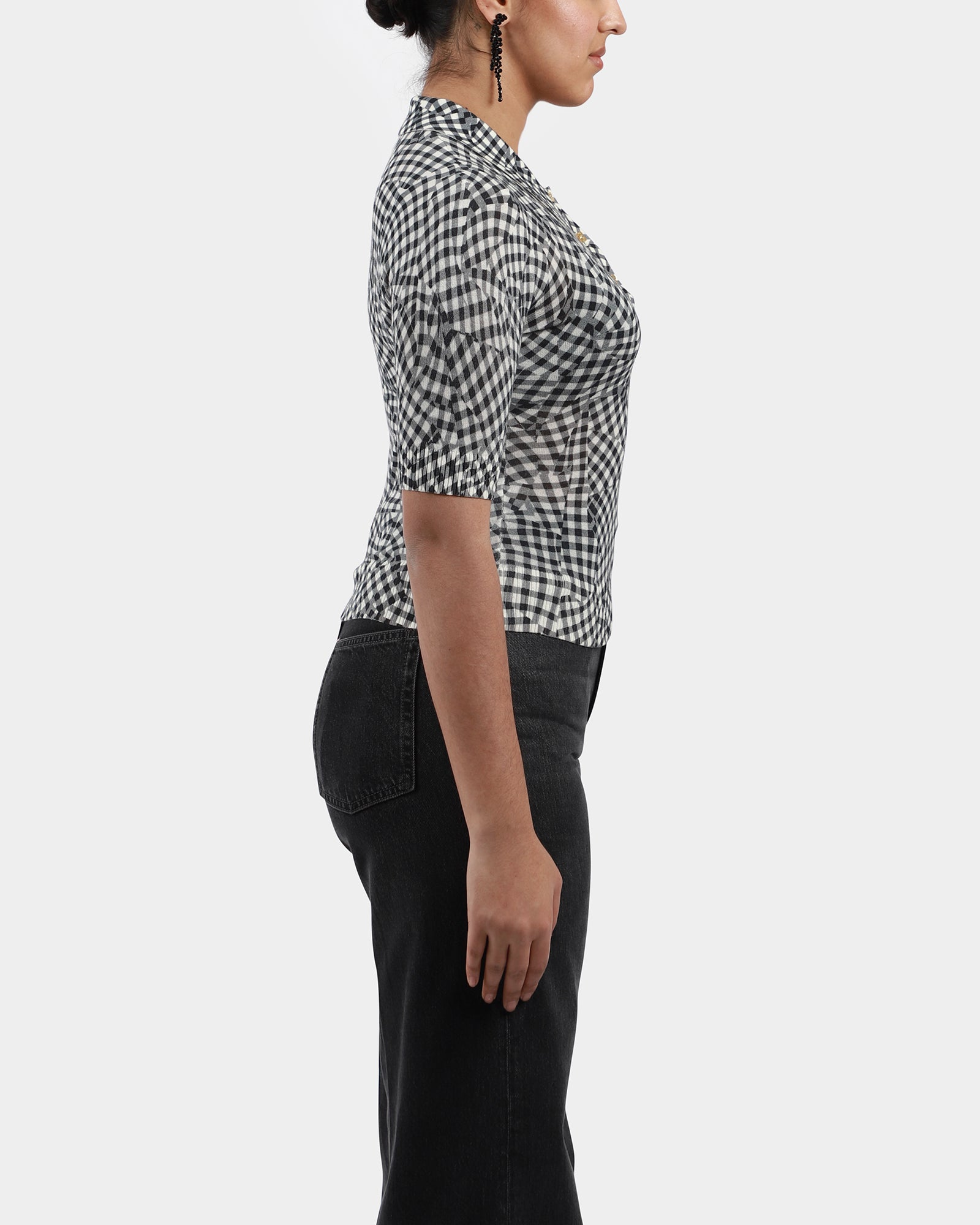 Checked fitted polo, featuring a classic collar, gold toned buttons at front, short sleeves, ribbed edges.