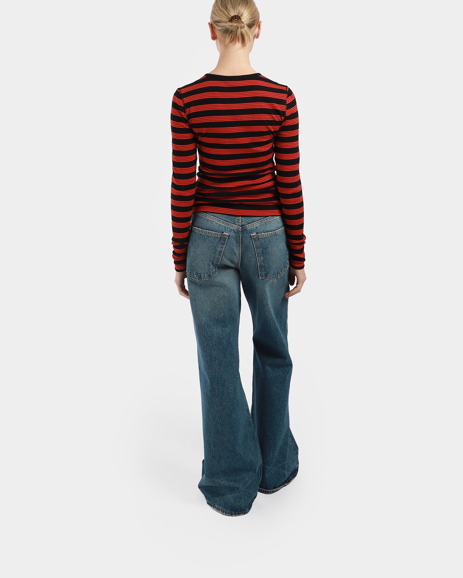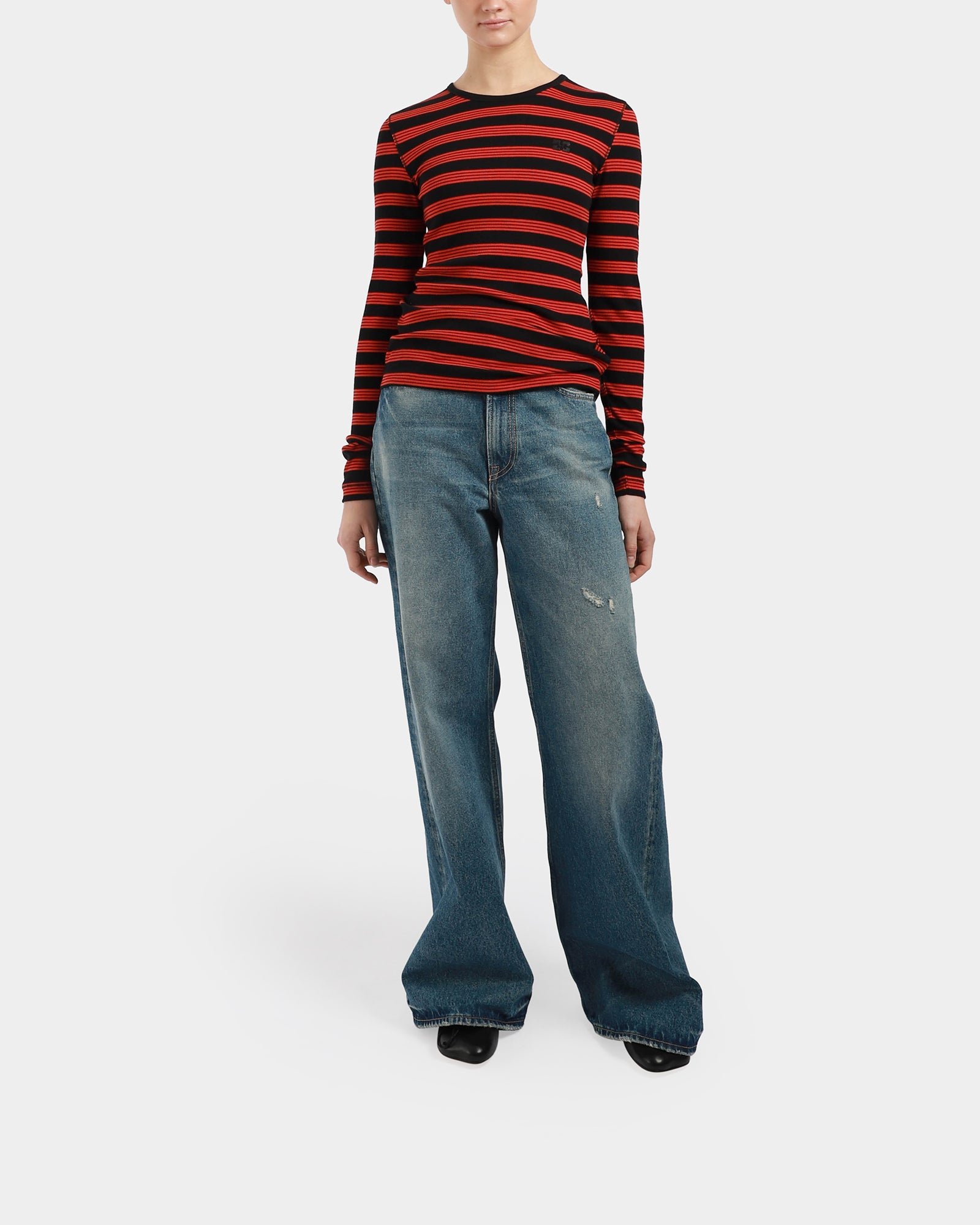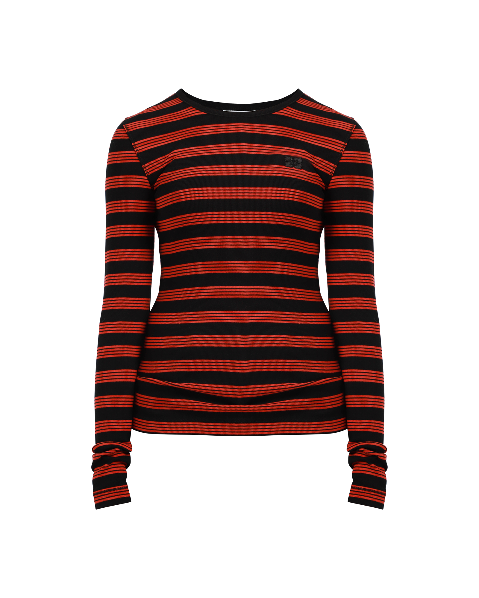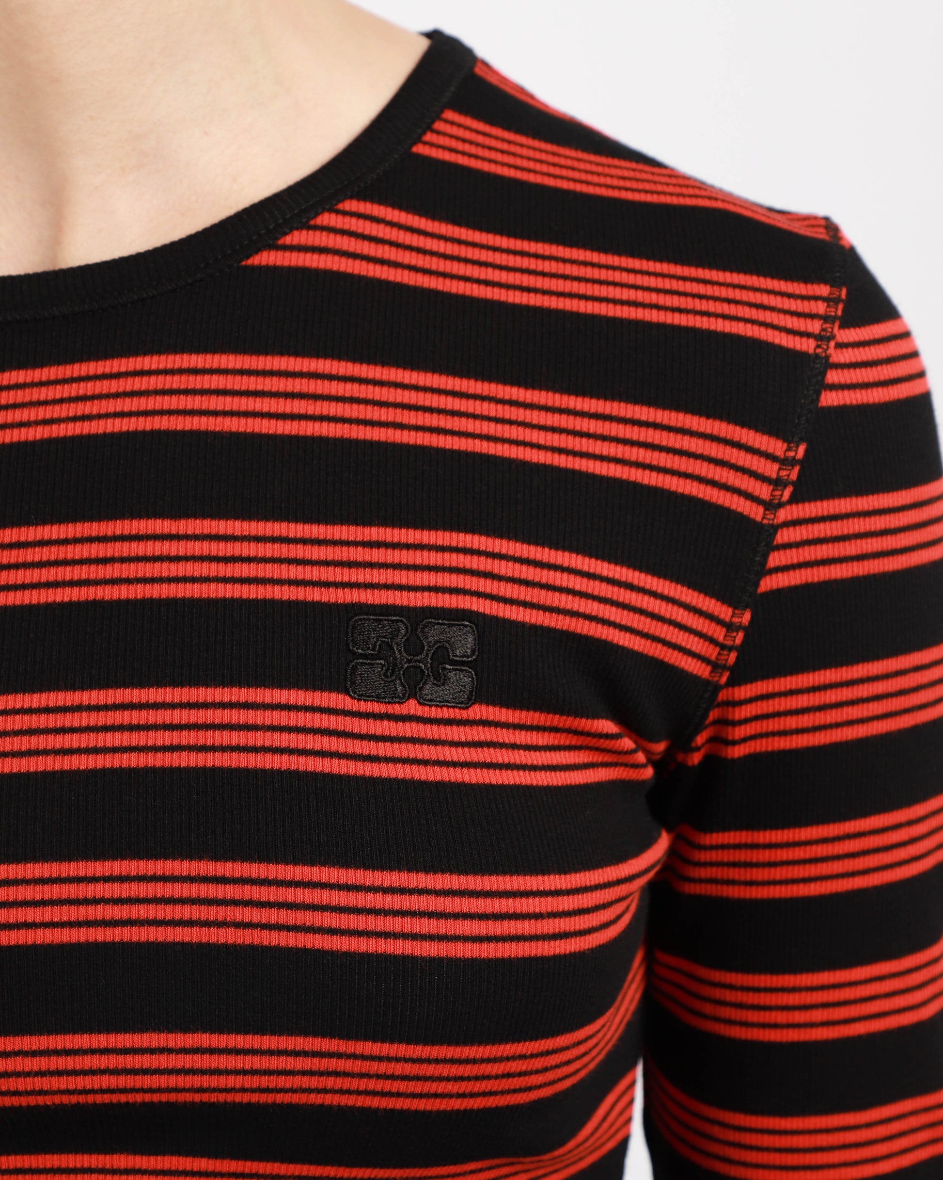 This red and black striped T-shirt, features long sleeves, a round neckline and a GANNI Butterfly logo on the chest.