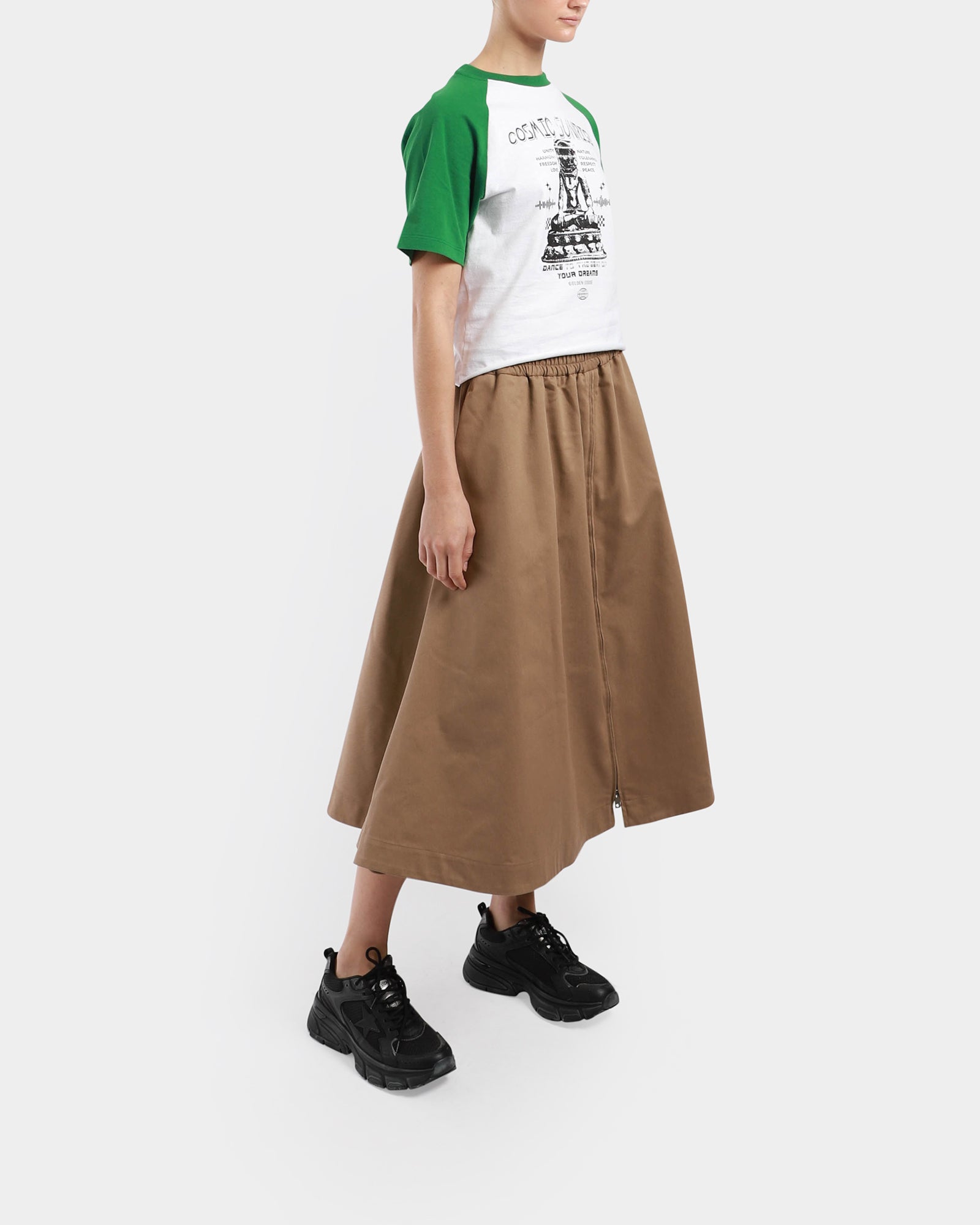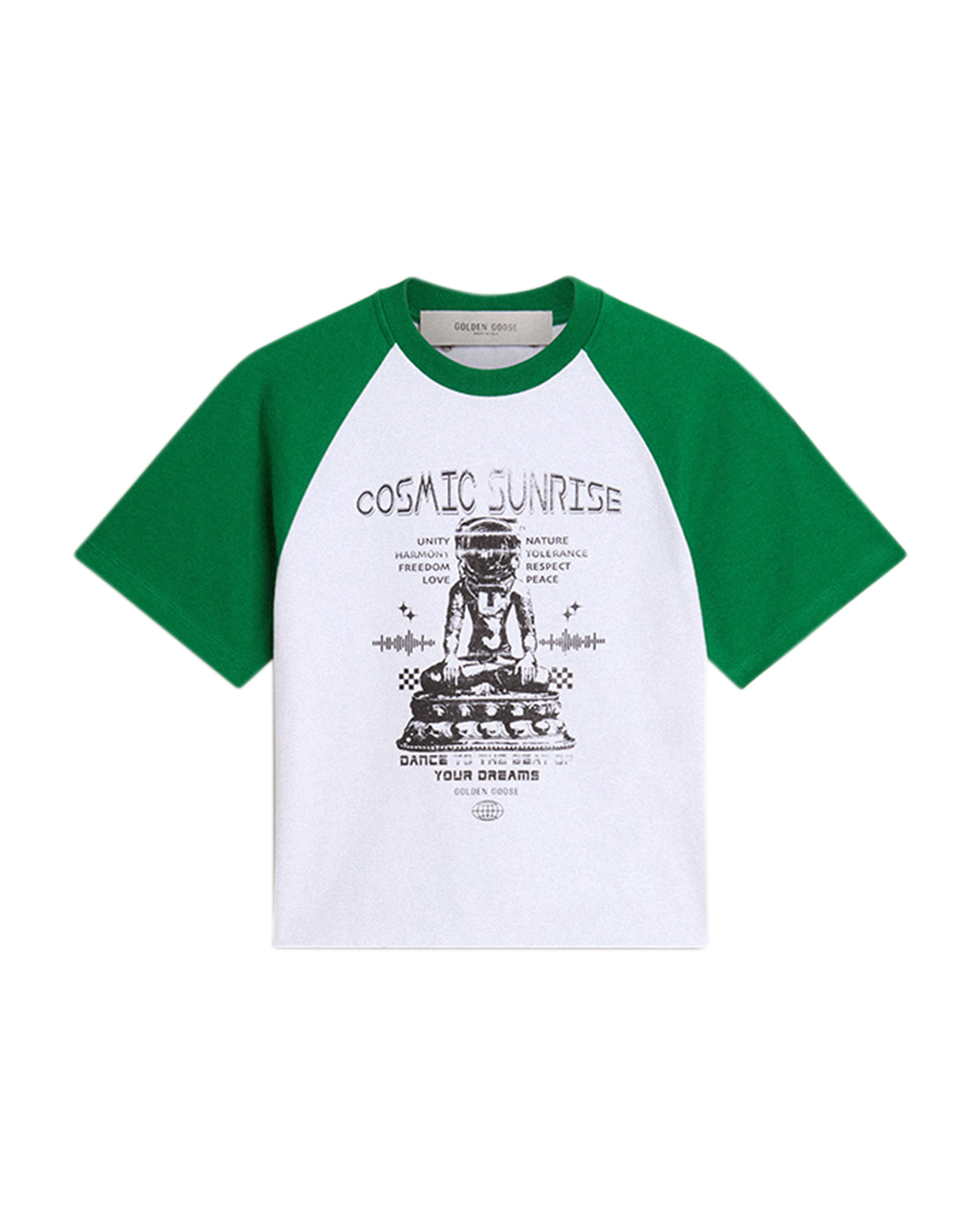 A crew neckline tee featuring short raglan sleeves and a graphic print at the front. It has contrasting colour sleeves and offer a regular fit. Made in Italy.