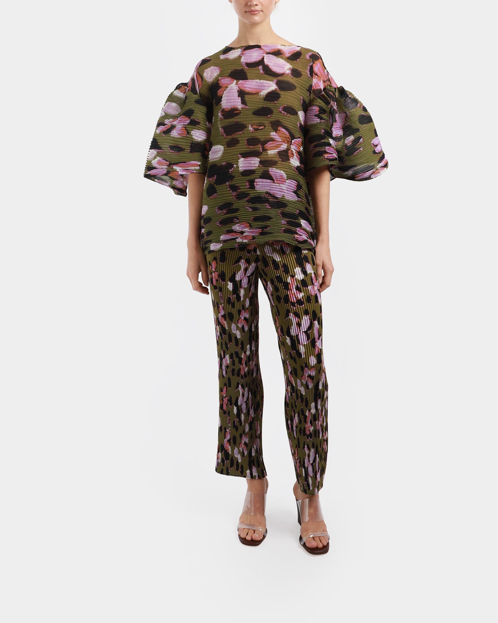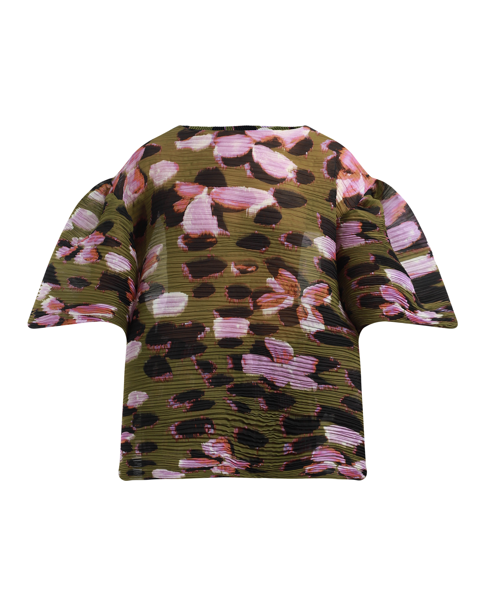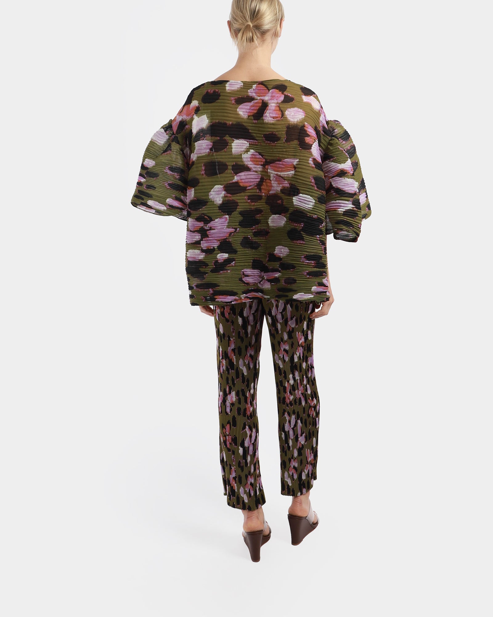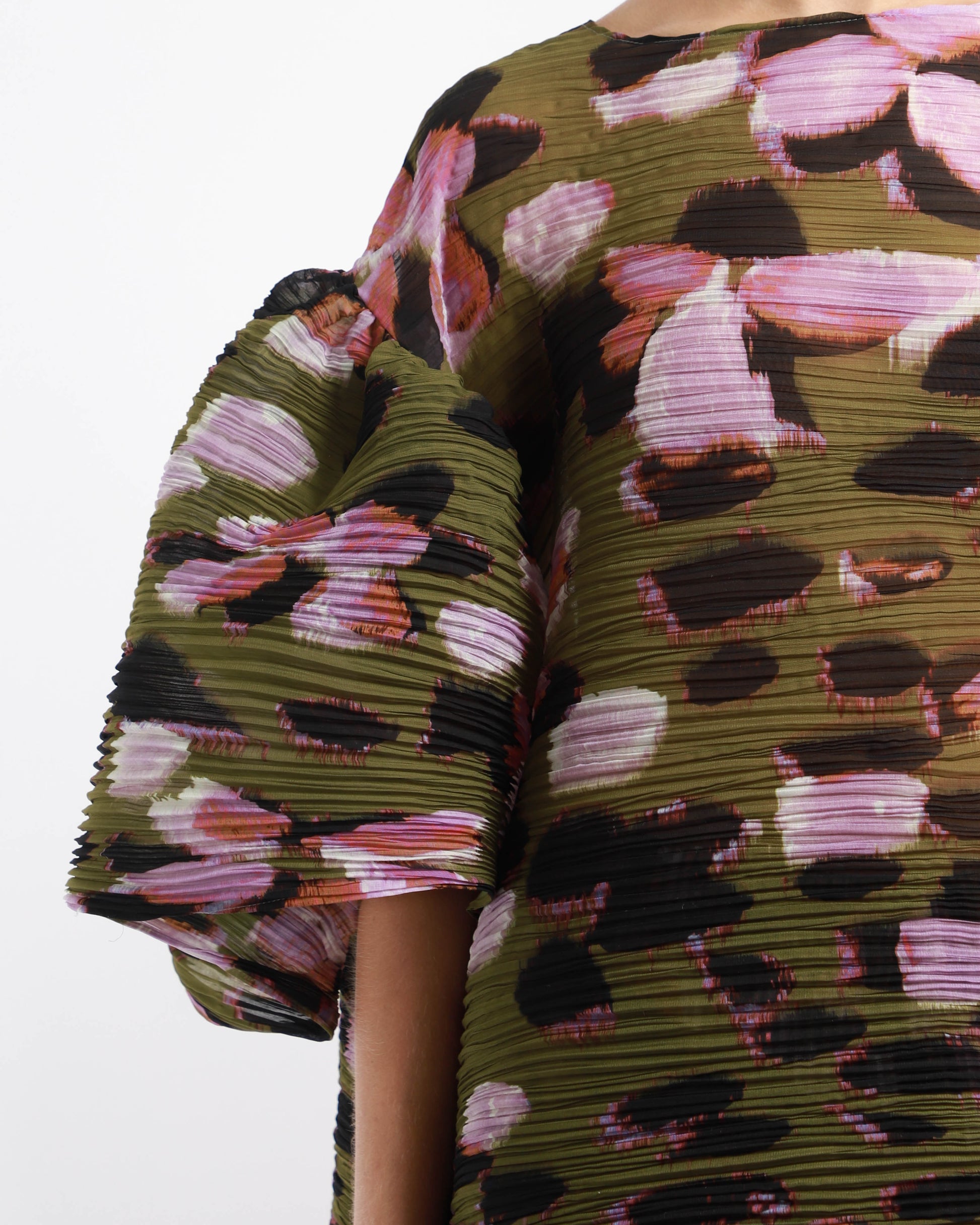 A voluminous top featuring oversized elbow-length sleeves and lengthened body. It has a boat neckline and falls down the hip line. Individually hand-pleated using the Shibori technique, giving it a unique, artisanal touch.