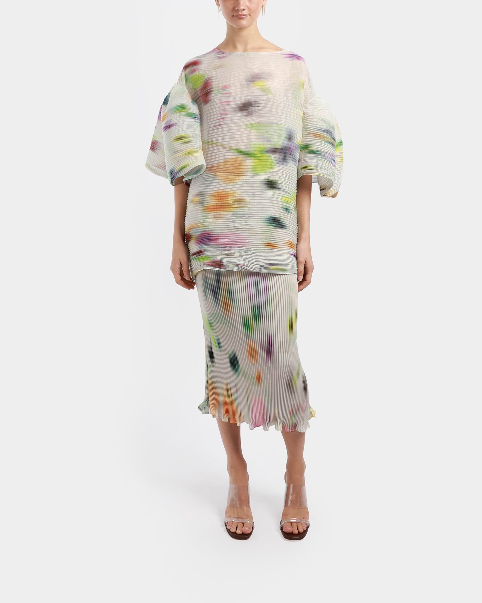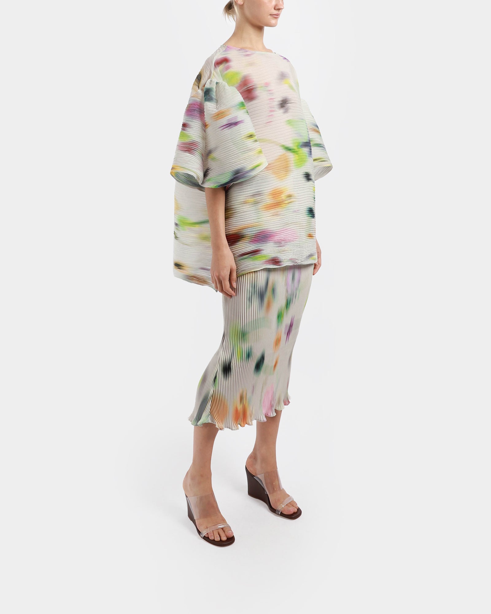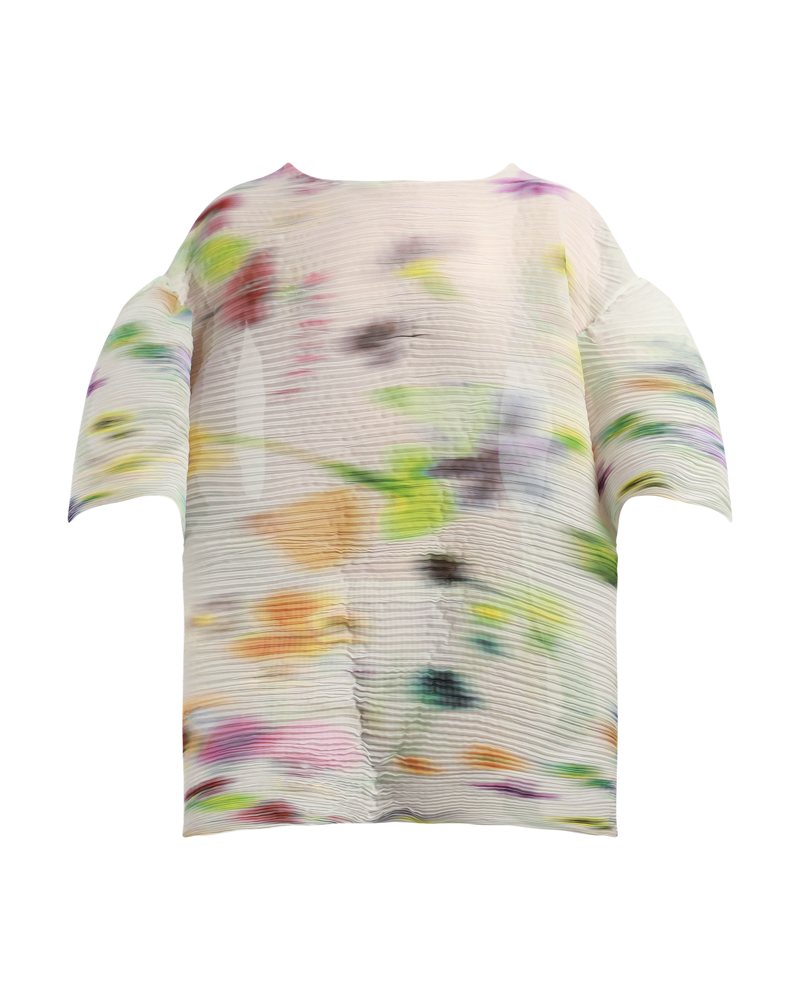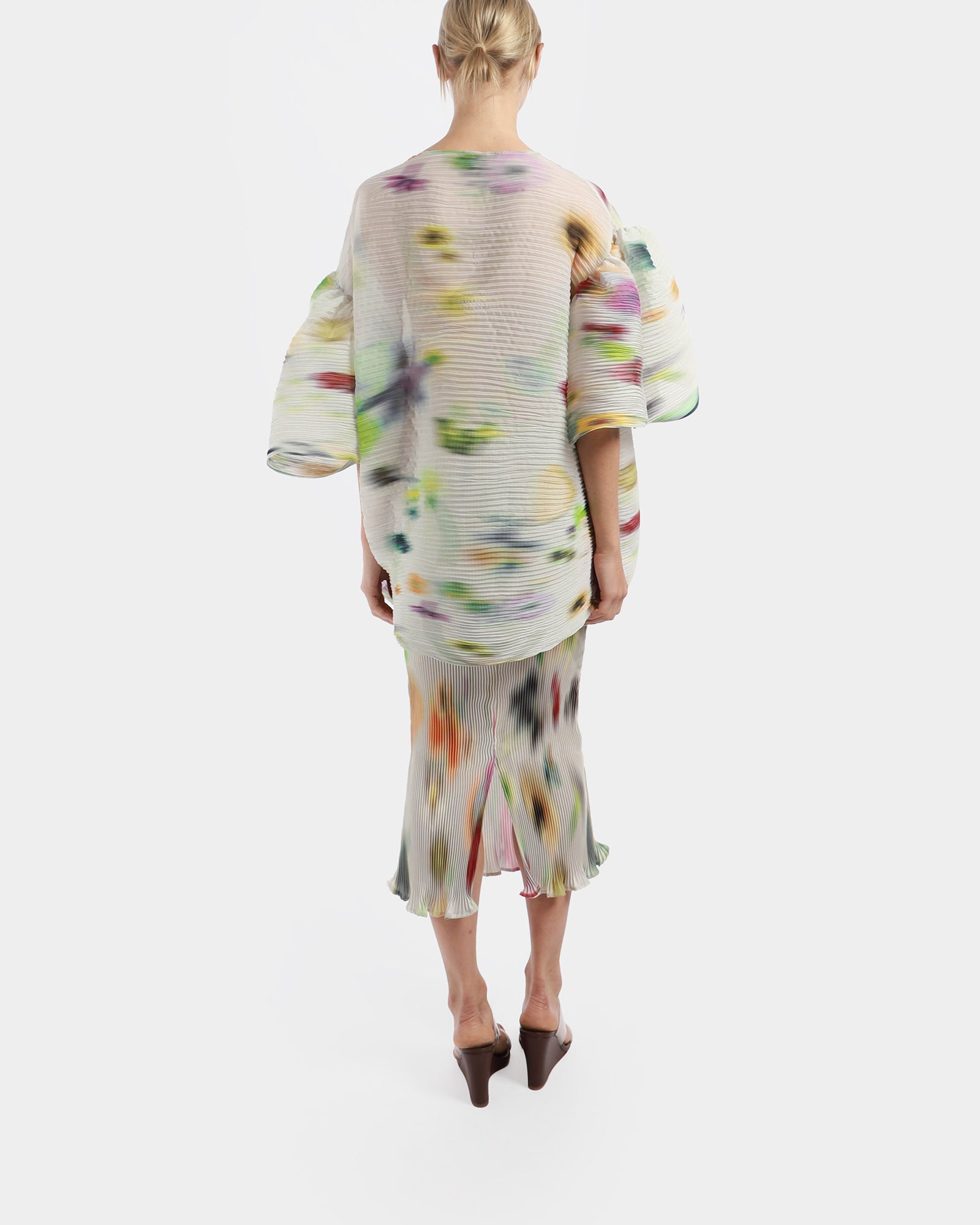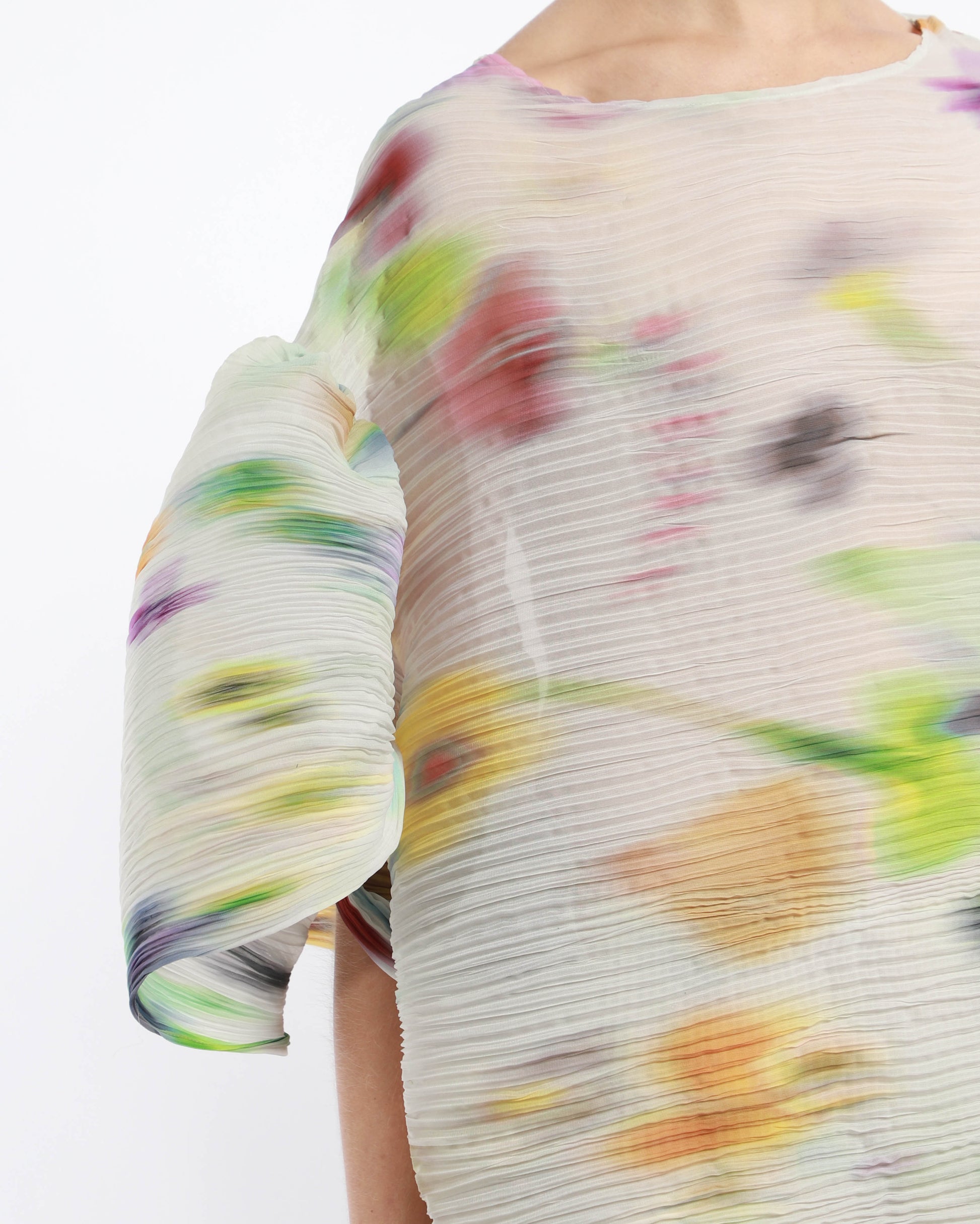 A voluminous top featuring oversized elbow-length sleeves and lengthened body. It has a boat neckline and falls down the hip line. Individually hand-pleated using the Shibori technique, giving it a unique, artisanal touch.