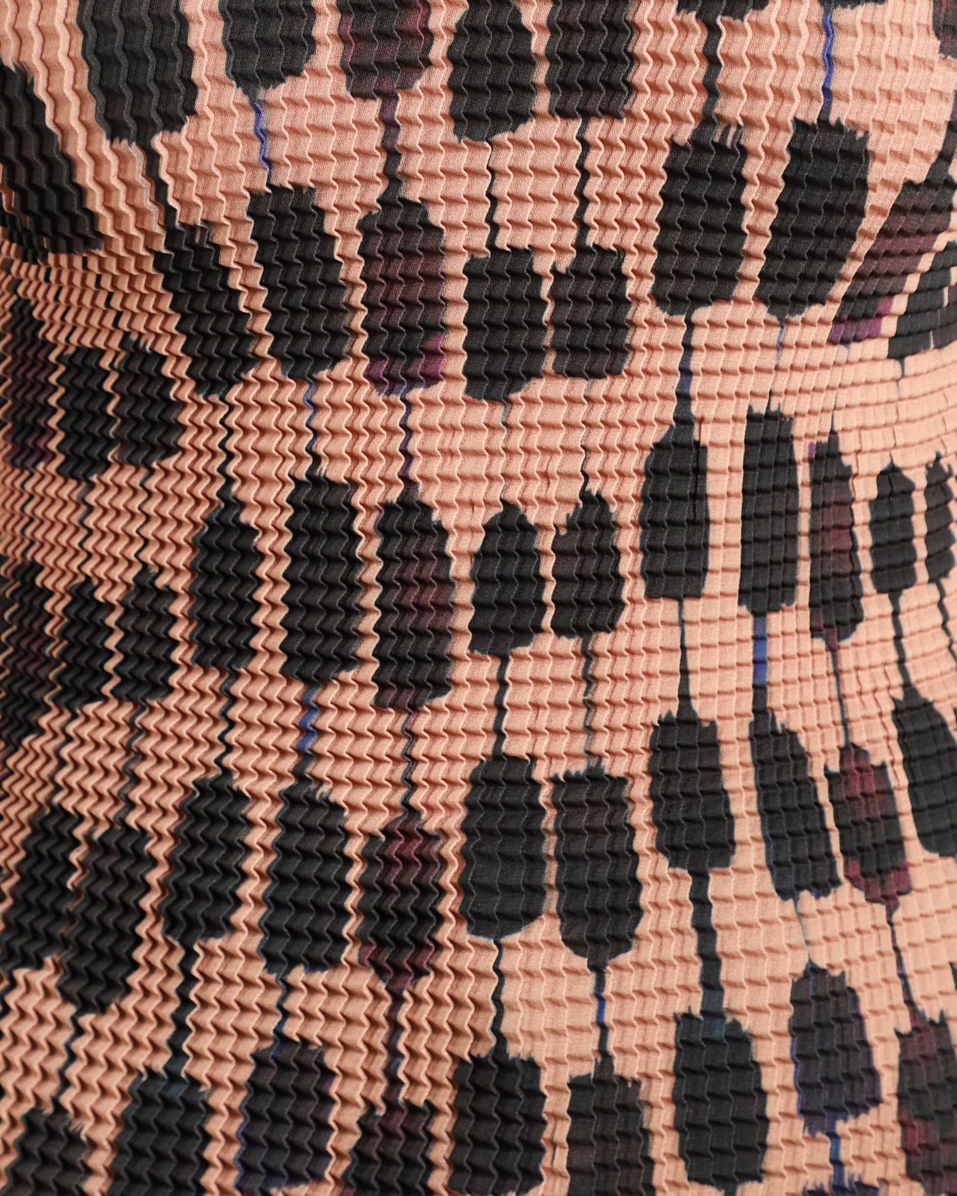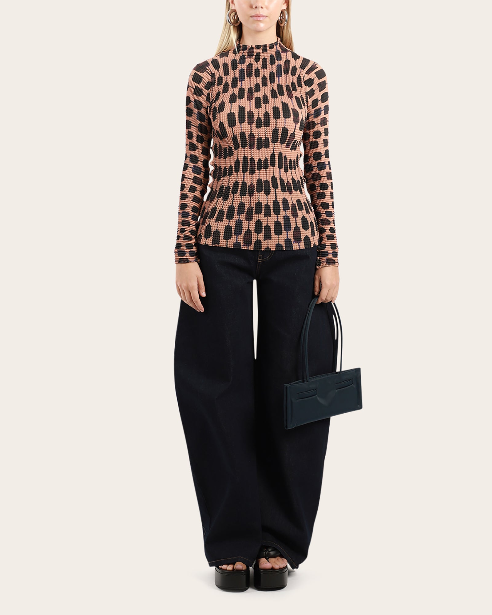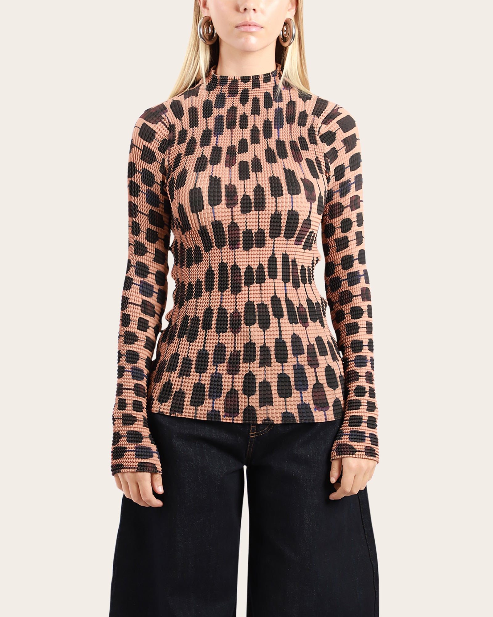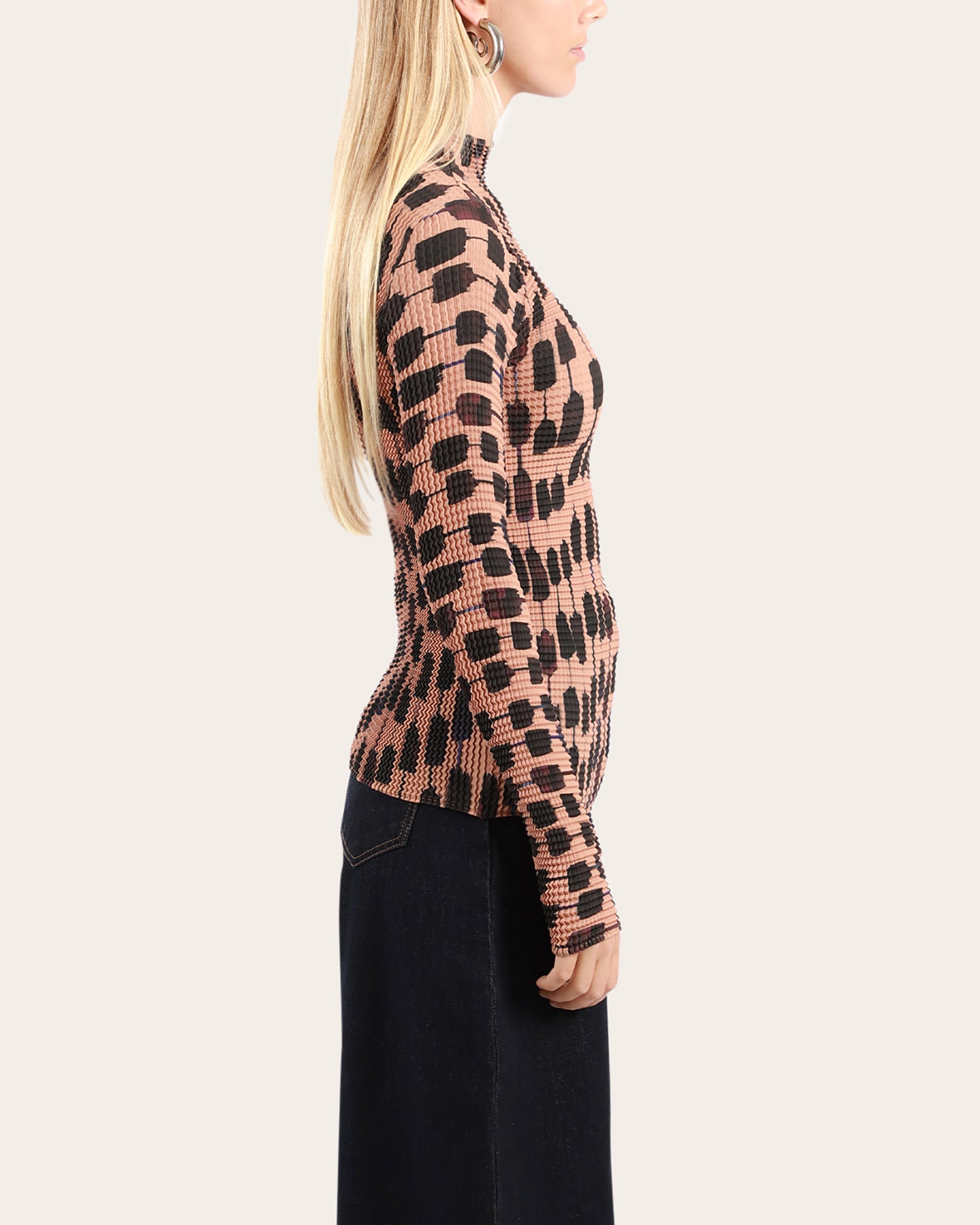 This fitted blouse showcases Julia Heuer’s signature plissé technique with a bold geometric print in warm pink and black tones. Designed with a high neckline and long sleeves, it offers a sculpted yet flexible fit that moves with the body. A versatile statement piece, it pairs effortlessly with denim or tailored separates.