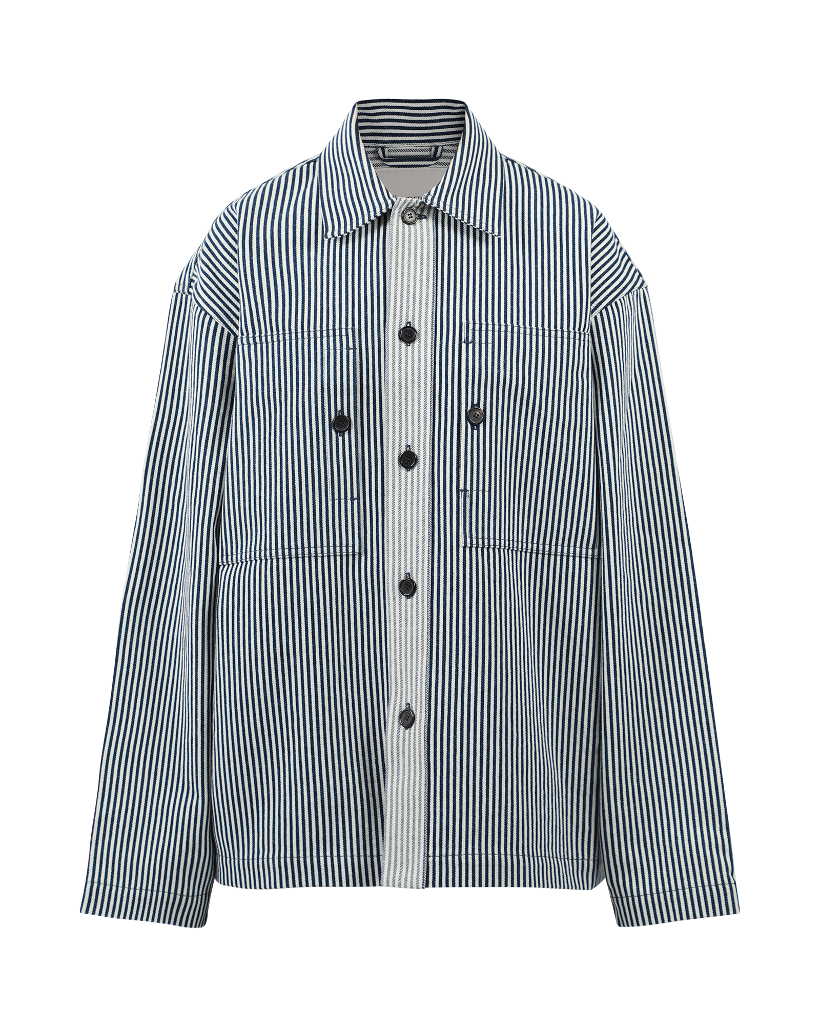 Oversized, dropped shoulder shirt featuring a stripe print and buttoned patch pockets on the front. Designed with a faded button placket, black buttons, and a logo embossed raw leather patch at the back hem. Unlined for a relaxed feel.
