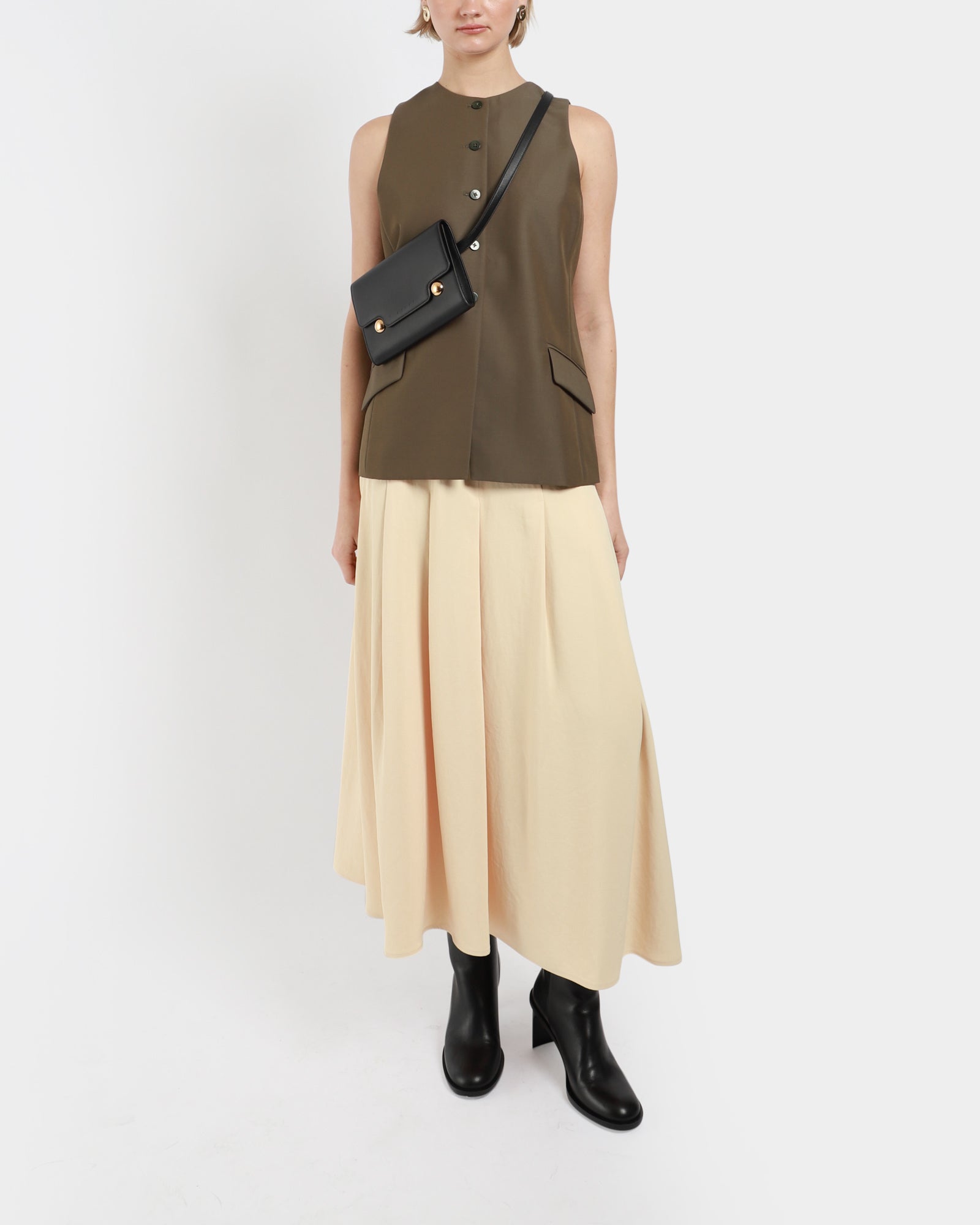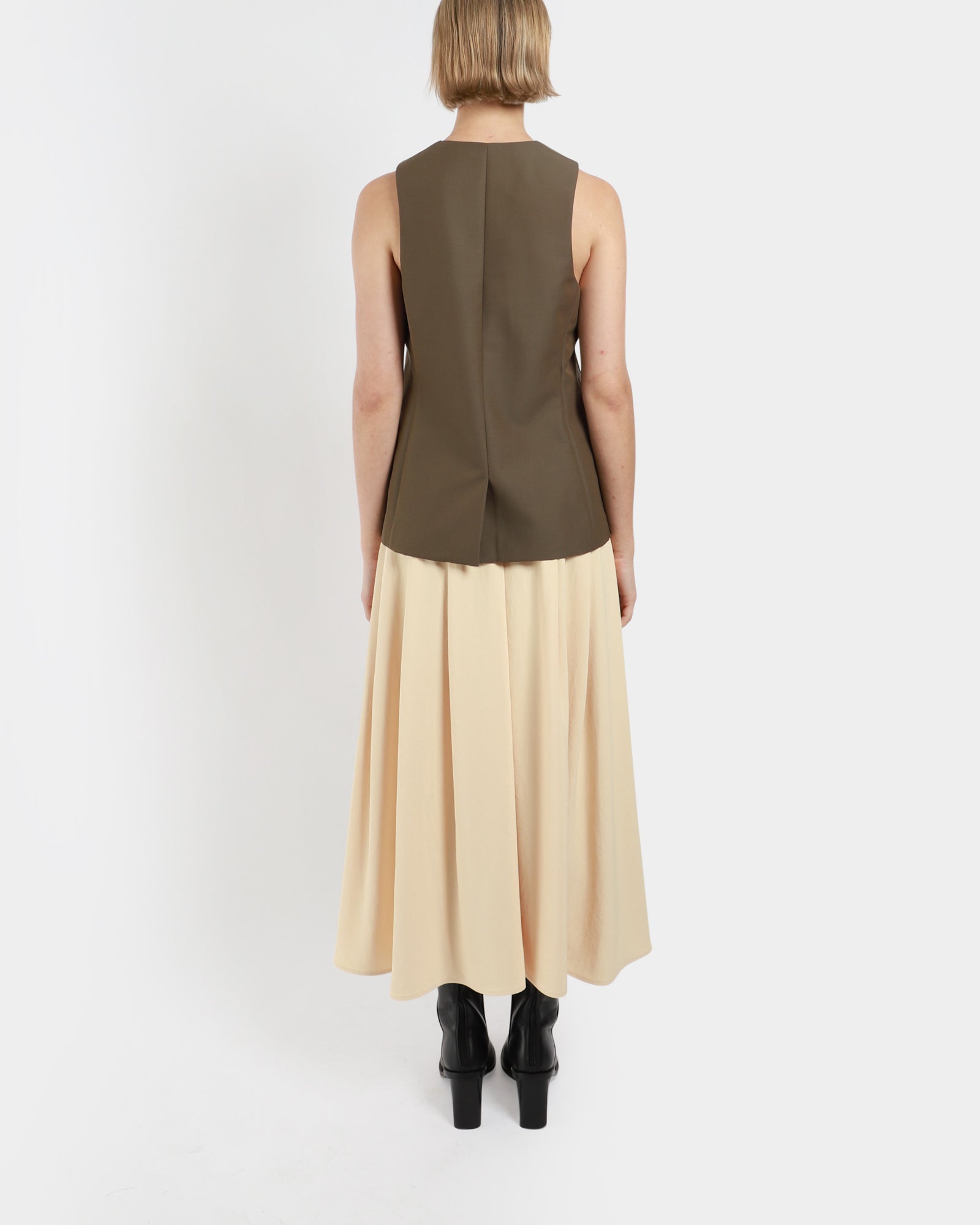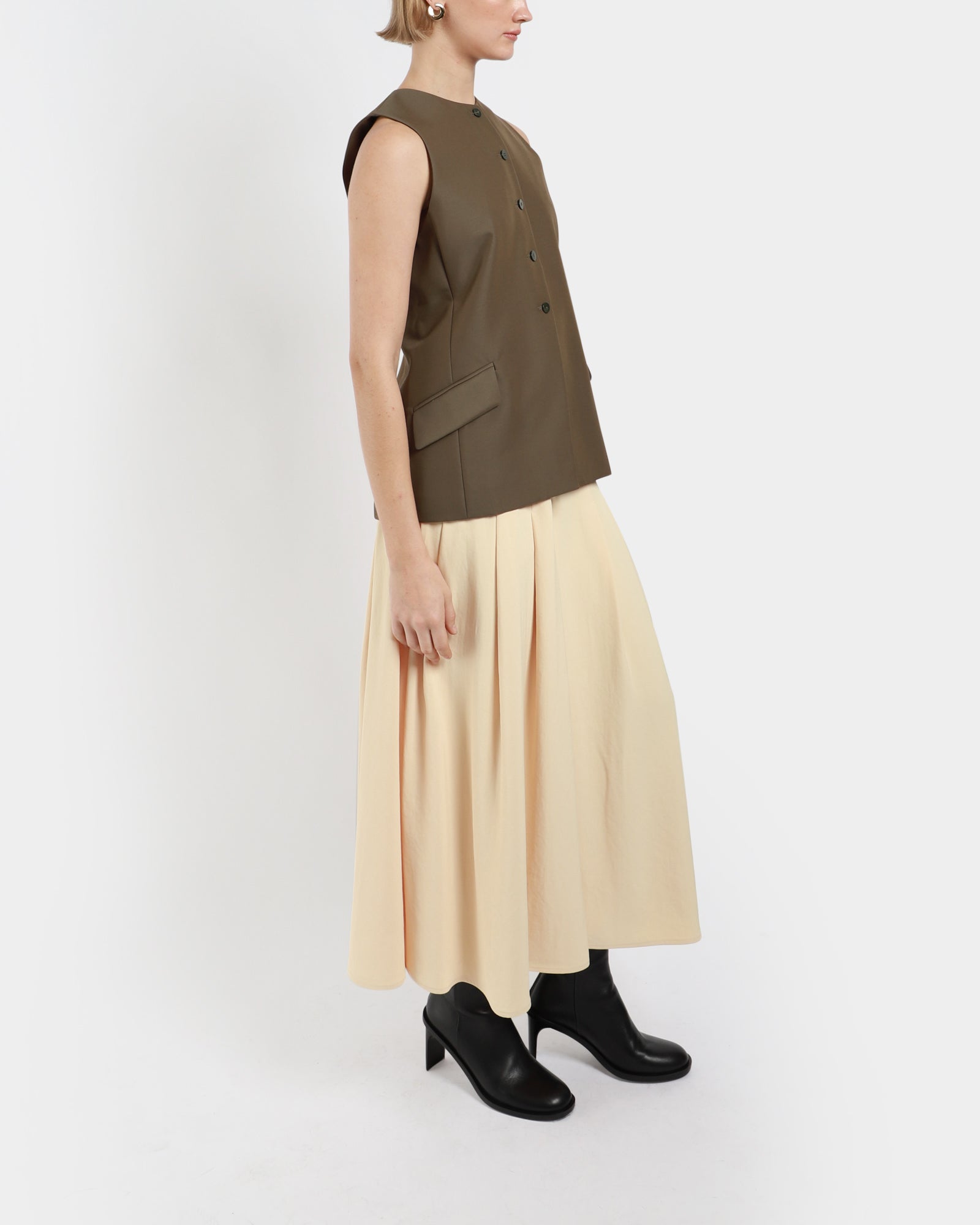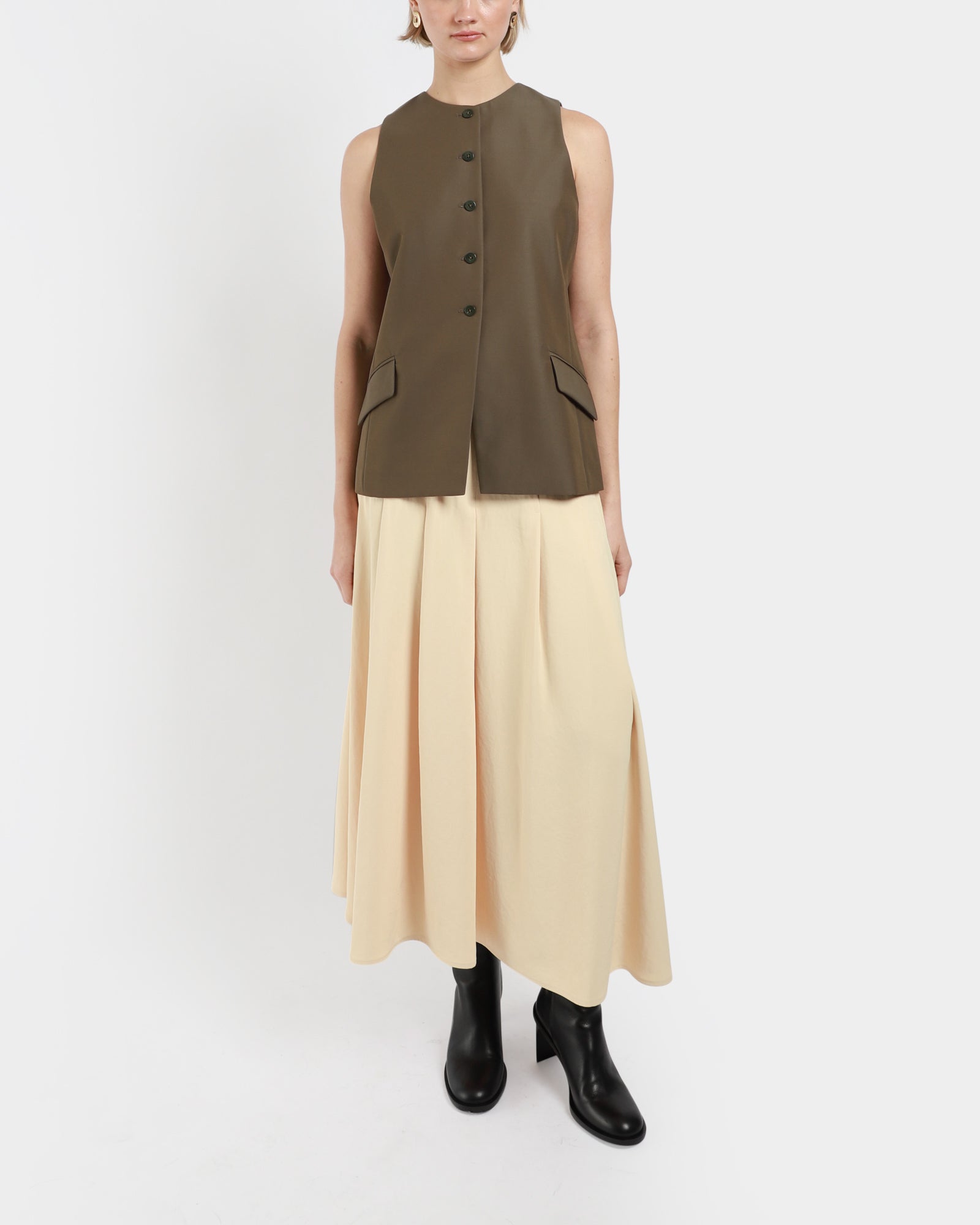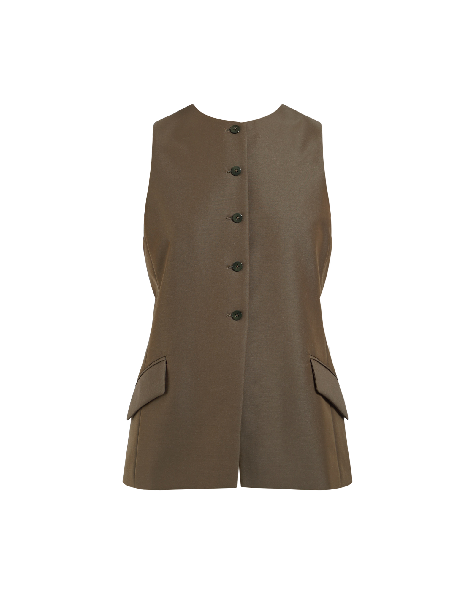 This tailored sleeveless vest is crafted with a five-button closure, finishing just below the waist for a flattering, cut-away style. It features a small vent at the back and closed-flap pockets.