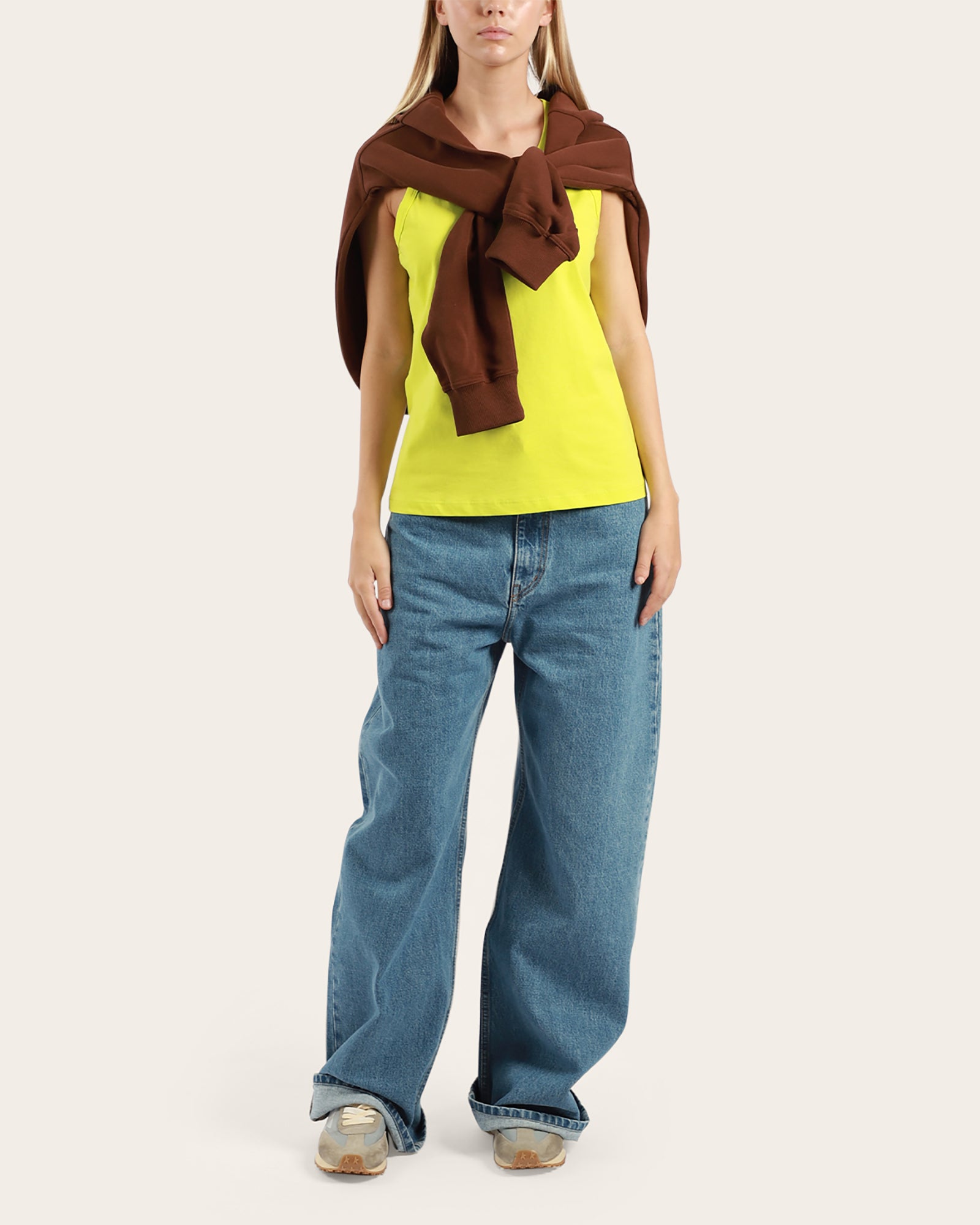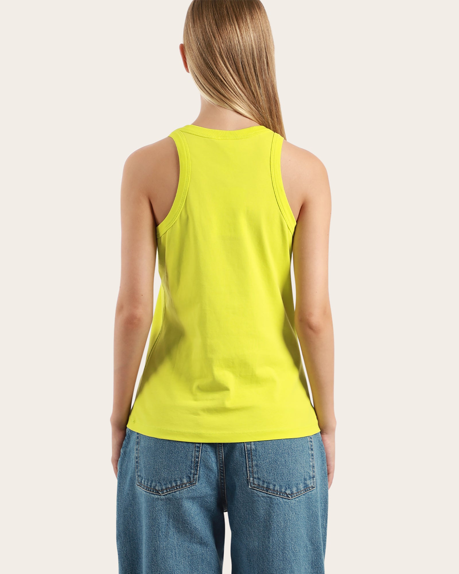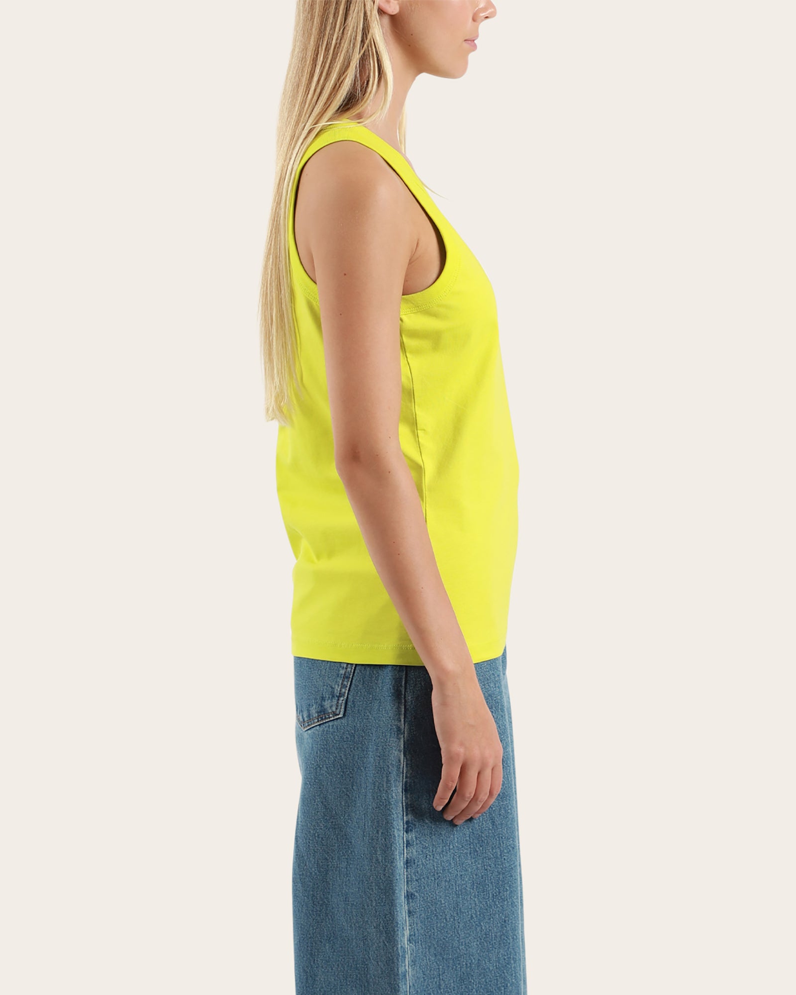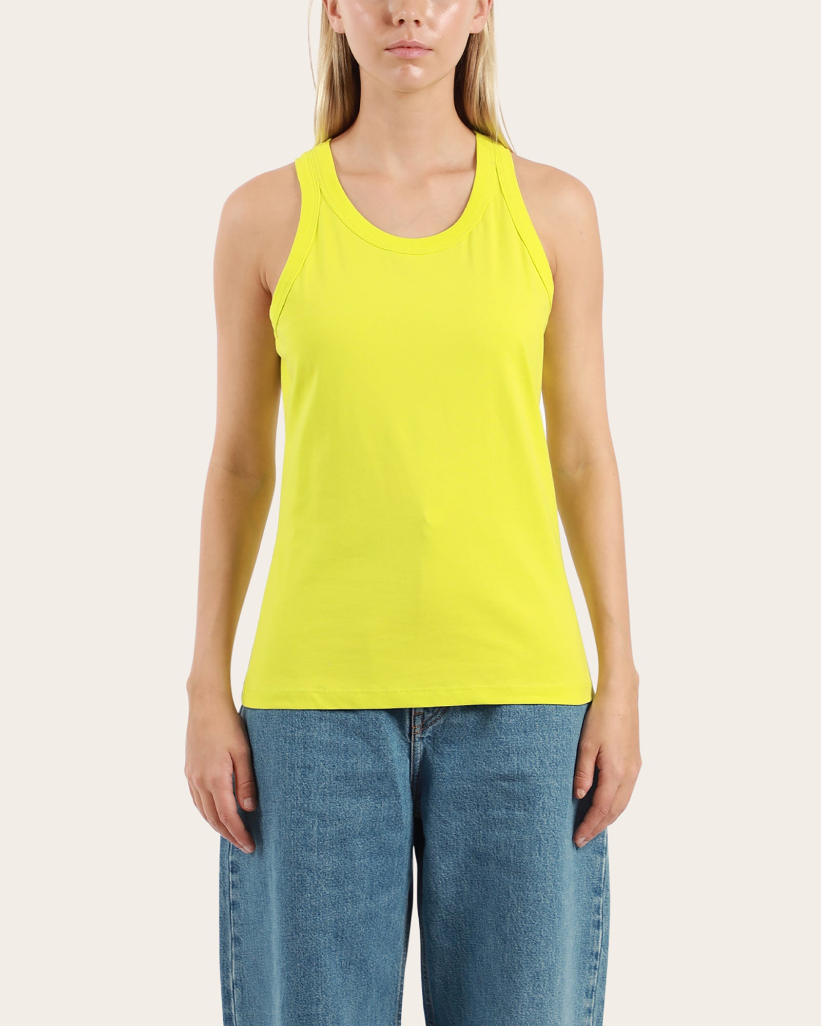 A fitted racerback singlet with ribbed trim at the neckline and armholes, crafted from midweight organic cotton jersey in striking Fluro Yellow.