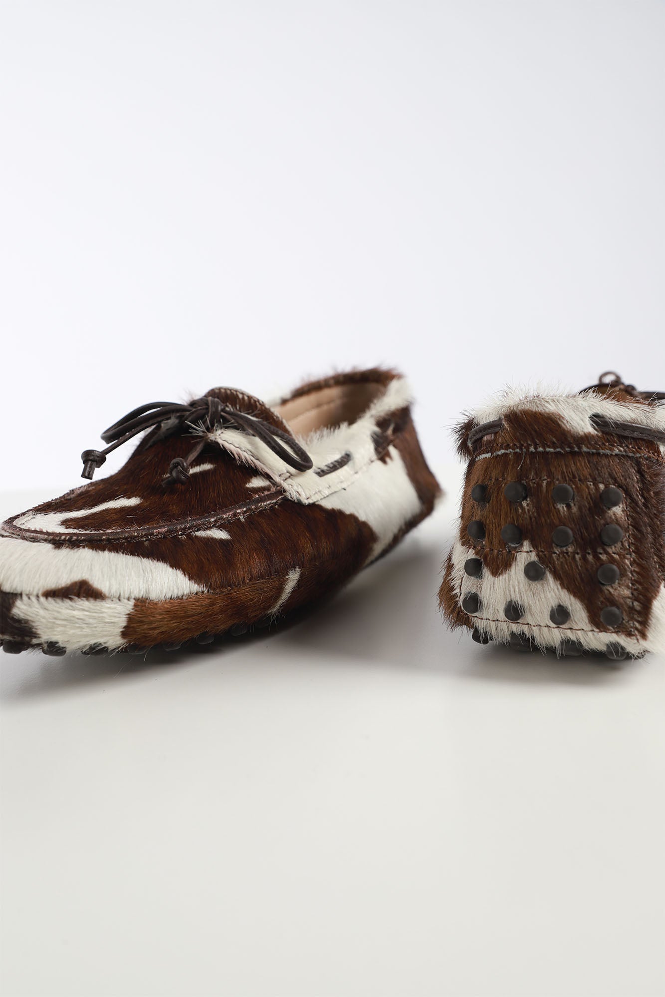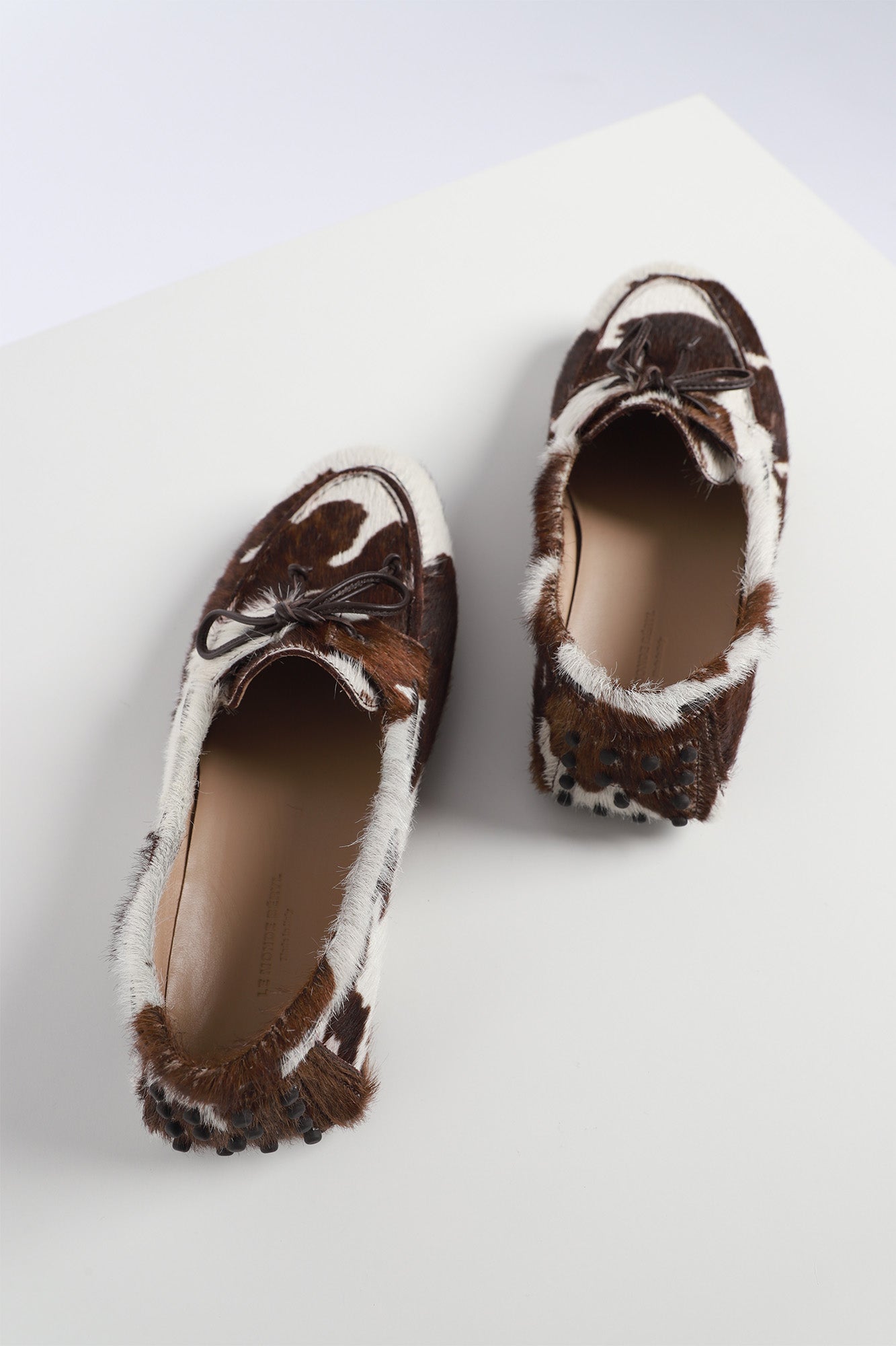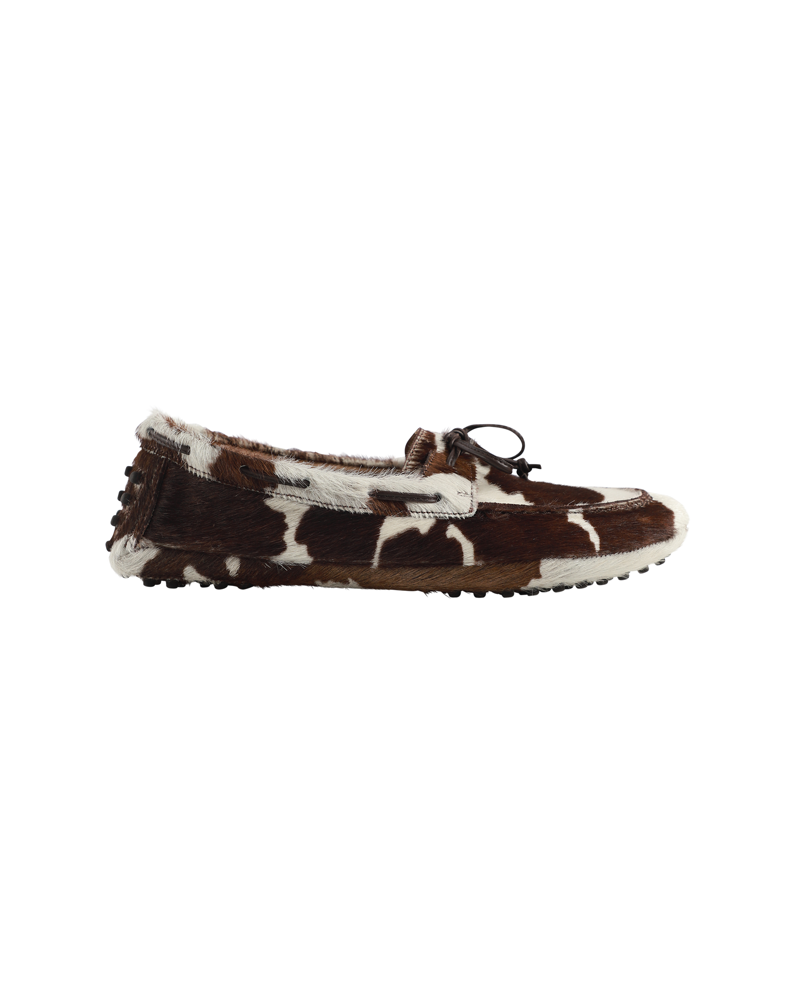 These driver mocassin from Le Monde Beryl feature a cow print calf hair with cushioned leather insole, rubber pebble sole, with an 8mm, enhanced with a leather bow tie at front. Made in Italy. - Cow print
