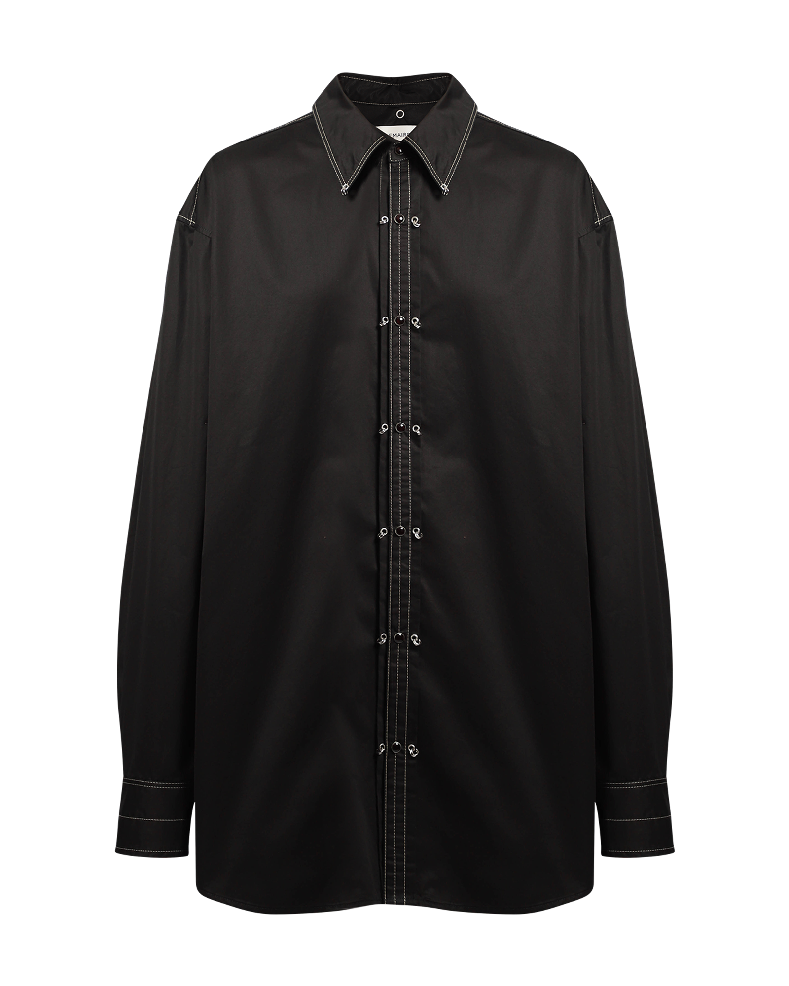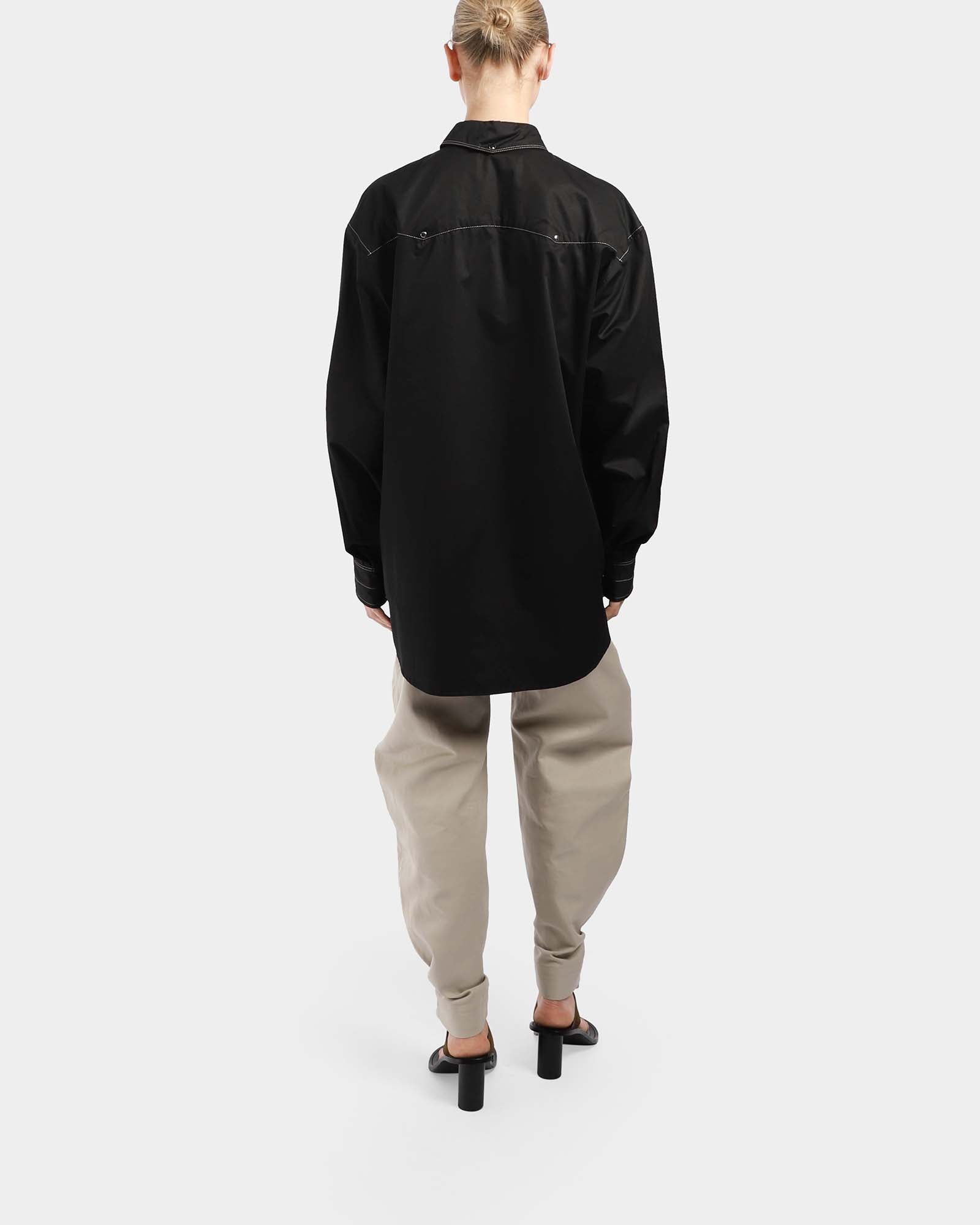 Contrast stitching lines the button placket, cuffs, collar, and forms a pointed pattern on the back of this Lemaire shirt. It features silver metal and black mother-of-pearl snap buttons, along with metal rivets on the central buttons, collar tips, and back yoke, add a jewellery-like shine.