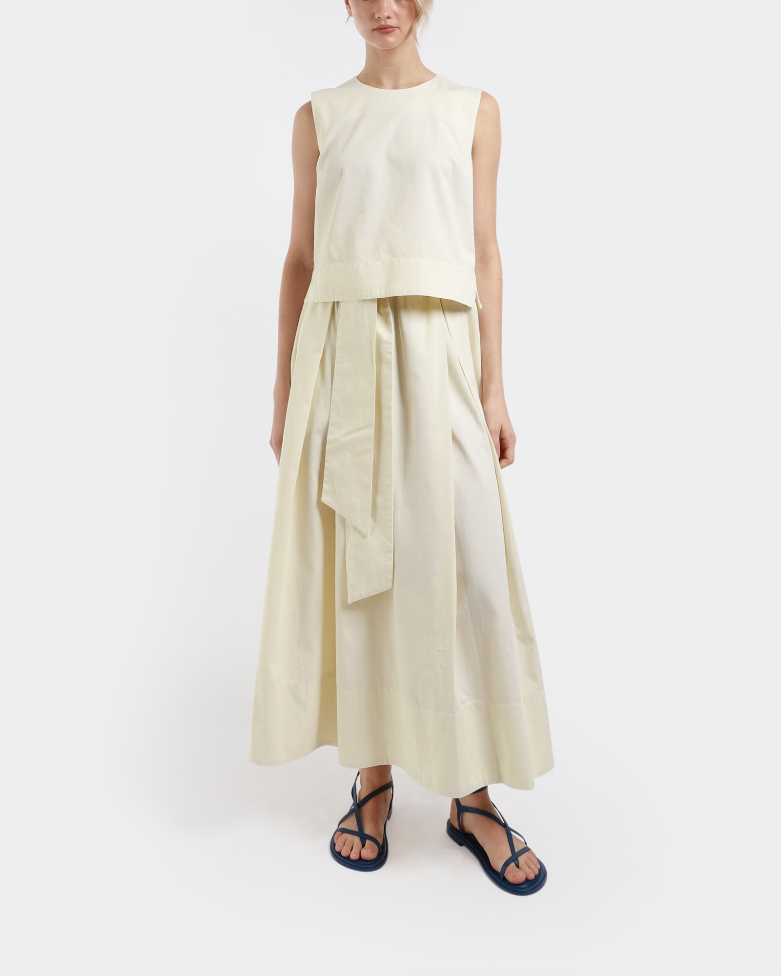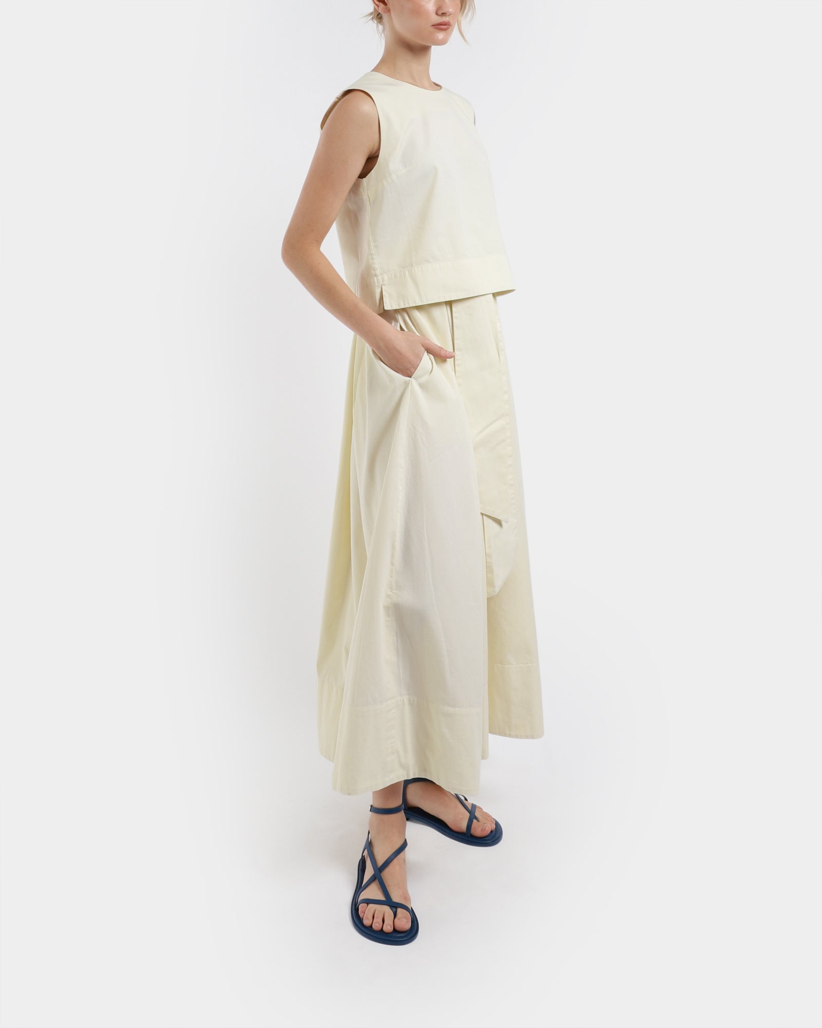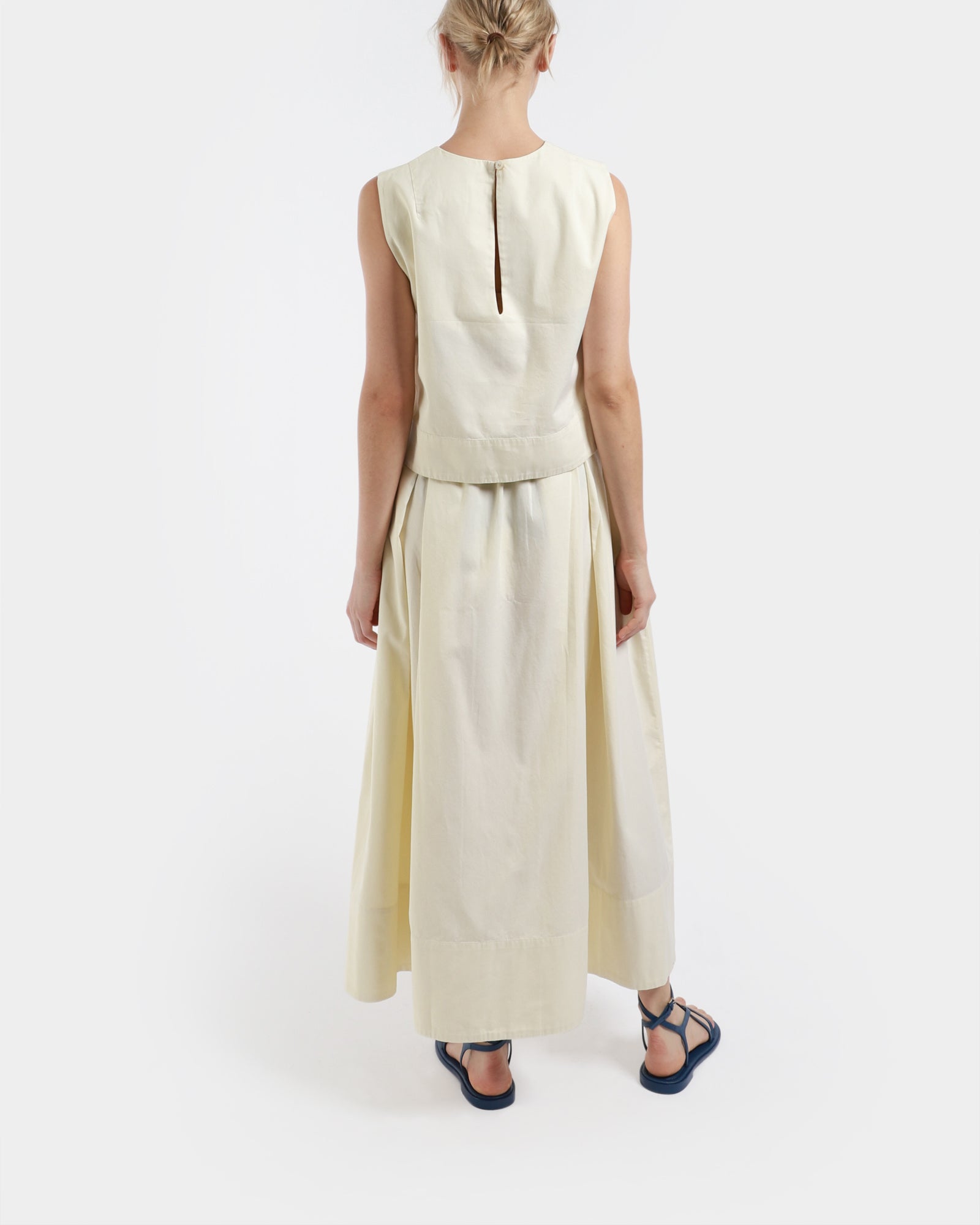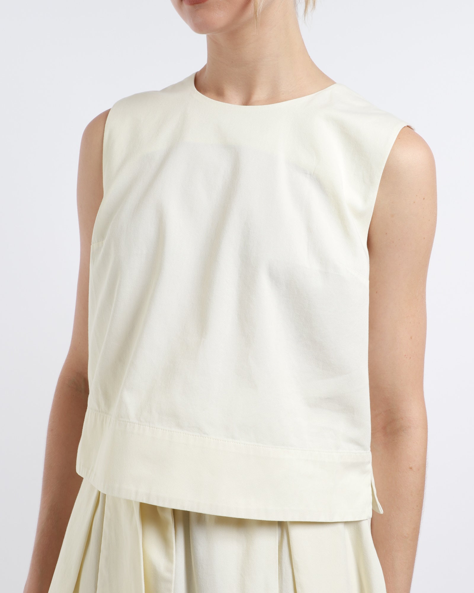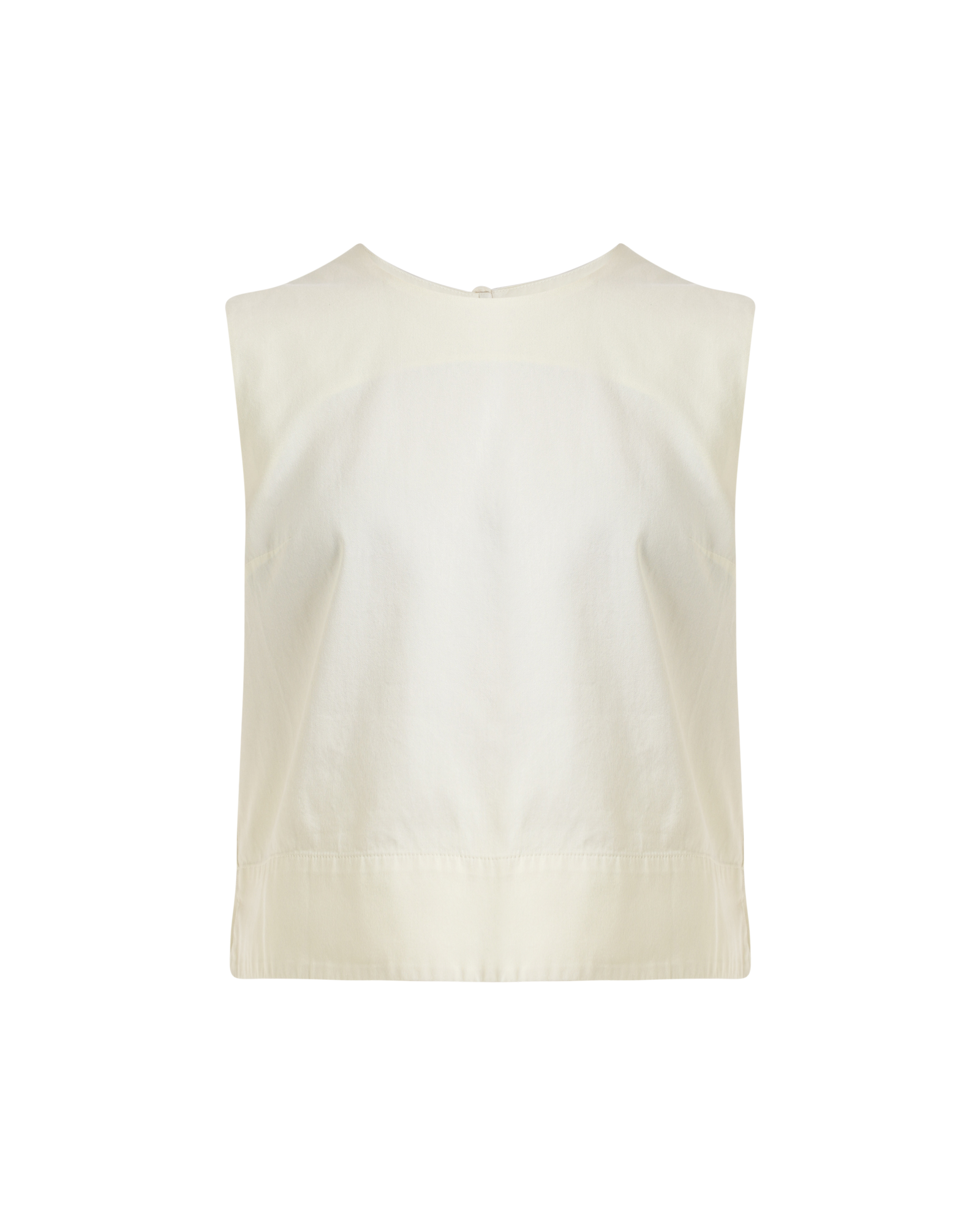 The Sheath Top is a sleeveless design featuring a round neckline, a wide hemline with side splits, and a keyhole with a button closure at the back. Made in USA.
