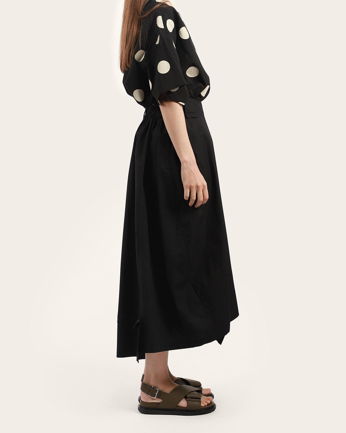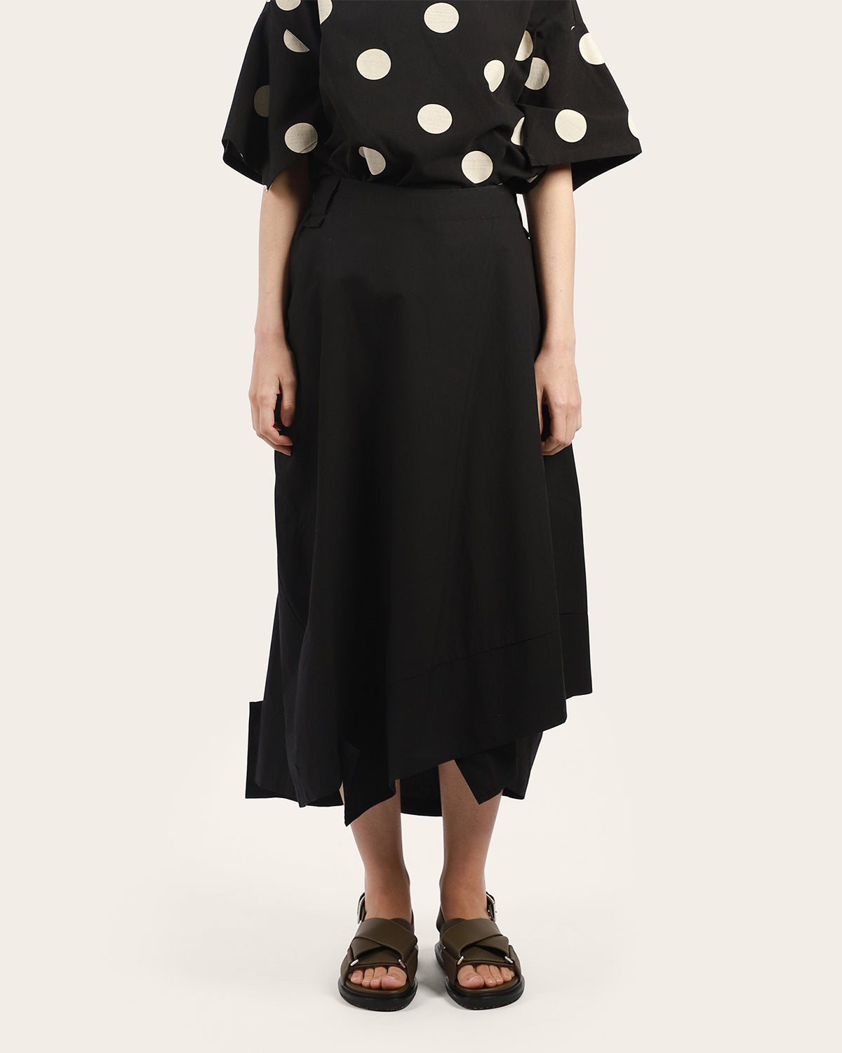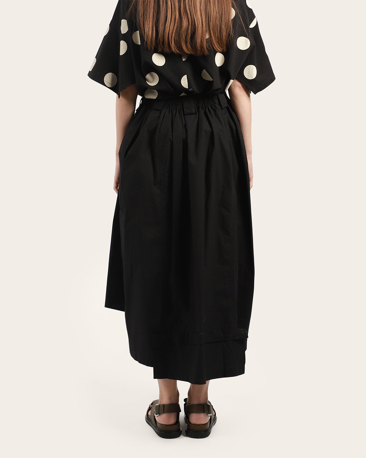 This Moyuru skirt combines clean lines with an avant-garde twist. Crafted from soft, lightweight cotton, it features a gently flared silhouette and an asymmetric hem for subtle drama. Effortless yet striking, it’s perfect for layered looks or a minimalist statement.