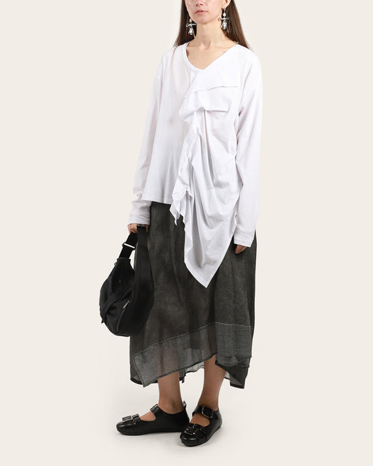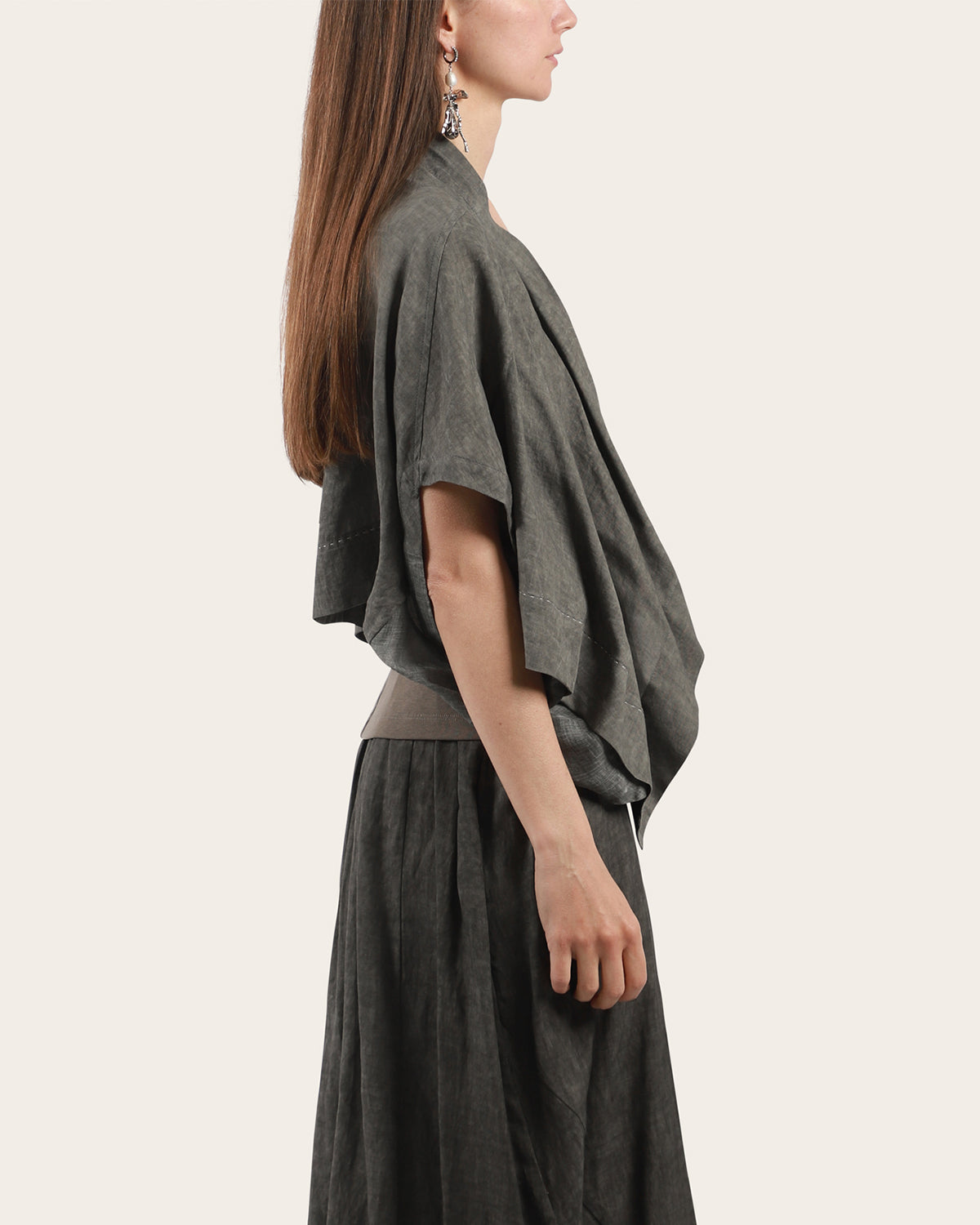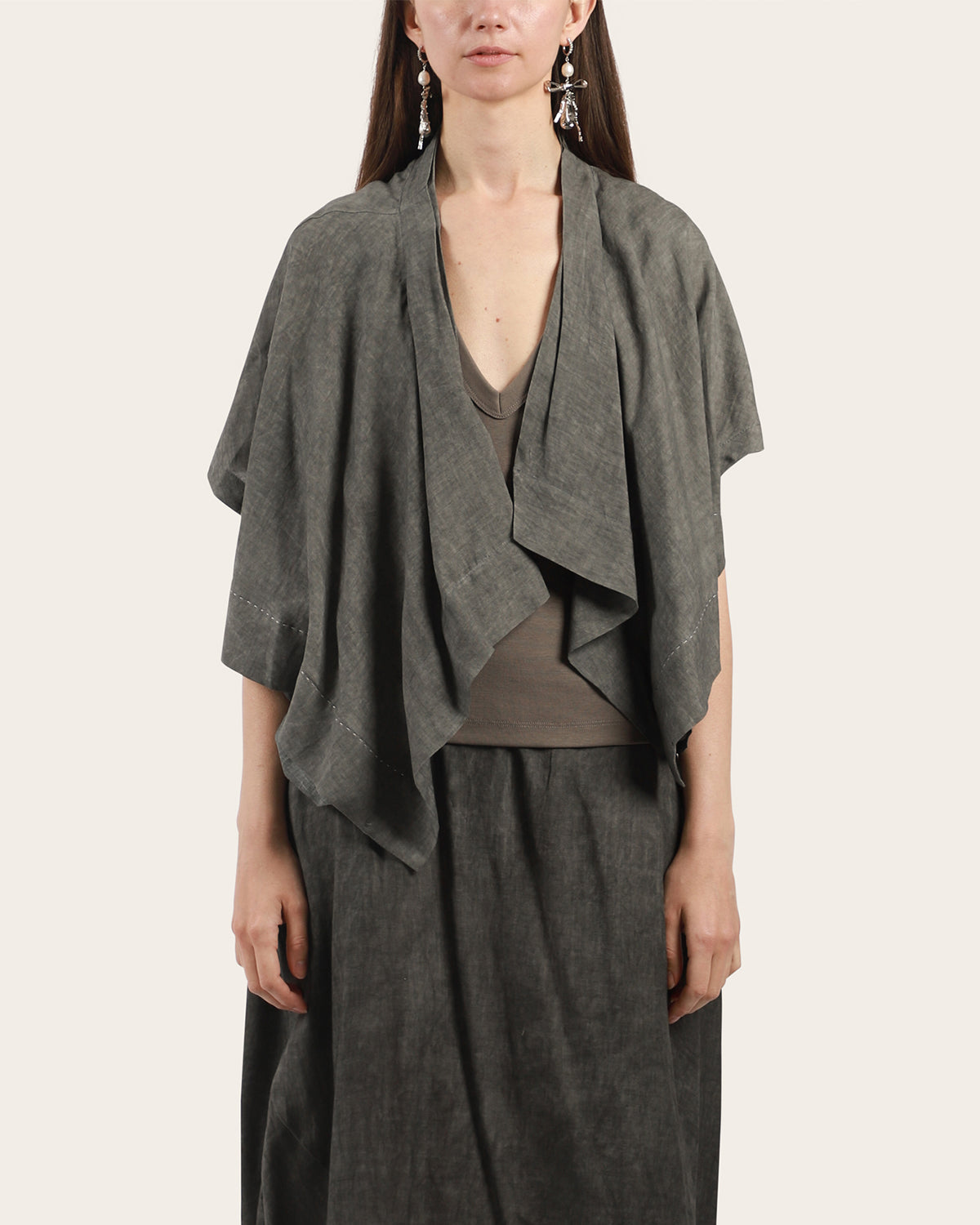 Effortless and elegant, this Moyuru shrug blouse features a soft charcoal hue and a fluid, draped silhouette. Its open, layered design adds a touch of modern Japanese minimalism to any outfit.