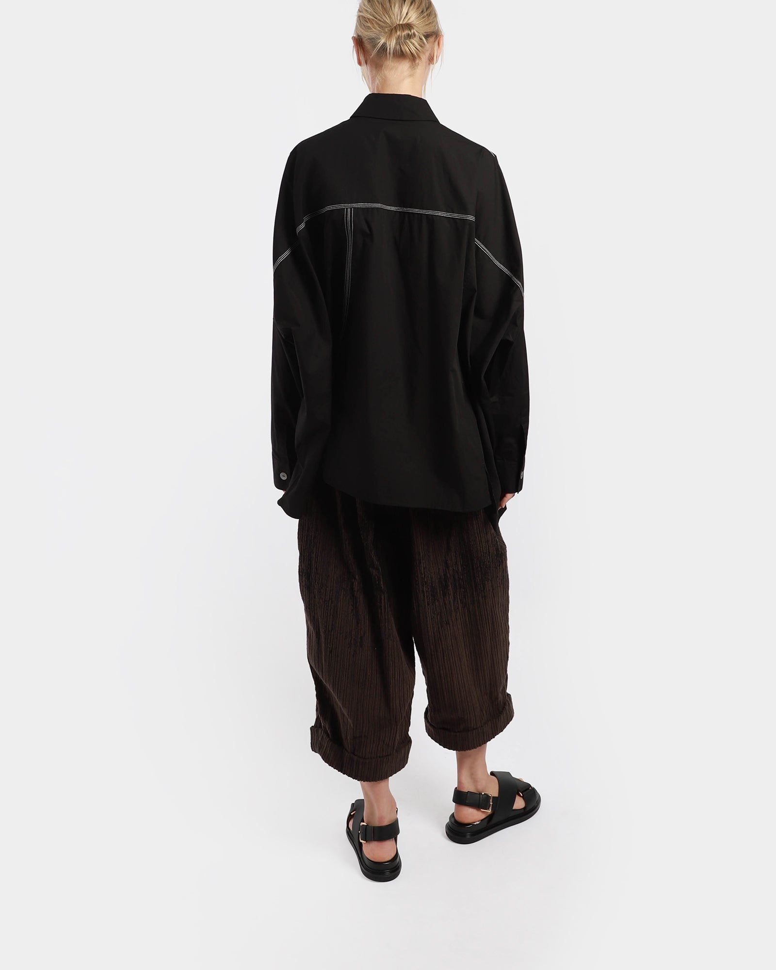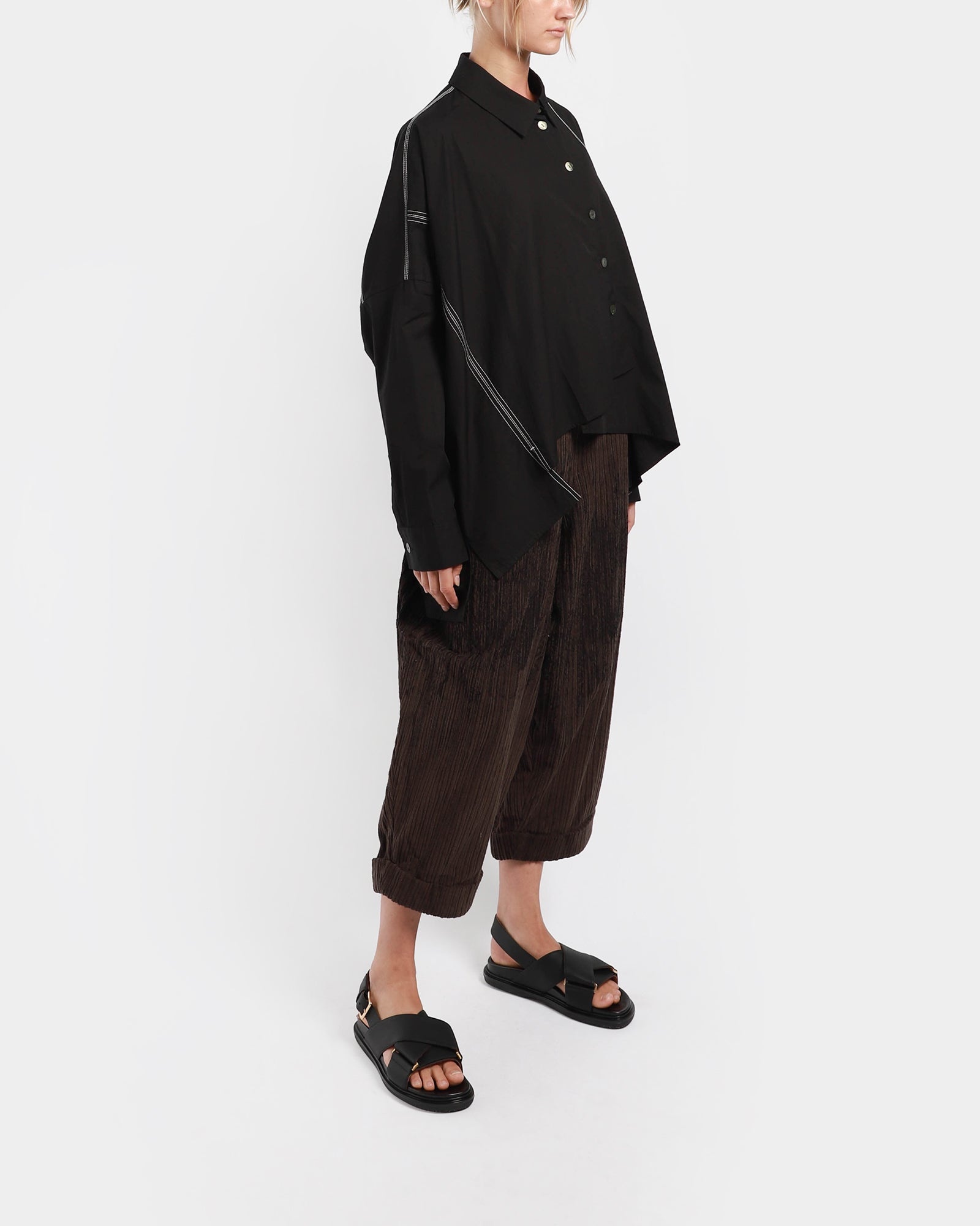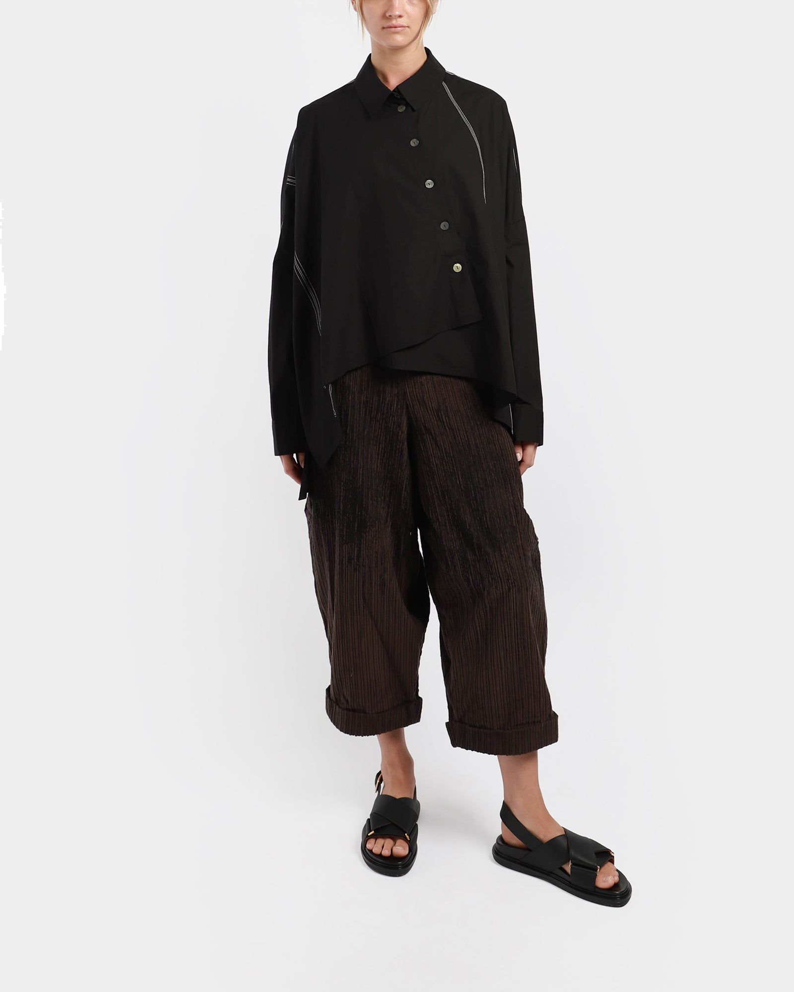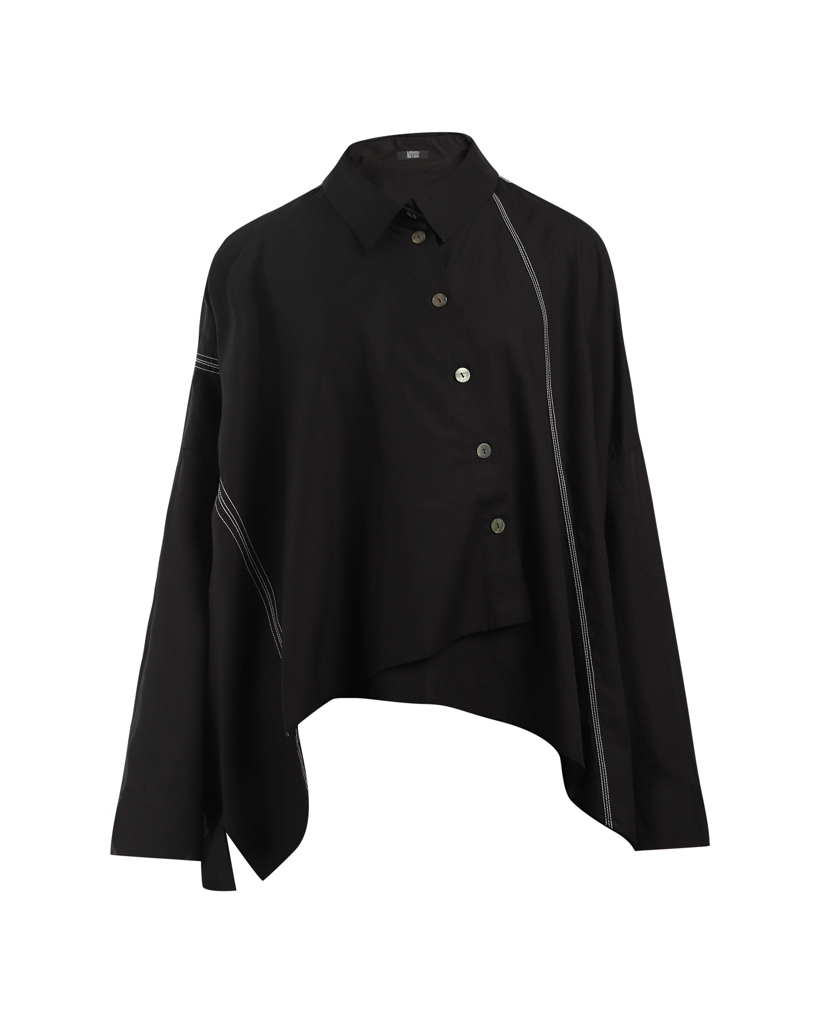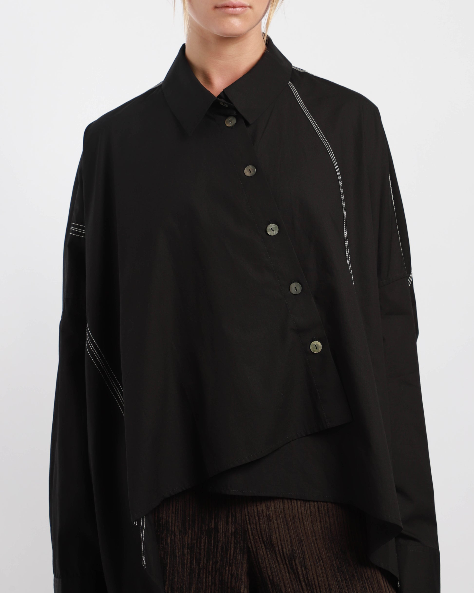 An asymmetric blouse made from cotton featuring a classic collar with mother of pearl buttons to close. It has contrast white stitching, long dropped sleeves and a relaxed look.
