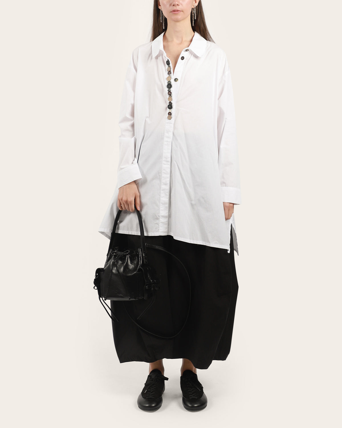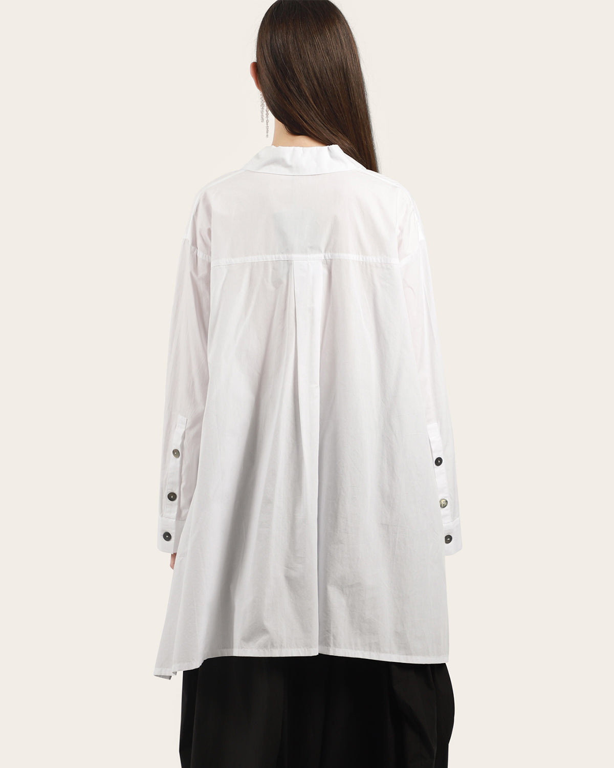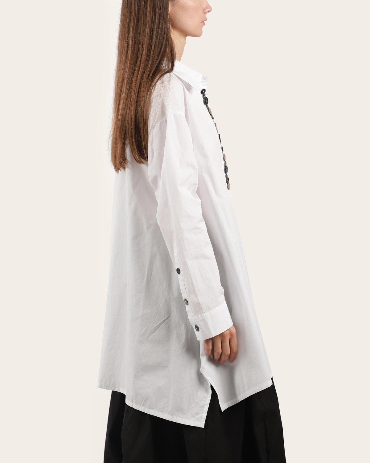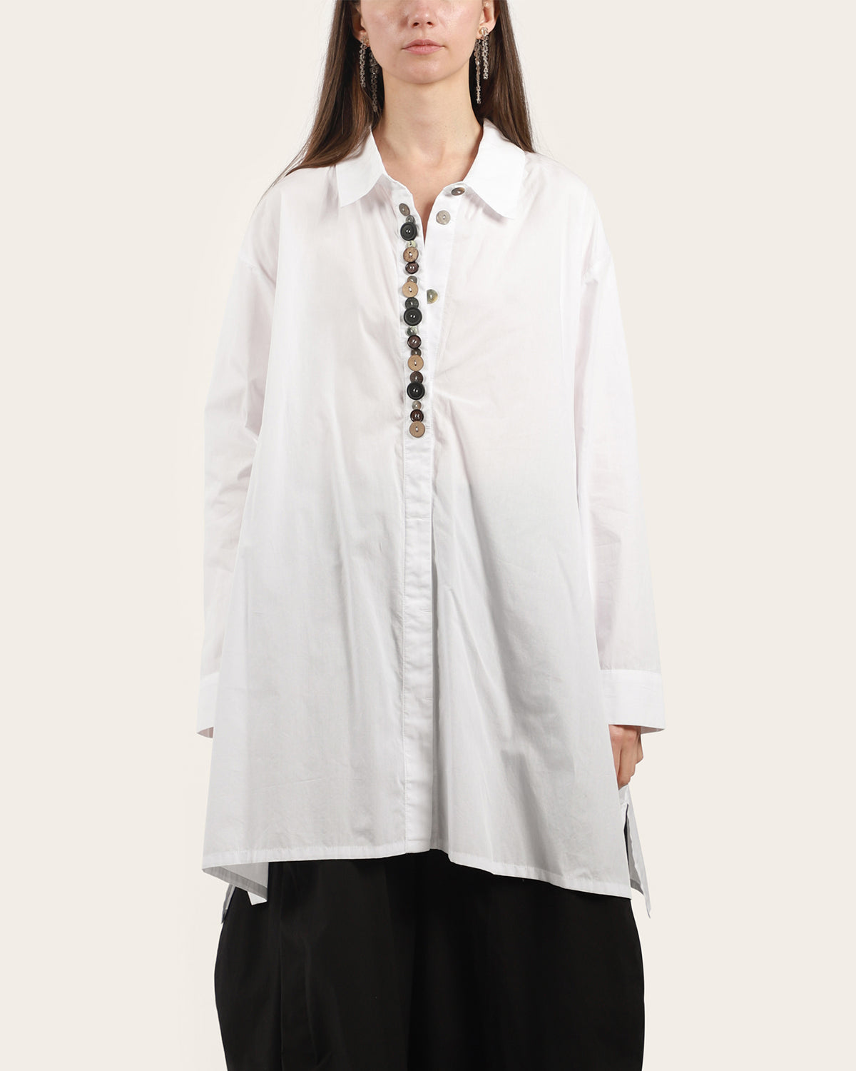 This Moyuru design features a relaxed fit with a classic collar and a standout placket detailed with an eclectic mix of buttons for an artistic touch. Crafted from lightweight cotton, it’s perfect for layering or wearing solo for effortless, contemporary style.