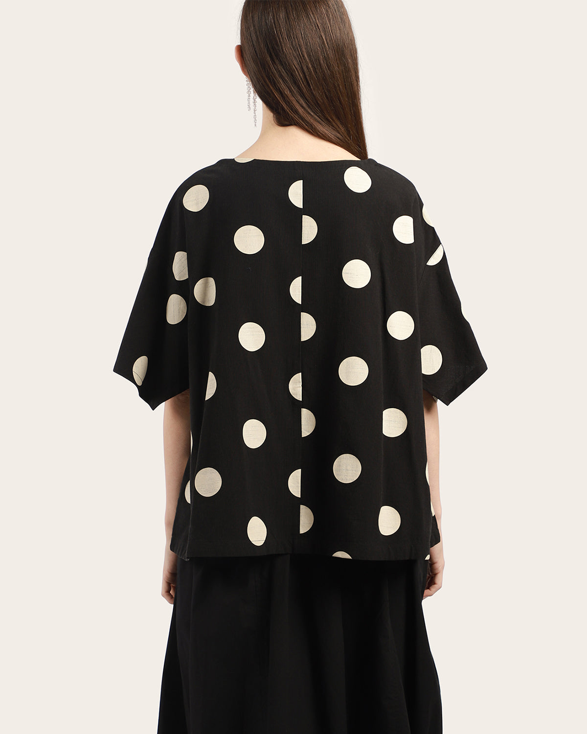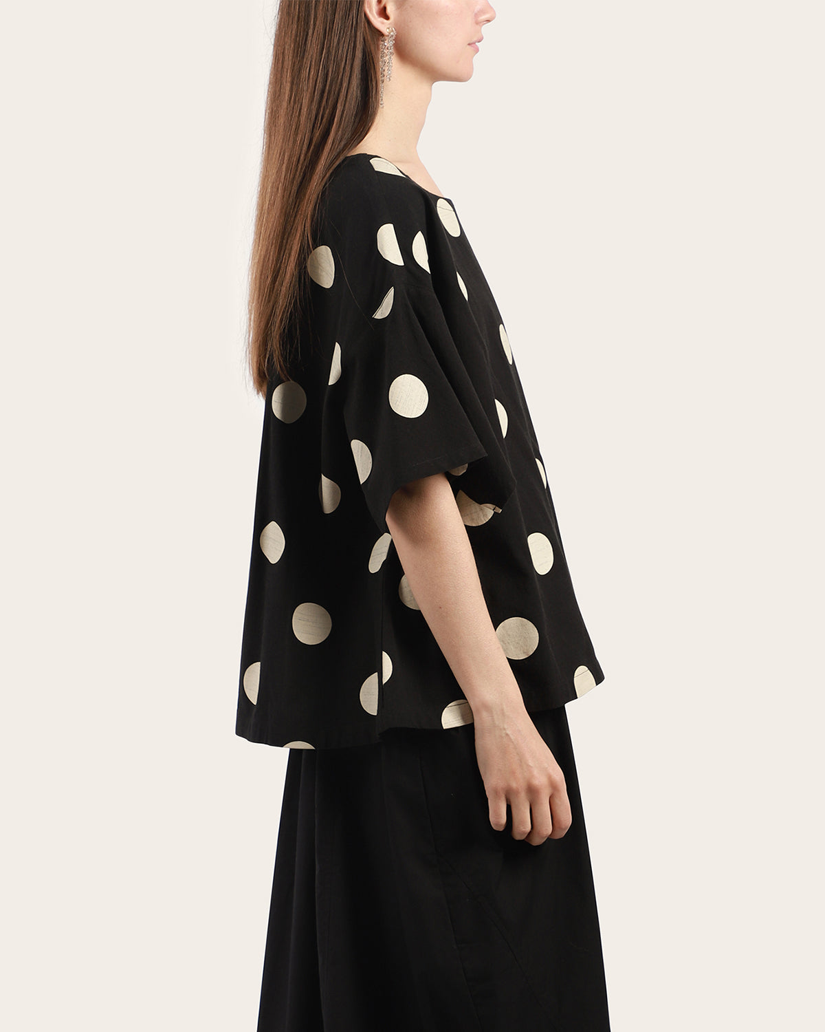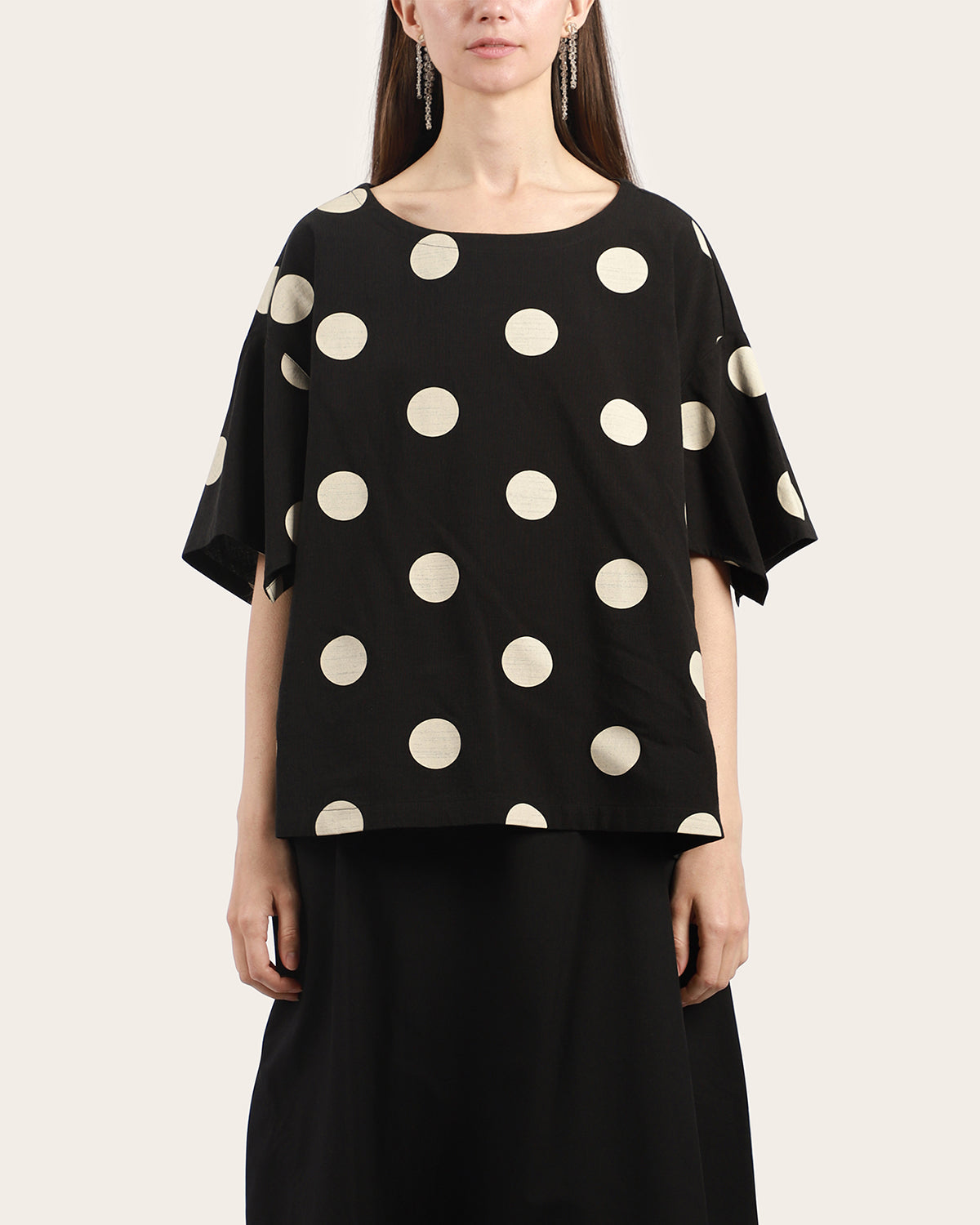 Playful yet sophisticated, this Moyuru top features a bold oversized polka dot print on a soft black base. Cut in a relaxed silhouette with wide short sleeves and a round neckline, it’s an easy statement piece that pairs effortlessly with trousers or skirts for a modern, artful look.