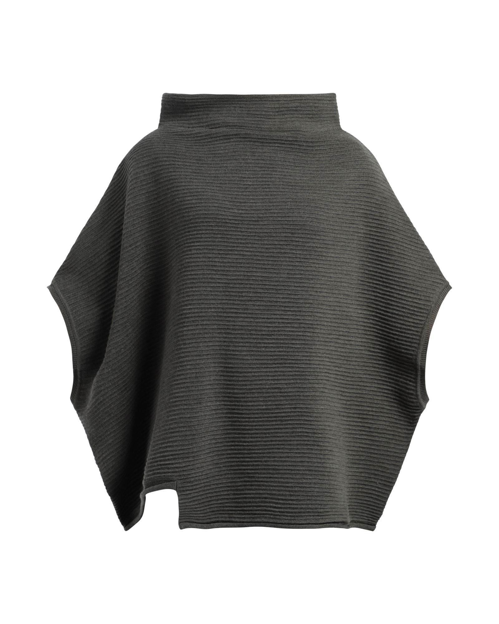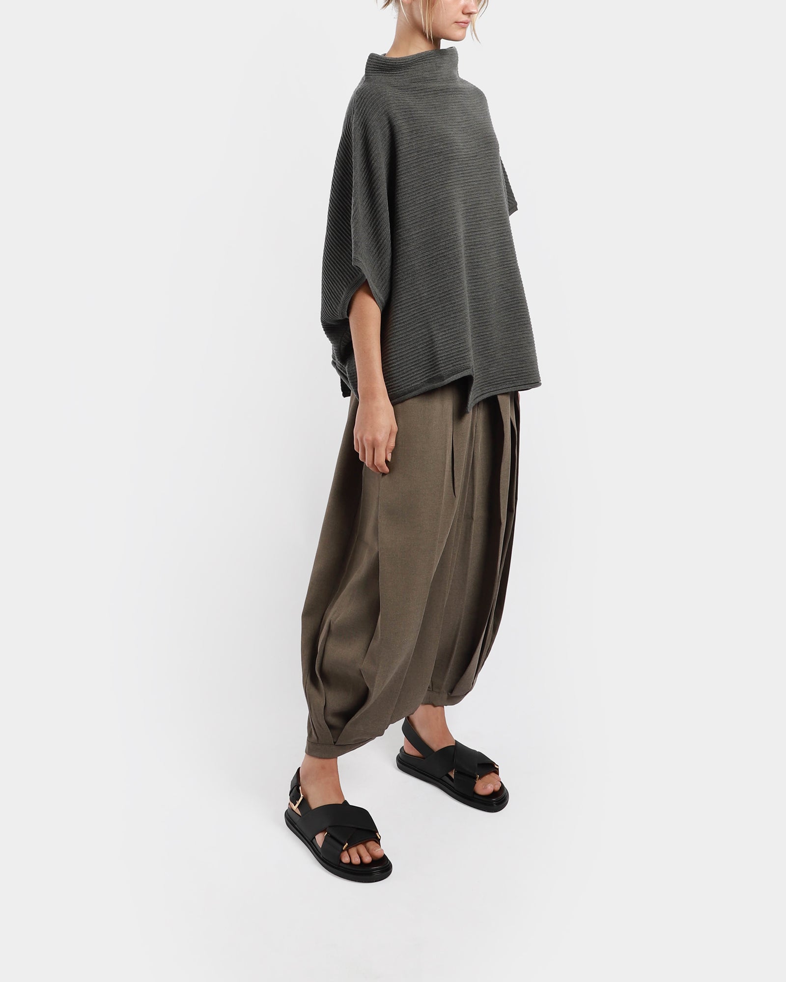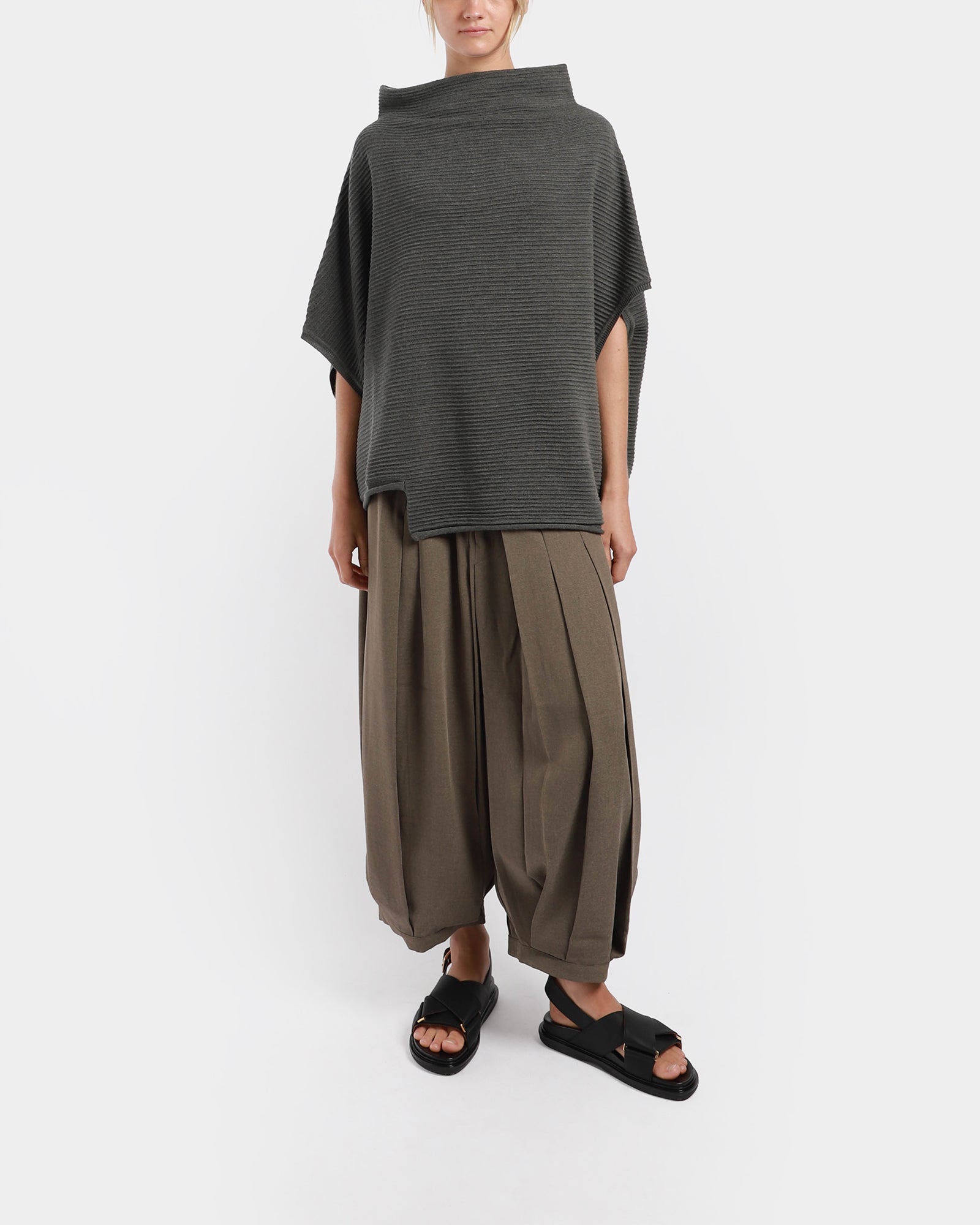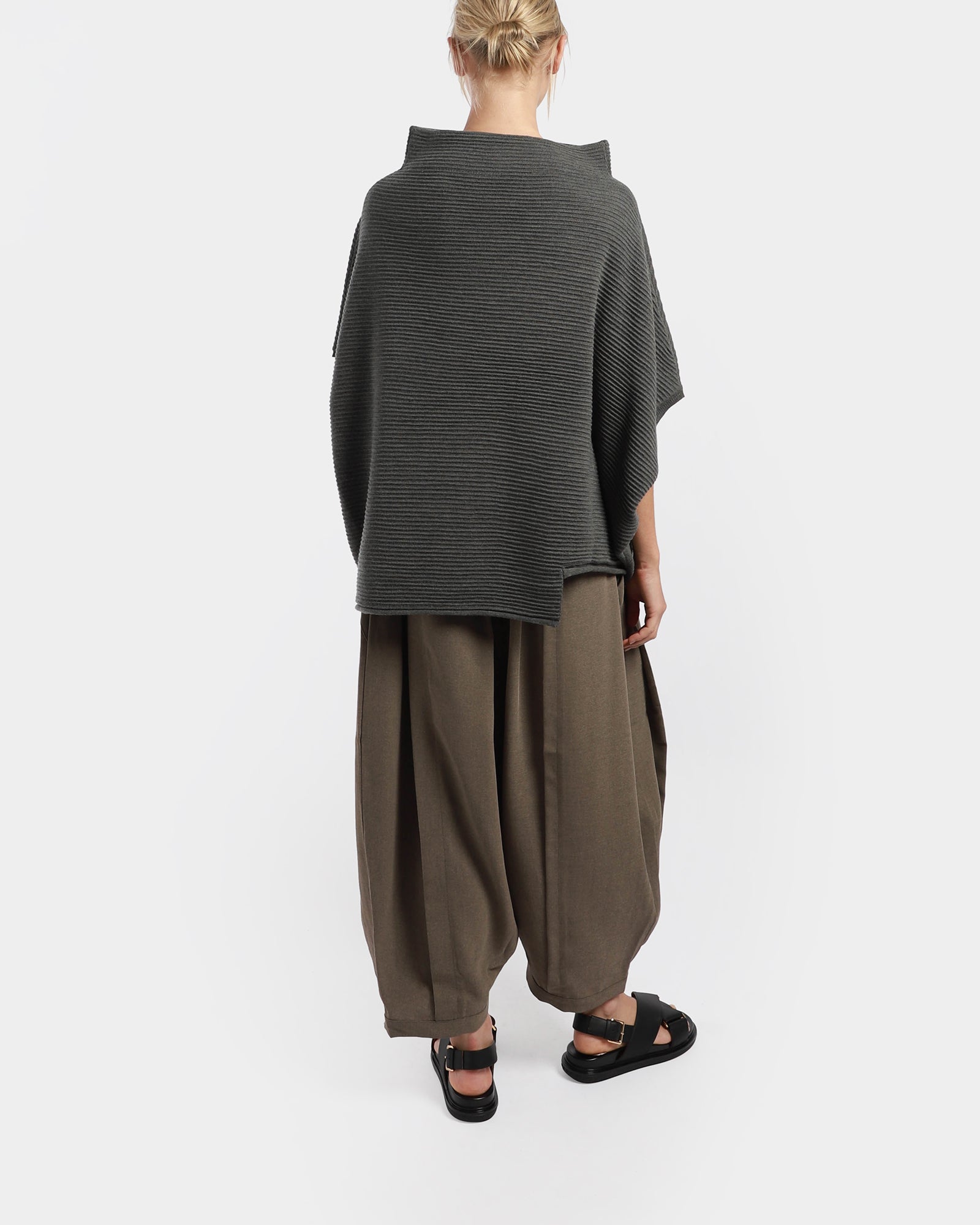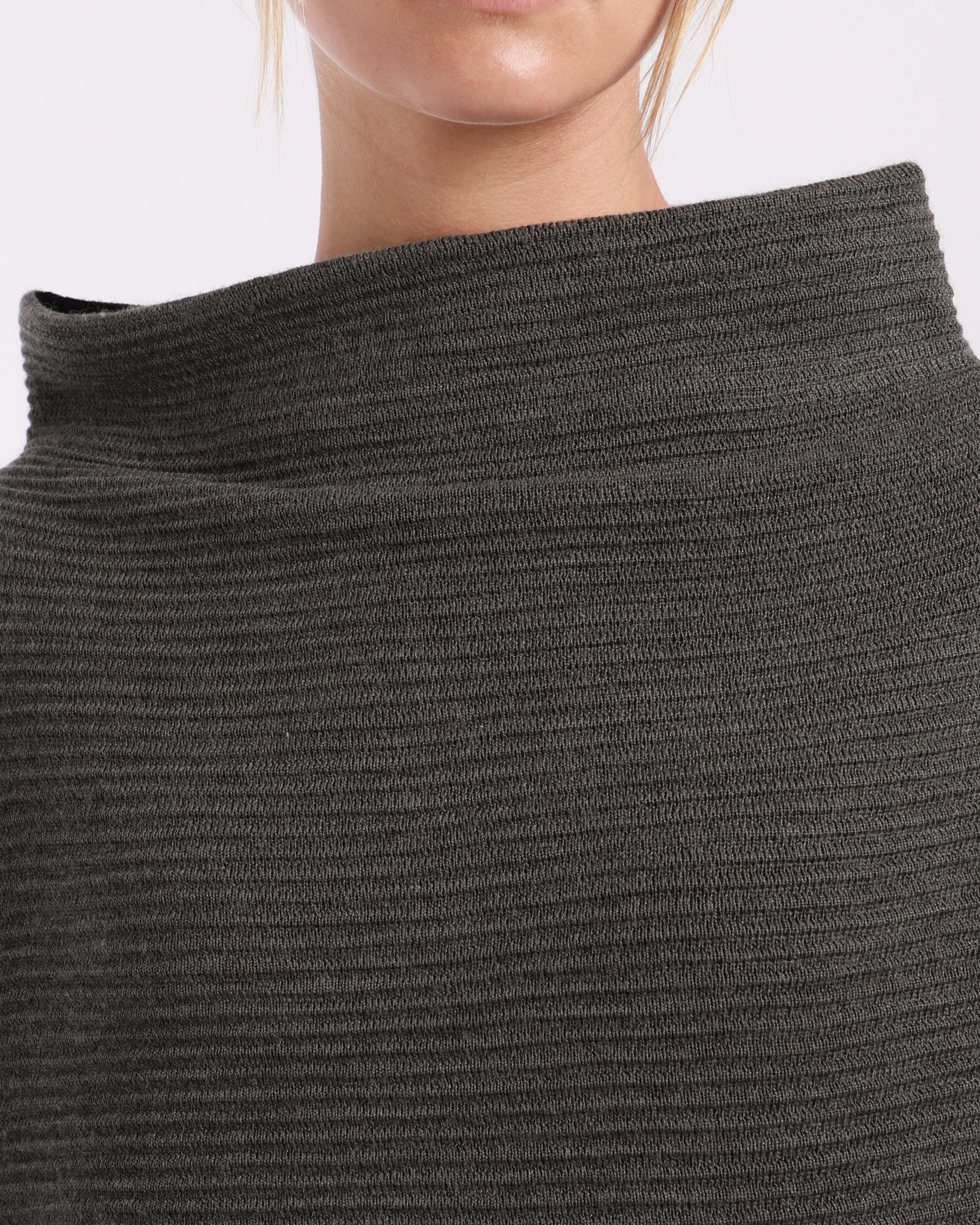 A ribbed knit top with a wide turtle neck and dropped 3/4 sleeves. The Moyuru top has asymmetric and straight cut rolled hem that gives a vintage look.
