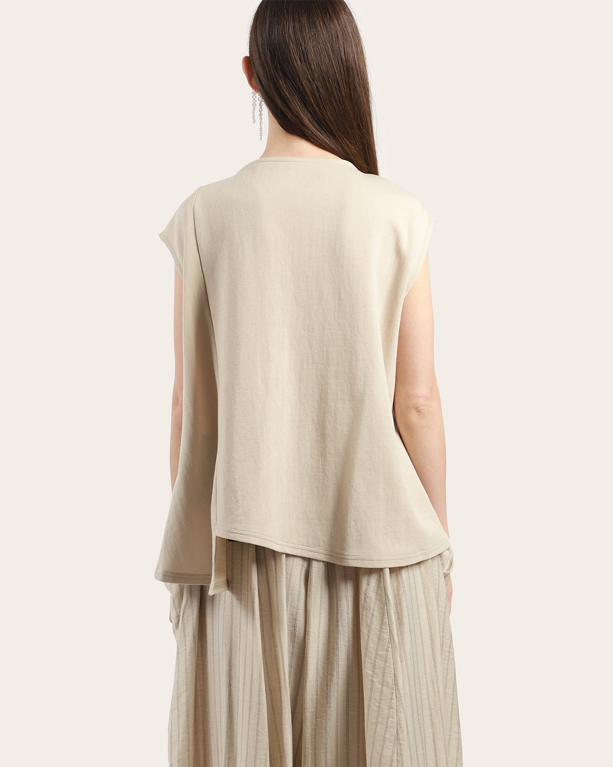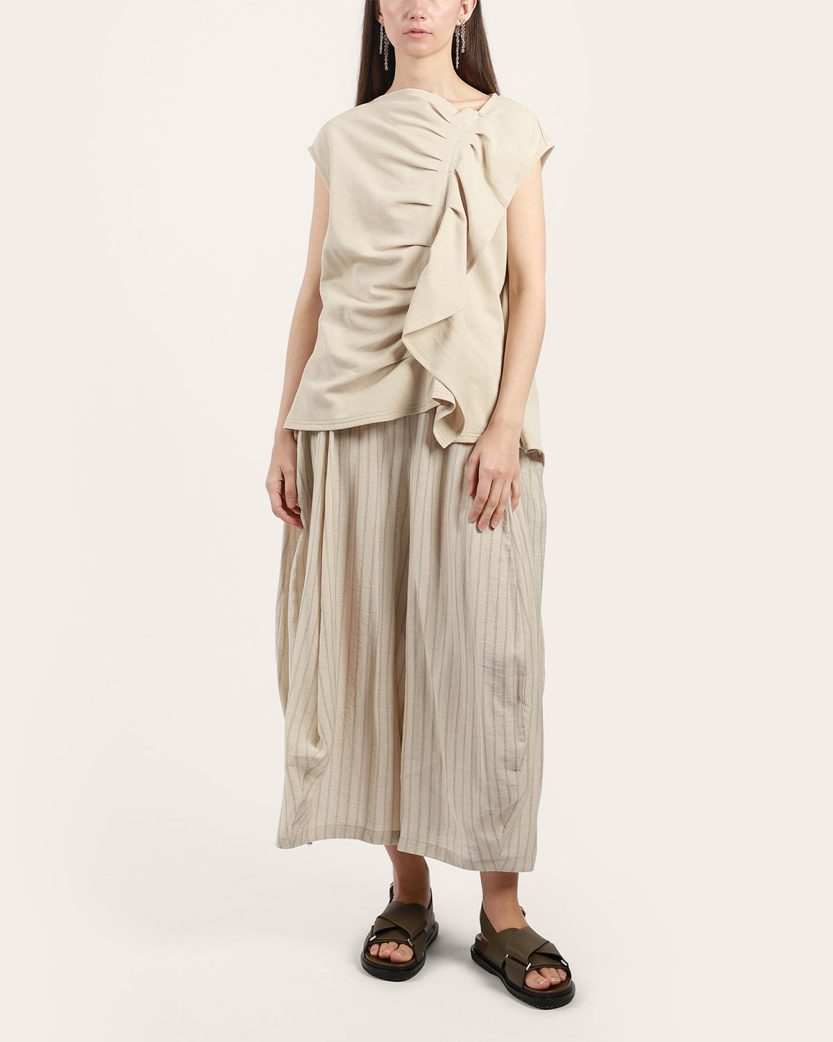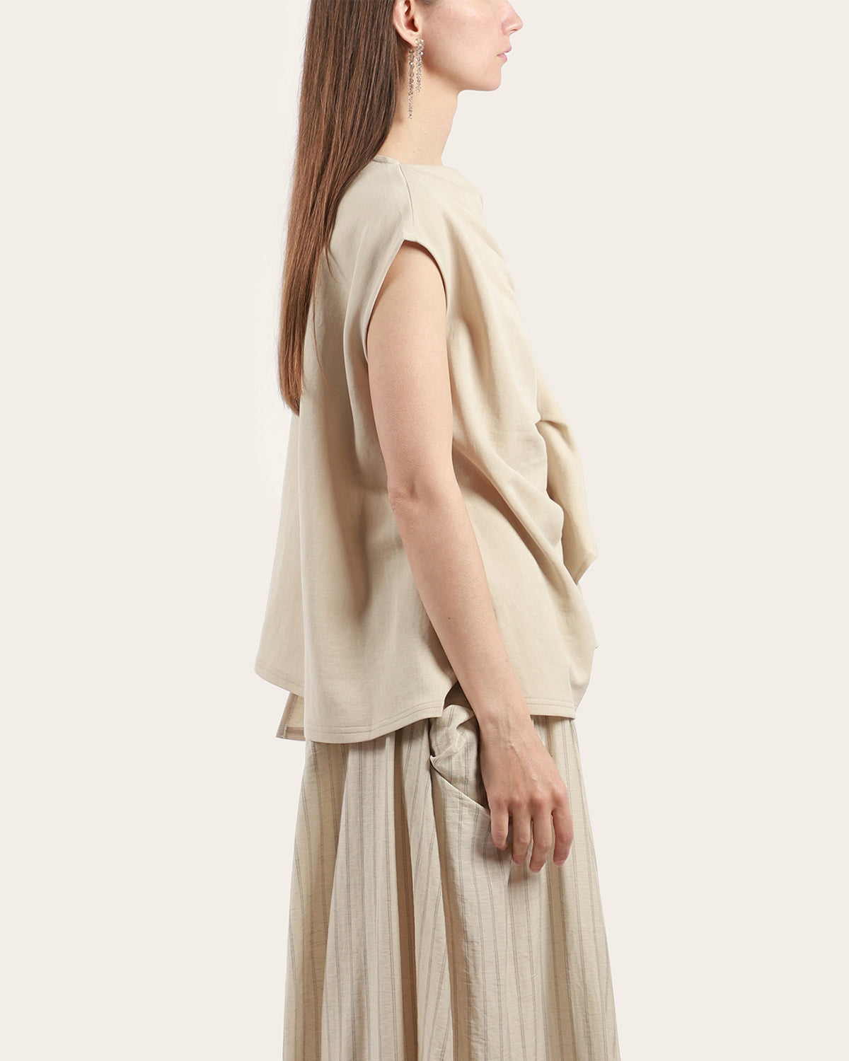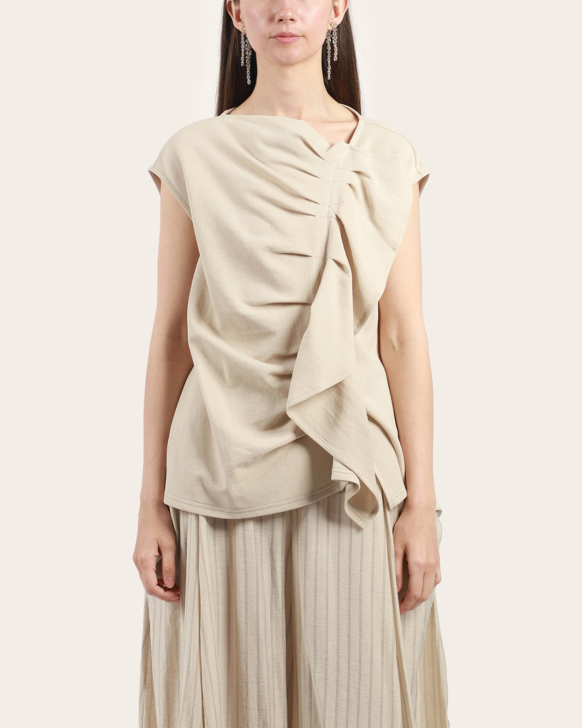 This sleeveless blouse in soft sand cotton features a pleated drape detail at front. An easy way to add sculptural interest to simple trousers or skirts.
