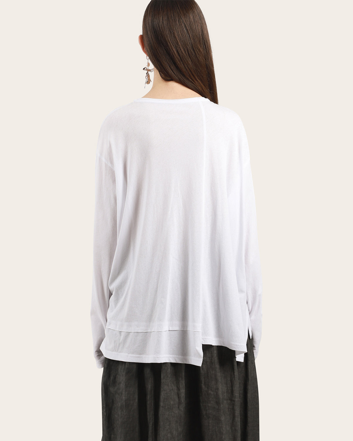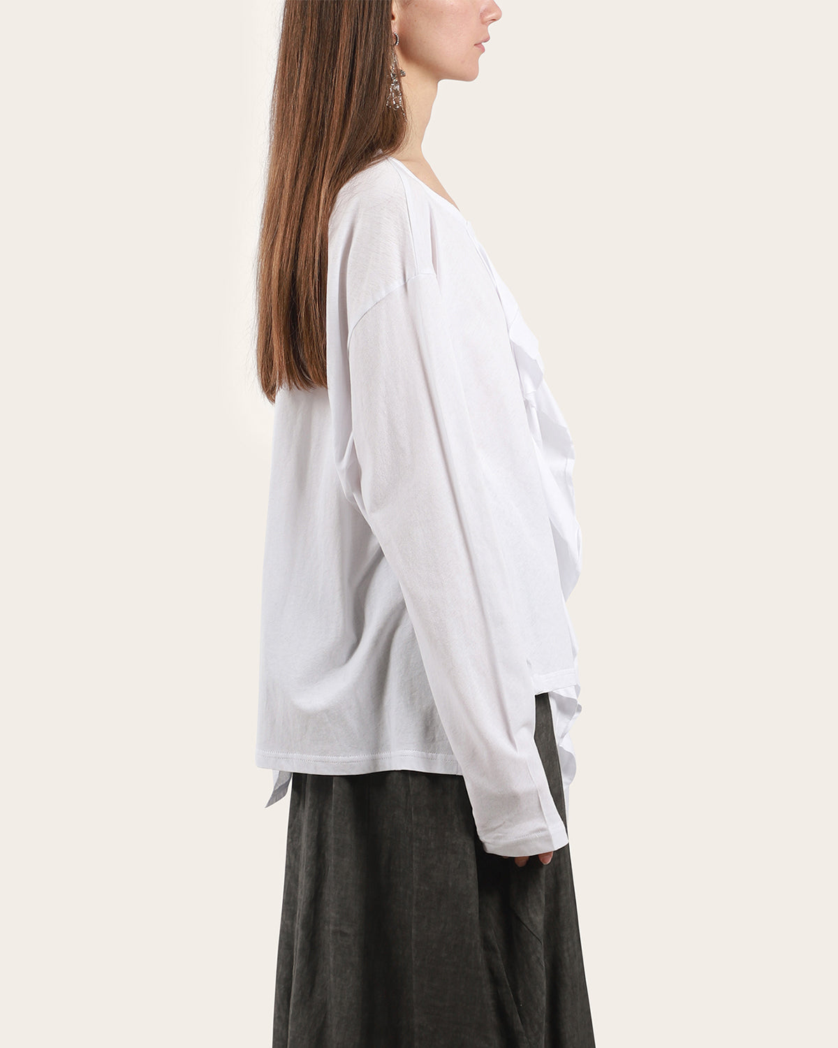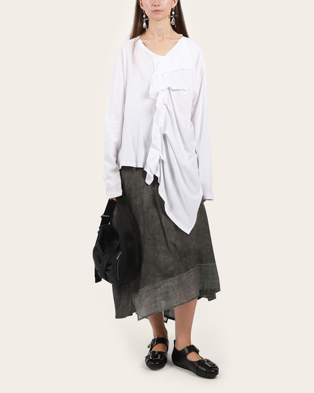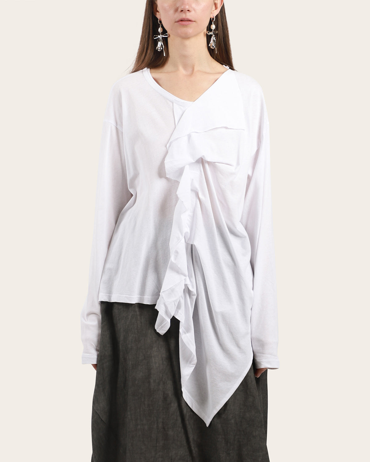 A fresh take on everyday style, this soft cotton blouse features a dramatic cascading ruffle and asymmetric hem. Relaxed yet artful, it pairs effortlessly with wide-leg pants or skirts for an elevated look.