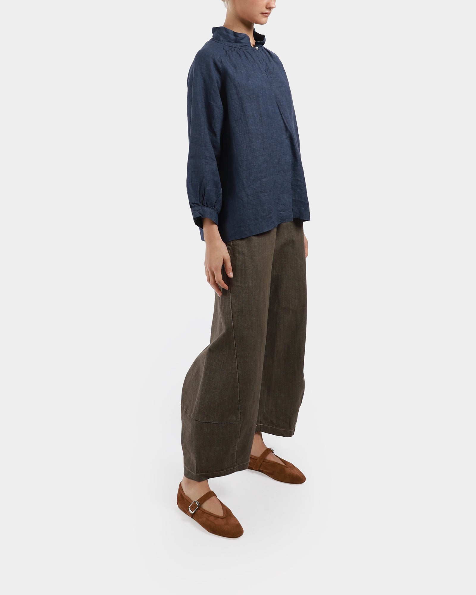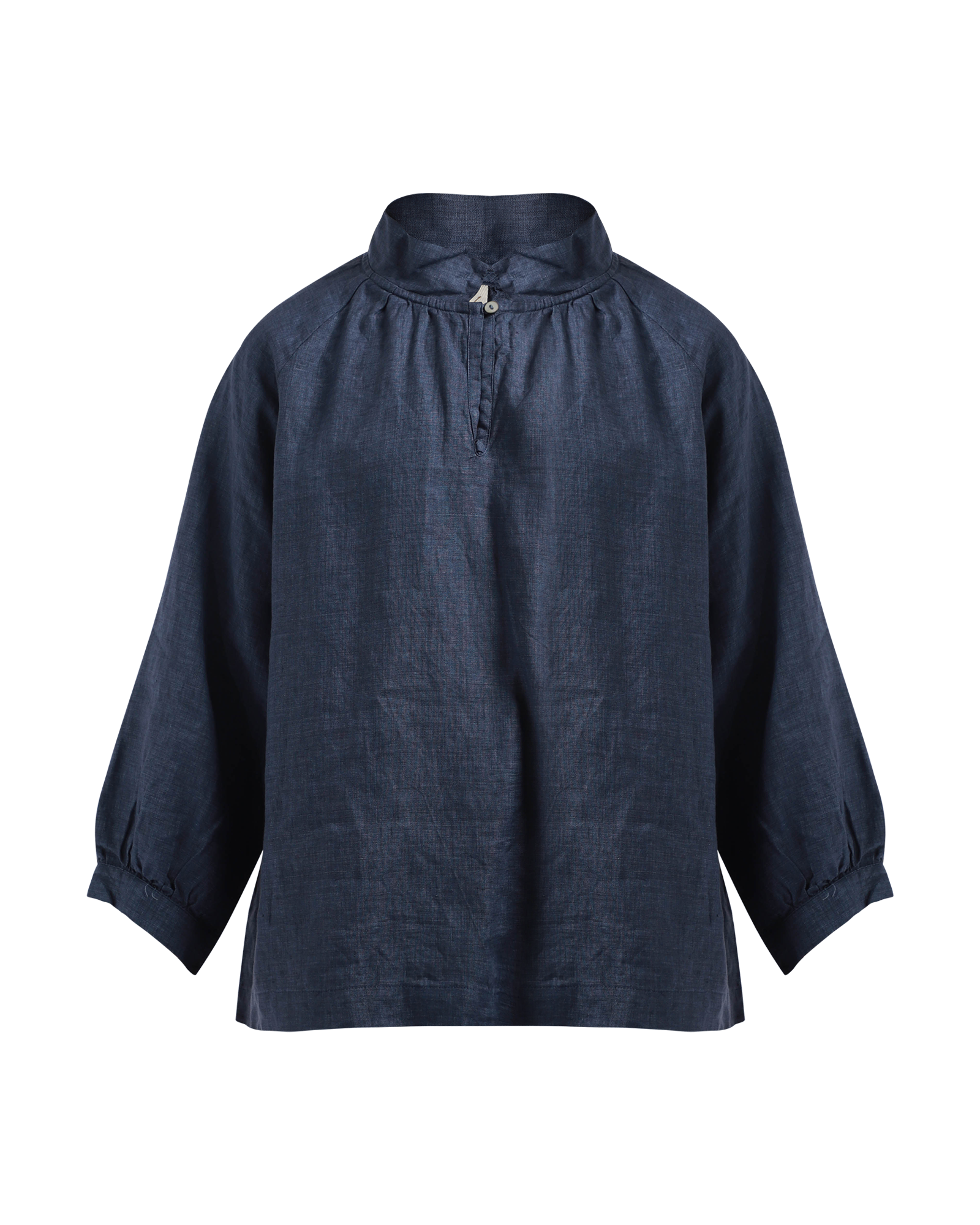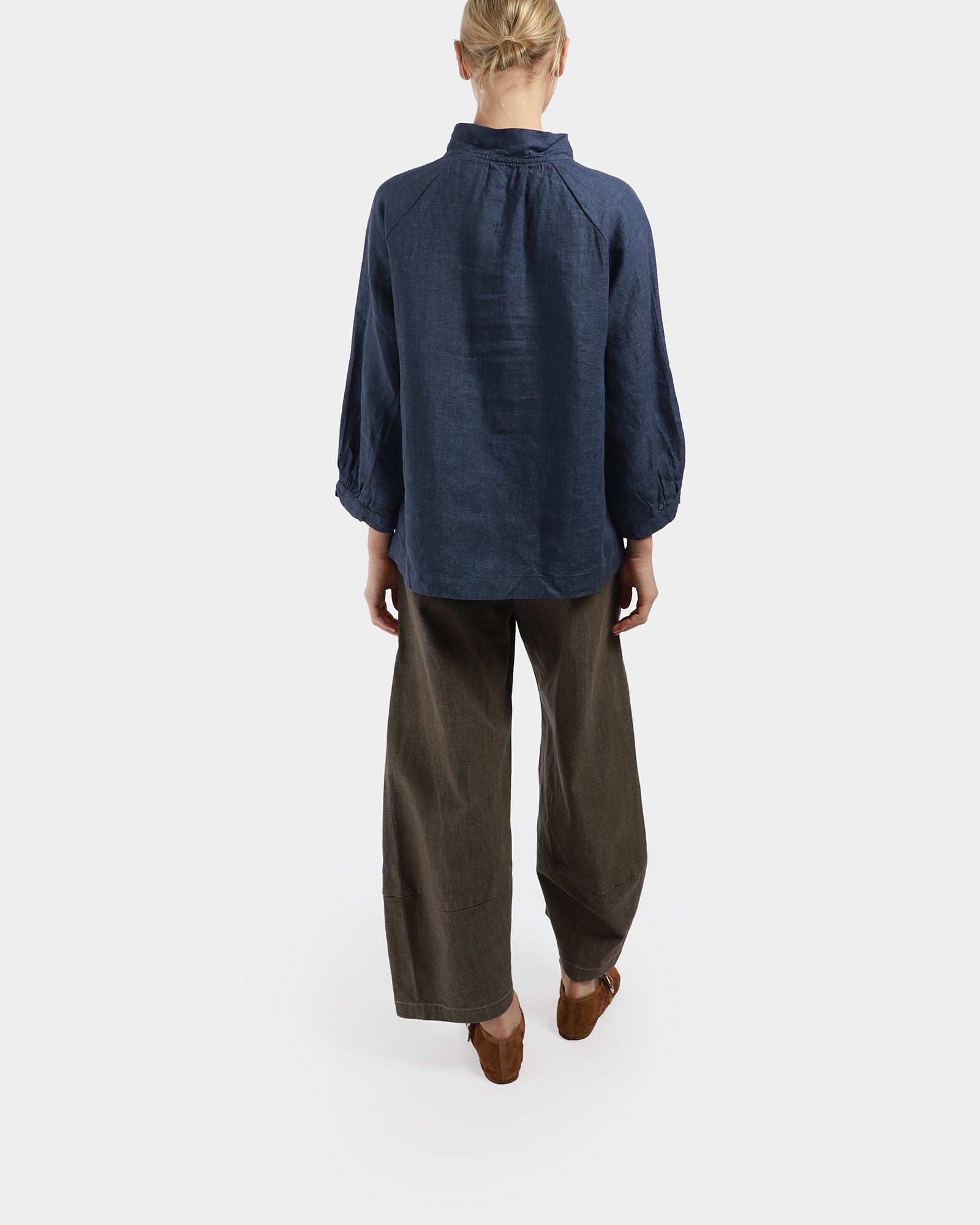 The Aurora Top made from linen, features 3/4 length sleeves, finished with a collar, front neck opening, and shell buttons. - Linen