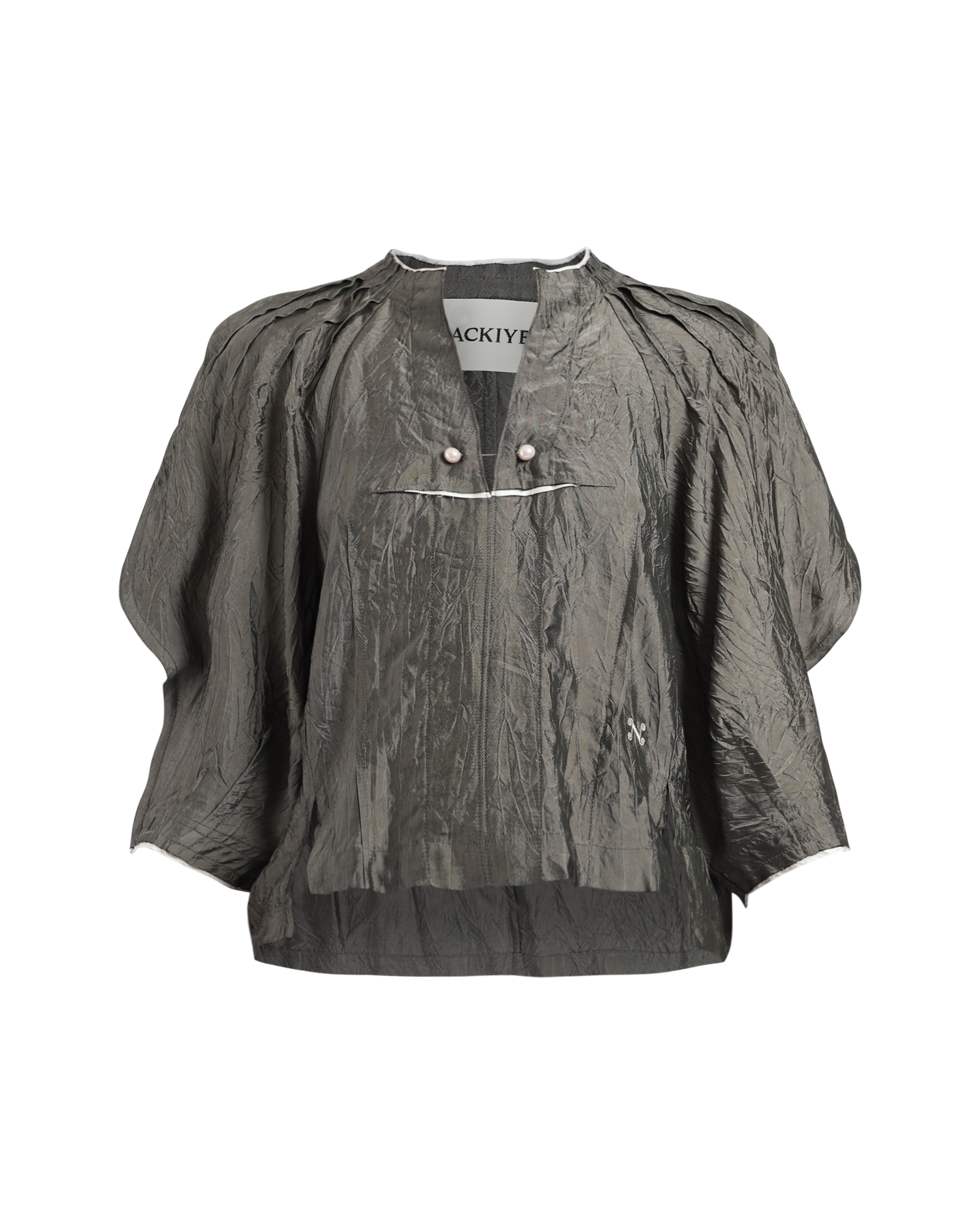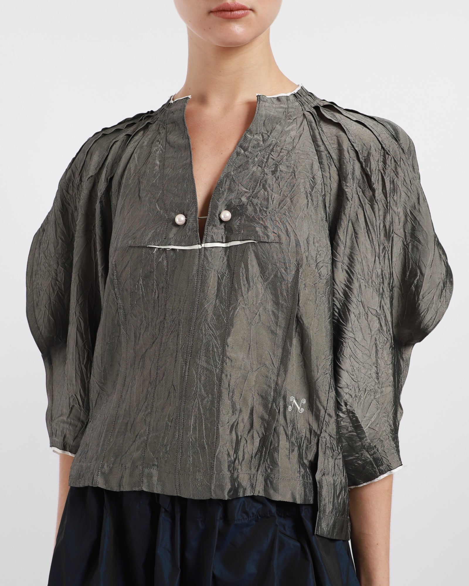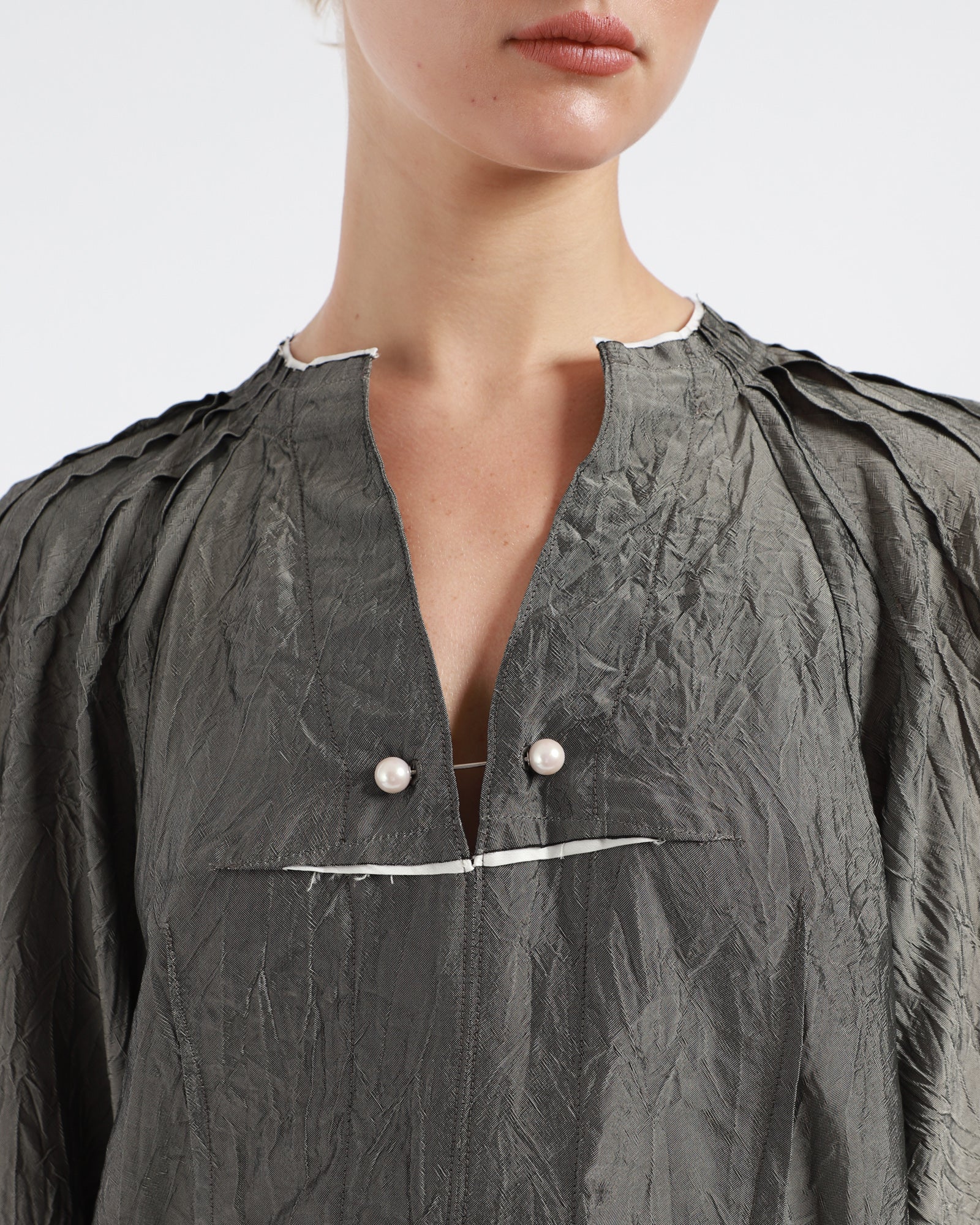 The Odalique Top showcases a voluminous silhouette with intricate tucks and dramatic sleeves flowing seamlessly from the neckline. It features tapered cuffs, an open V-neckline, and a delicate double pin detail at the chest. Embroidered branding graces the front, while finely exposed raw edging at the neck and cuffs adds an artisanal finish.