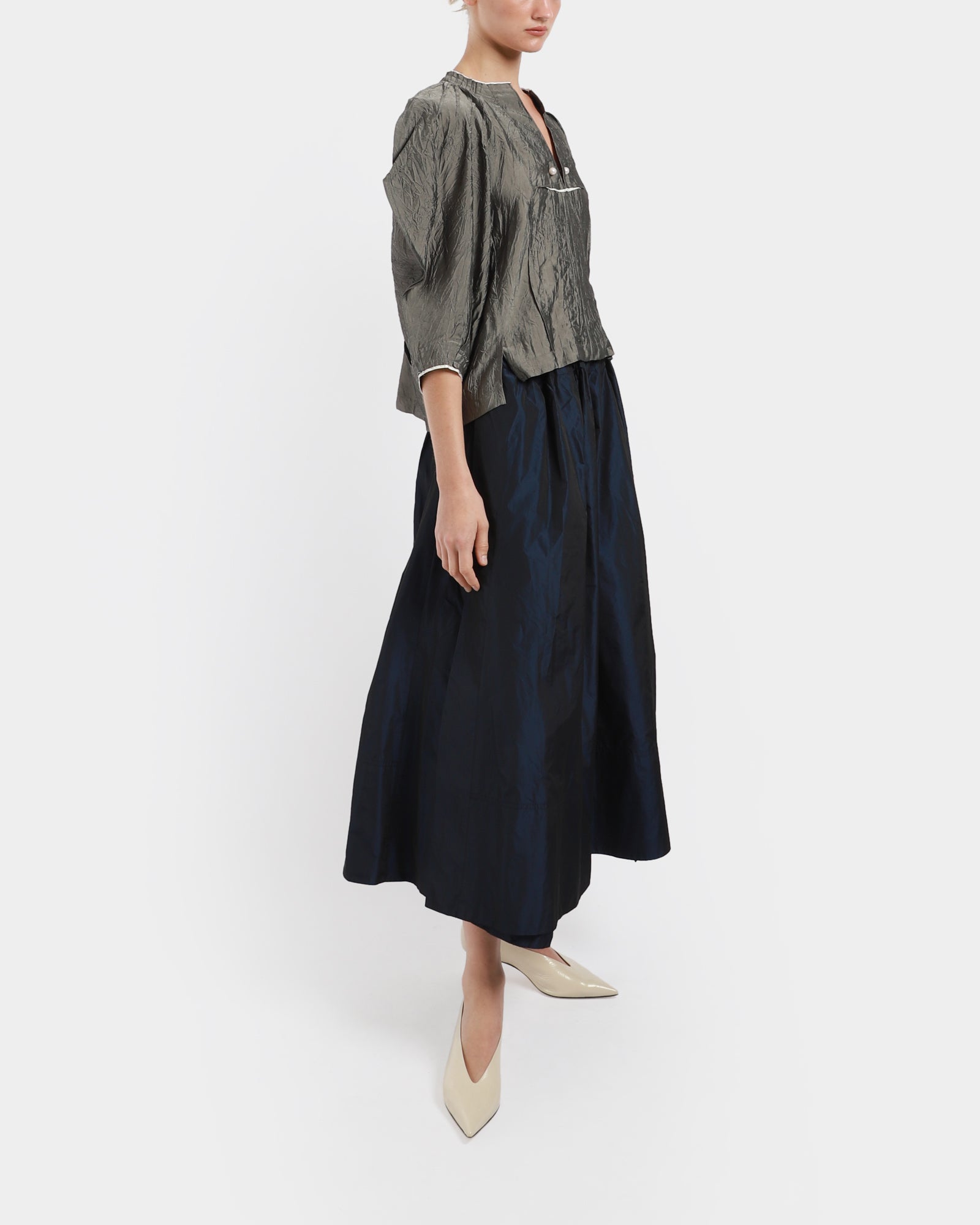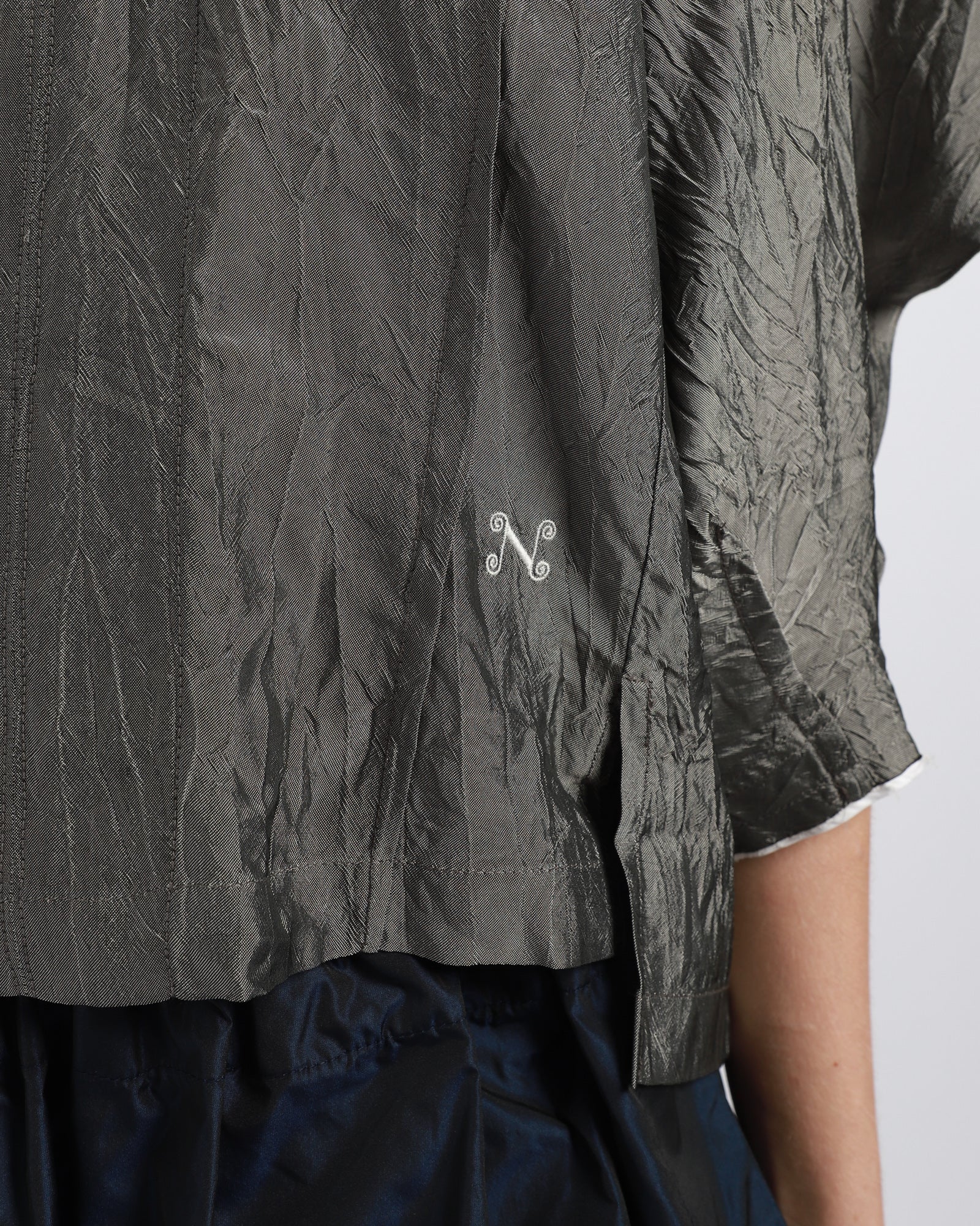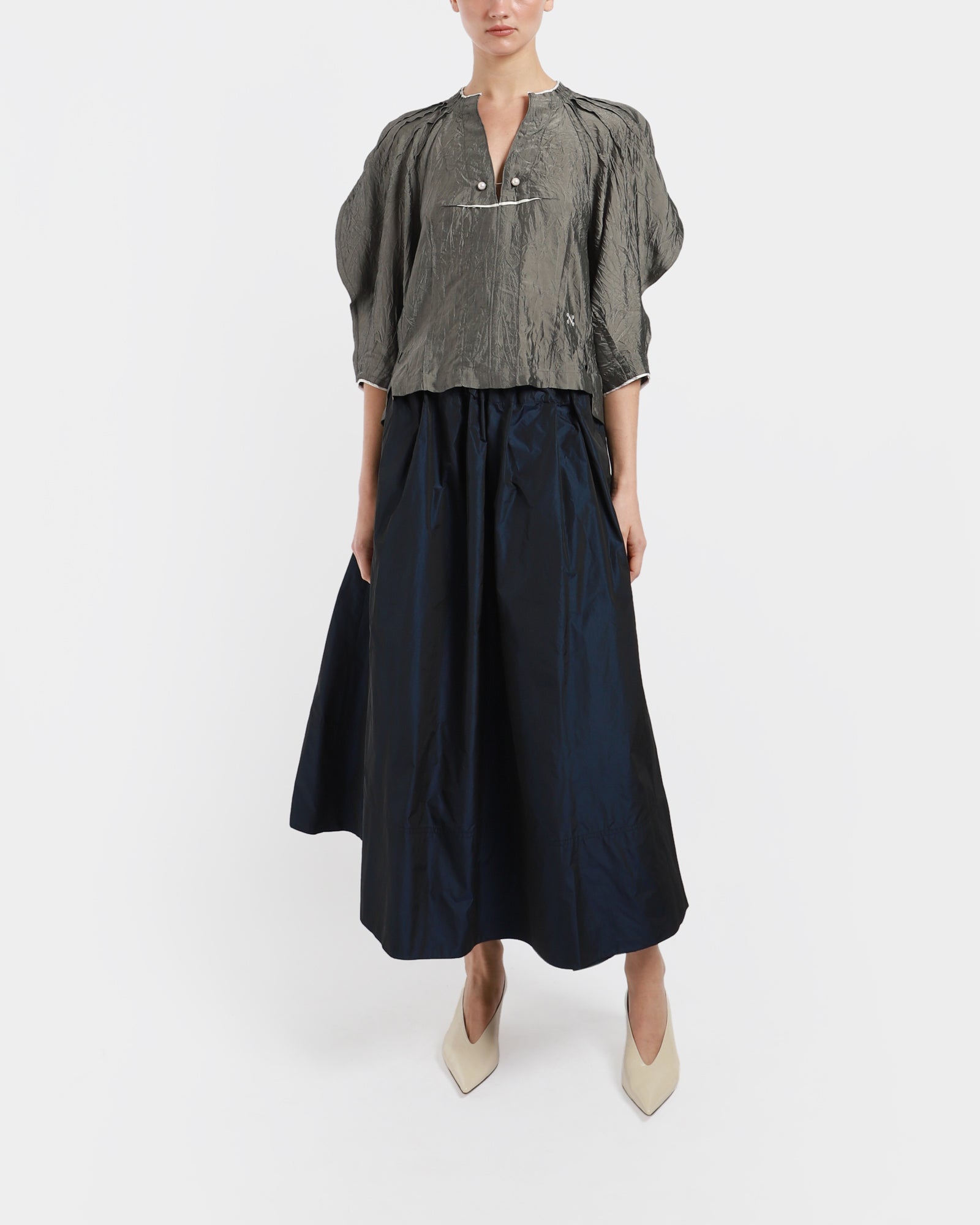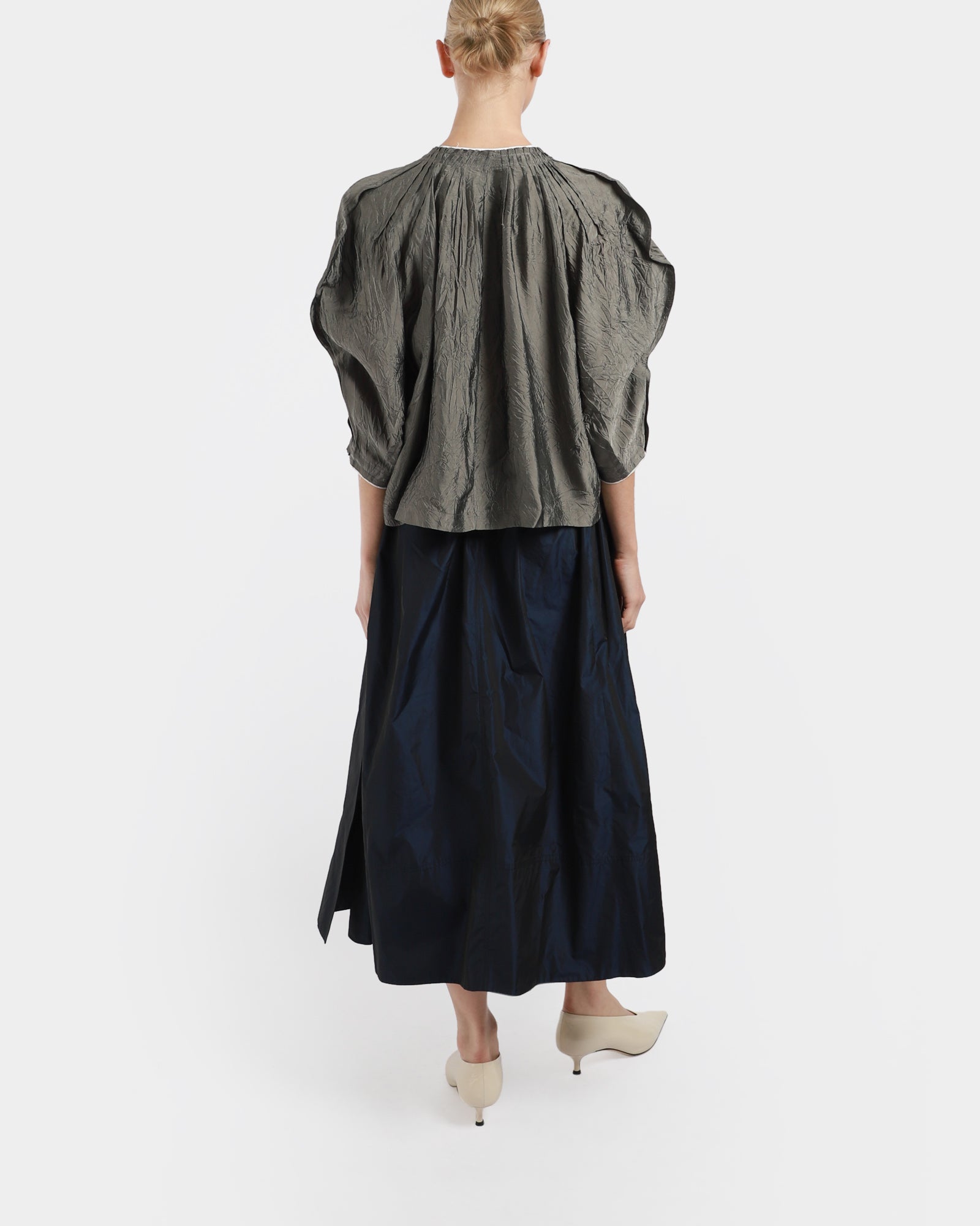 The Odalique Top showcases a voluminous silhouette with intricate tucks and dramatic sleeves flowing seamlessly from the neckline. It features tapered cuffs, an open V-neckline, and a delicate double pin detail at the chest. Embroidered branding graces the front, while finely exposed raw edging at the neck and cuffs adds an artisanal finish.