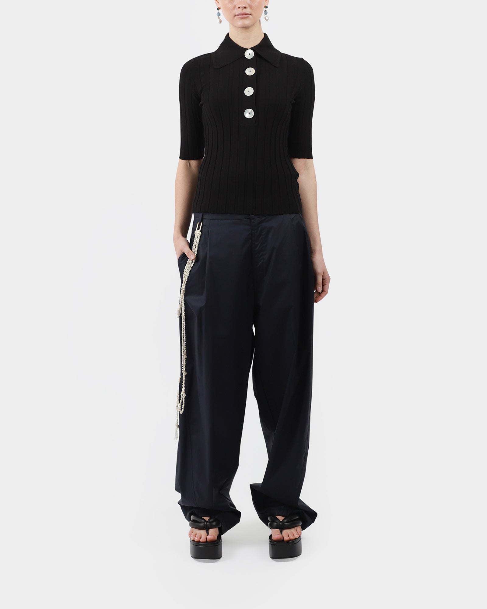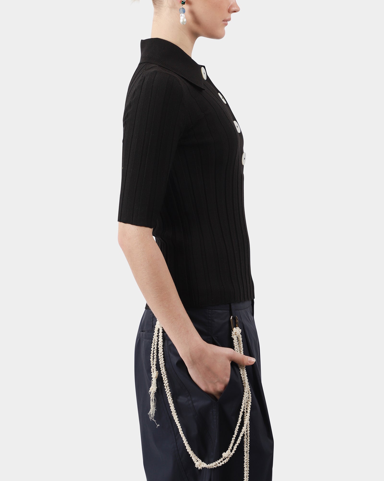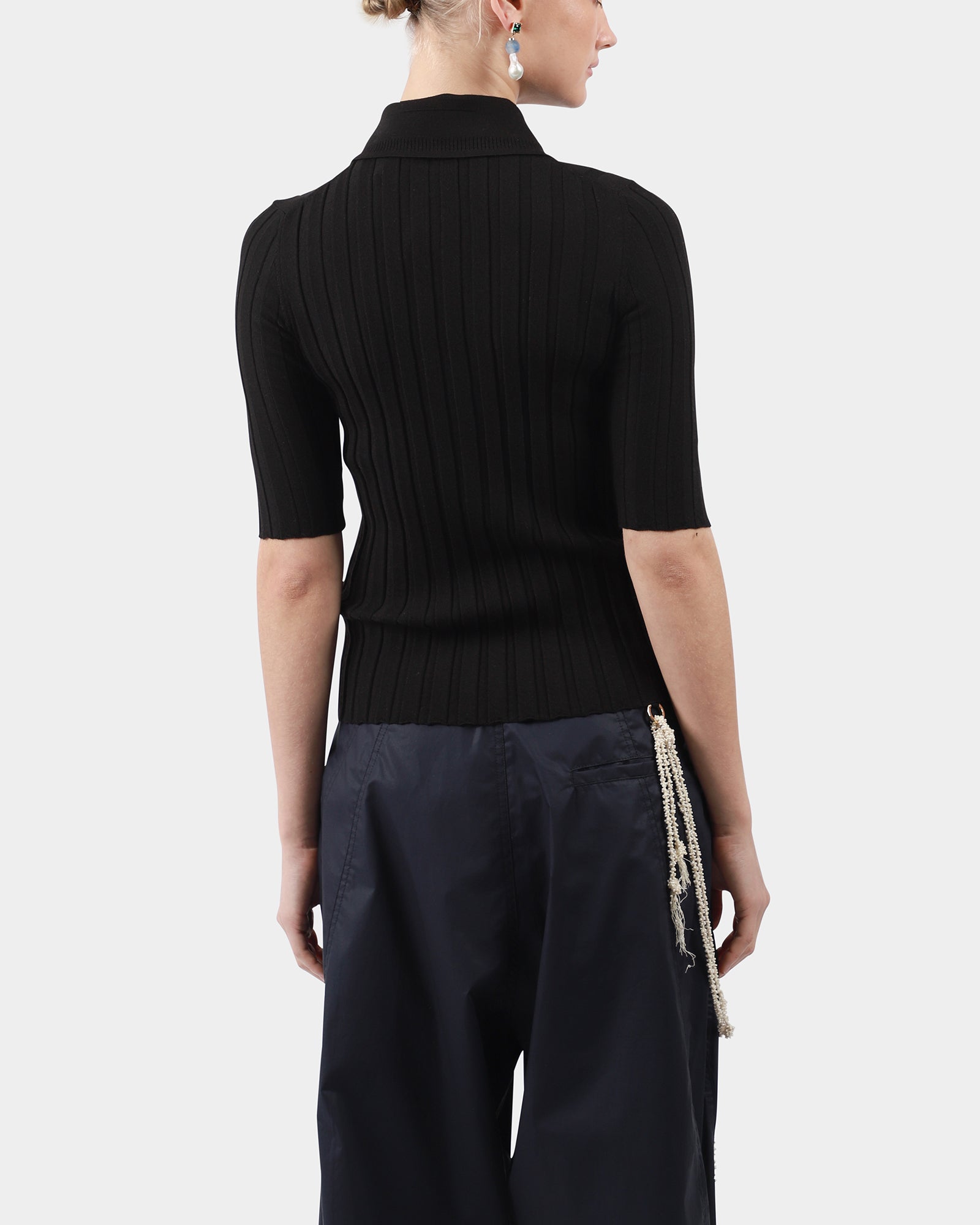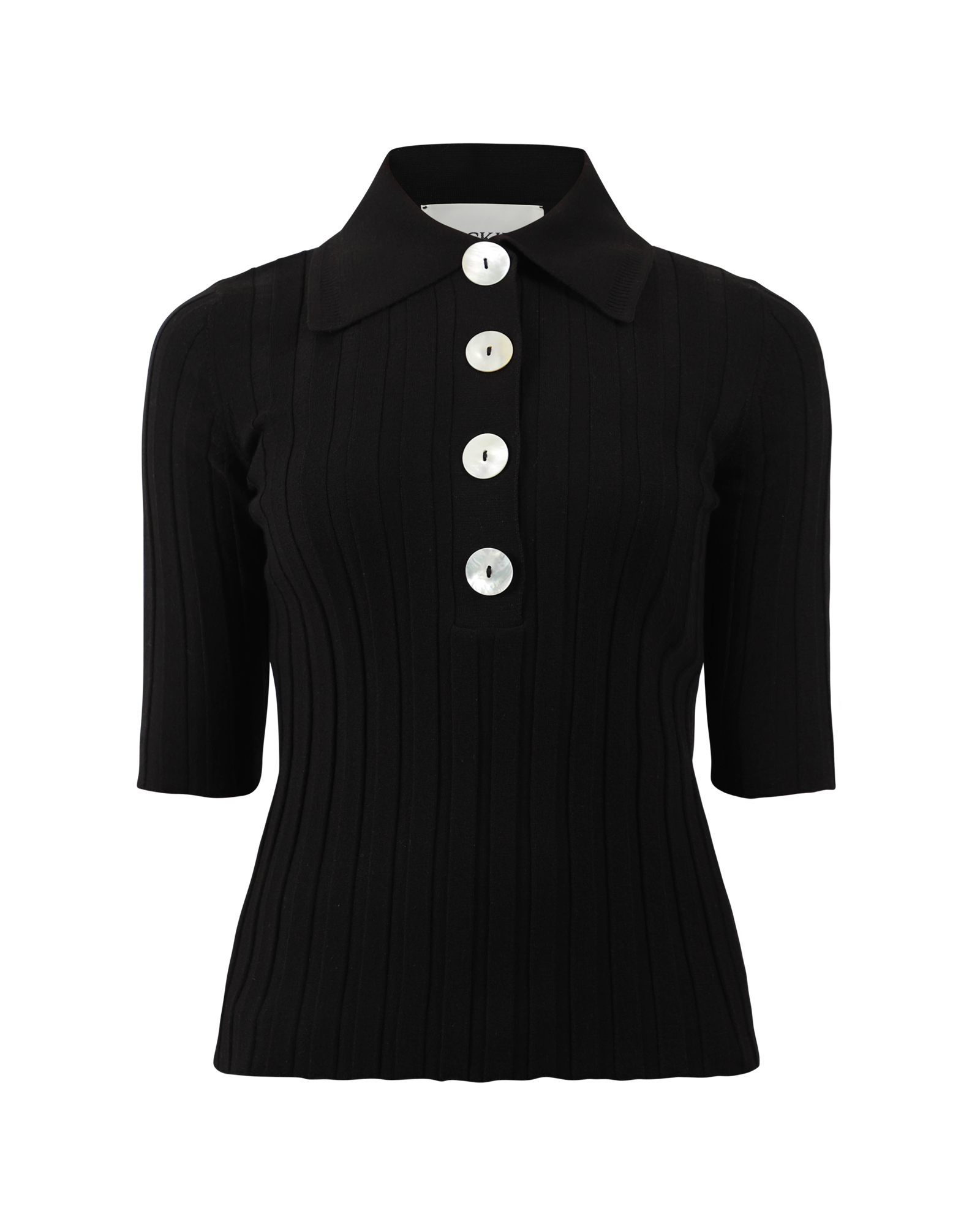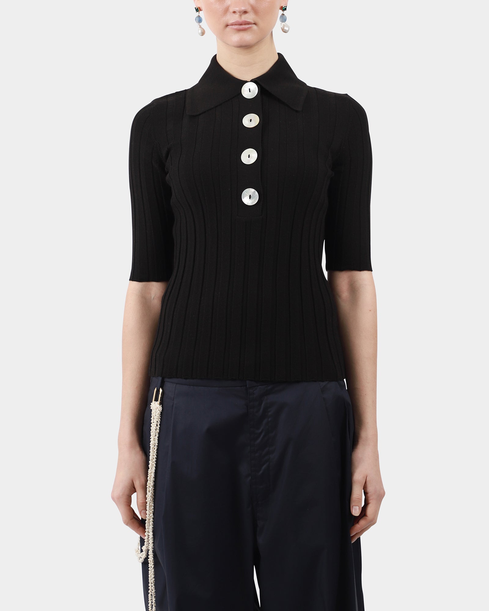 A slim-fit knit polo in fine Italian merino wool, with a smart collar, elbow sleeves and large mother of pearl buttons, perfect for year round layering. Made in Turkey.